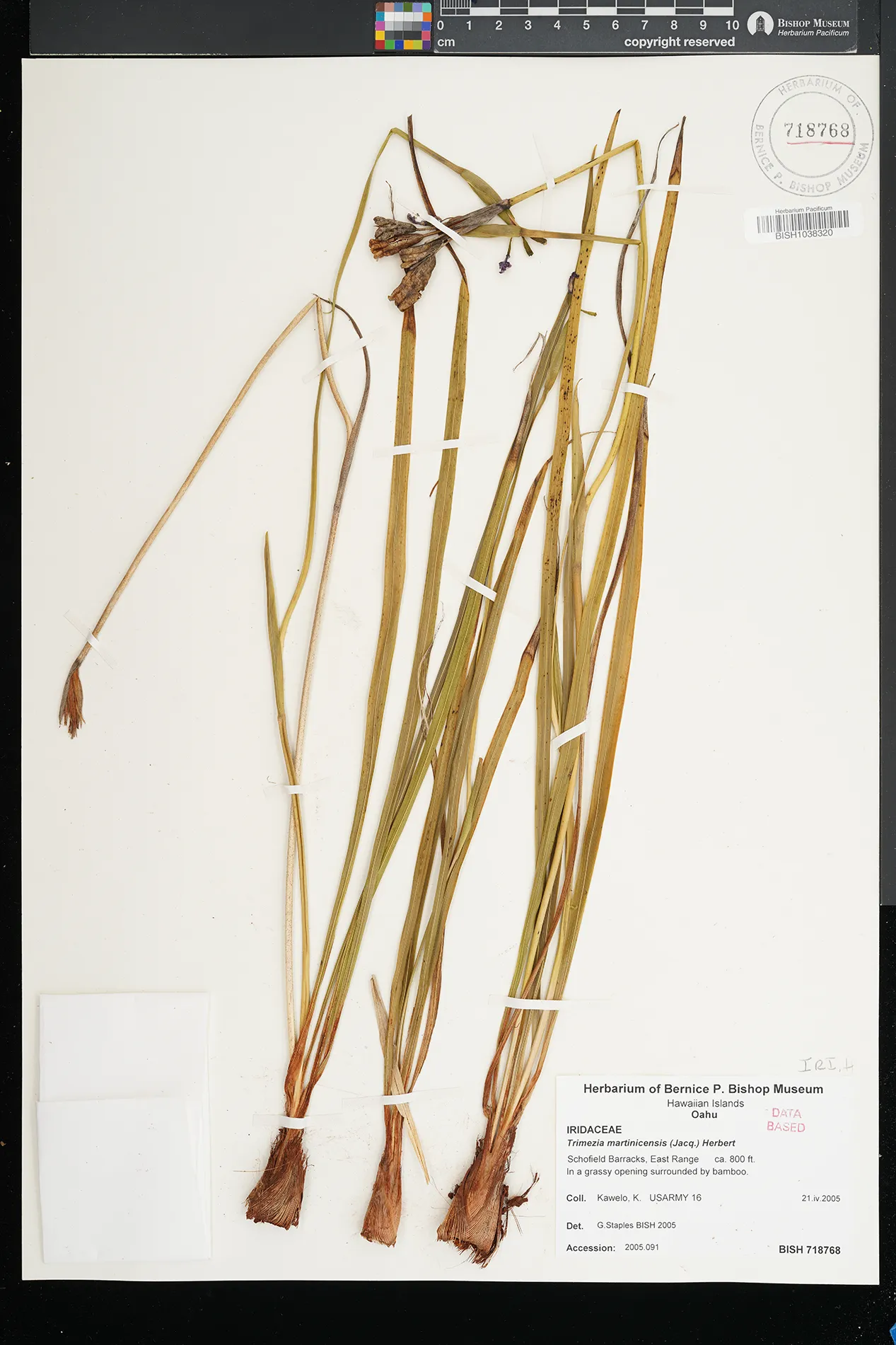 | 23 | Trimezia martinicensis | (Jacq.) Herb. | Schofield Barracks, East Range | In a grassy opening surrounded by bamboo. | PRESERVED_SPECIMEN | Kawelo, K. | USARMY 016 | Oahu | BISH | 4/21/2005 |