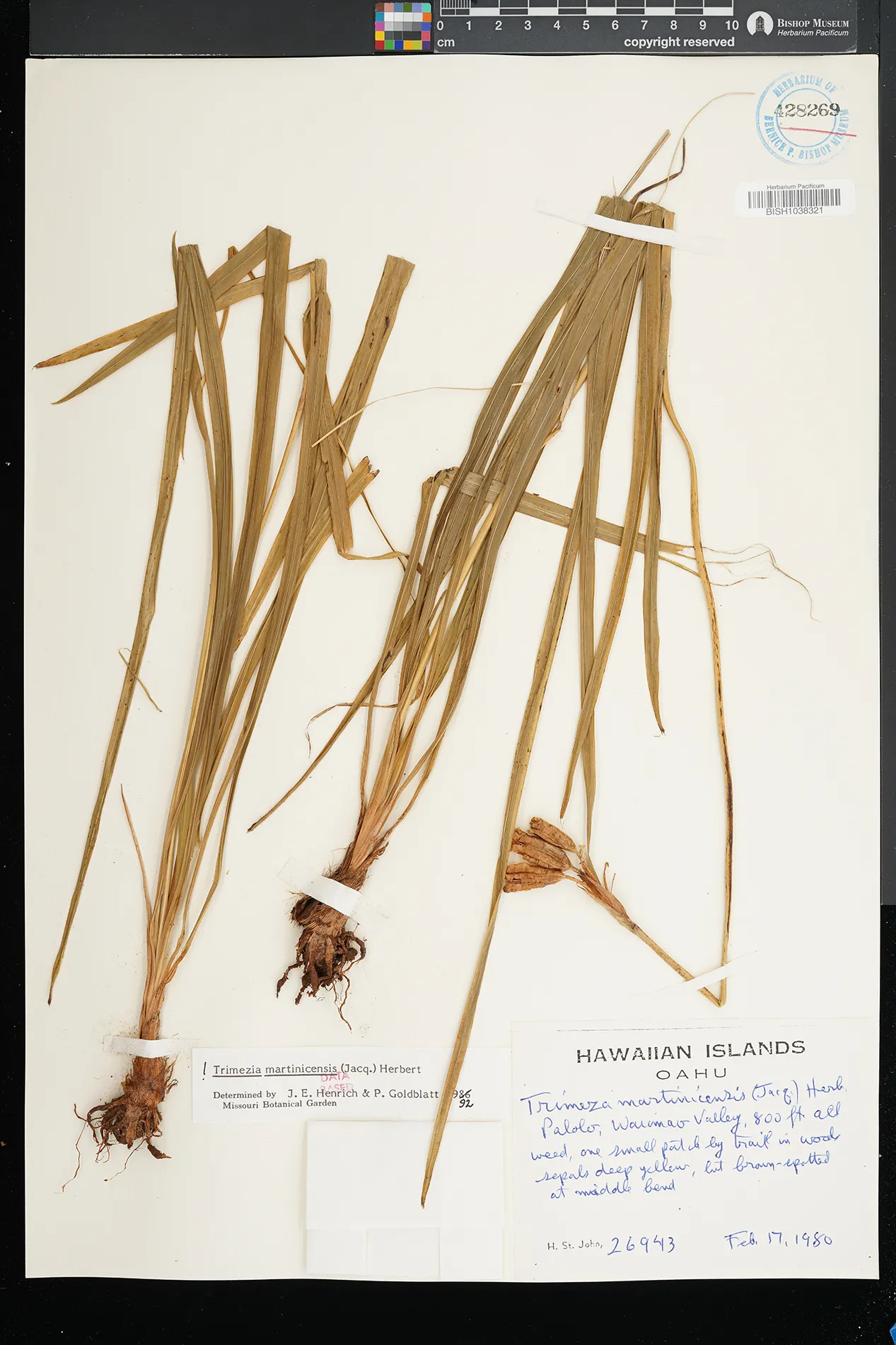 | 4 | Trimezia martinicensis | (Jacq.) Herb. | palolo, waimao valley | One small patch by trail in woods. | PRESERVED_SPECIMEN | st.john, h. | collector number: 26943 | Oahu | BISH | 2/17/1980 |