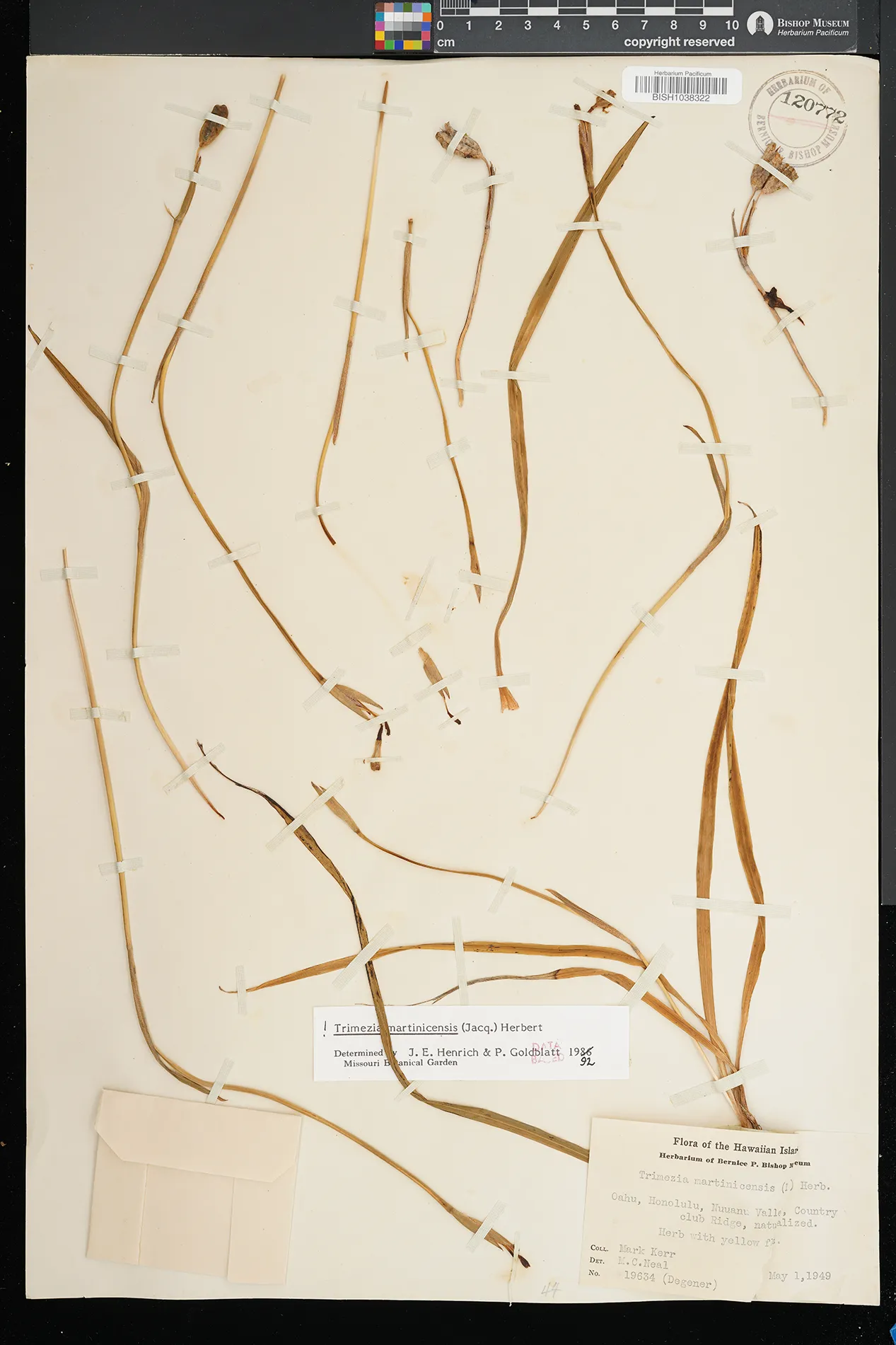 | 12 | Trimezia martinicensis | (Jacq.) Herb. | Honolulu, Dowsett Tract | PRESERVED_SPECIMEN | Handy, E.S. | s.n. | Oahu | BISH | 12/19/1943 | |
