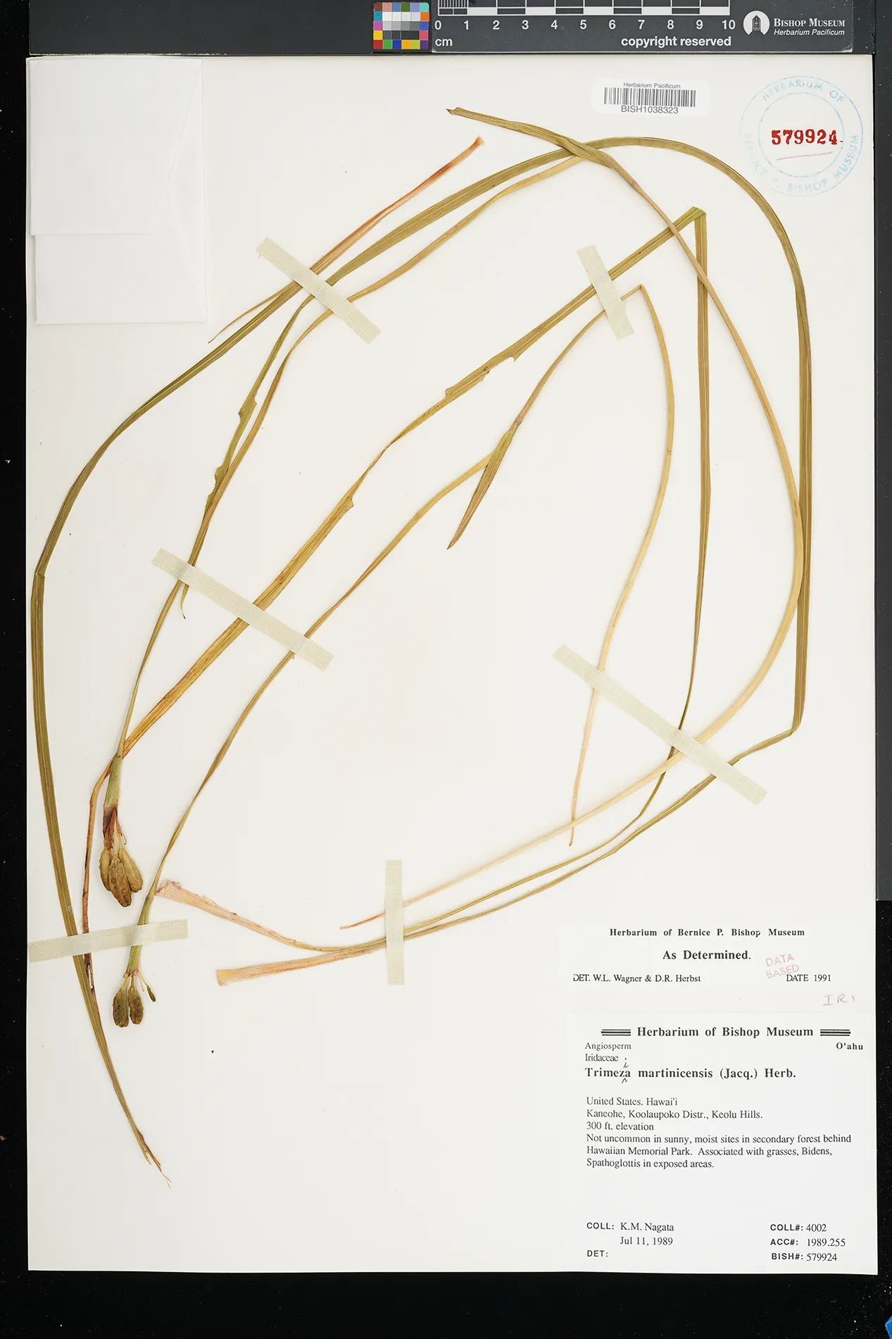| 2 | Trimezia martinicensis | (Jacq.) Herb. | kaneohe, koolaupoko distr., keolu hills. behind hawaiian memorial park. | Not uncommon in sunny, moist sites in secondary forest. Associated with grasses, Bidens, Spathoglottis in exposed areas. | PRESERVED_SPECIMEN | nagata, k.m. | collector number: 4002 | Oahu | BISH | 7/11/1989 |