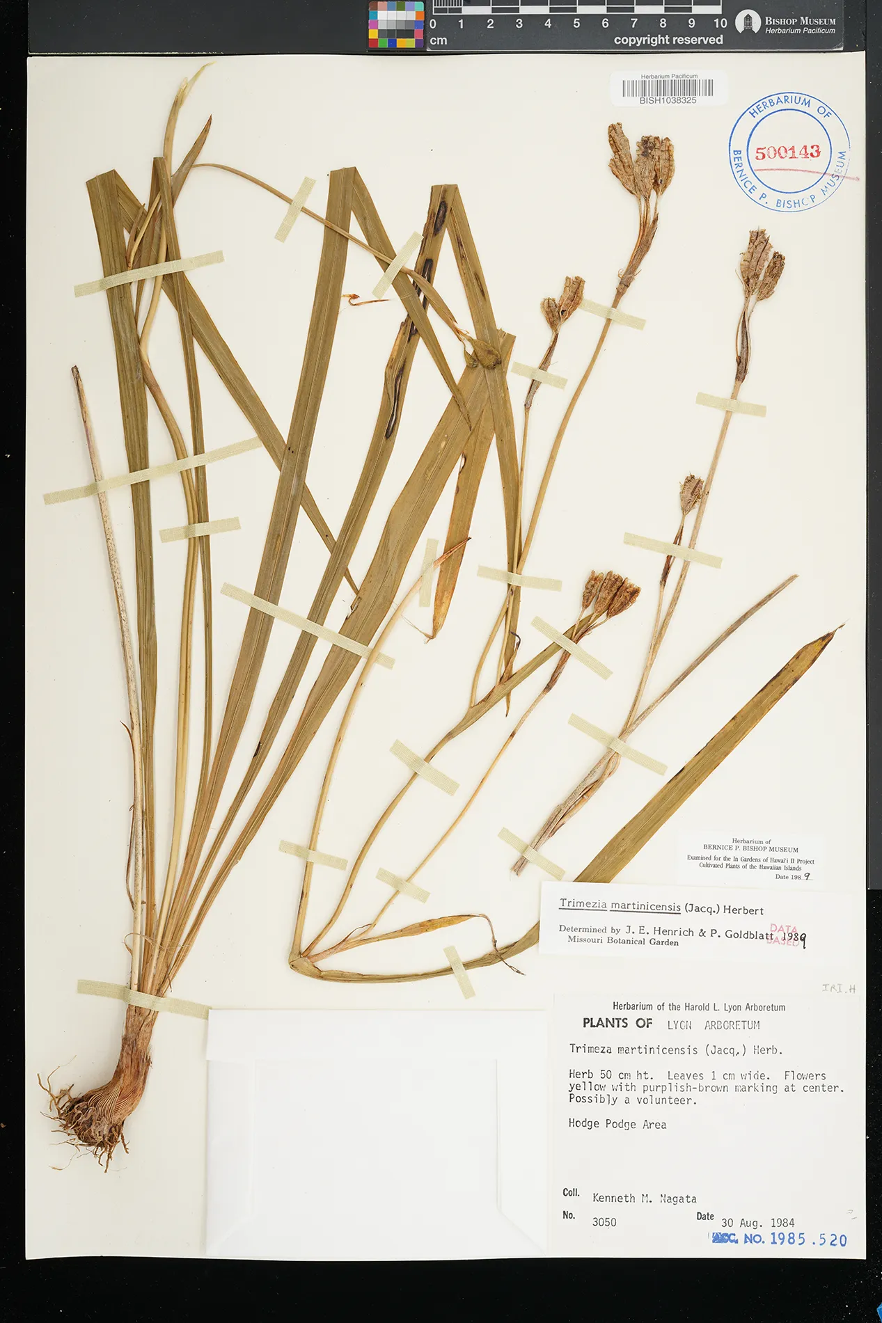 | 3 | Trimezia martinicensis | (Jacq.) Herb. | Lyon Arboretum, hodge podge area | PRESERVED_SPECIMEN | Nagata, K.M. | 3050 | Oahu | BISH | 8/30/1984 | |