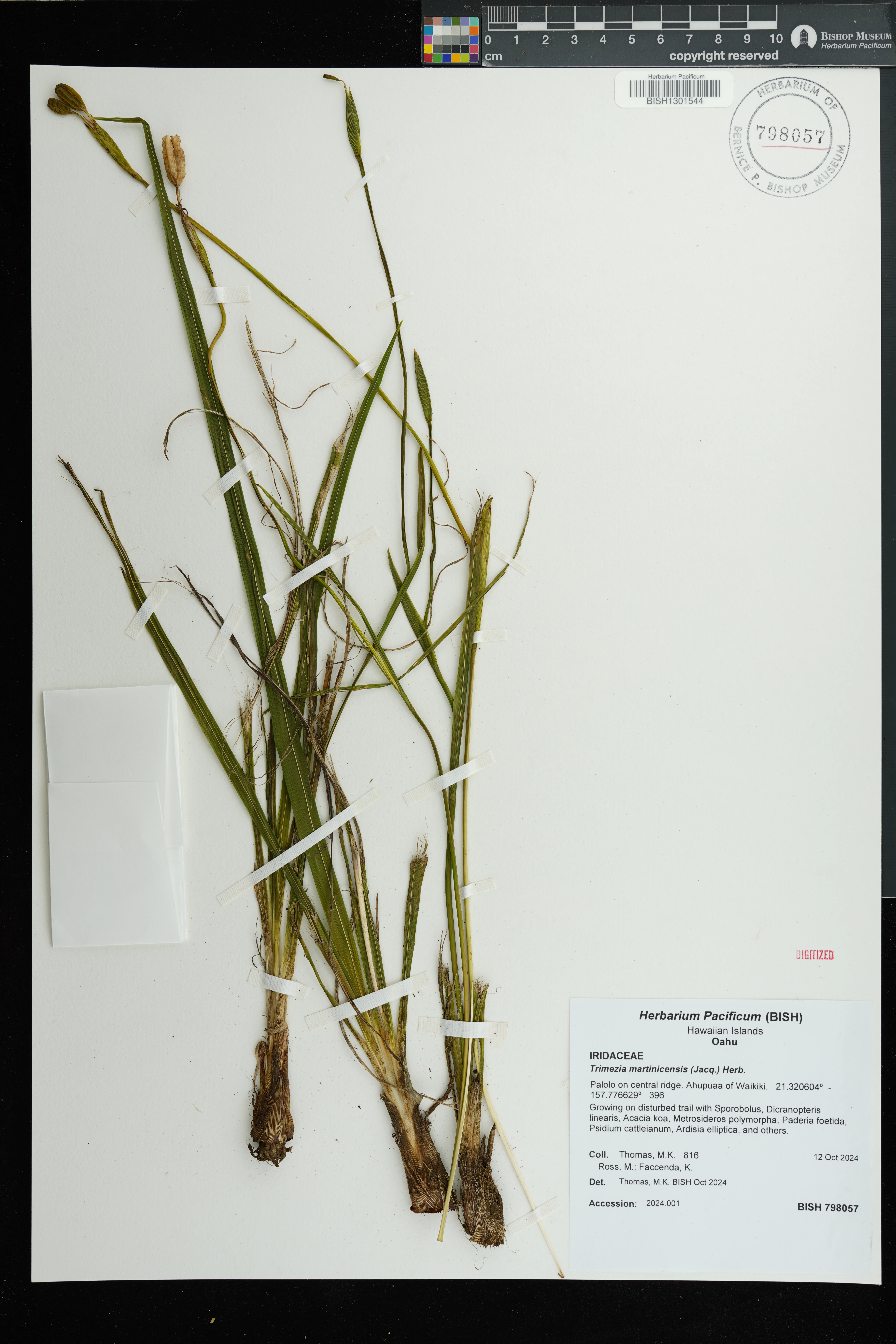 | 11 | Trimezia martinicensis | (Jacq.) Herb. | Palolo Valley, Wai'oma'o Stream up to falls to Ka'au Crater. | Disturbed valley bottom | PRESERVED_SPECIMEN | Wagner, W. L. | 6760 | Oahu | US | 6/14/1994 |