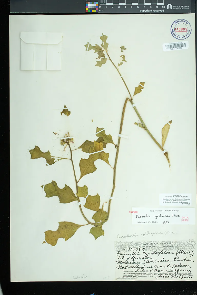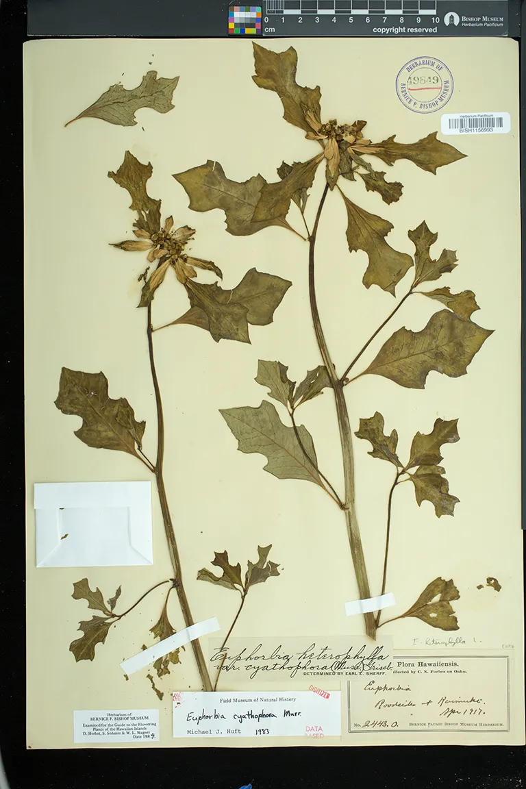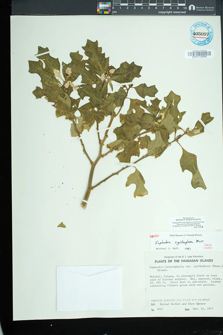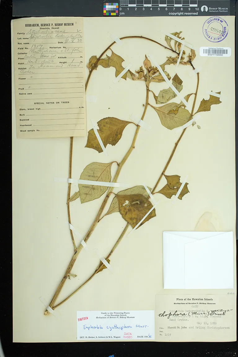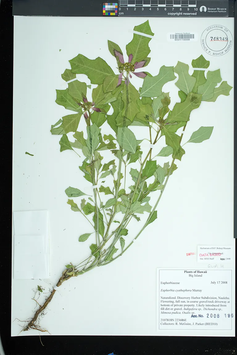 Flowers in cyathia in dense terminal cymes. pistillate flowers solitary, on a gynophore; staminate flowers in 5 groups or cymules, each with 1 to several flowers. involucre ca. 3 mm high, glabrous, gland 1, bilabiate, flattened, without an appendage.