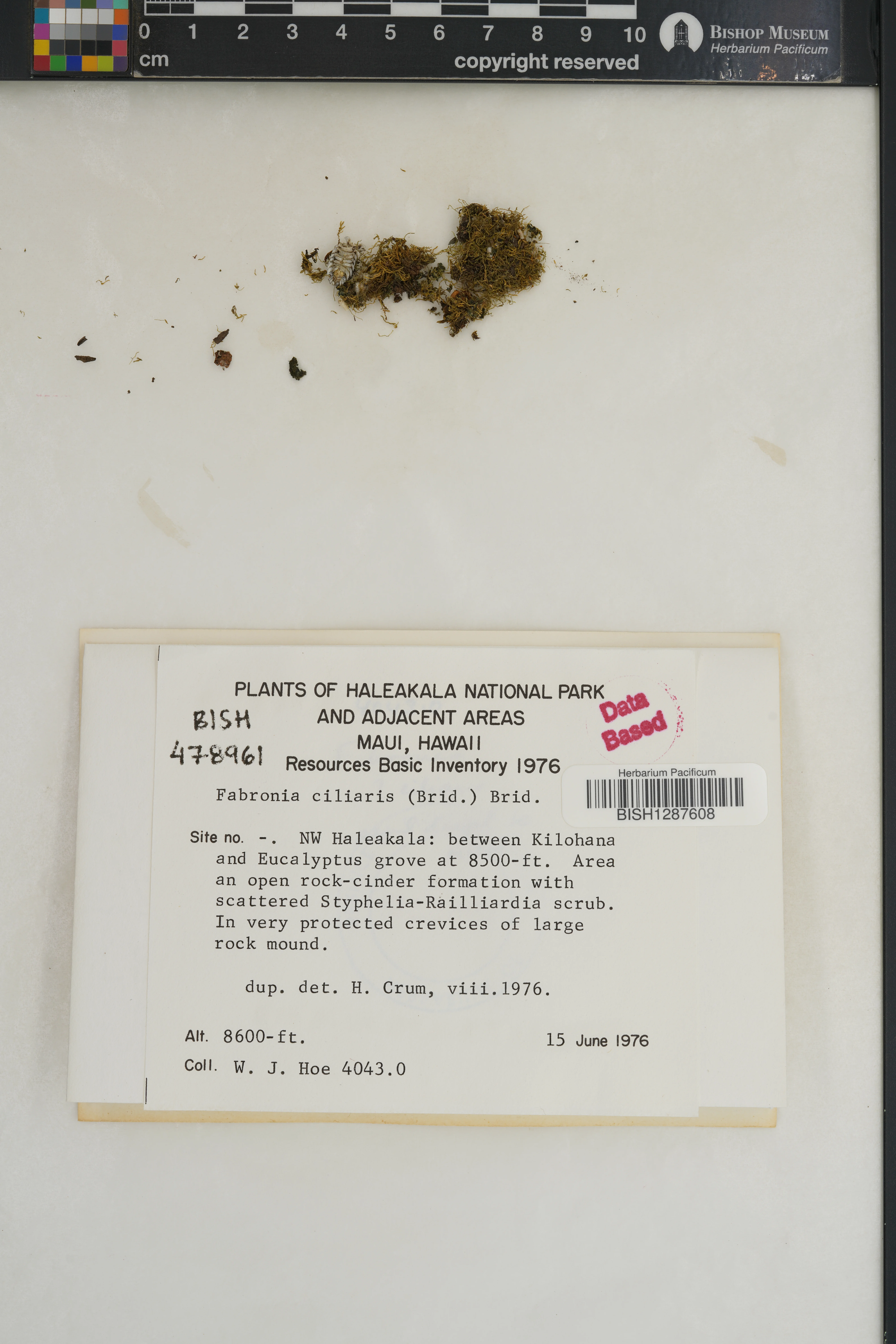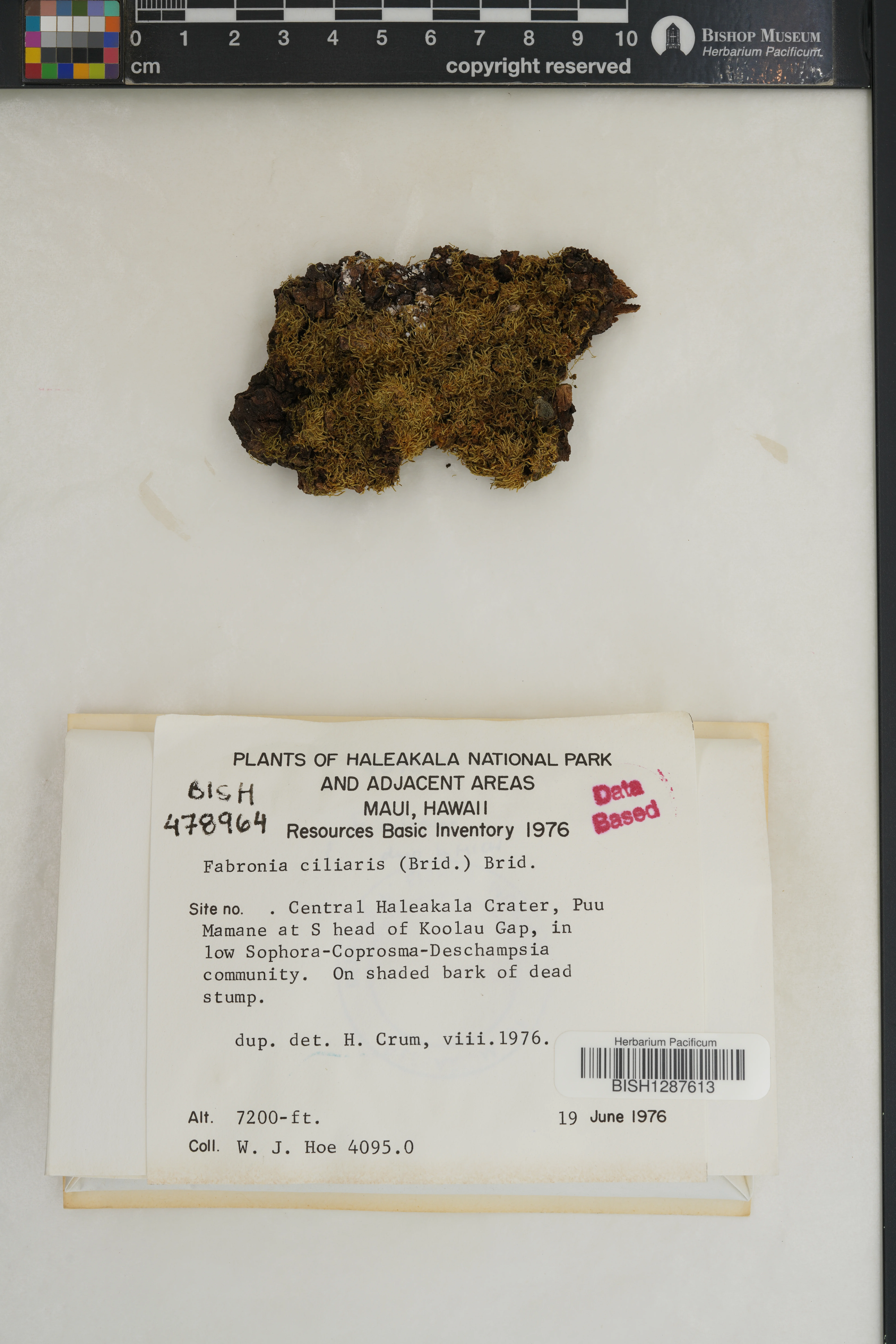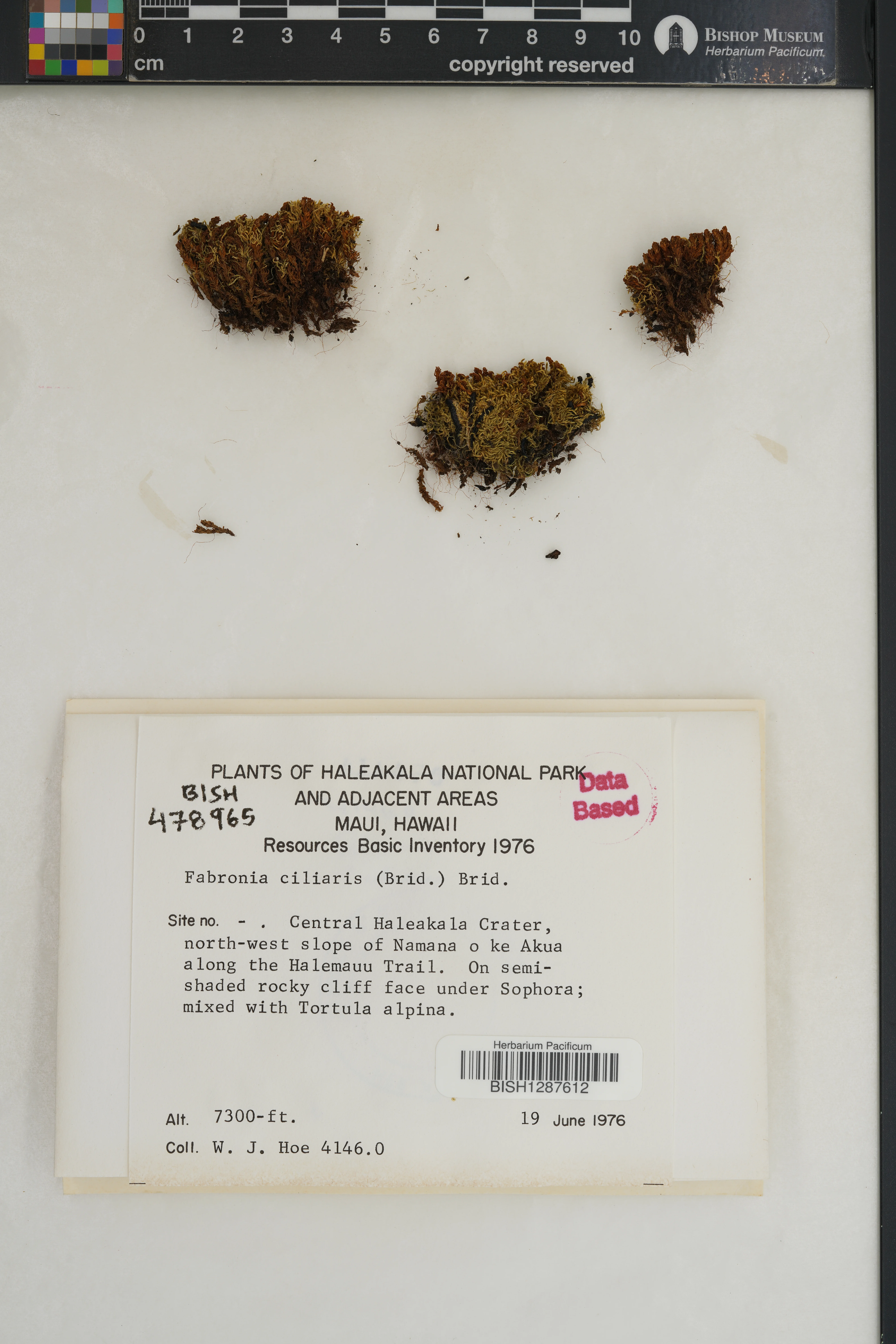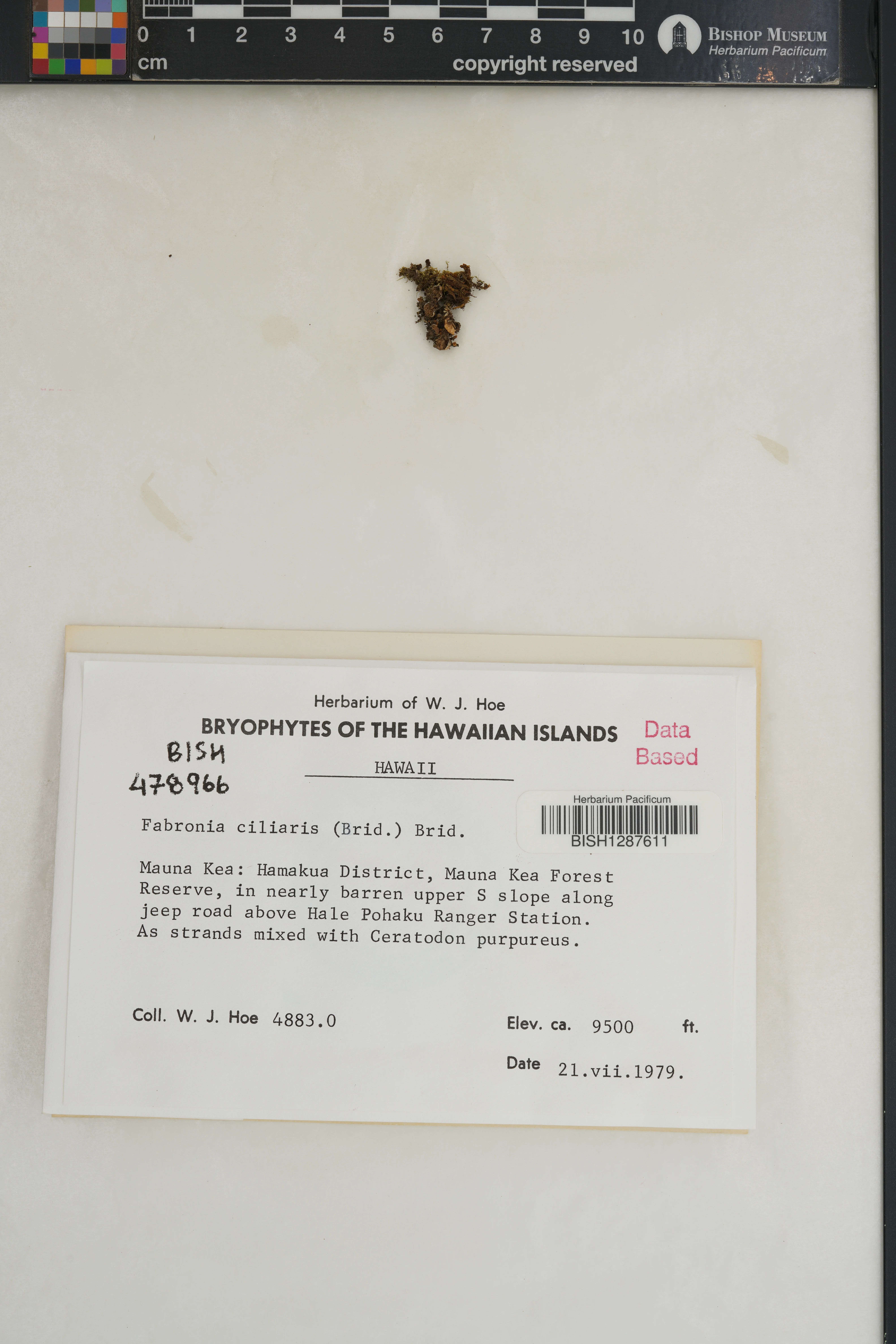 Kingdom: Viridiplantae Phylum: Bryophyta Class/Clade: Bryopsida Order: Hypnales Family: Fabroniaceae Genus: Fabronia