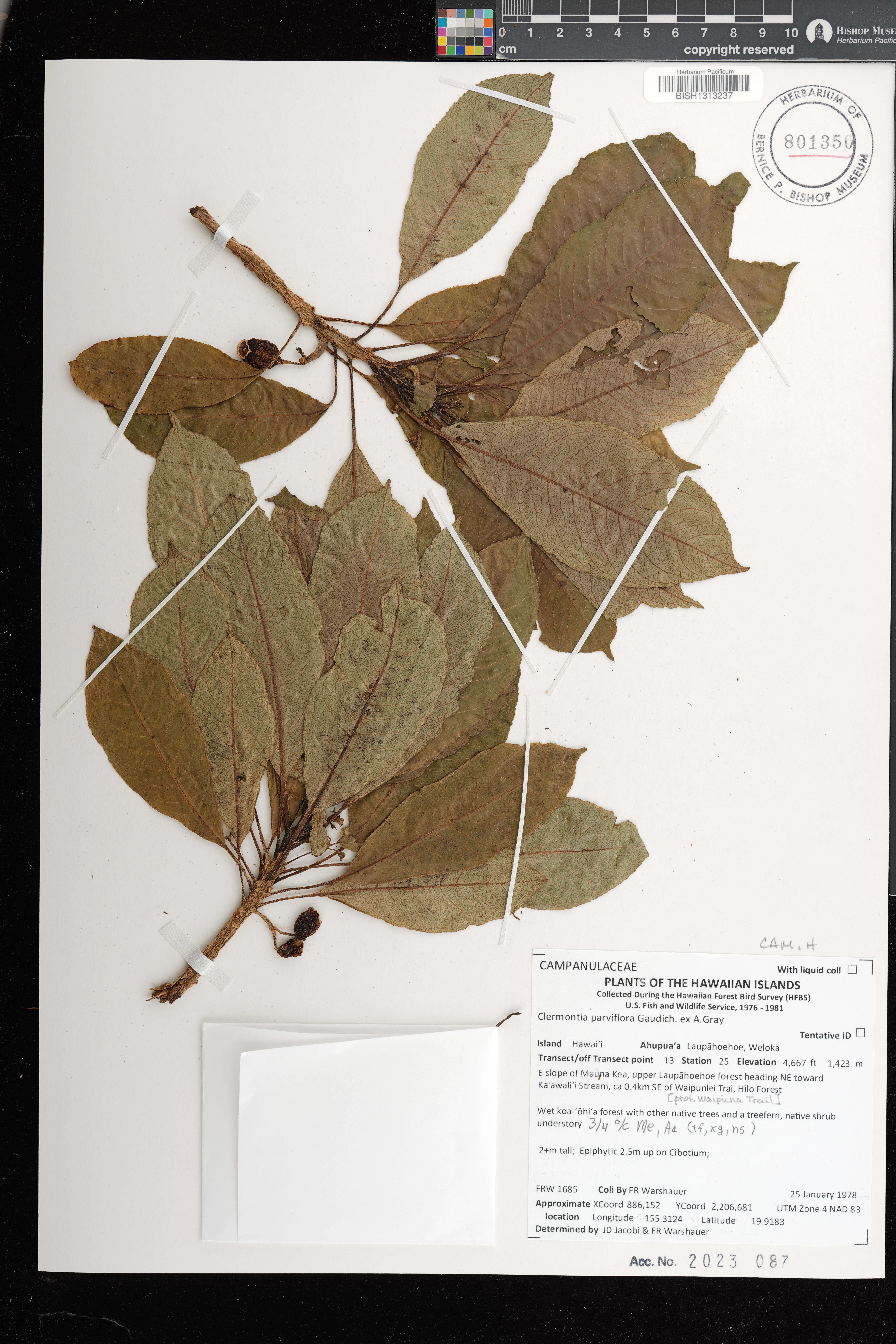 with ohia, Myrsine lessertiana, M. sandwicensis, Ilex, Pelea, Gouldia, Vaccinium calycinum, Styphelia, Broussaisia; on Cibotium |