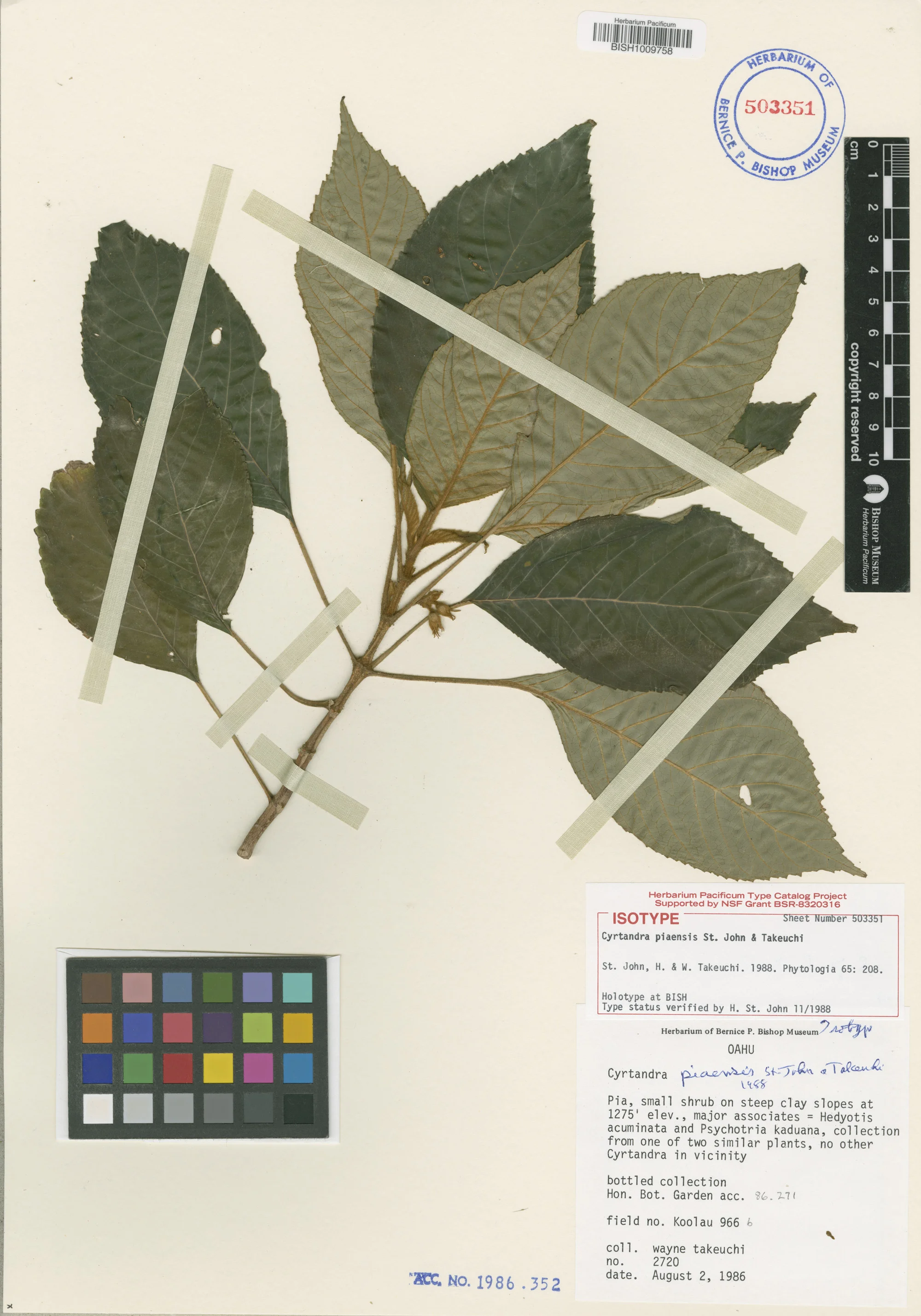 1 Cyrtandra × piaensis Pia, Niu On steep clay slopes, major associates: Hedyotis acuminata and Psychotria kaduana. Preserved_Specimen Small shrub. Collection from 1 or 2 similar plants, no other Cyrtandra in vicinity. Takeuchi, W.N. 2720 Oahu BISH 1986-08-02