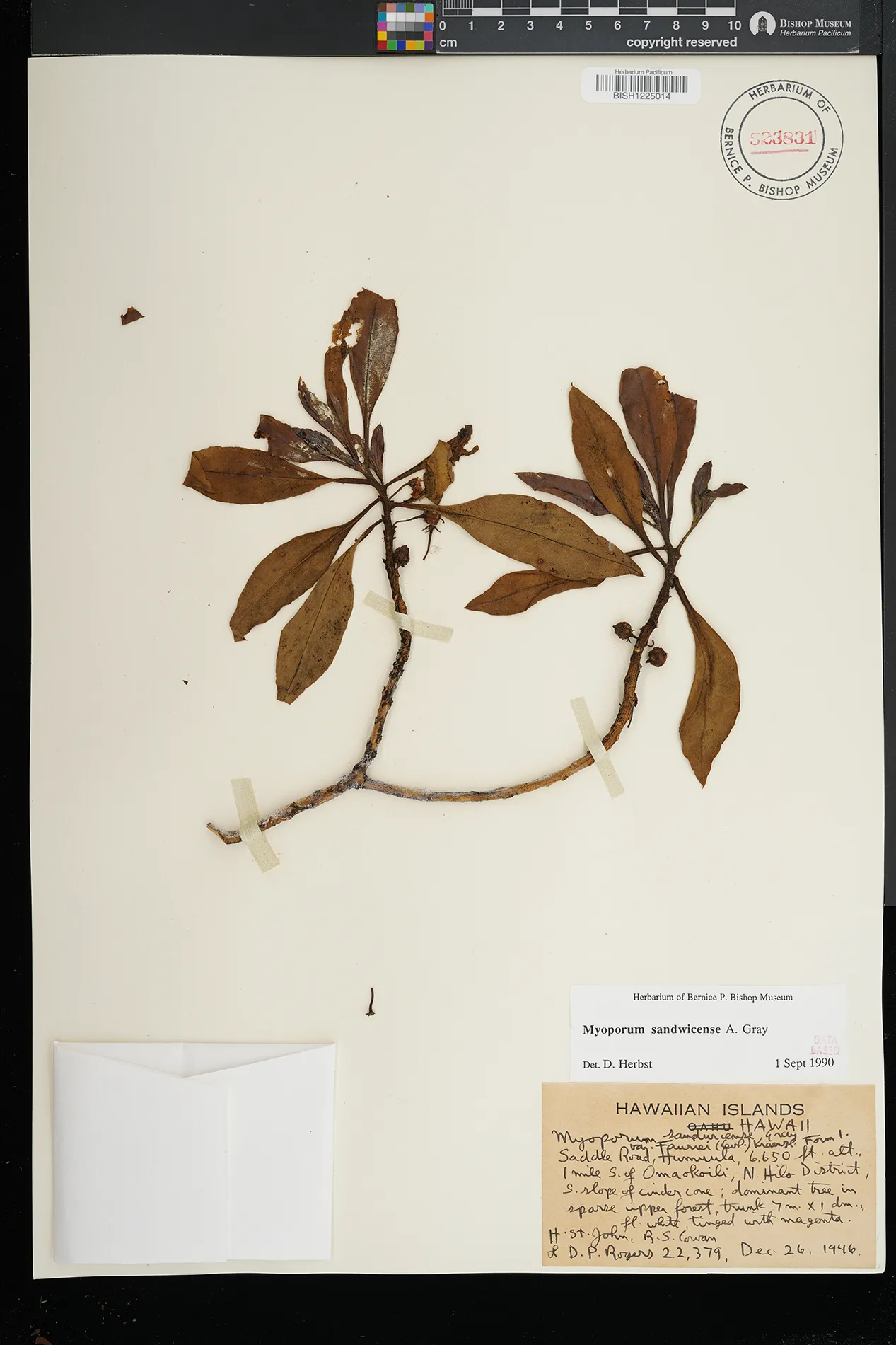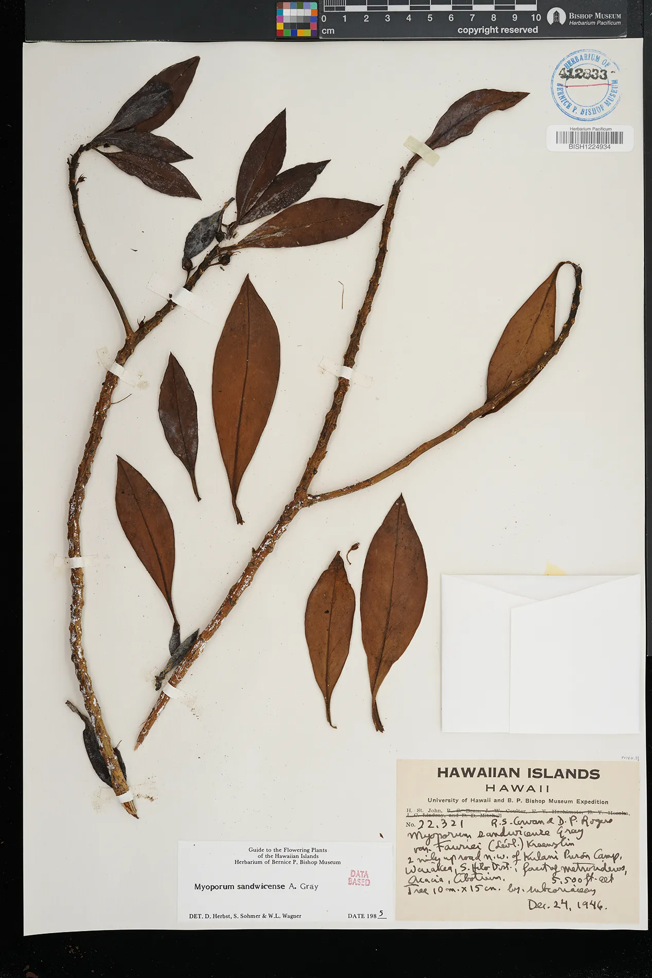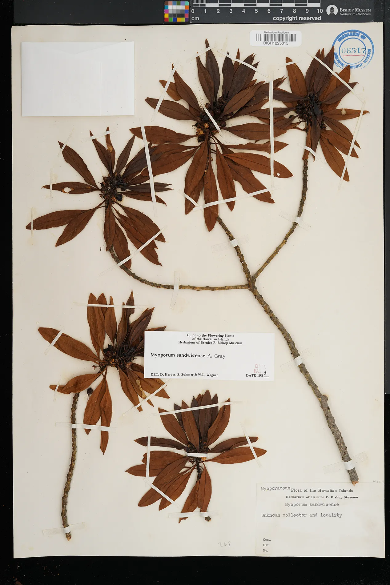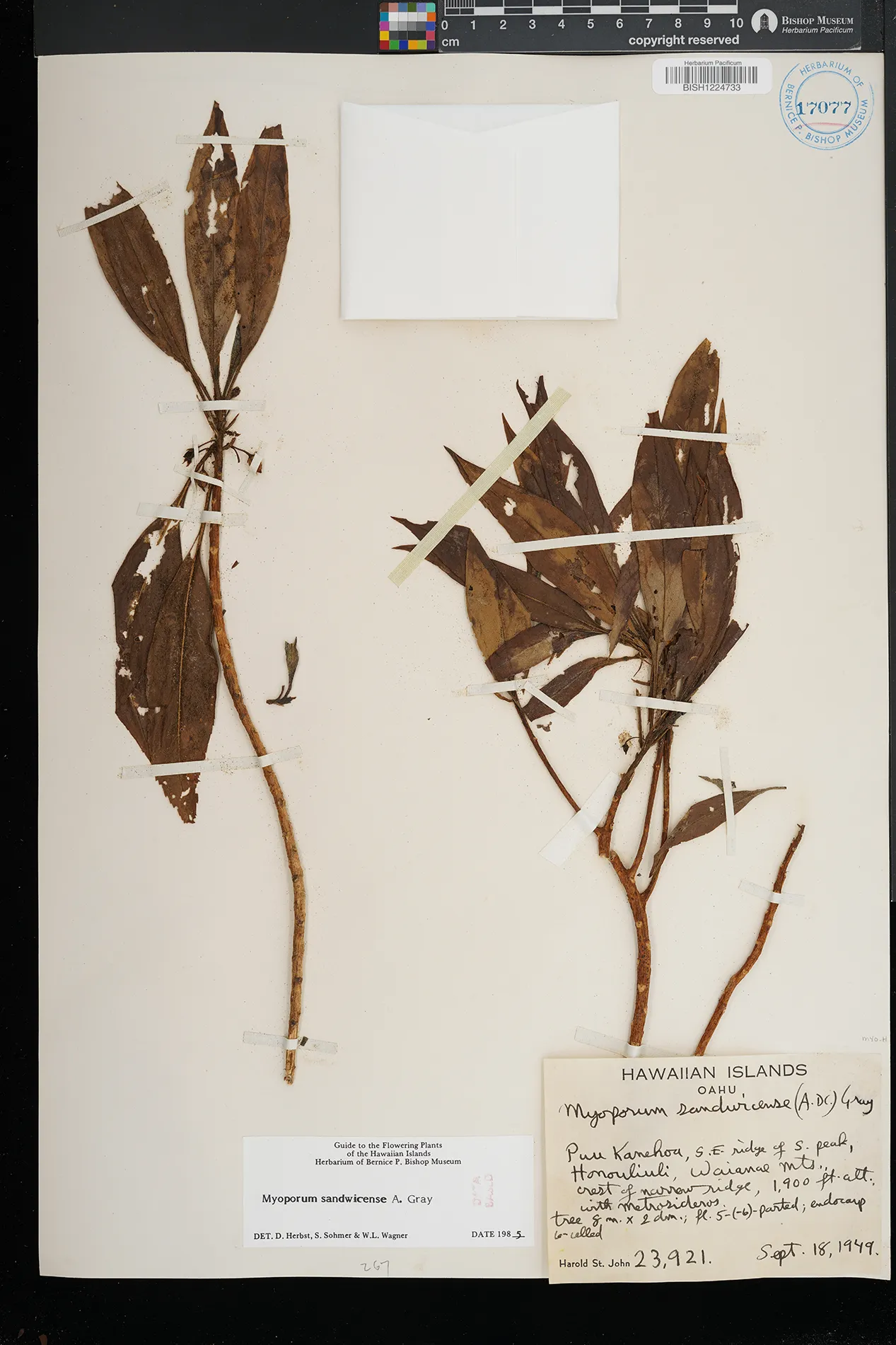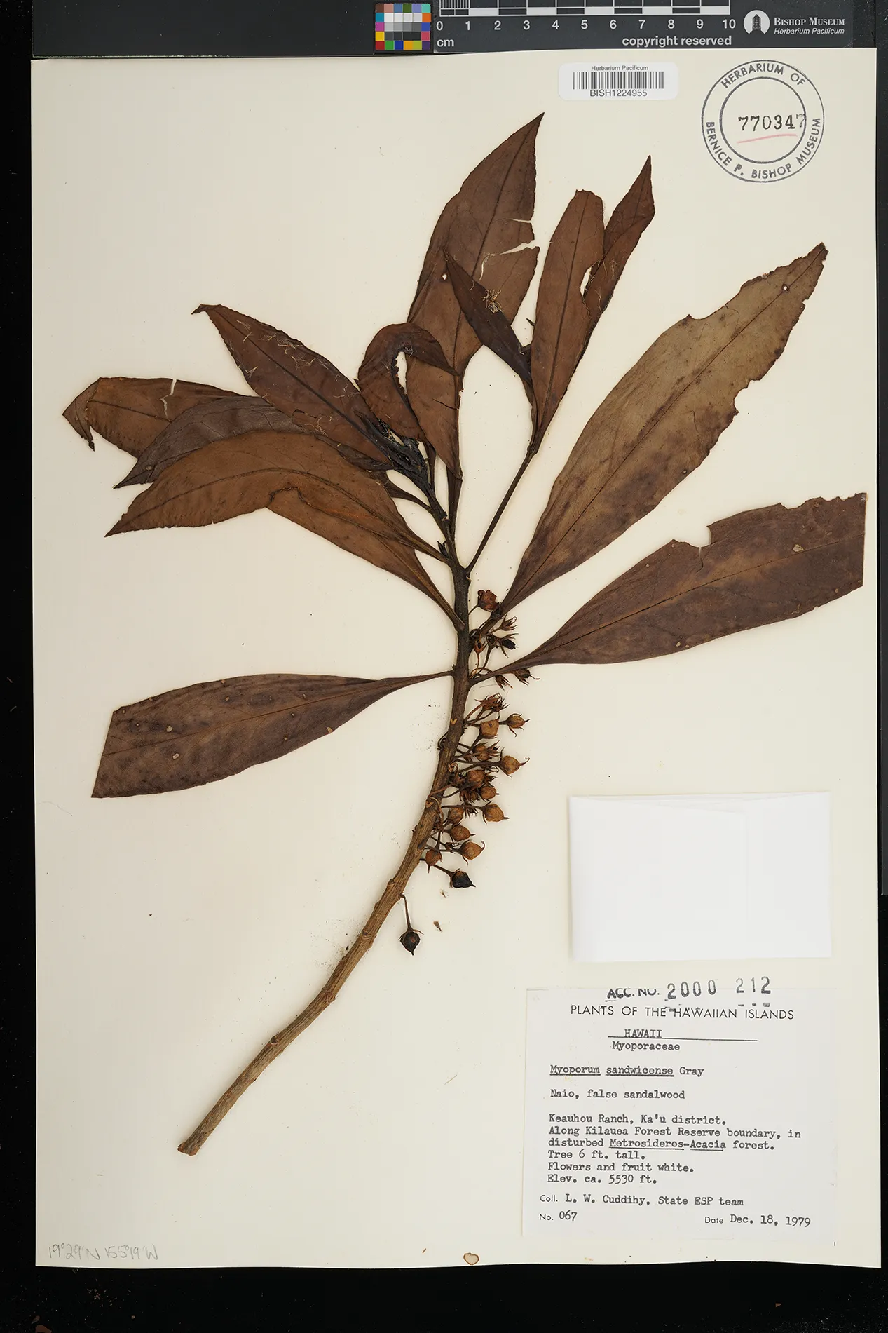 Wood has odor similar to sandalwood (Degener 1930:267). Used for house posts (Degener 1930:268; Krauss 1993:56). Burns well and long, used for torches (Lamb 1981:127). Wood used for fish net gauge (haha ka ‘upena) (Krauss 1993:35). In the Ethnology Collection at Bishop Museum there is a post-contact example of the wood made into a bowl.