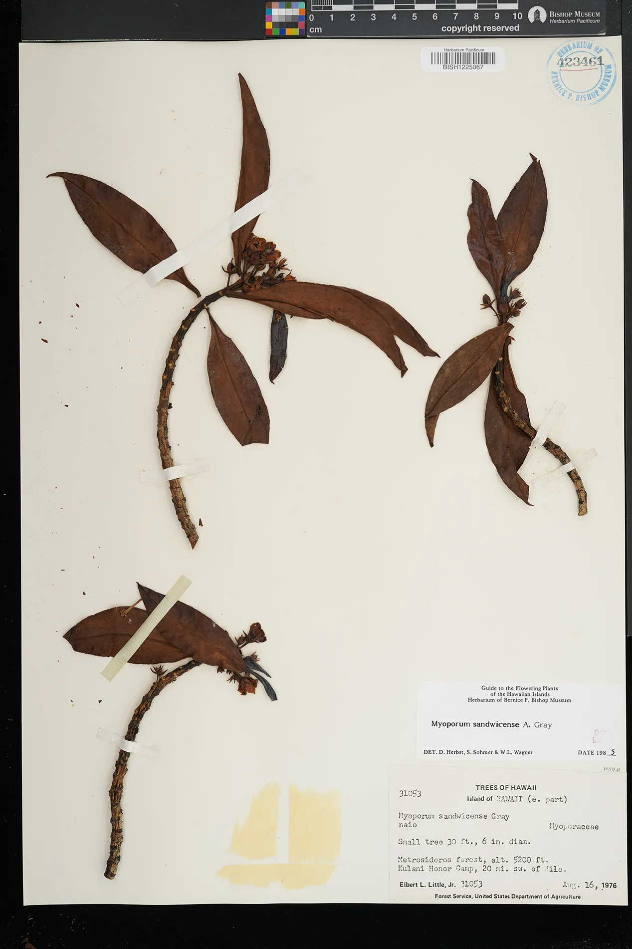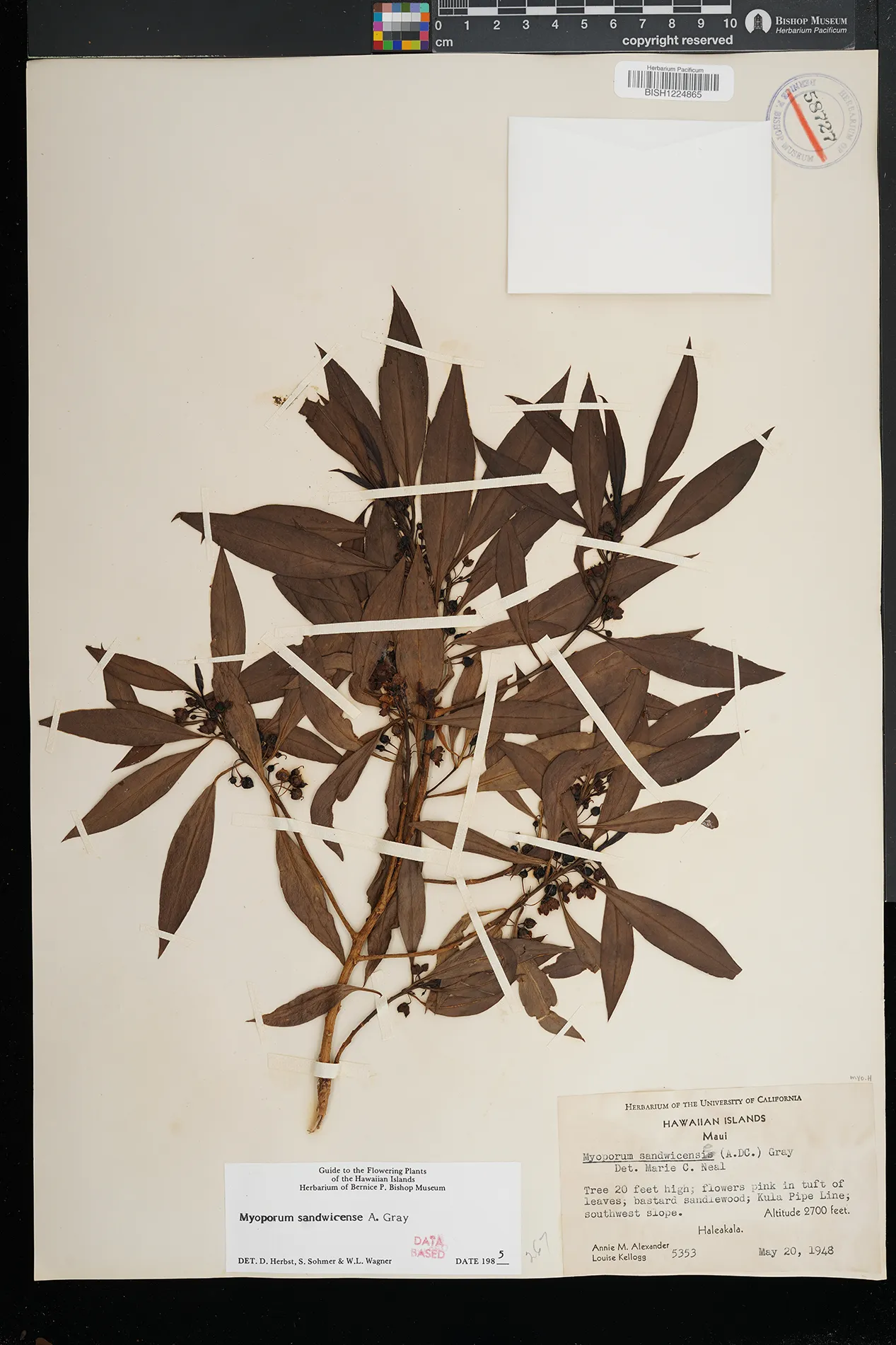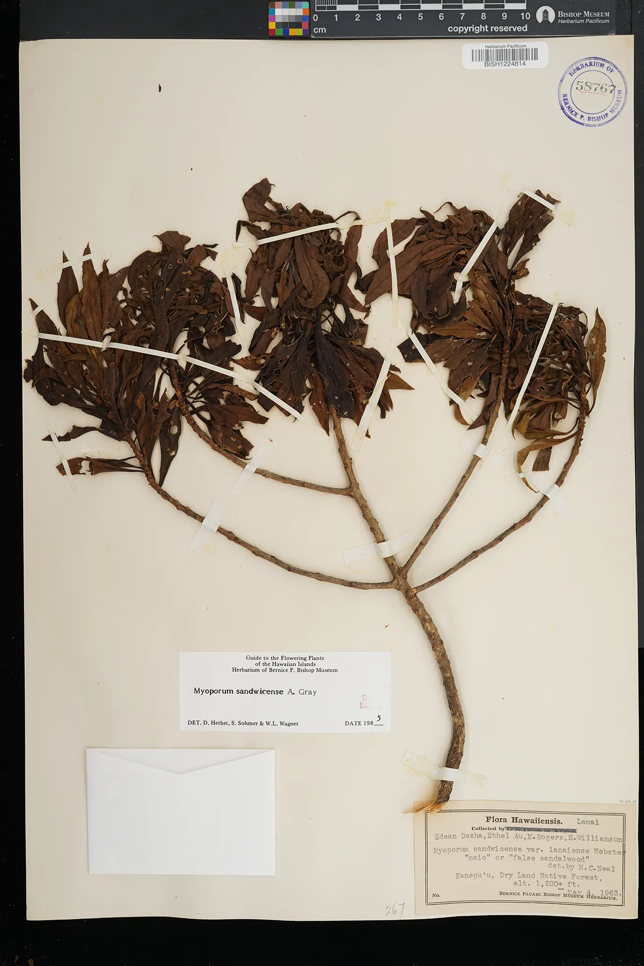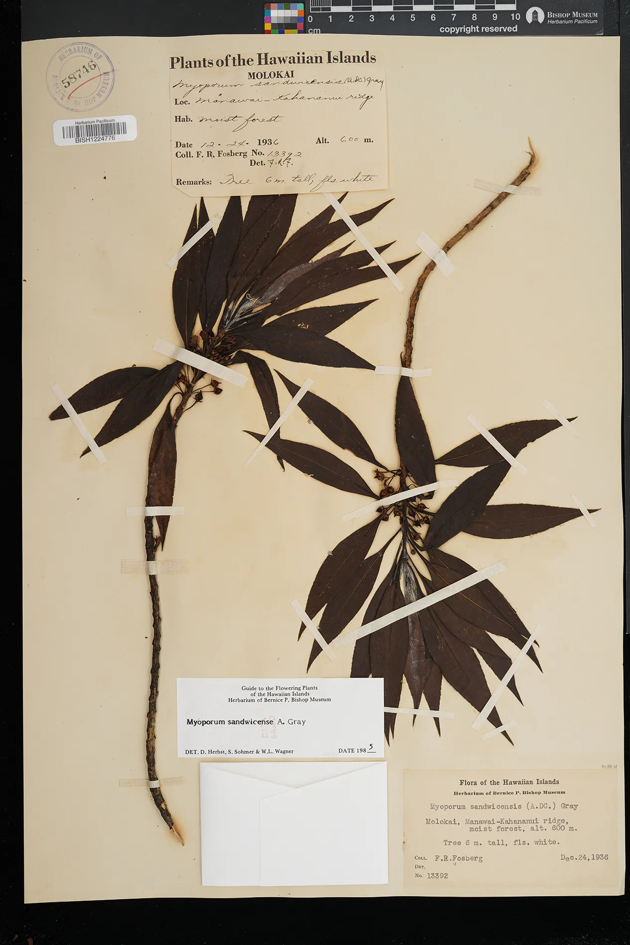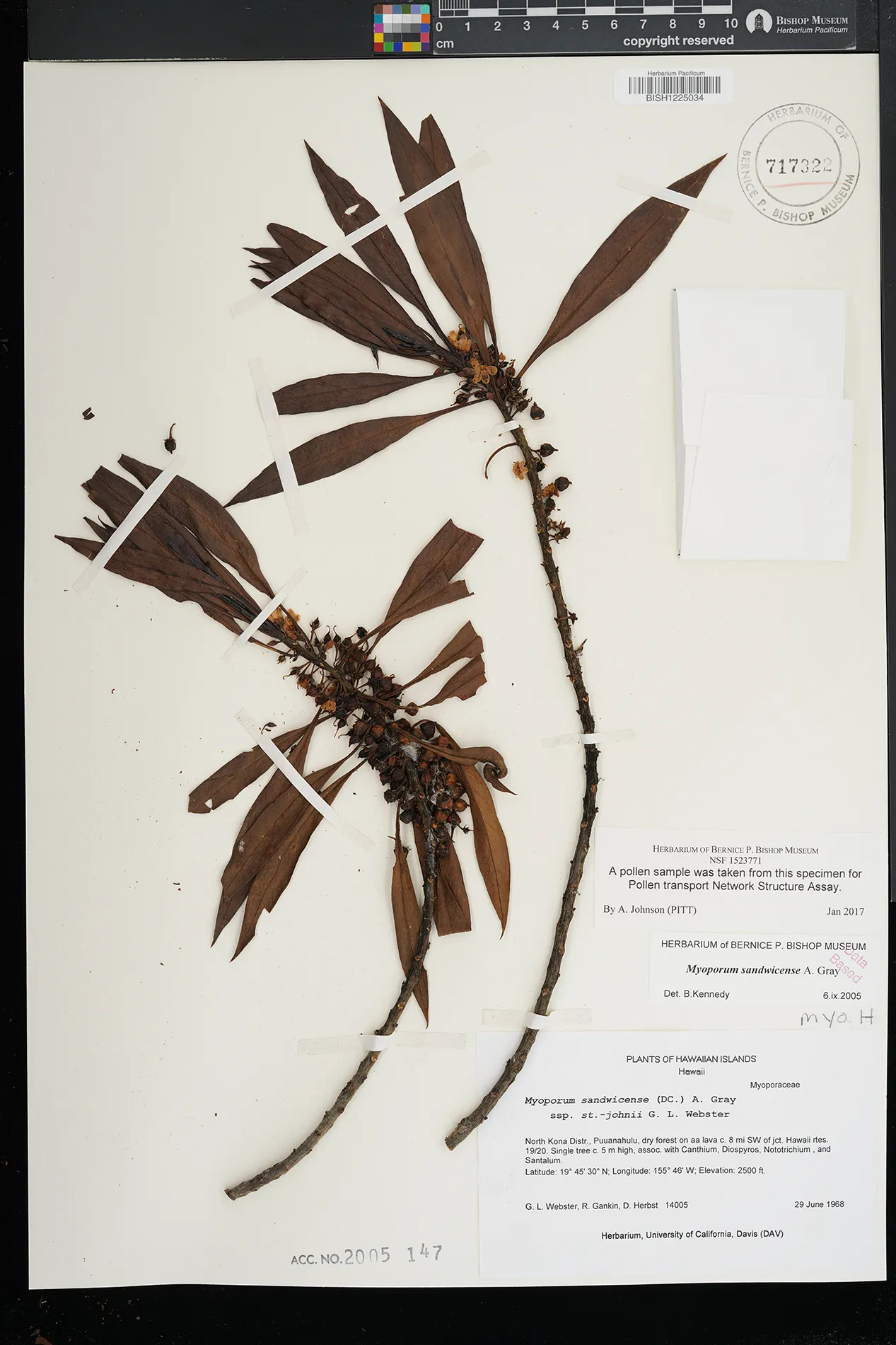 Wood has odor similar to sandalwood (Degener 1930:267). Used for house posts (Degener 1930:268; Krauss 1993:56). Burns well and long, used for torches (Lamb 1981:127). Wood used for fish net gauge (haha ka ‘upena) (Krauss 1993:35). In the Ethnology Collection at Bishop Museum there is a post-contact example of the wood made into a bowl.