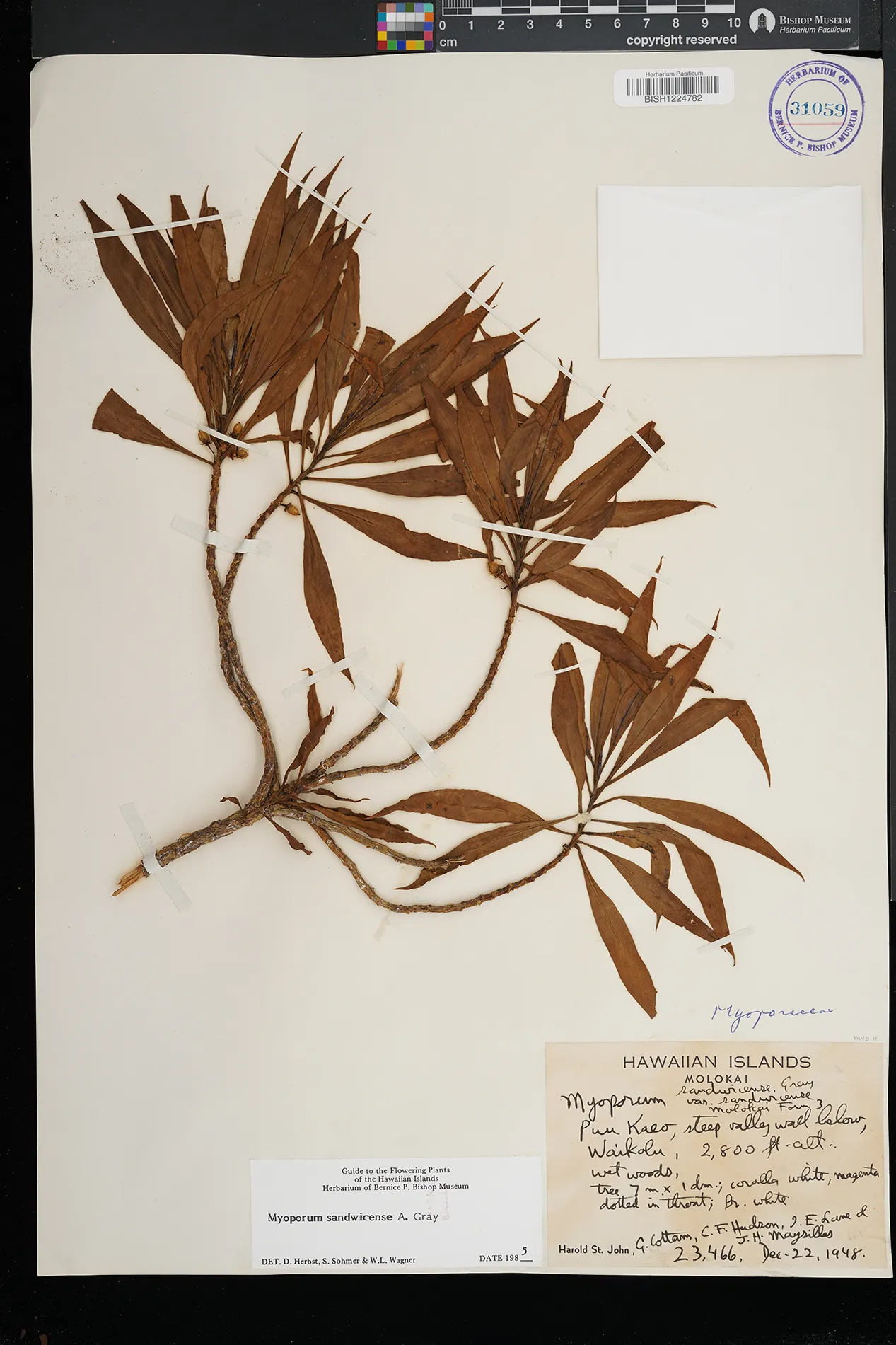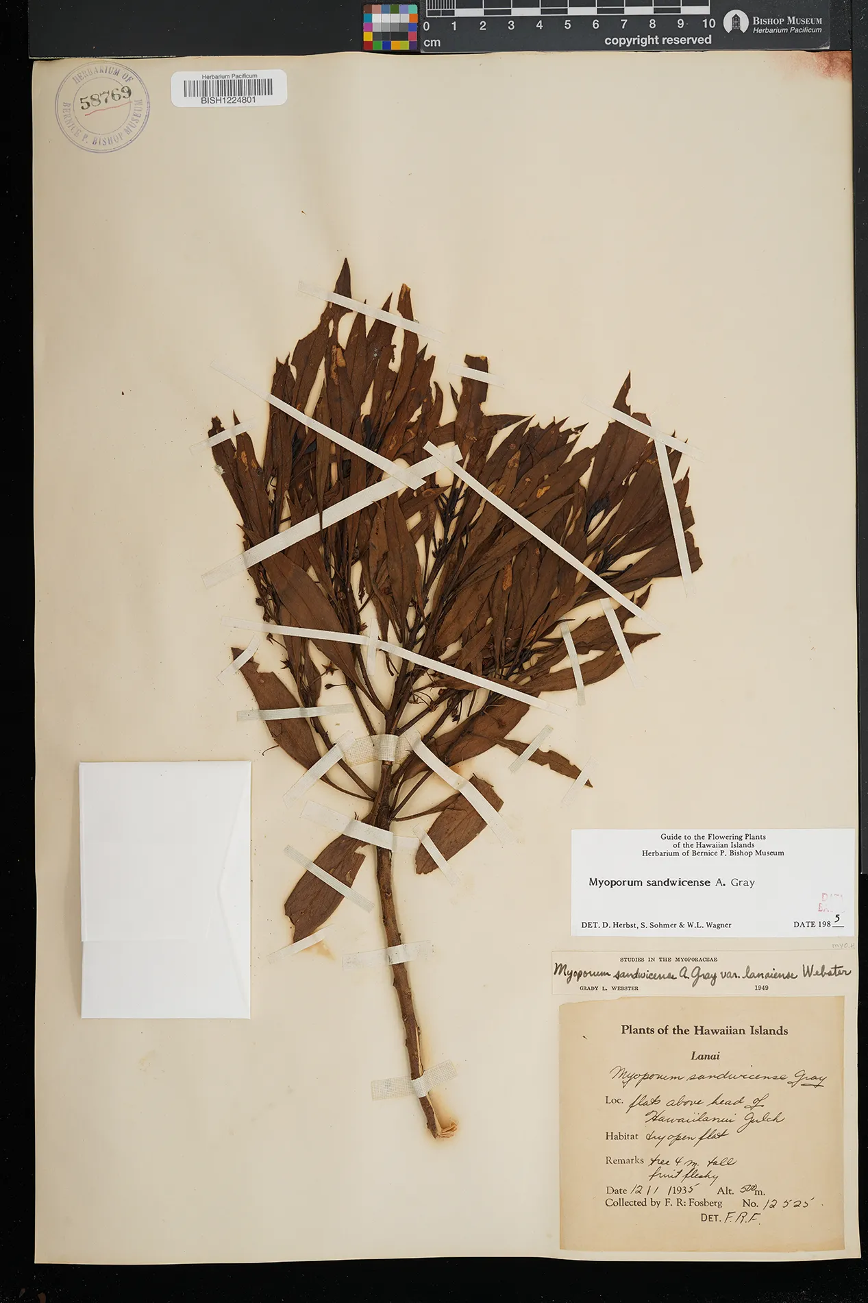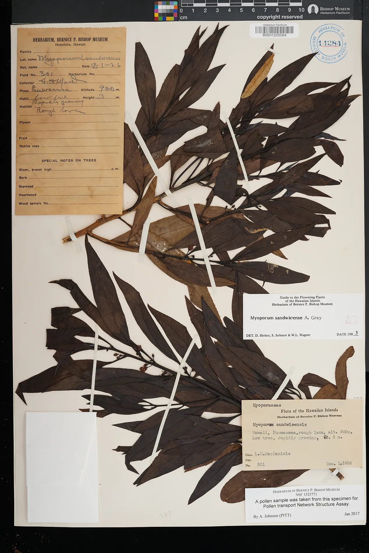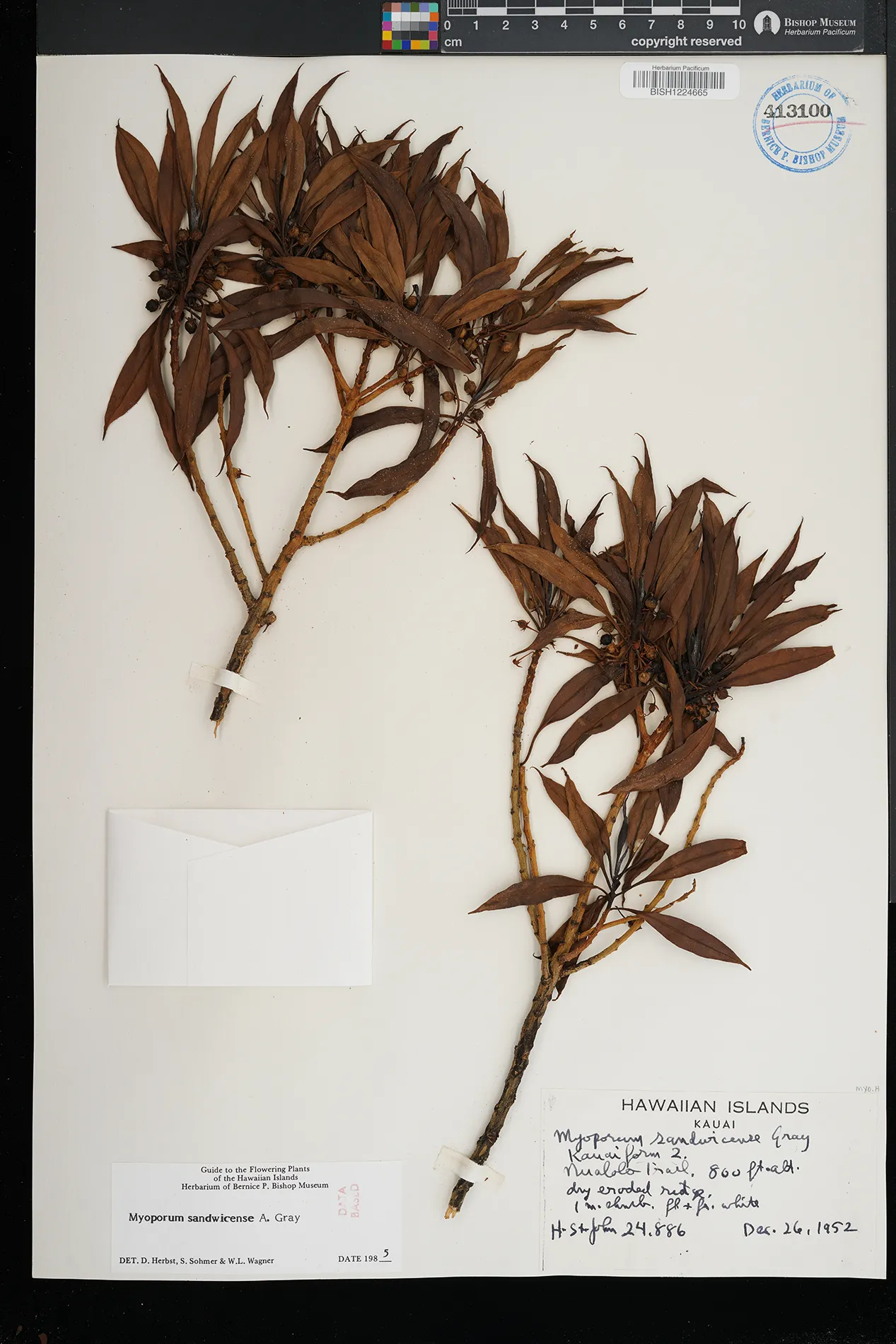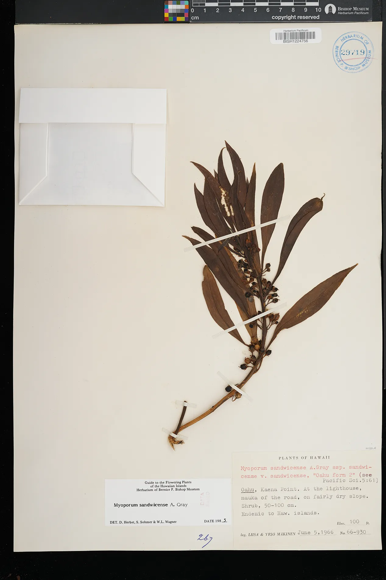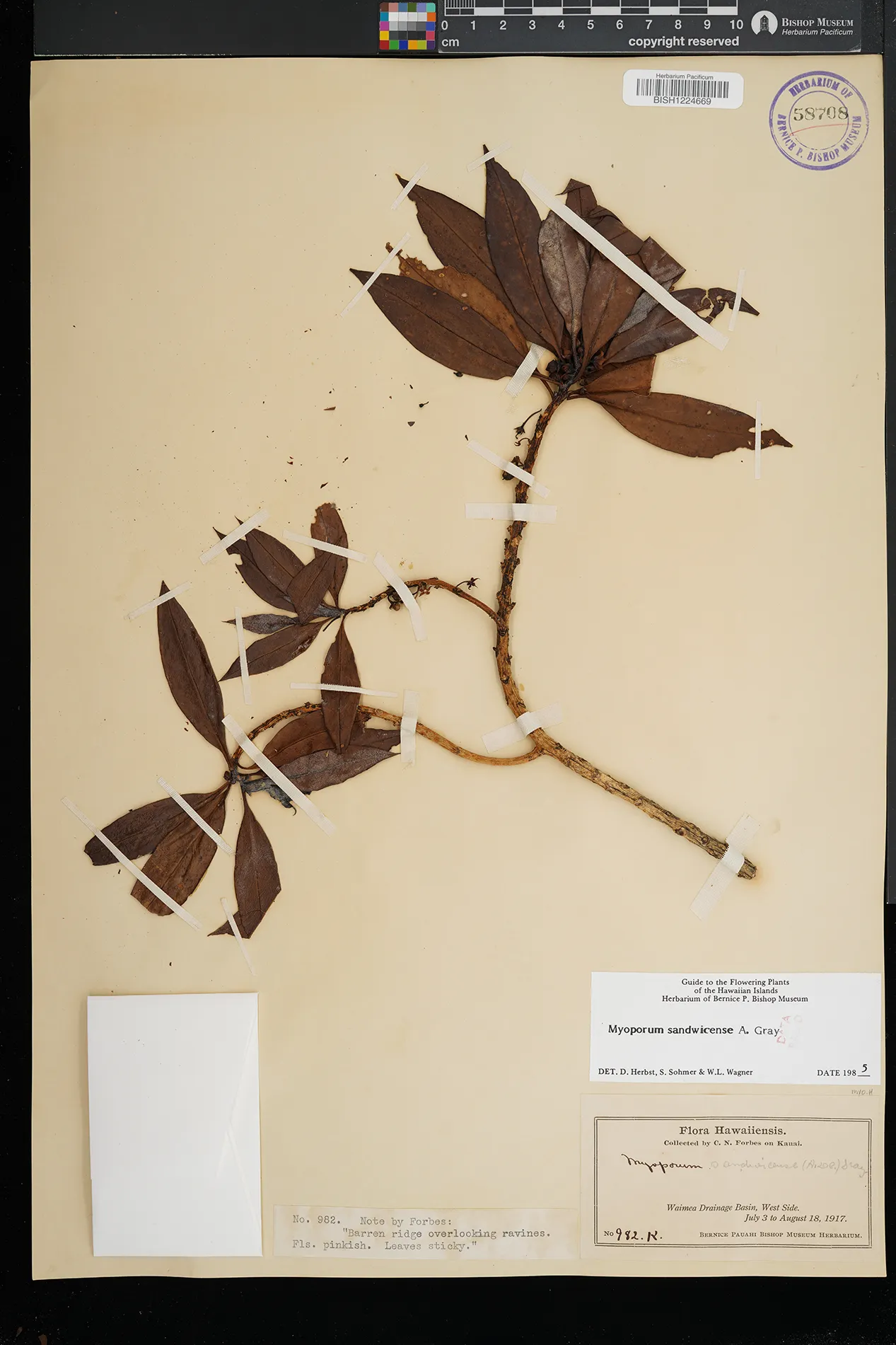 Wood has odor similar to sandalwood (Degener 1930:267). Used for house posts (Degener 1930:268; Krauss 1993:56). Burns well and long, used for torches (Lamb 1981:127). Wood used for fish net gauge (haha ka ‘upena) (Krauss 1993:35). In the Ethnology Collection at Bishop Museum there is a post-contact example of the wood made into a bowl.