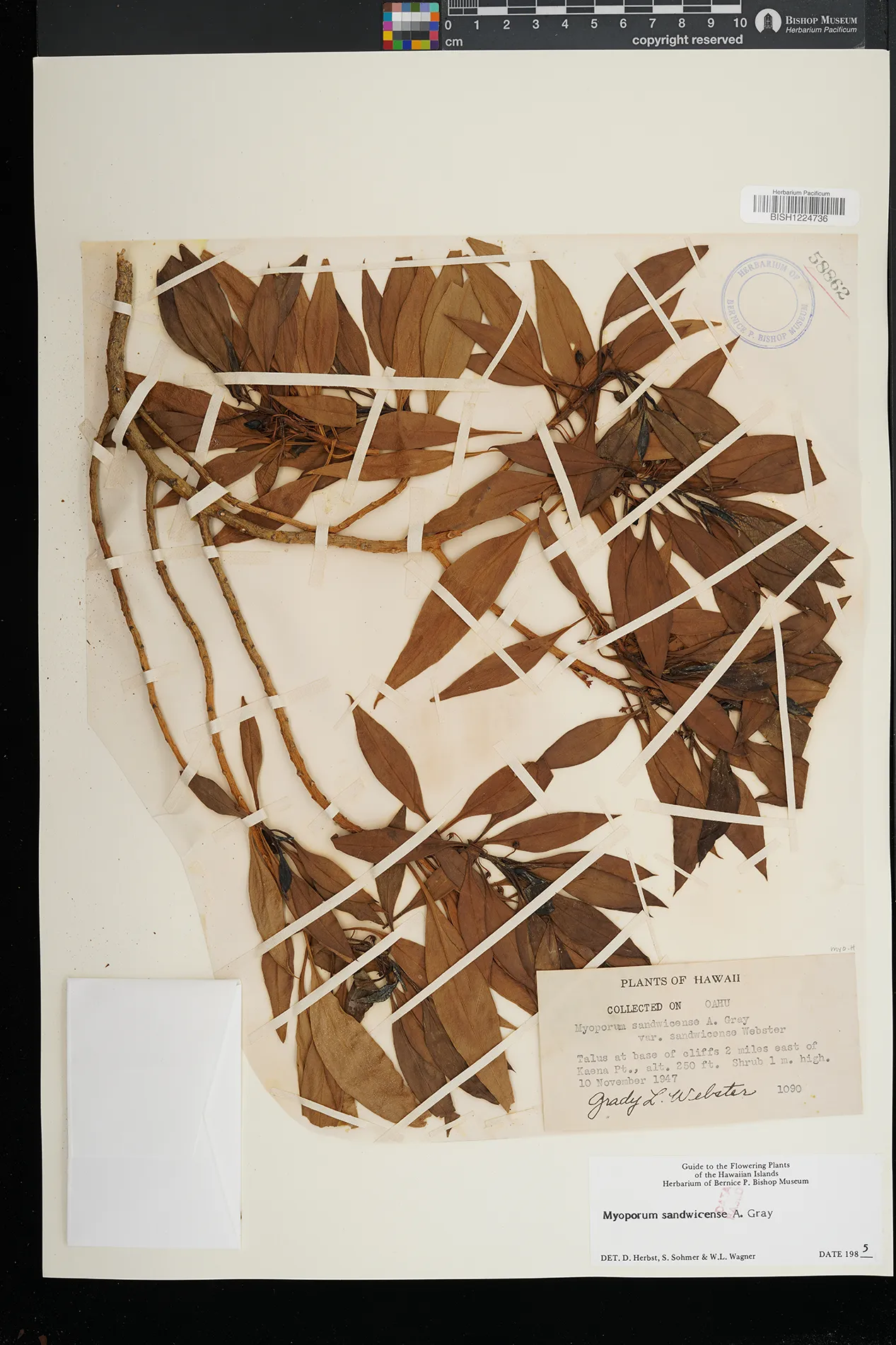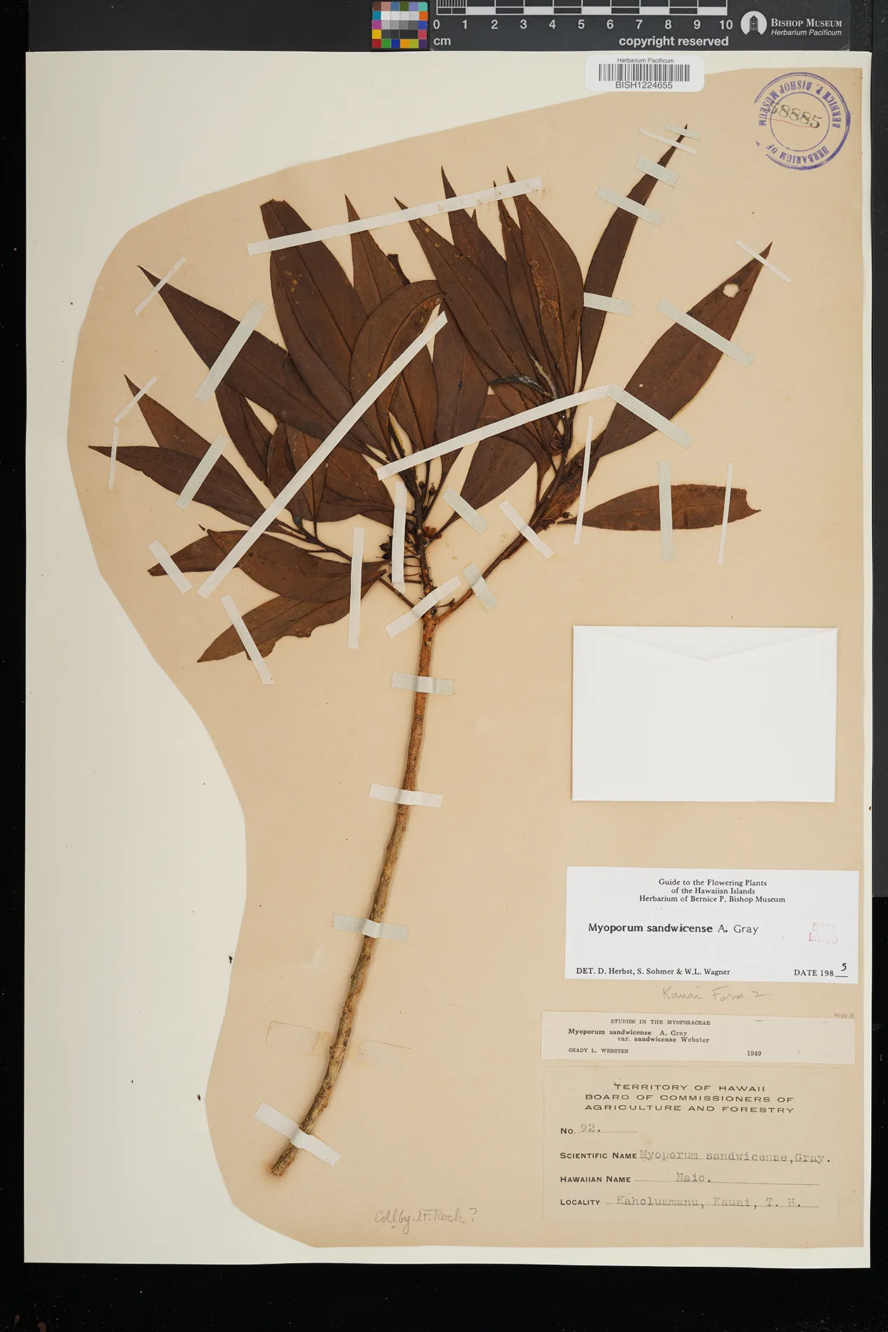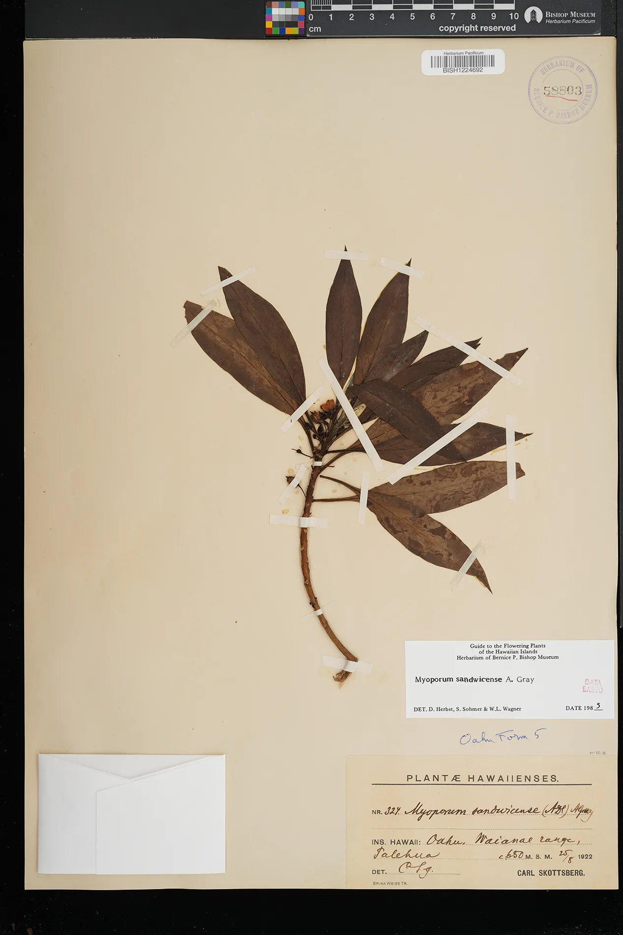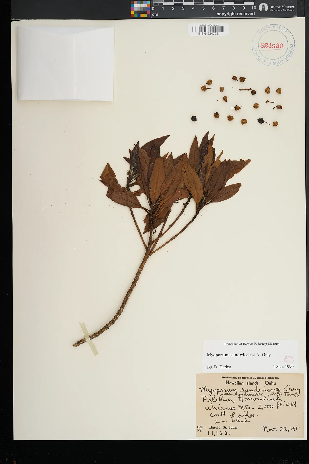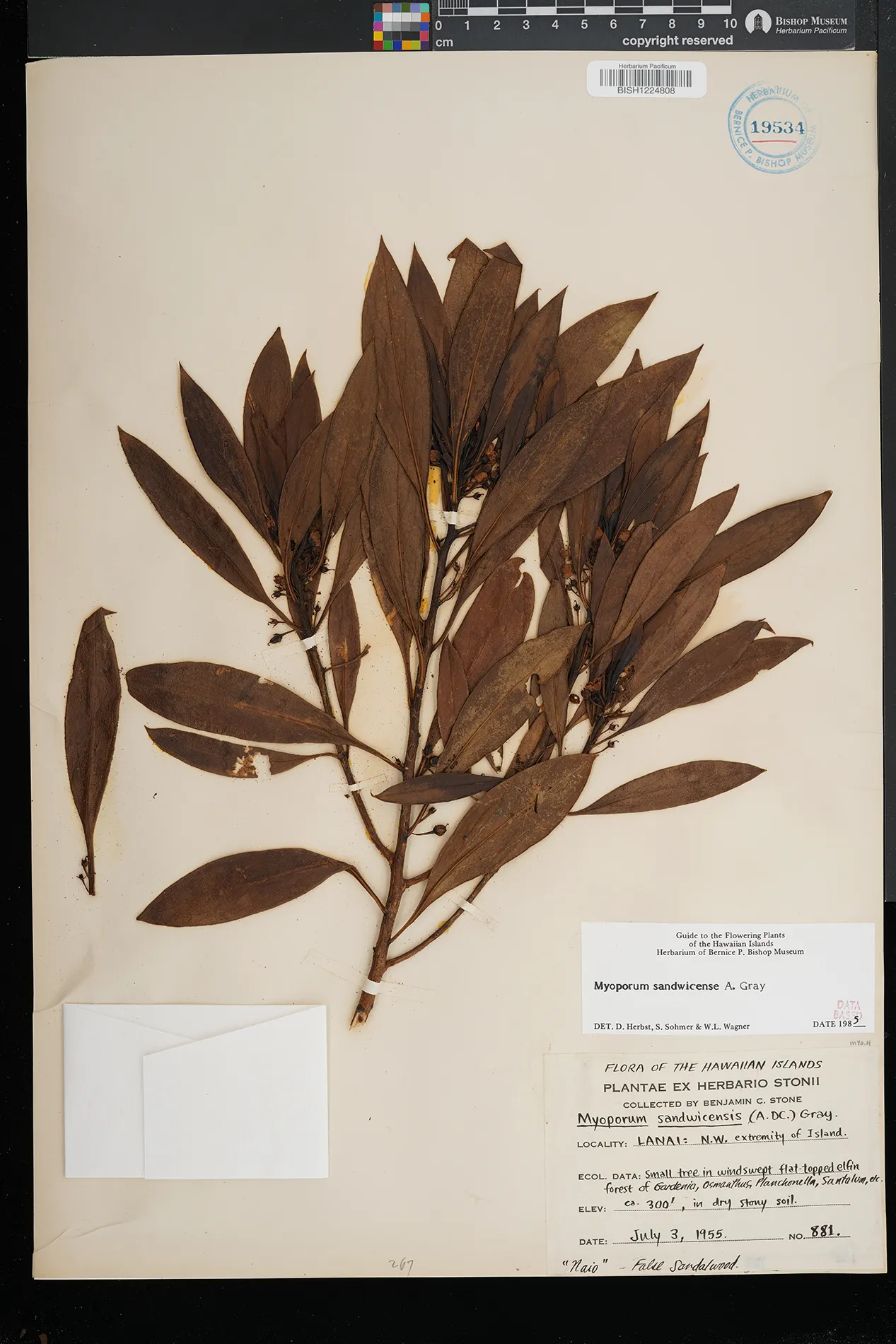 Wood has odor similar to sandalwood (Degener 1930:267). Used for house posts (Degener 1930:268; Krauss 1993:56). Burns well and long, used for torches (Lamb 1981:127). Wood used for fish net gauge (haha ka ‘upena) (Krauss 1993:35). In the Ethnology Collection at Bishop Museum there is a post-contact example of the wood made into a bowl.