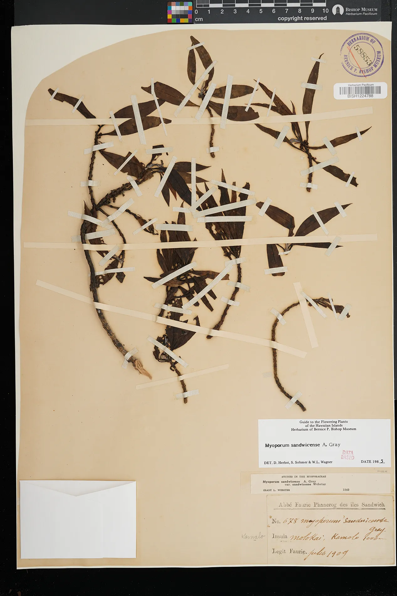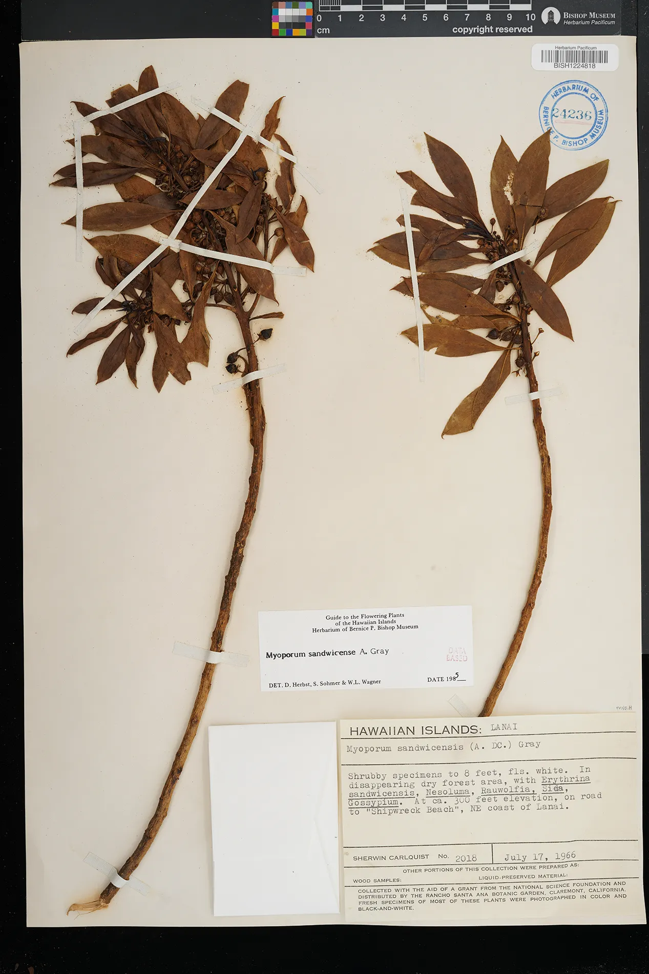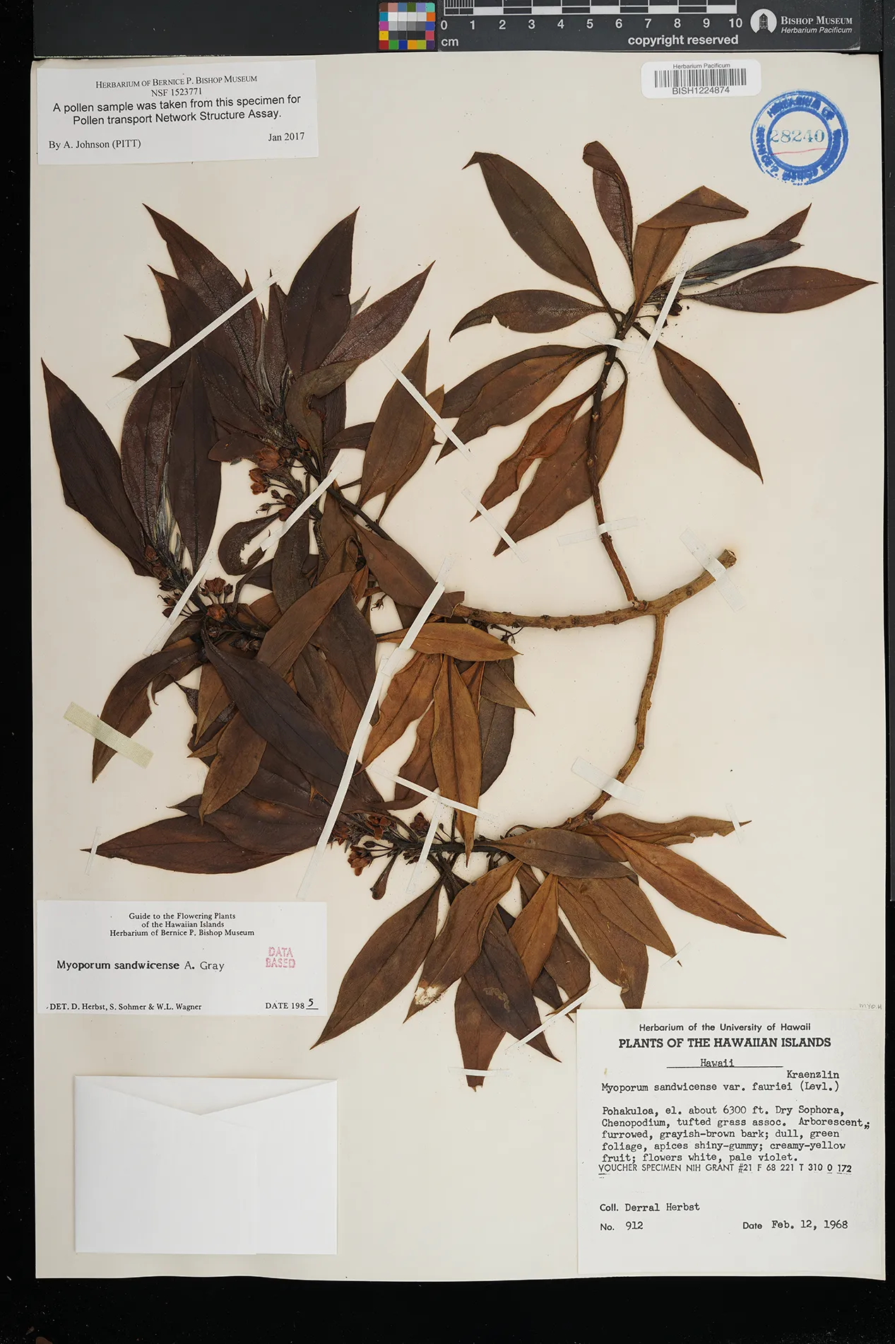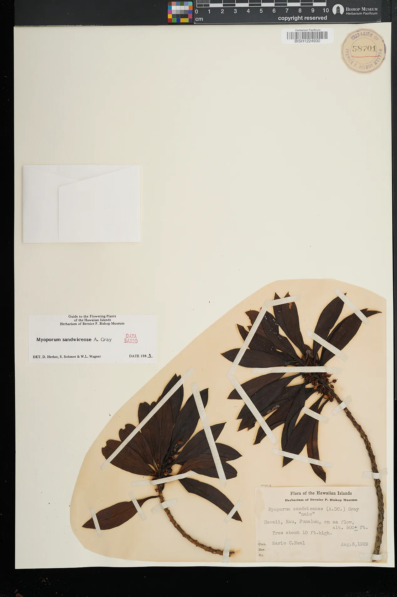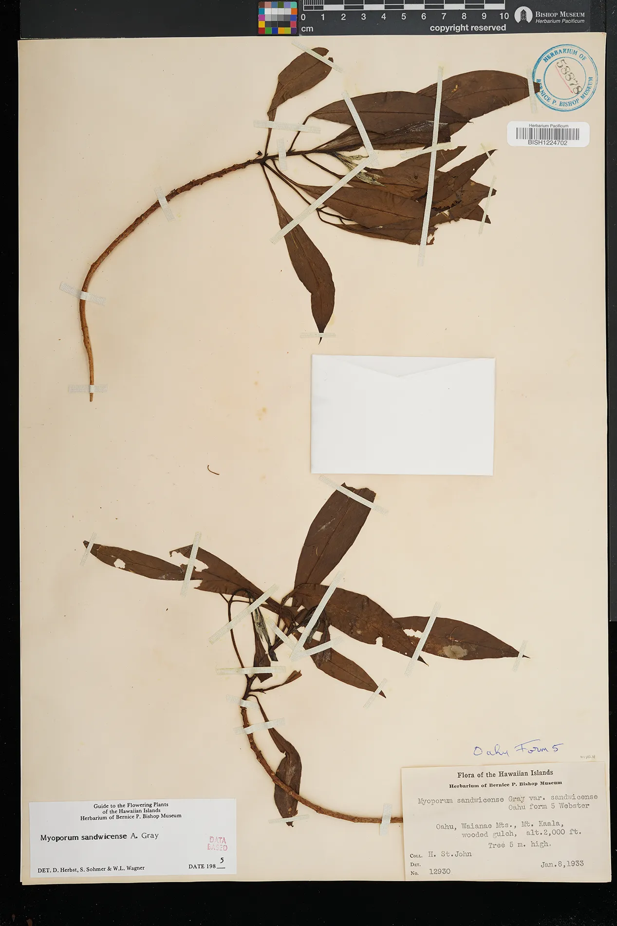 Wood has odor similar to sandalwood (Degener 1930:267). Used for house posts (Degener 1930:268; Krauss 1993:56). Burns well and long, used for torches (Lamb 1981:127). Wood used for fish net gauge (haha ka ‘upena) (Krauss 1993:35). In the Ethnology Collection at Bishop Museum there is a post-contact example of the wood made into a bowl.