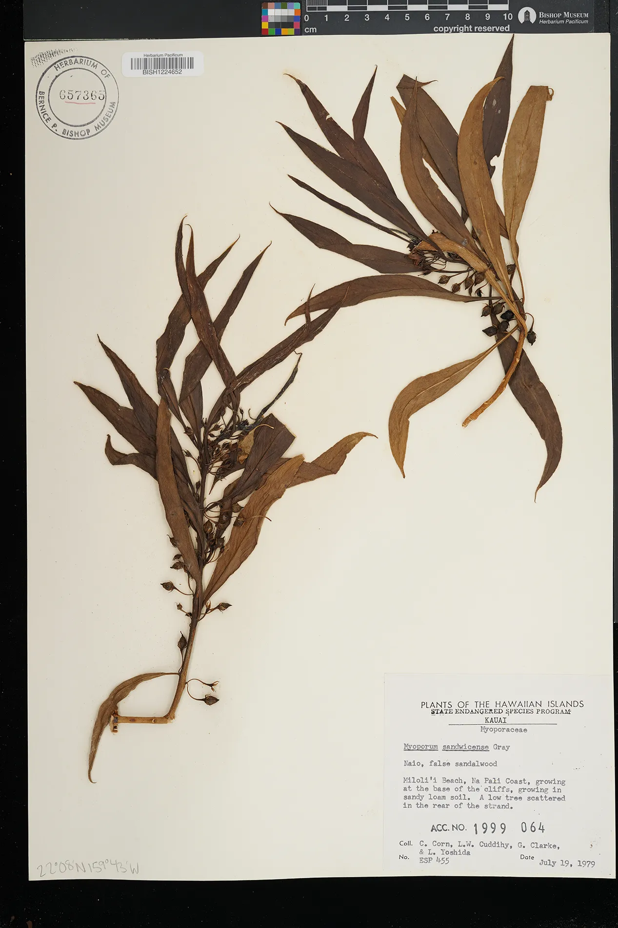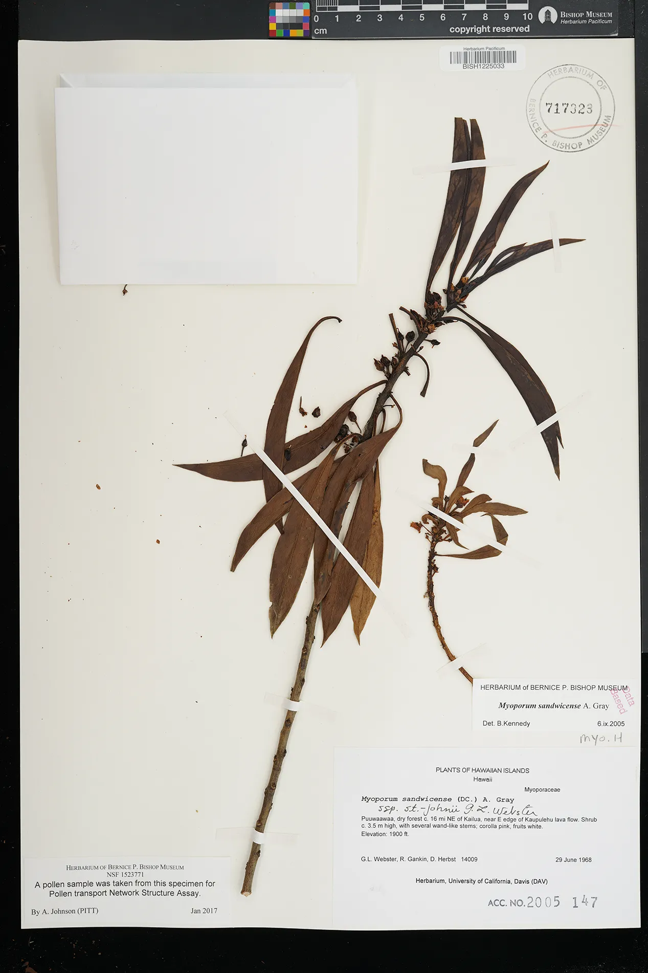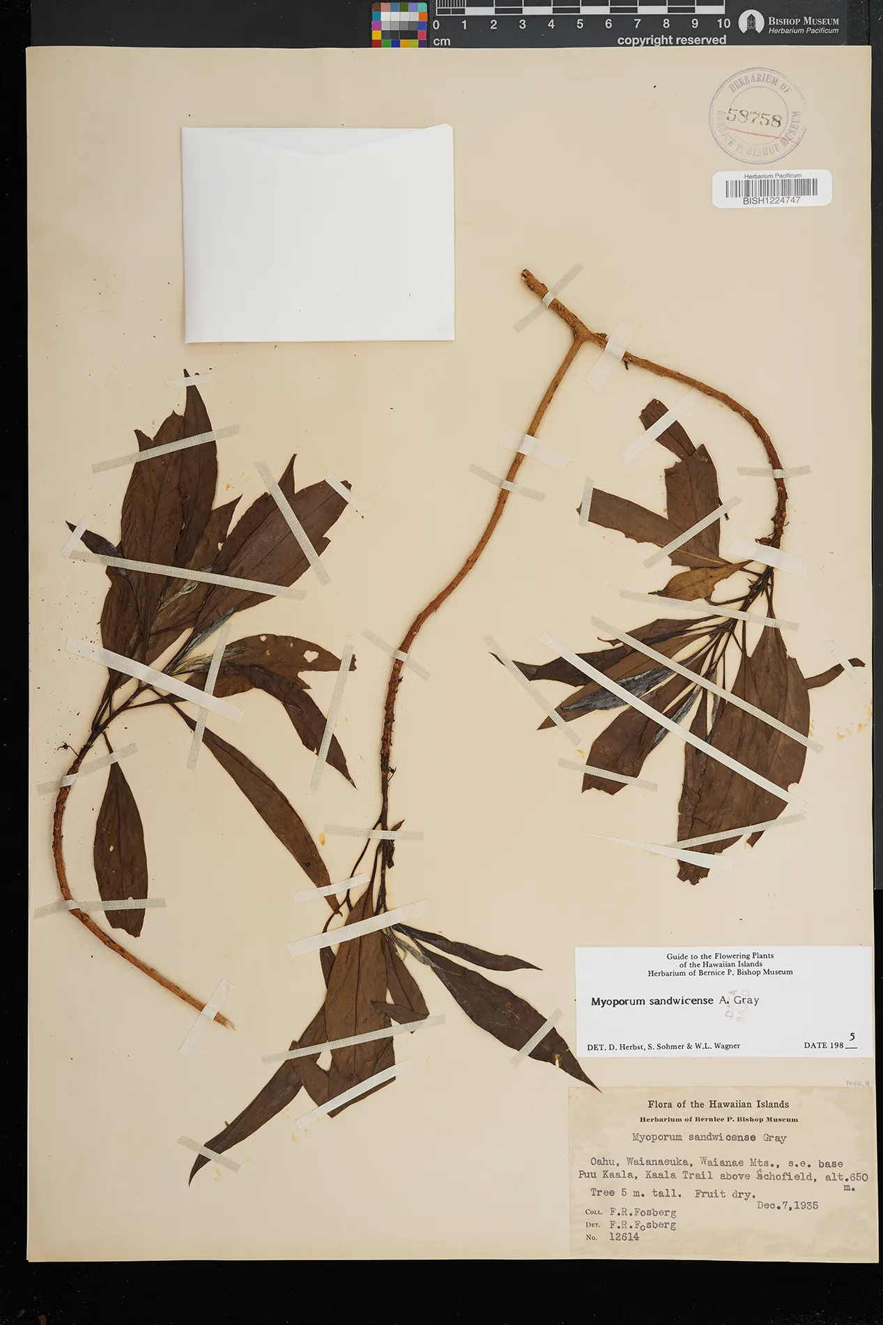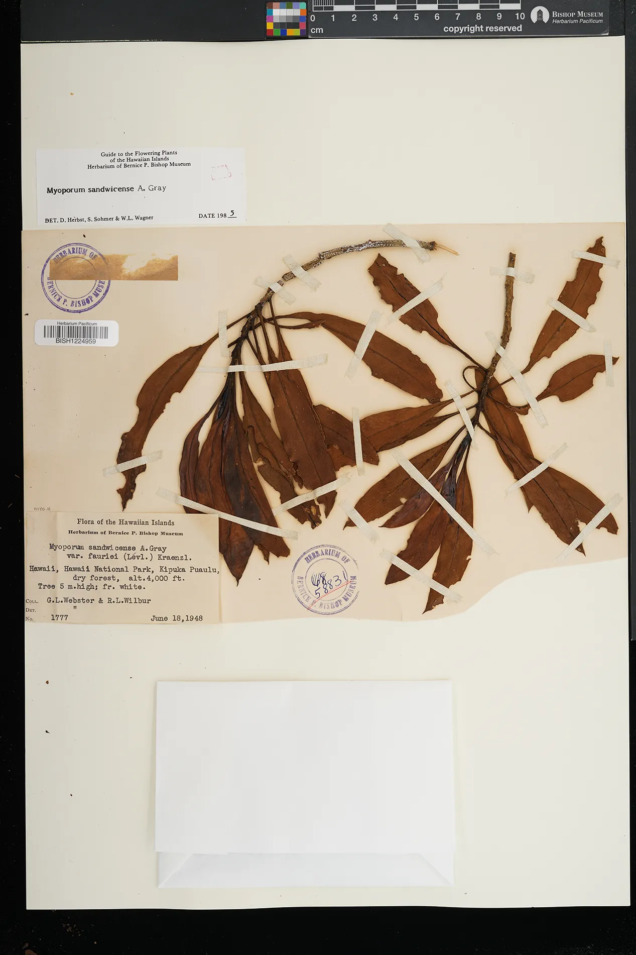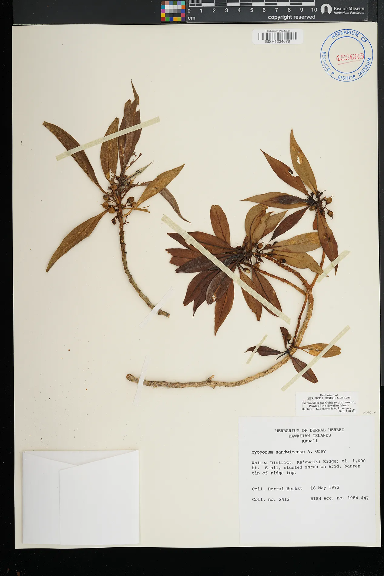 Wood has odor similar to sandalwood (Degener 1930:267). Used for house posts (Degener 1930:268; Krauss 1993:56). Burns well and long, used for torches (Lamb 1981:127). Wood used for fish net gauge (haha ka ‘upena) (Krauss 1993:35). In the Ethnology Collection at Bishop Museum there is a post-contact example of the wood made into a bowl.