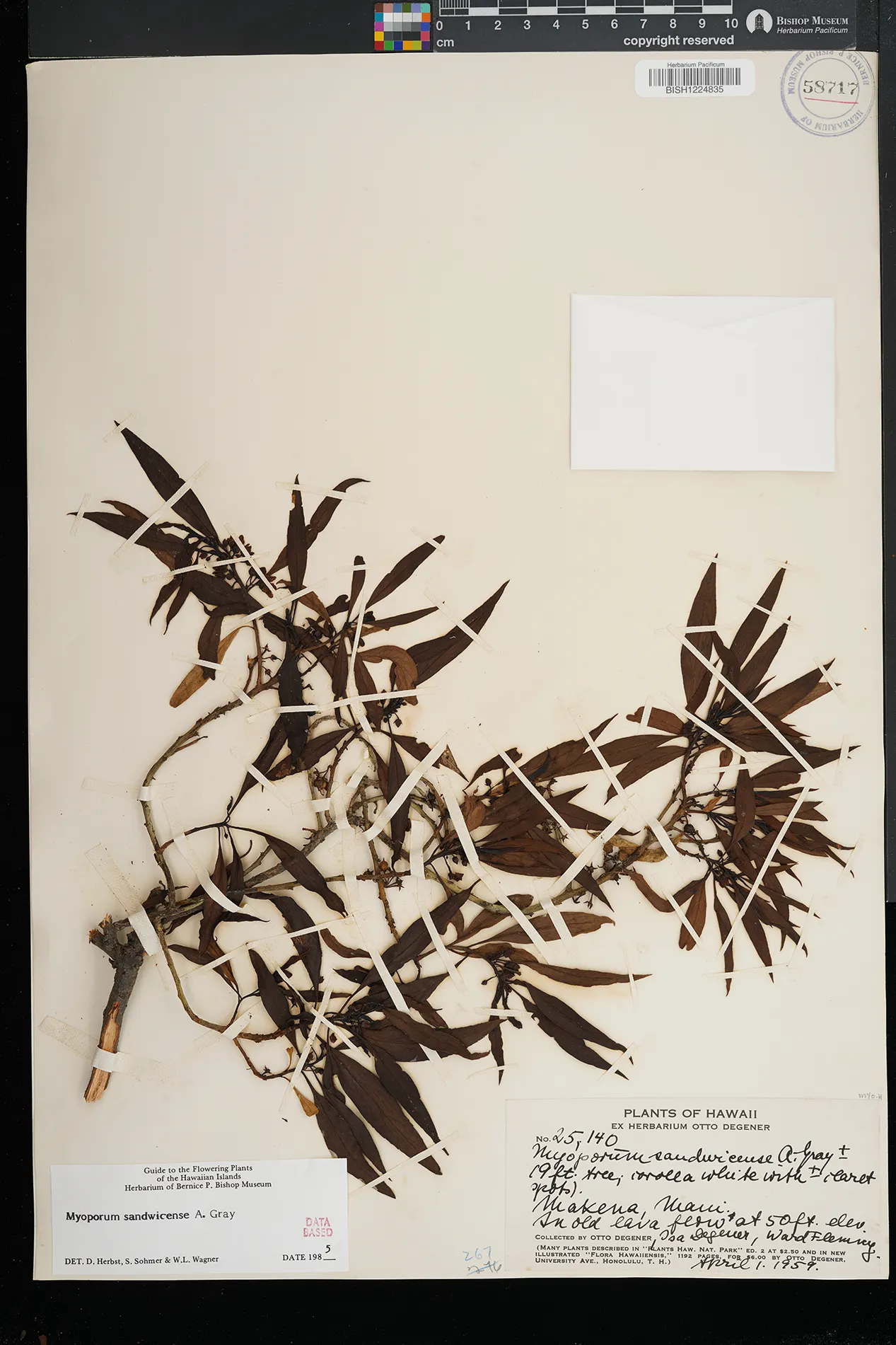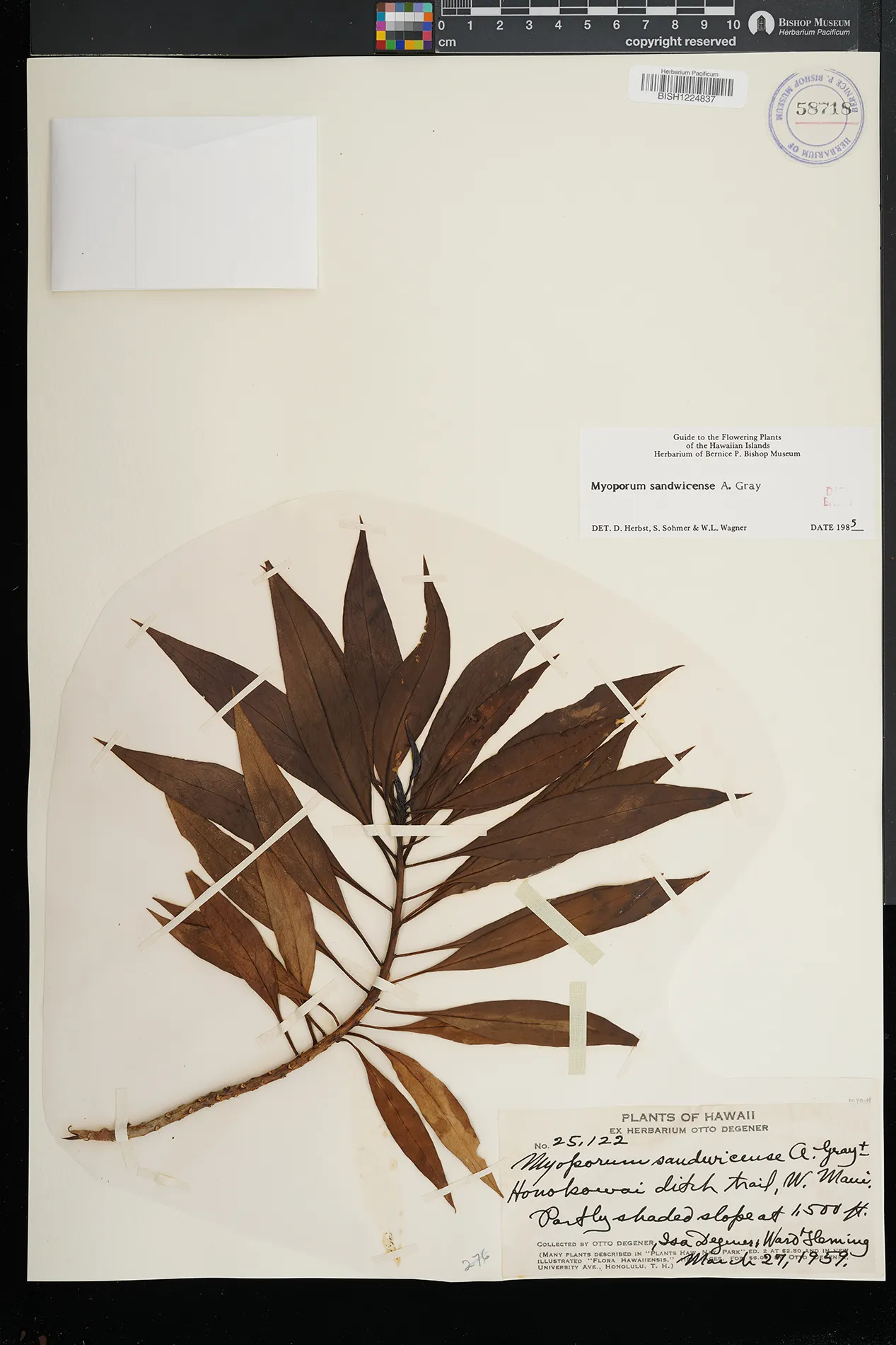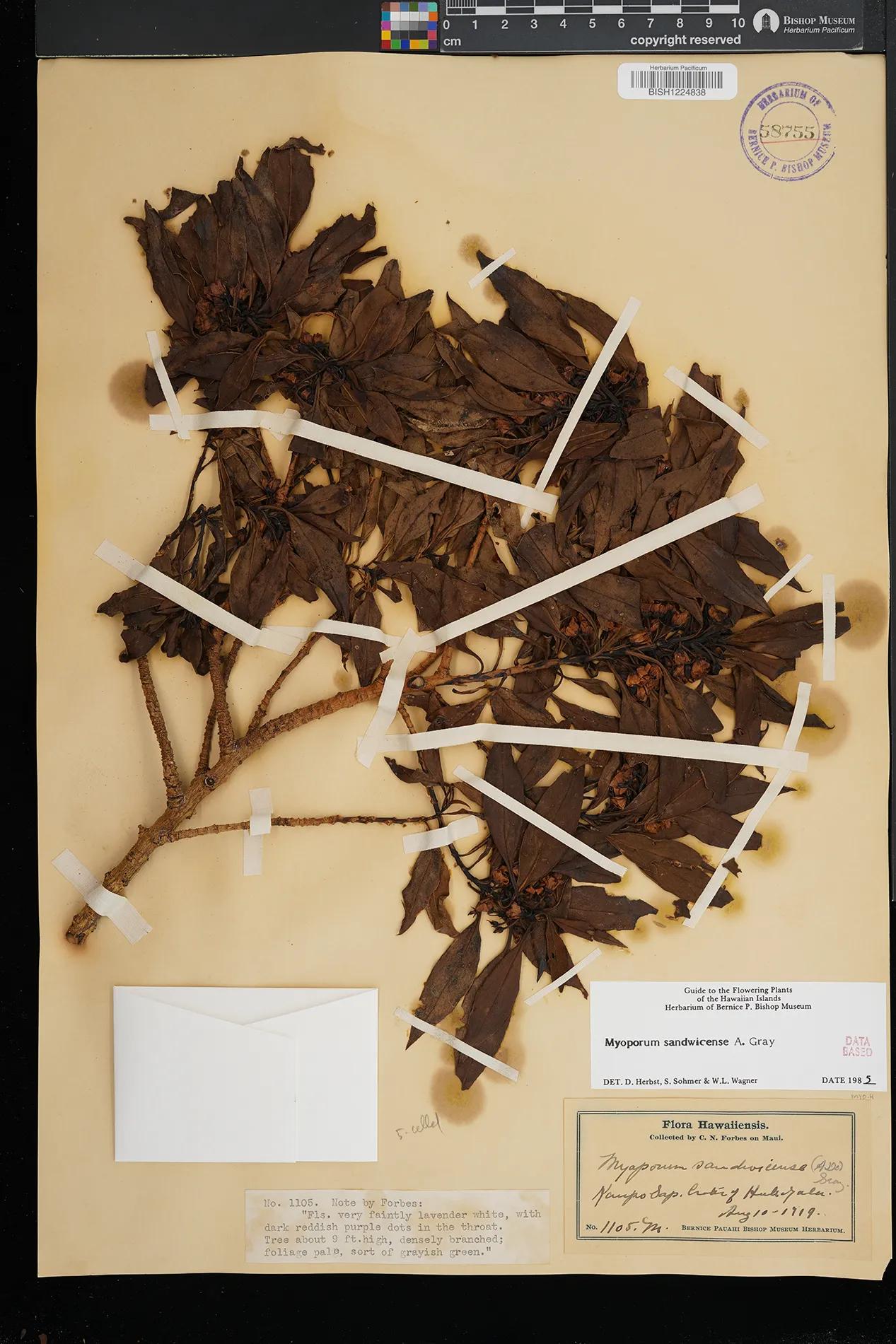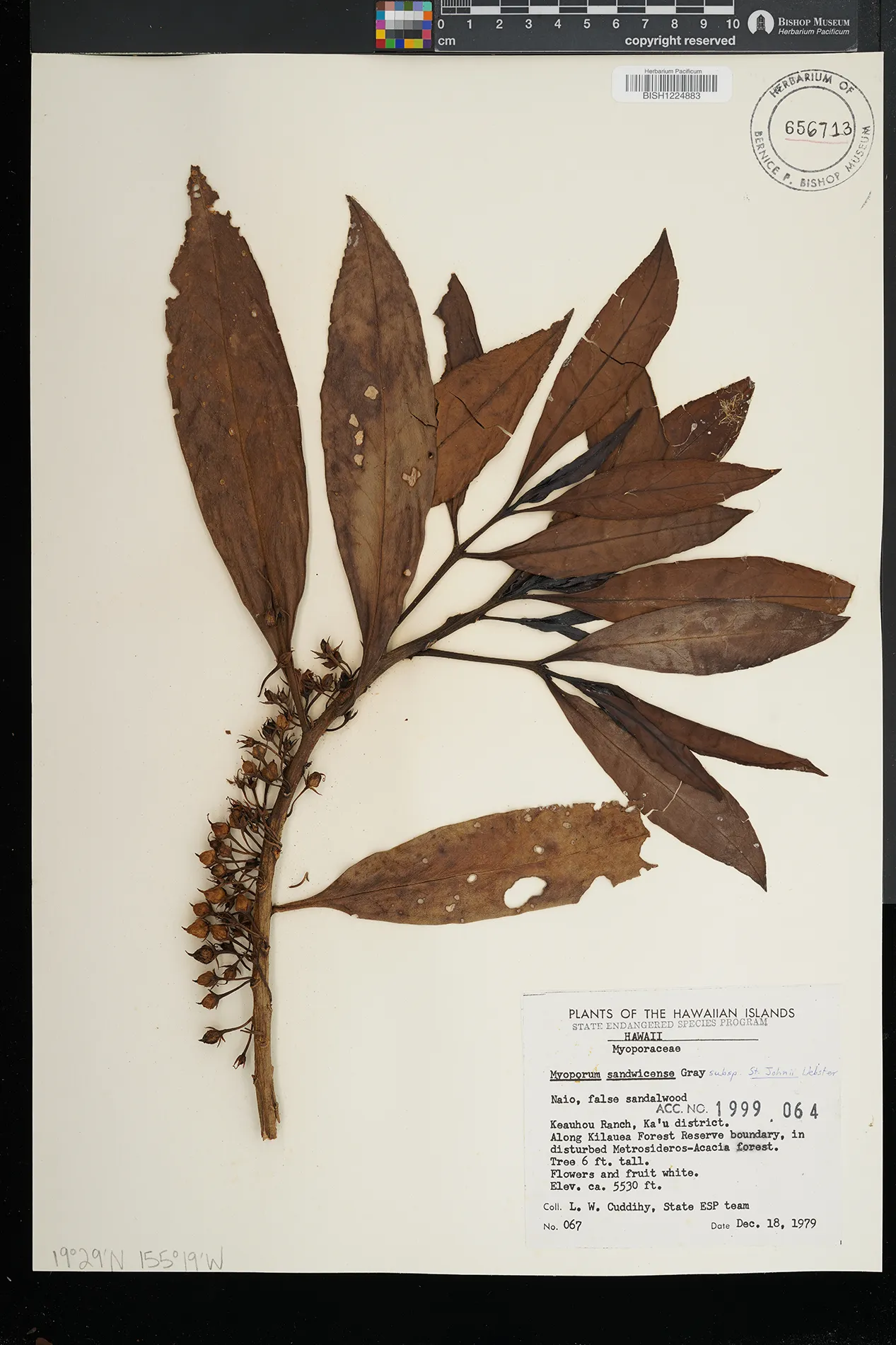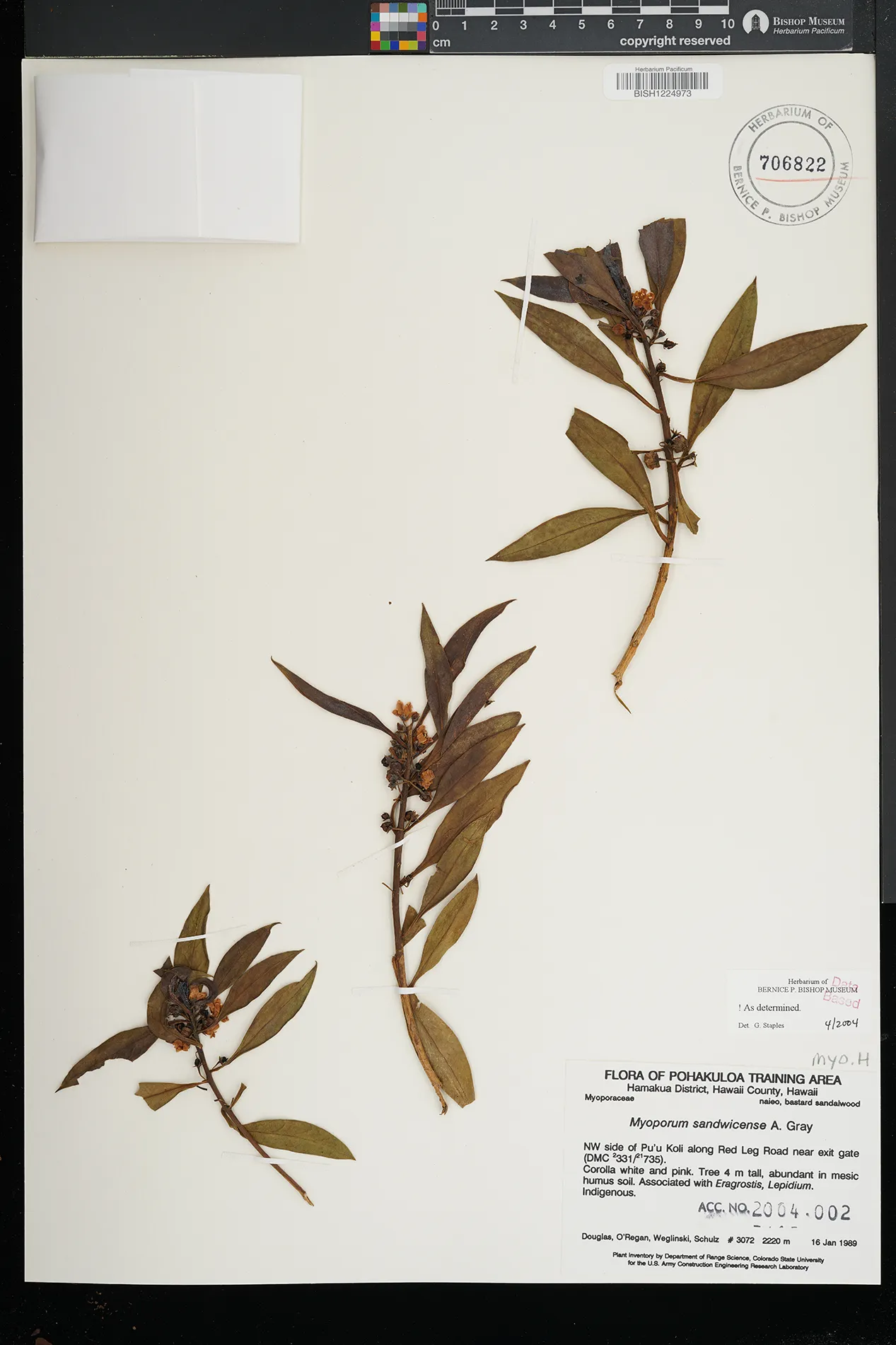 Wood has odor similar to sandalwood (Degener 1930:267). Used for house posts (Degener 1930:268; Krauss 1993:56). Burns well and long, used for torches (Lamb 1981:127). Wood used for fish net gauge (haha ka ‘upena) (Krauss 1993:35). In the Ethnology Collection at Bishop Museum there is a post-contact example of the wood made into a bowl.