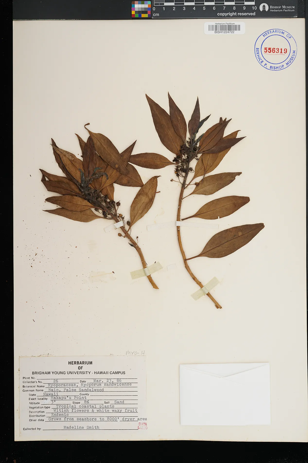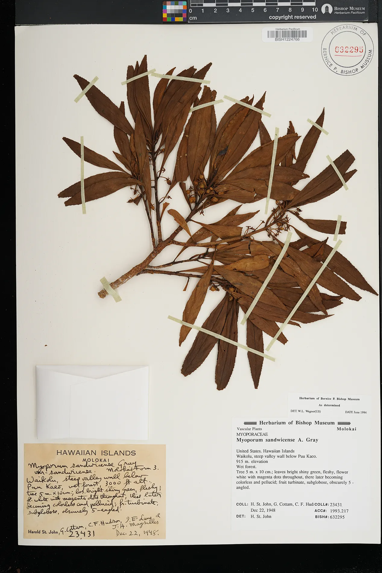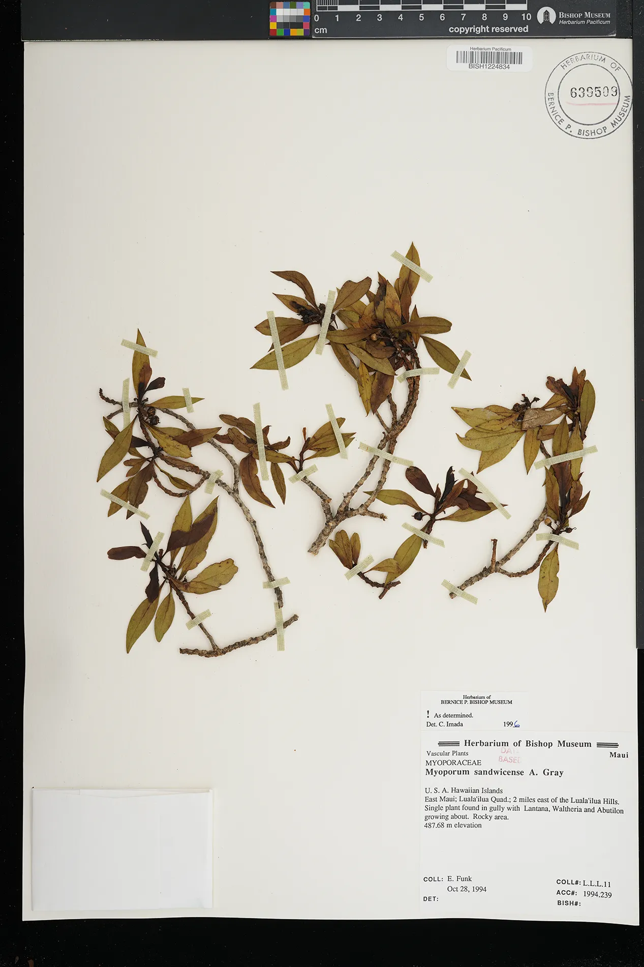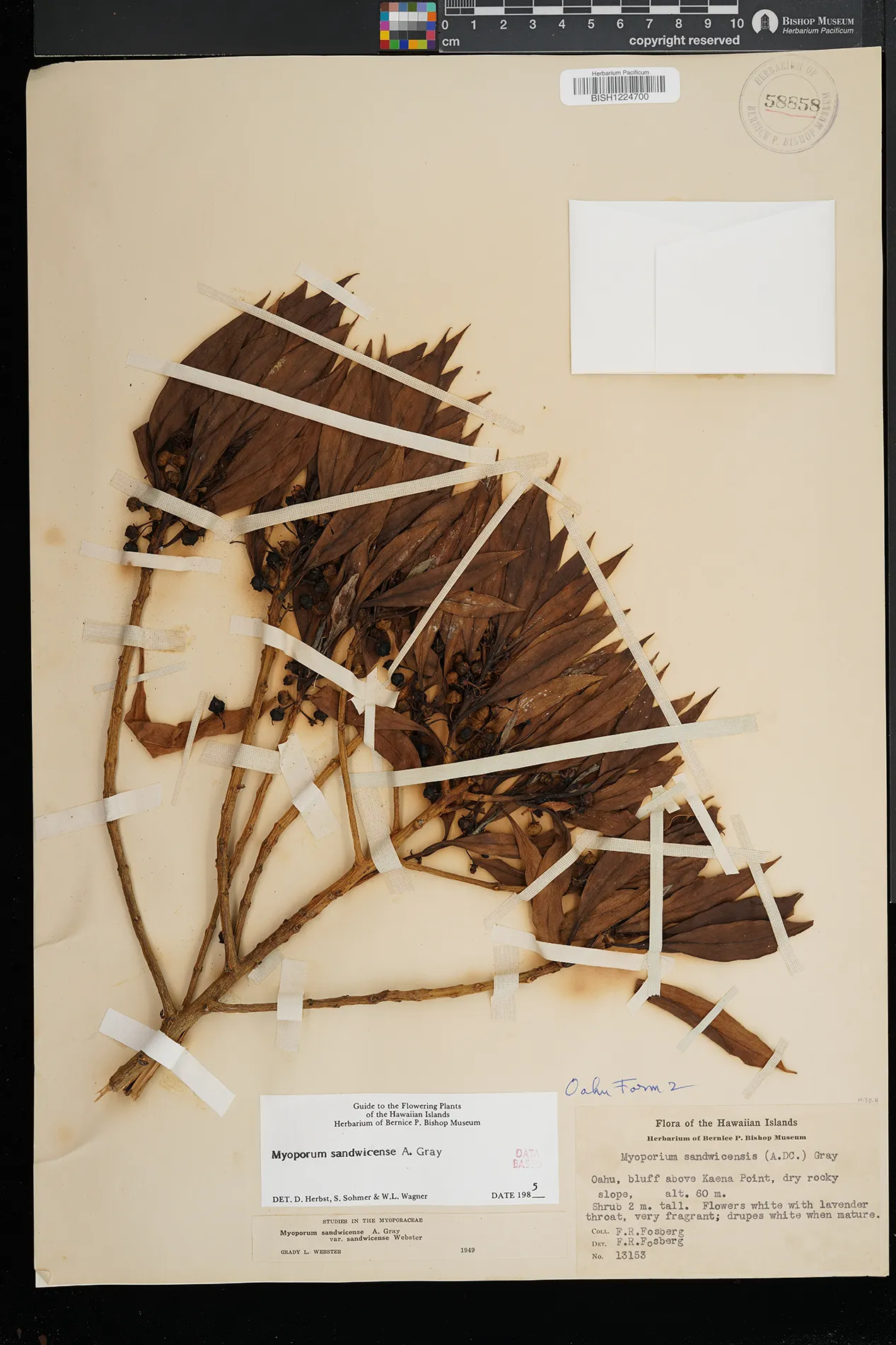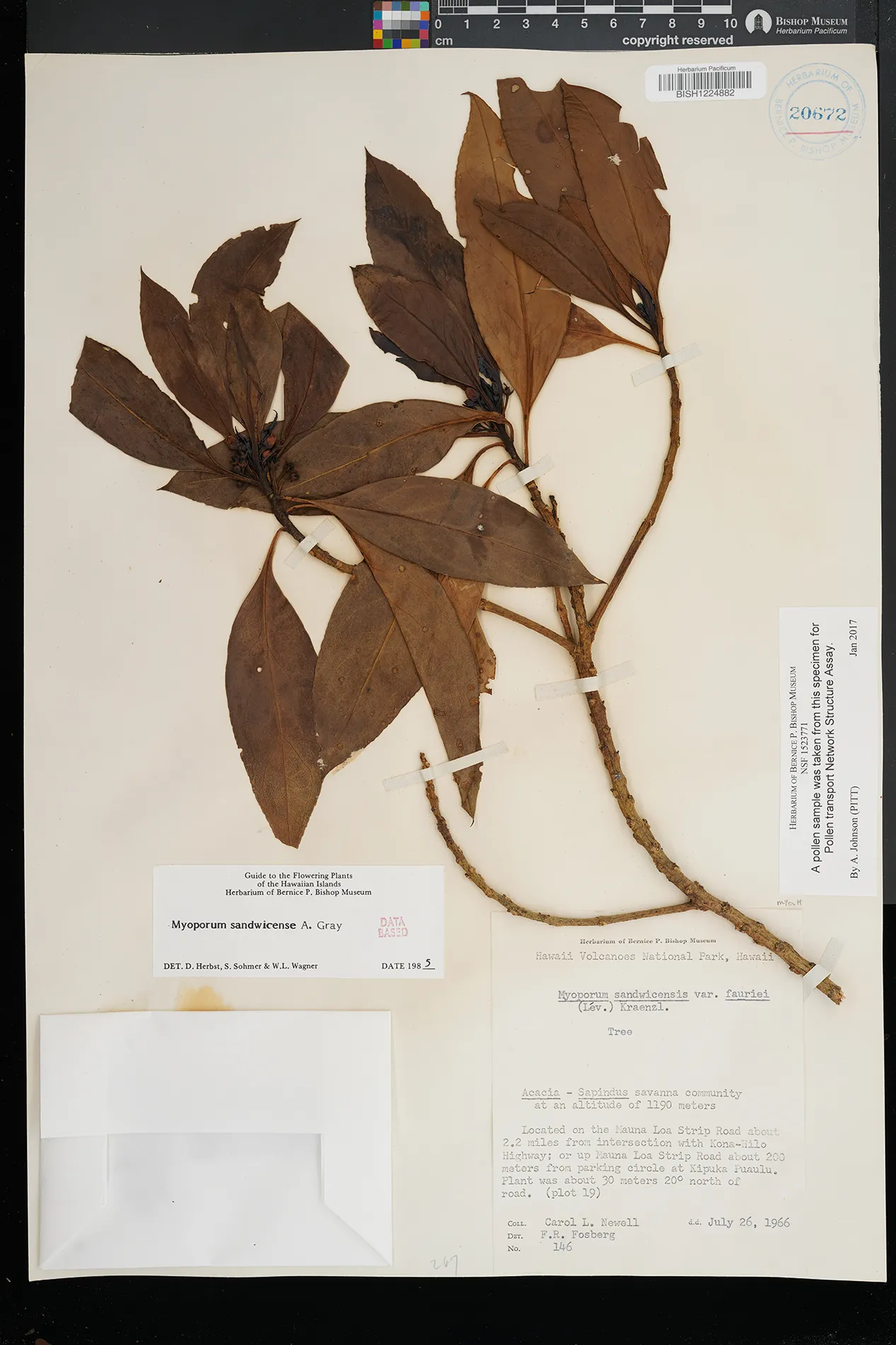 Wood has odor similar to sandalwood (Degener 1930:267). Used for house posts (Degener 1930:268; Krauss 1993:56). Burns well and long, used for torches (Lamb 1981:127). Wood used for fish net gauge (haha ka ‘upena) (Krauss 1993:35). In the Ethnology Collection at Bishop Museum there is a post-contact example of the wood made into a bowl.