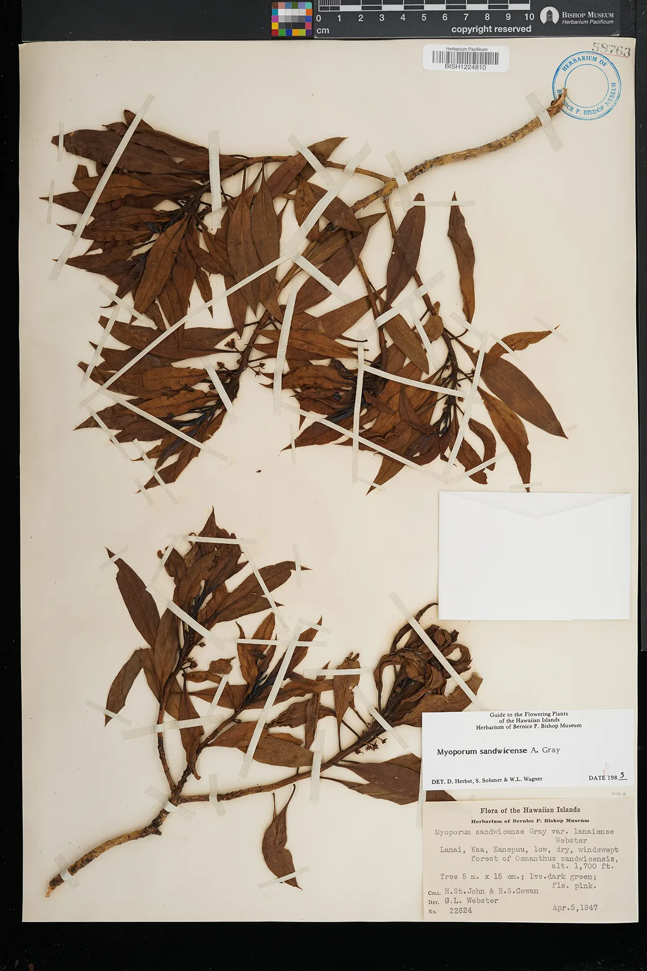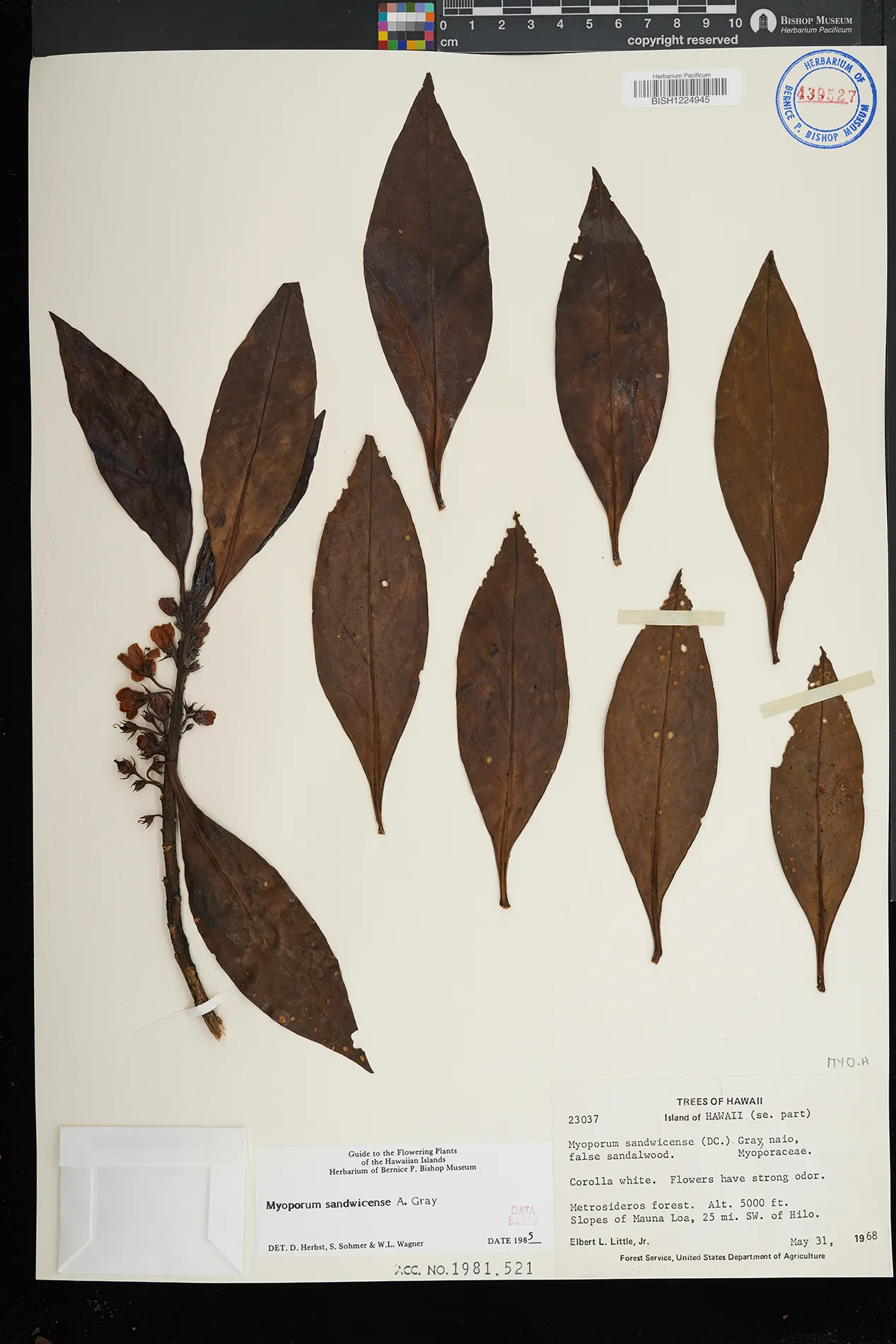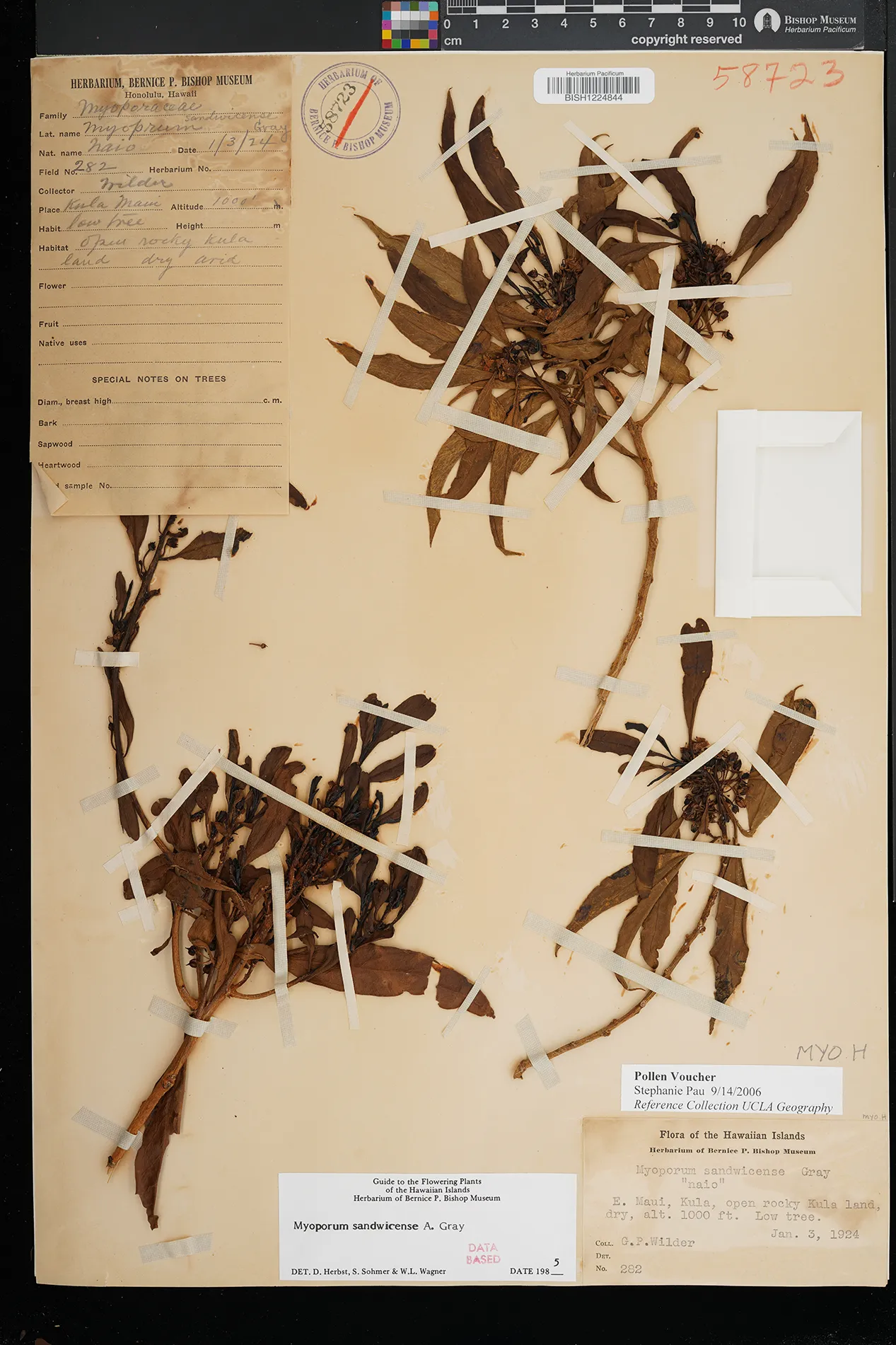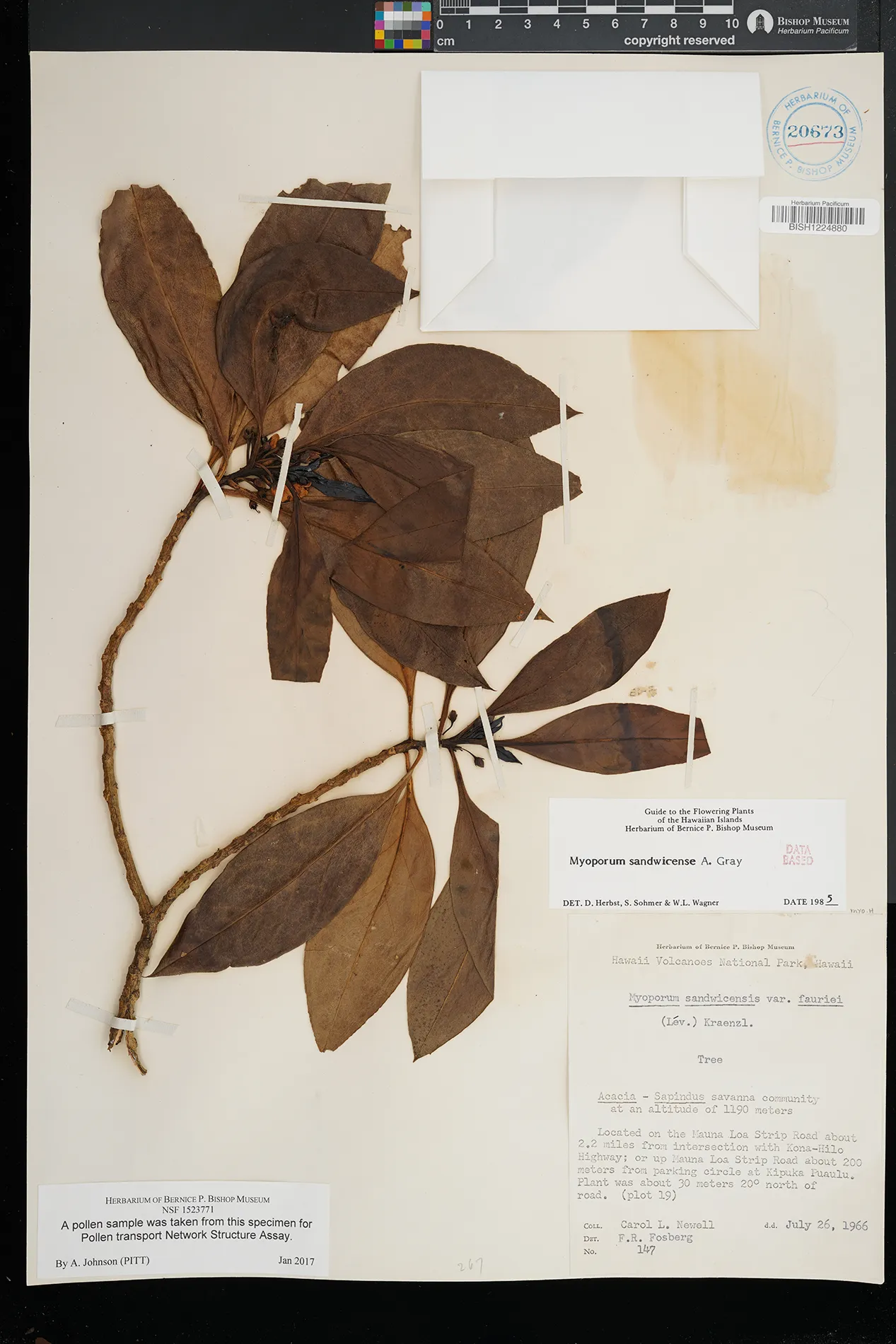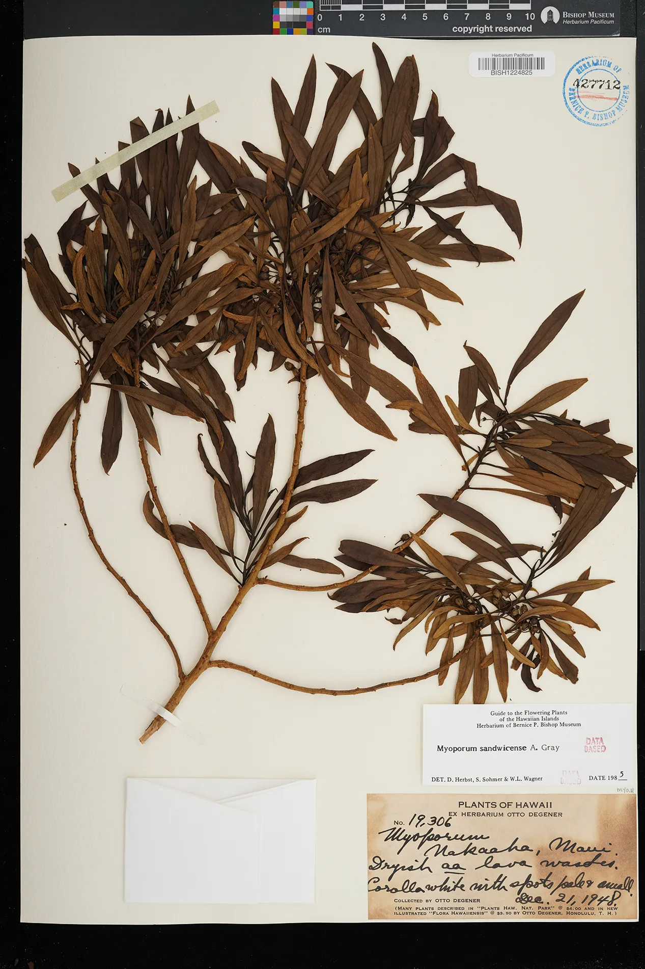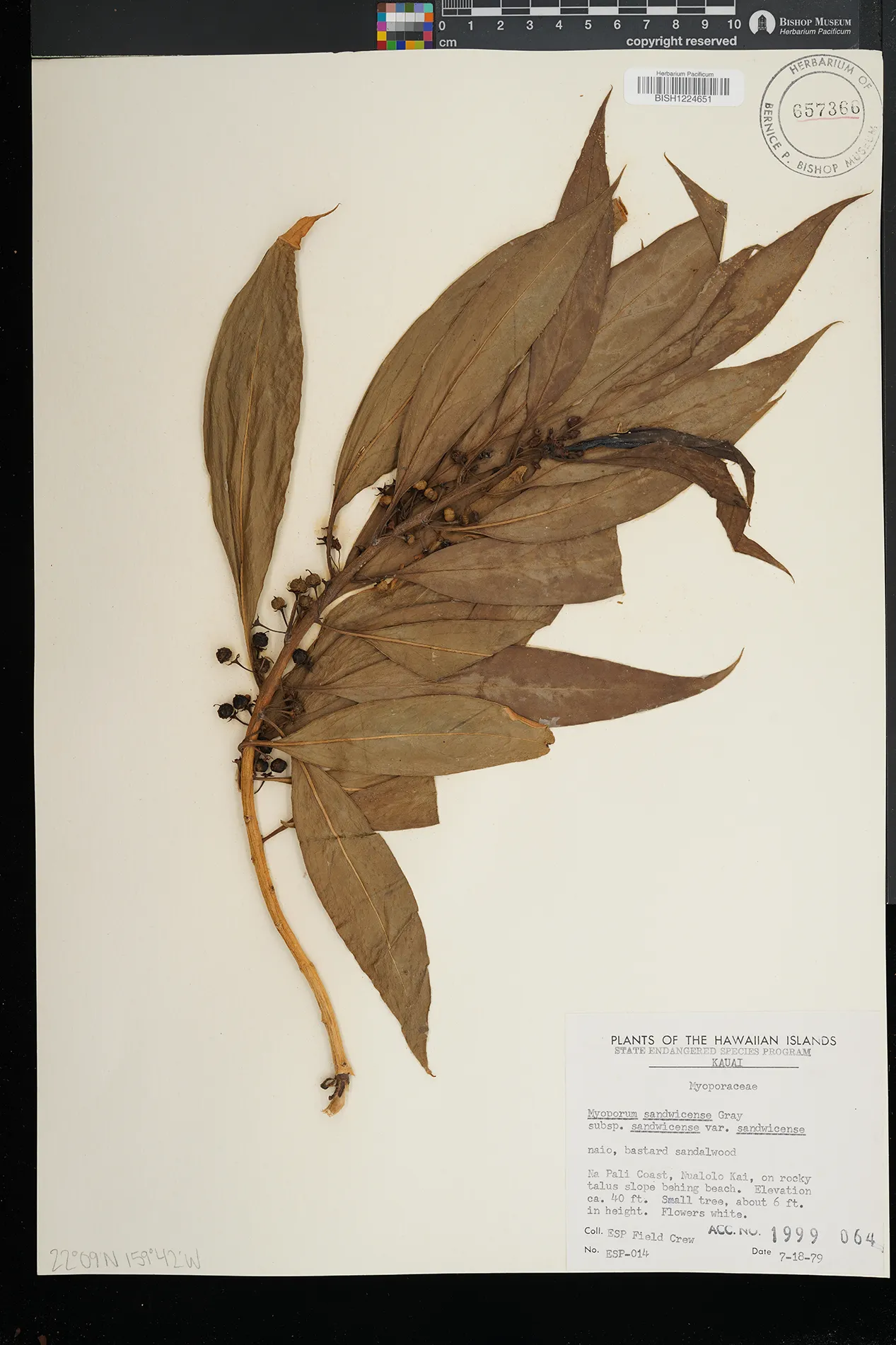 Wood has odor similar to sandalwood (Degener 1930:267). Used for house posts (Degener 1930:268; Krauss 1993:56). Burns well and long, used for torches (Lamb 1981:127). Wood used for fish net gauge (haha ka ‘upena) (Krauss 1993:35). In the Ethnology Collection at Bishop Museum there is a post-contact example of the wood made into a bowl.
