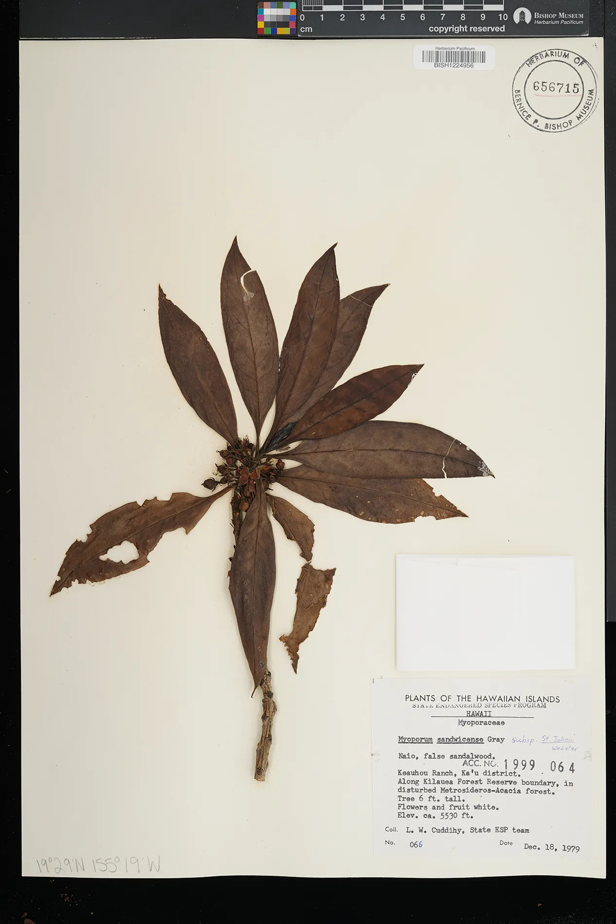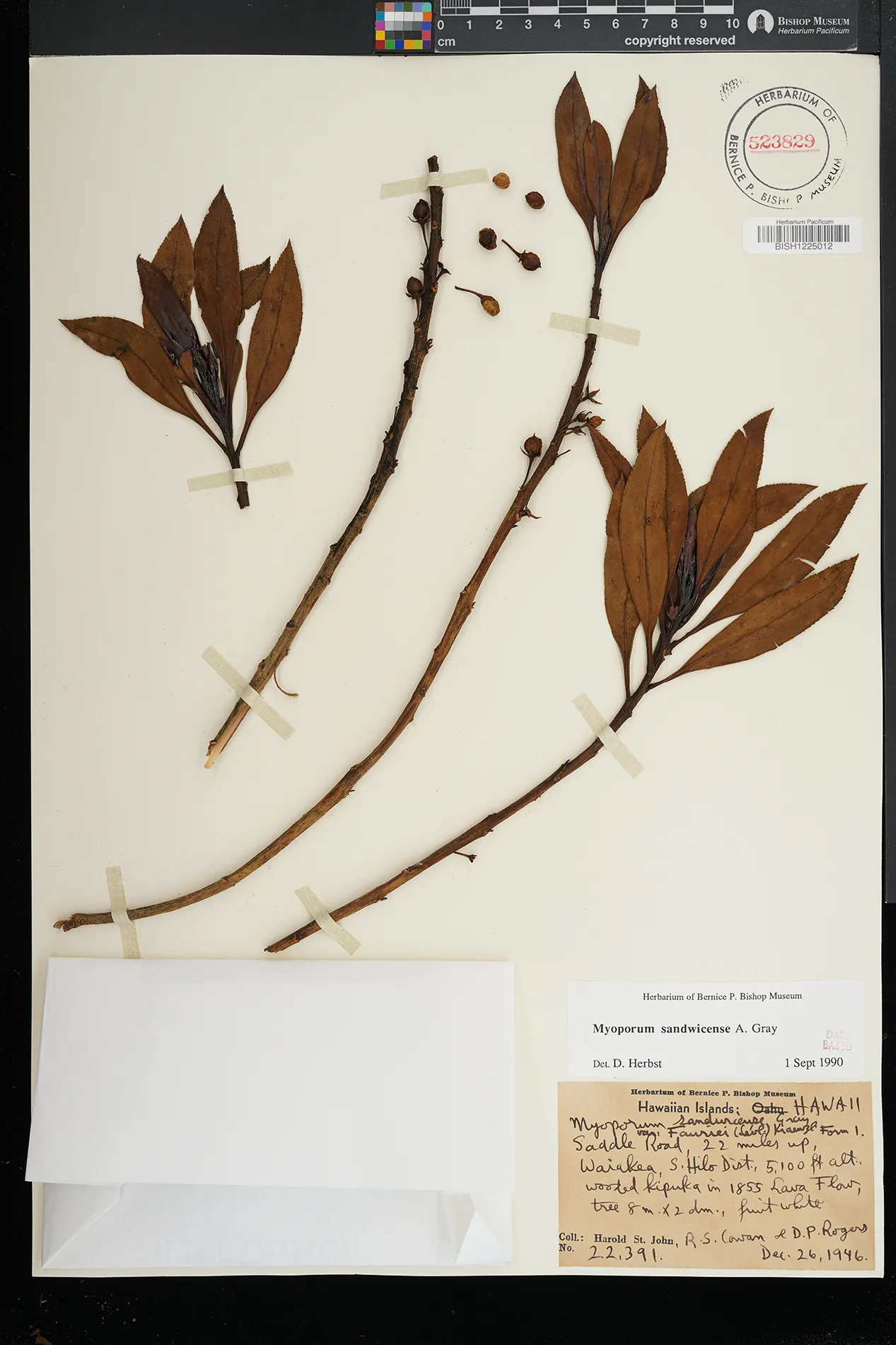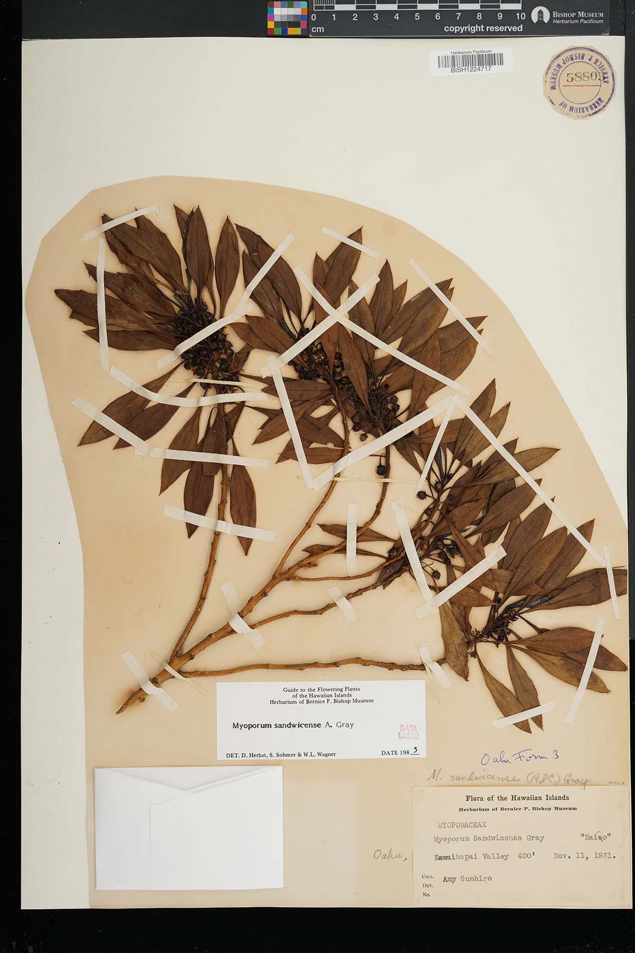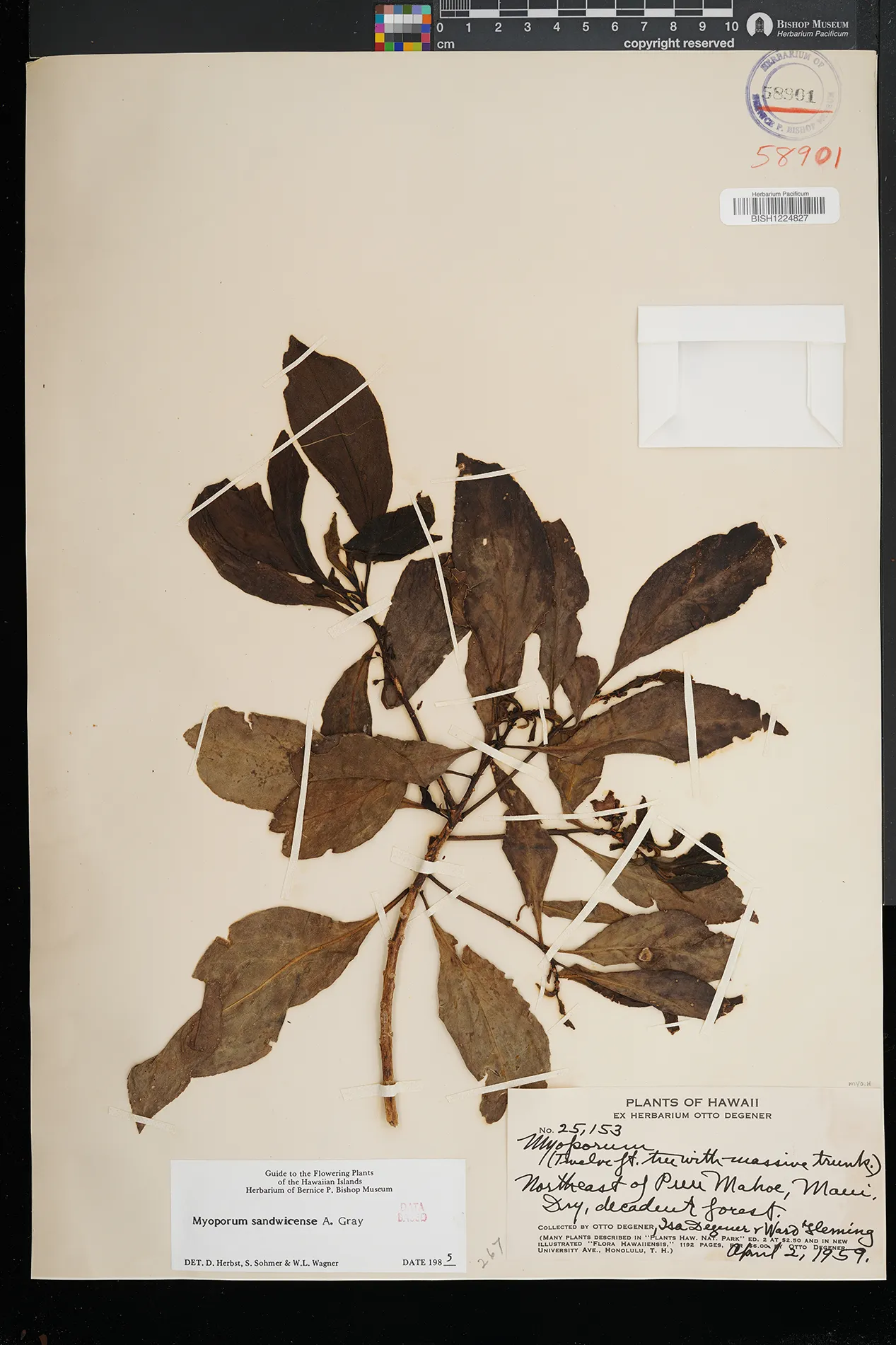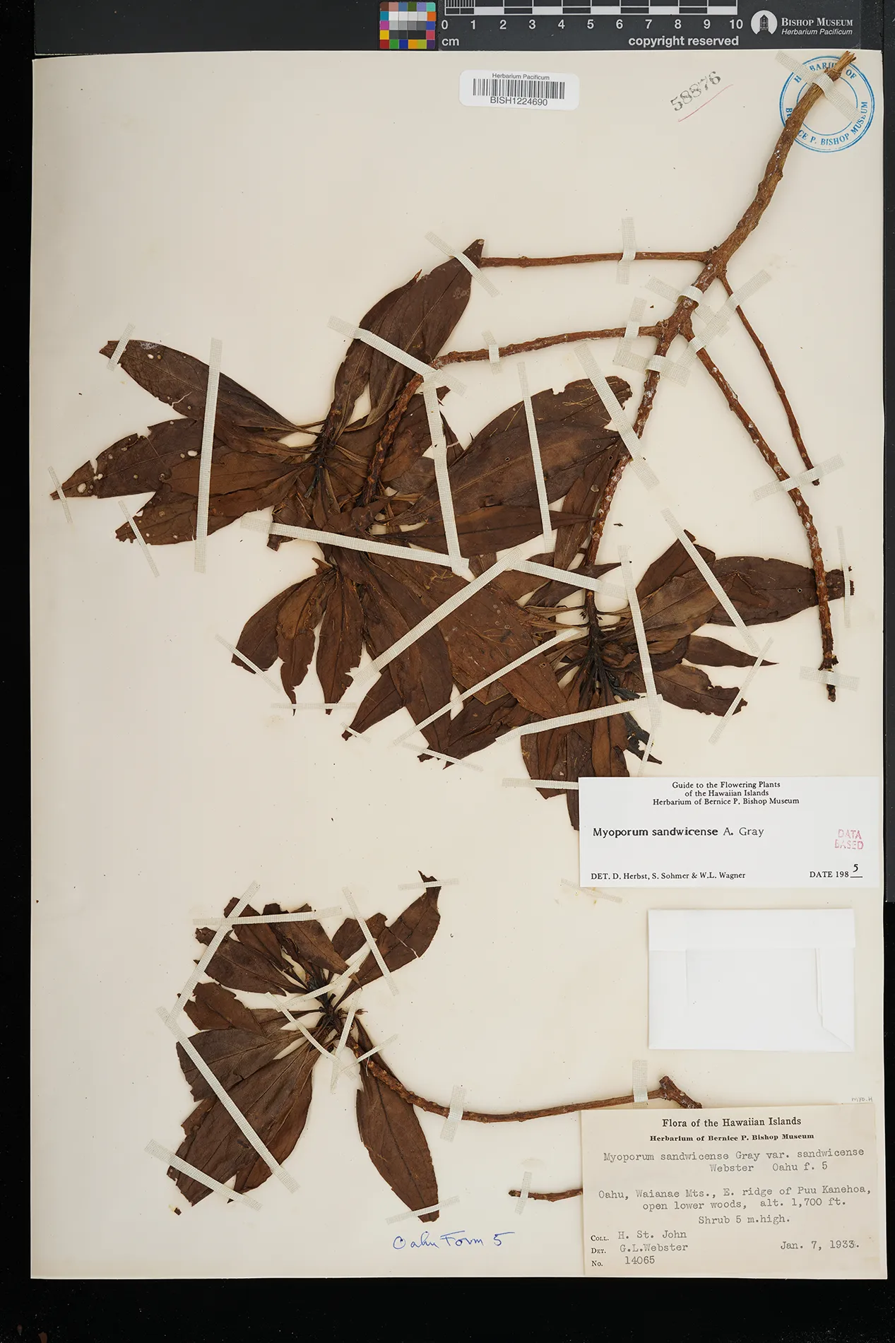 Wood has odor similar to sandalwood (Degener 1930:267). Used for house posts (Degener 1930:268; Krauss 1993:56). Burns well and long, used for torches (Lamb 1981:127). Wood used for fish net gauge (haha ka ‘upena) (Krauss 1993:35). In the Ethnology Collection at Bishop Museum there is a post-contact example of the wood made into a bowl.