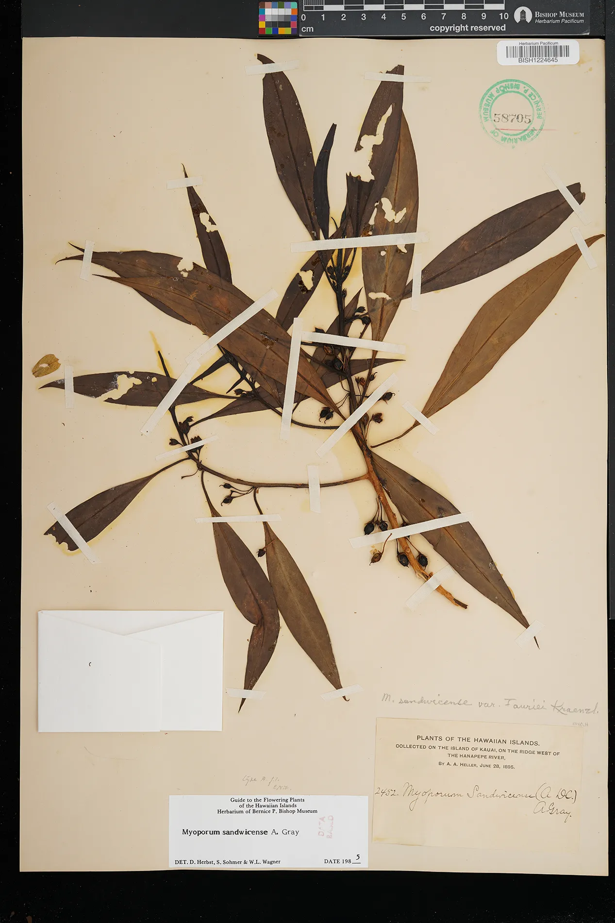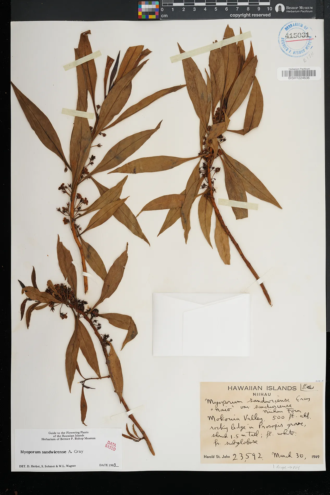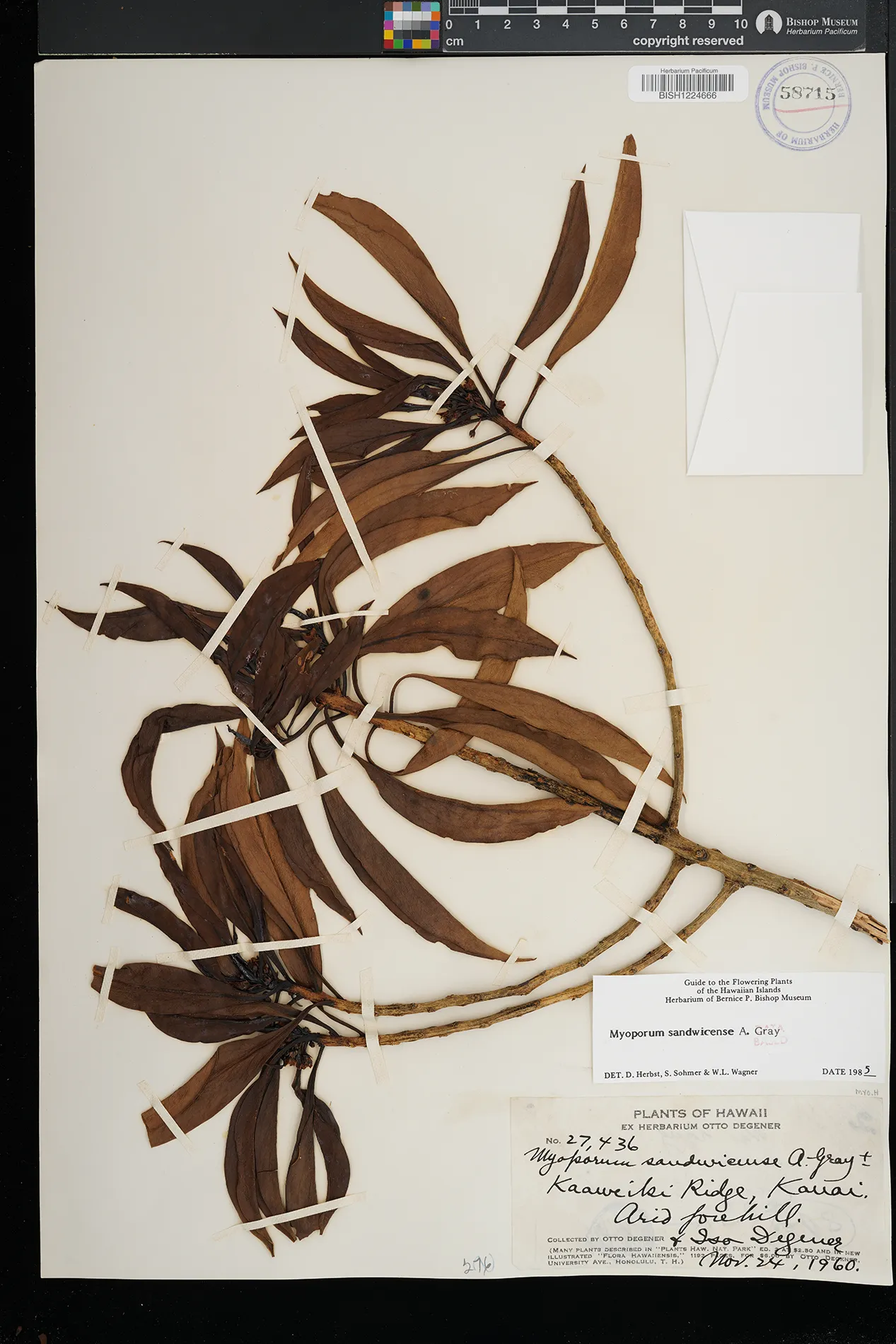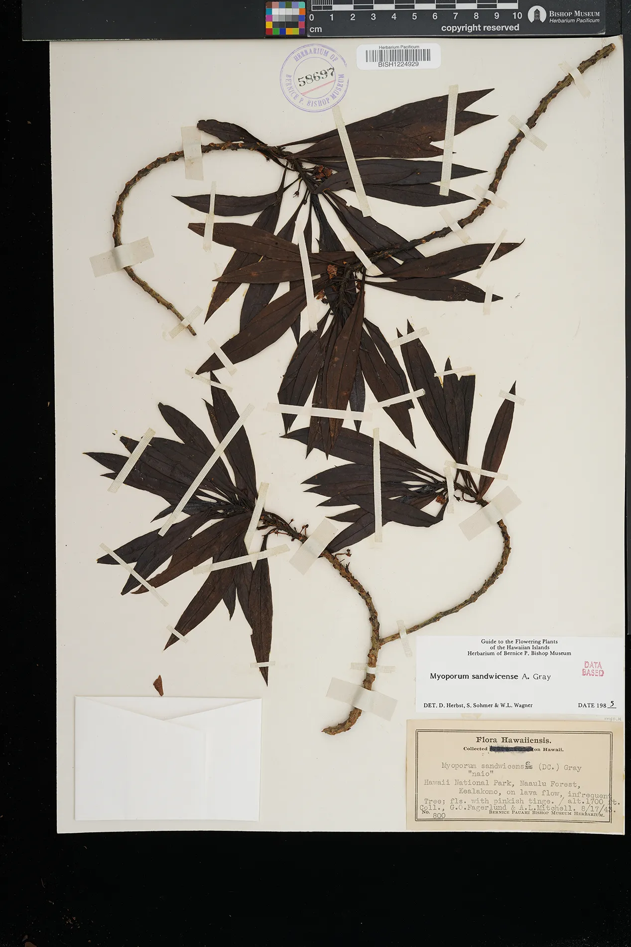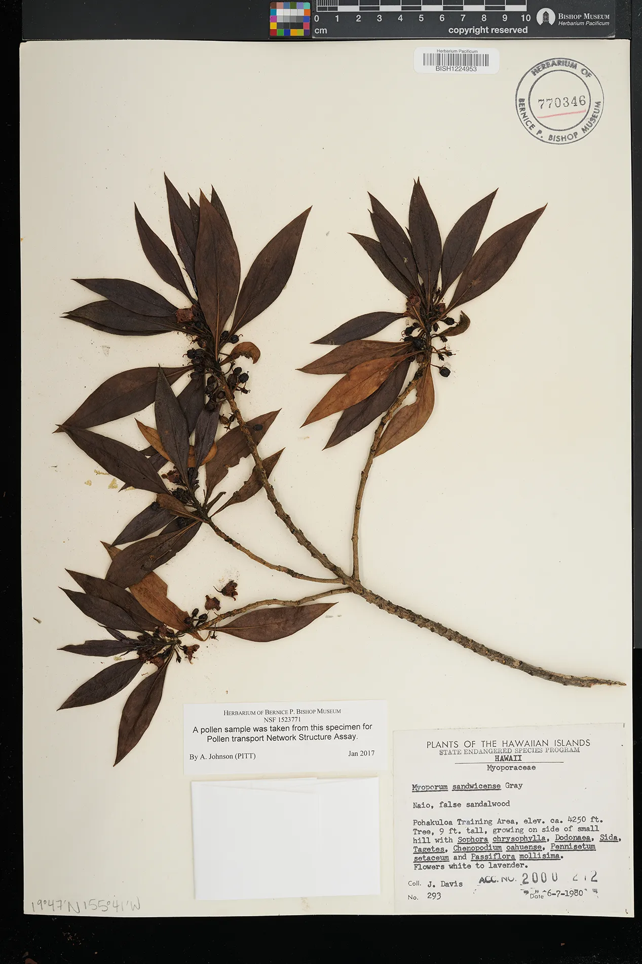 Wood has odor similar to sandalwood (Degener 1930:267). Used for house posts (Degener 1930:268; Krauss 1993:56). Burns well and long, used for torches (Lamb 1981:127). Wood used for fish net gauge (haha ka ‘upena) (Krauss 1993:35). In the Ethnology Collection at Bishop Museum there is a post-contact example of the wood made into a bowl.