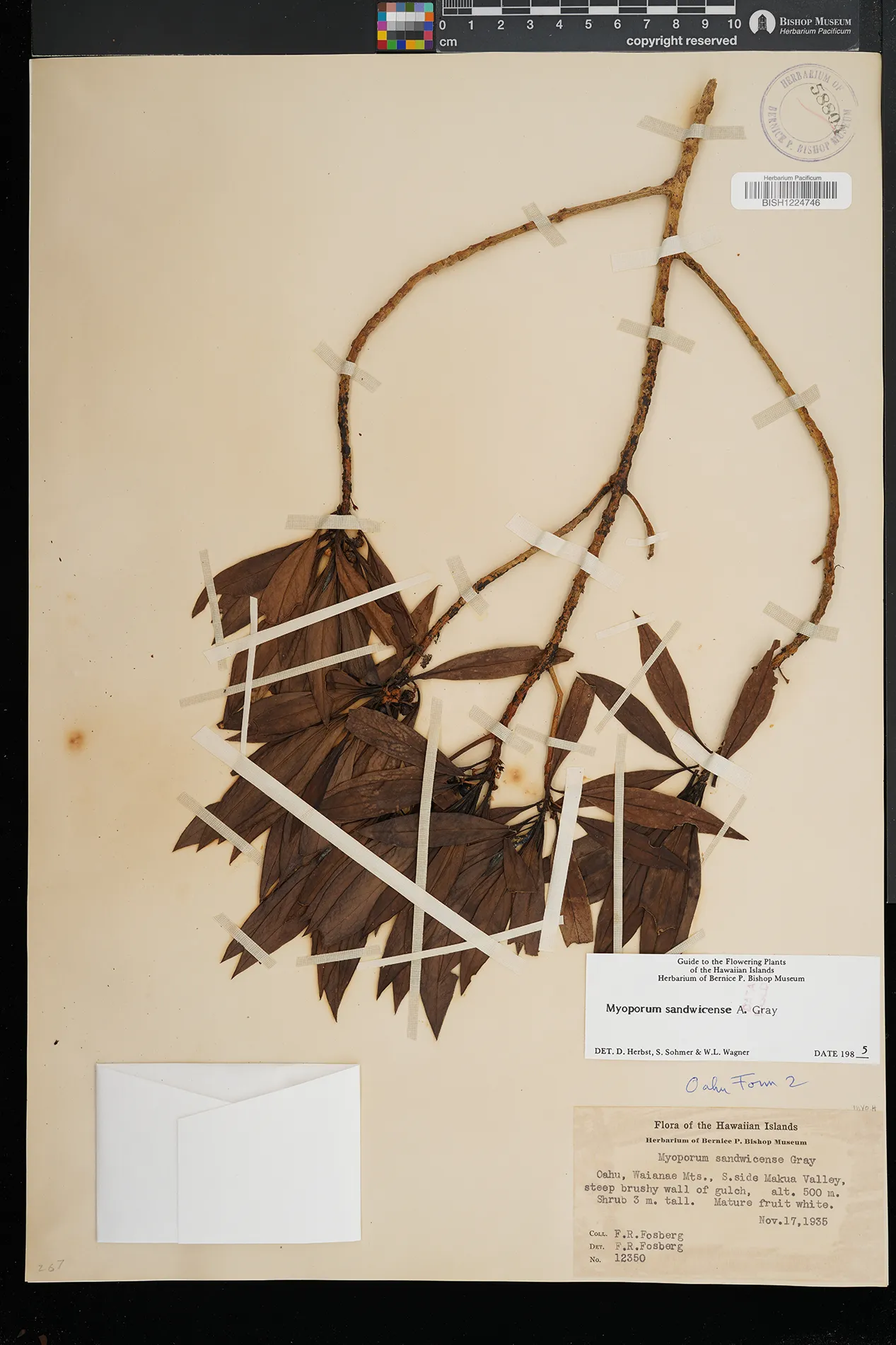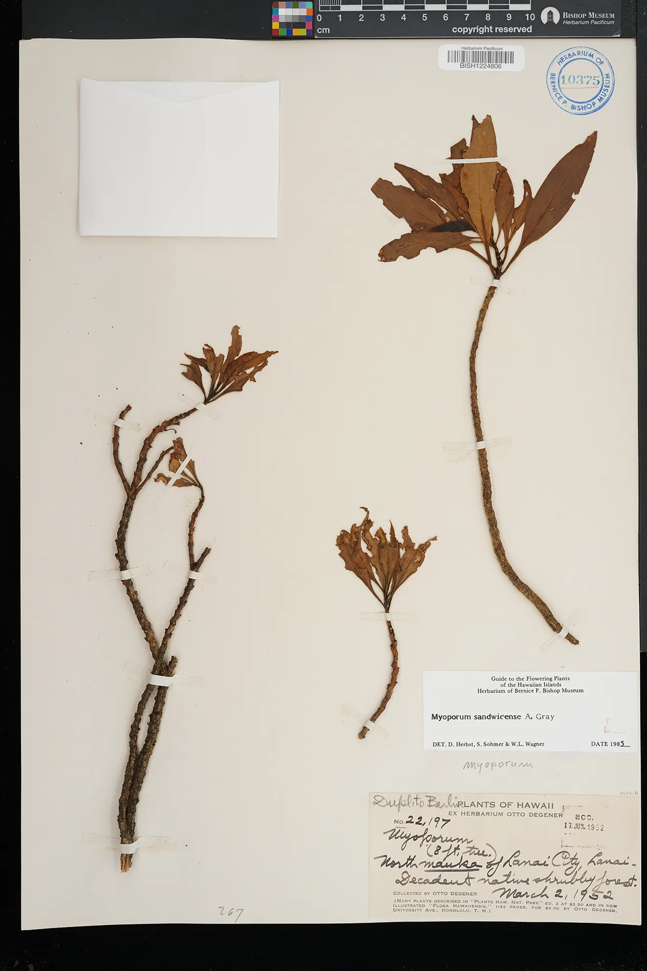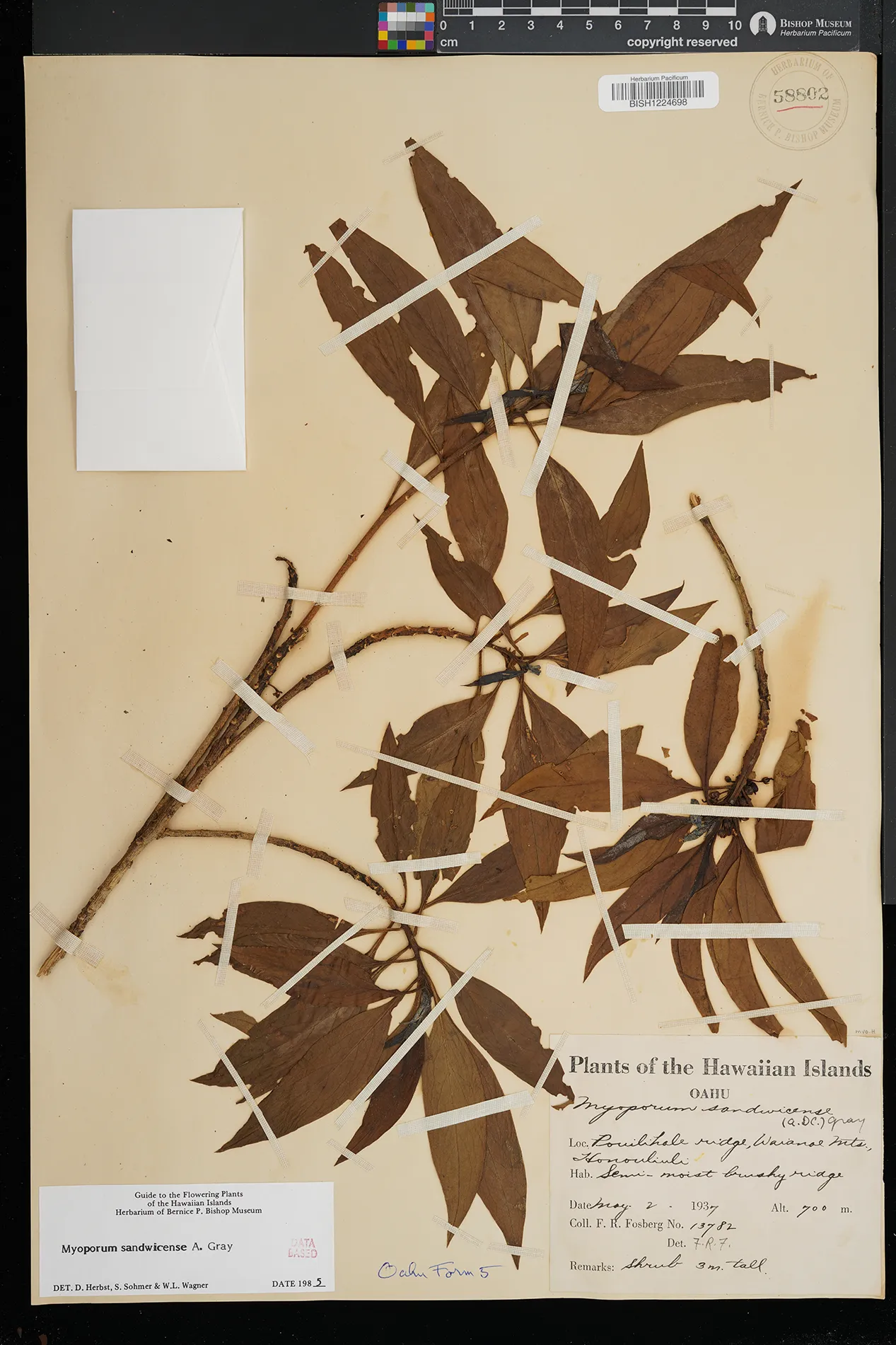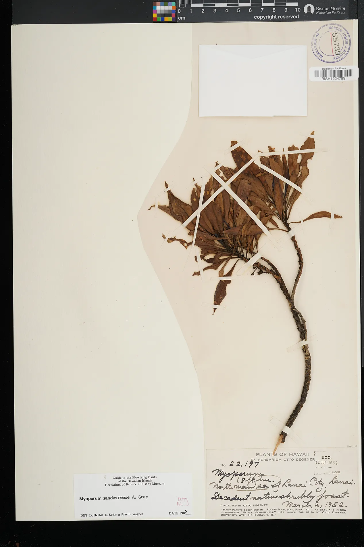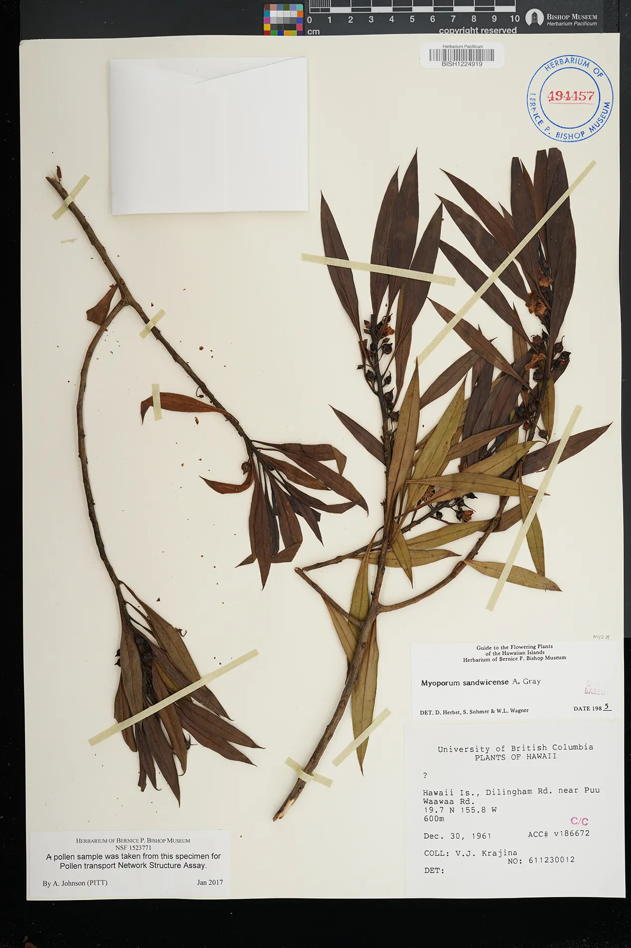 Wood has odor similar to sandalwood (Degener 1930:267). Used for house posts (Degener 1930:268; Krauss 1993:56). Burns well and long, used for torches (Lamb 1981:127). Wood used for fish net gauge (haha ka ‘upena) (Krauss 1993:35). In the Ethnology Collection at Bishop Museum there is a post-contact example of the wood made into a bowl.
