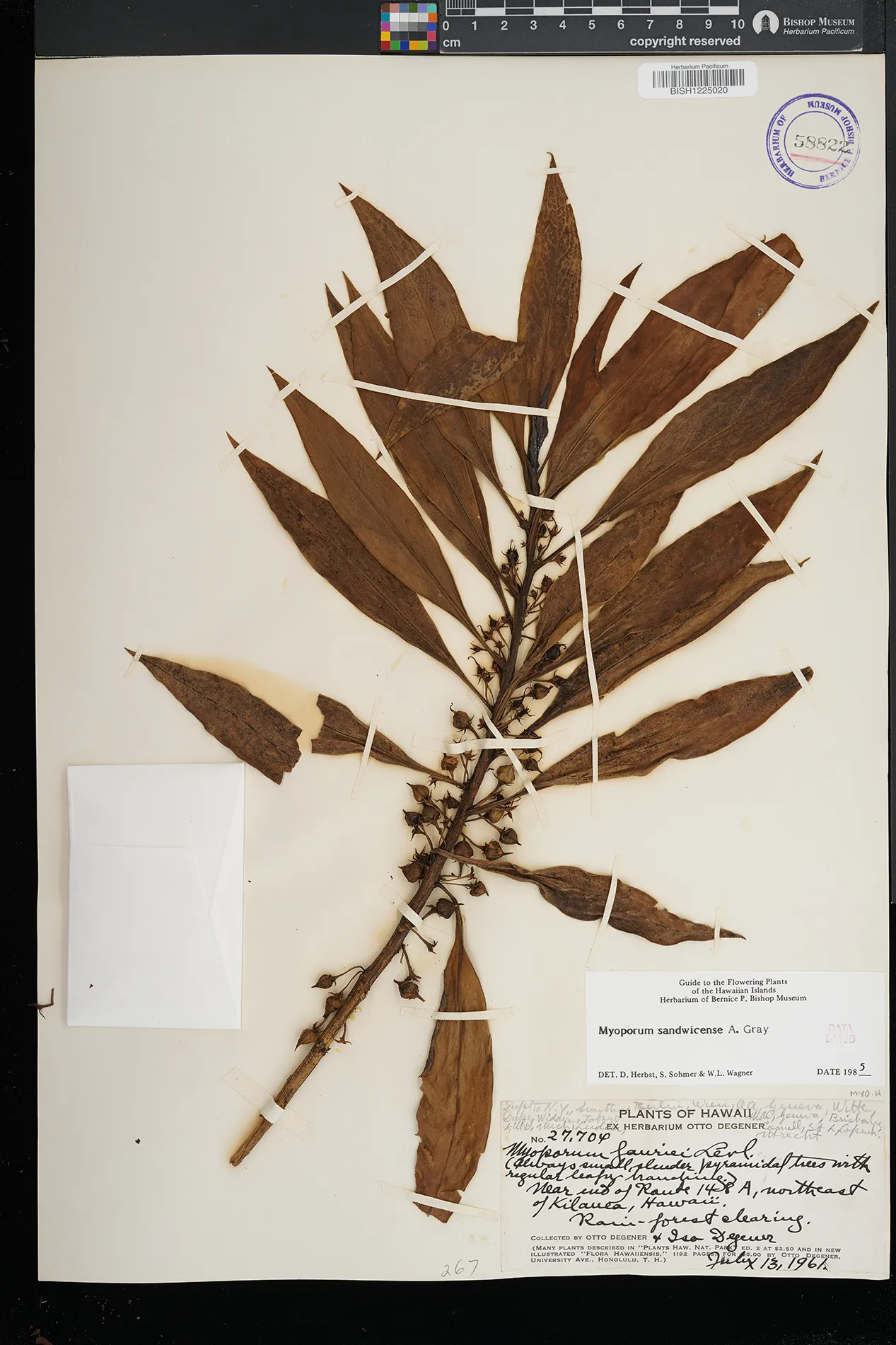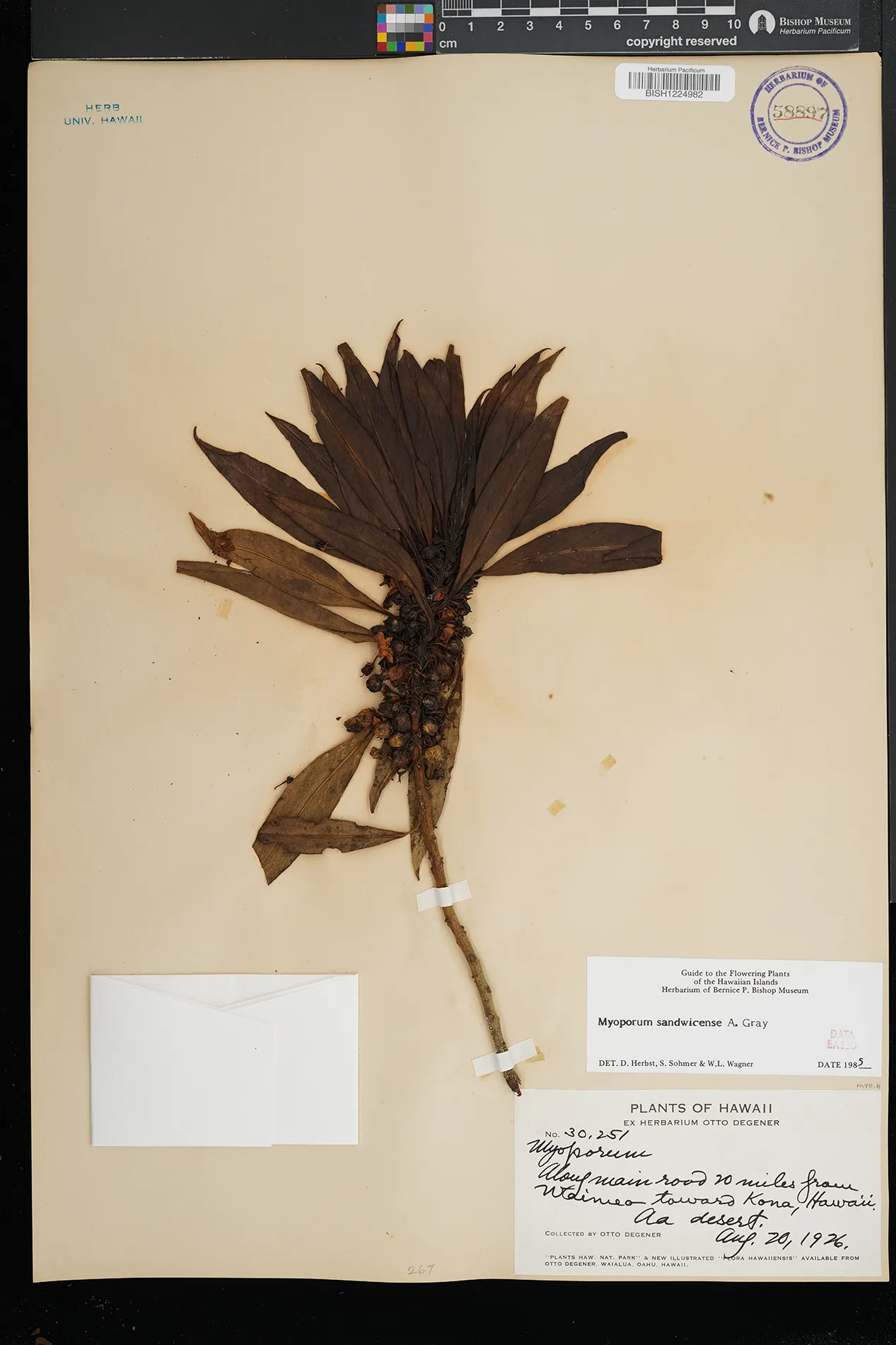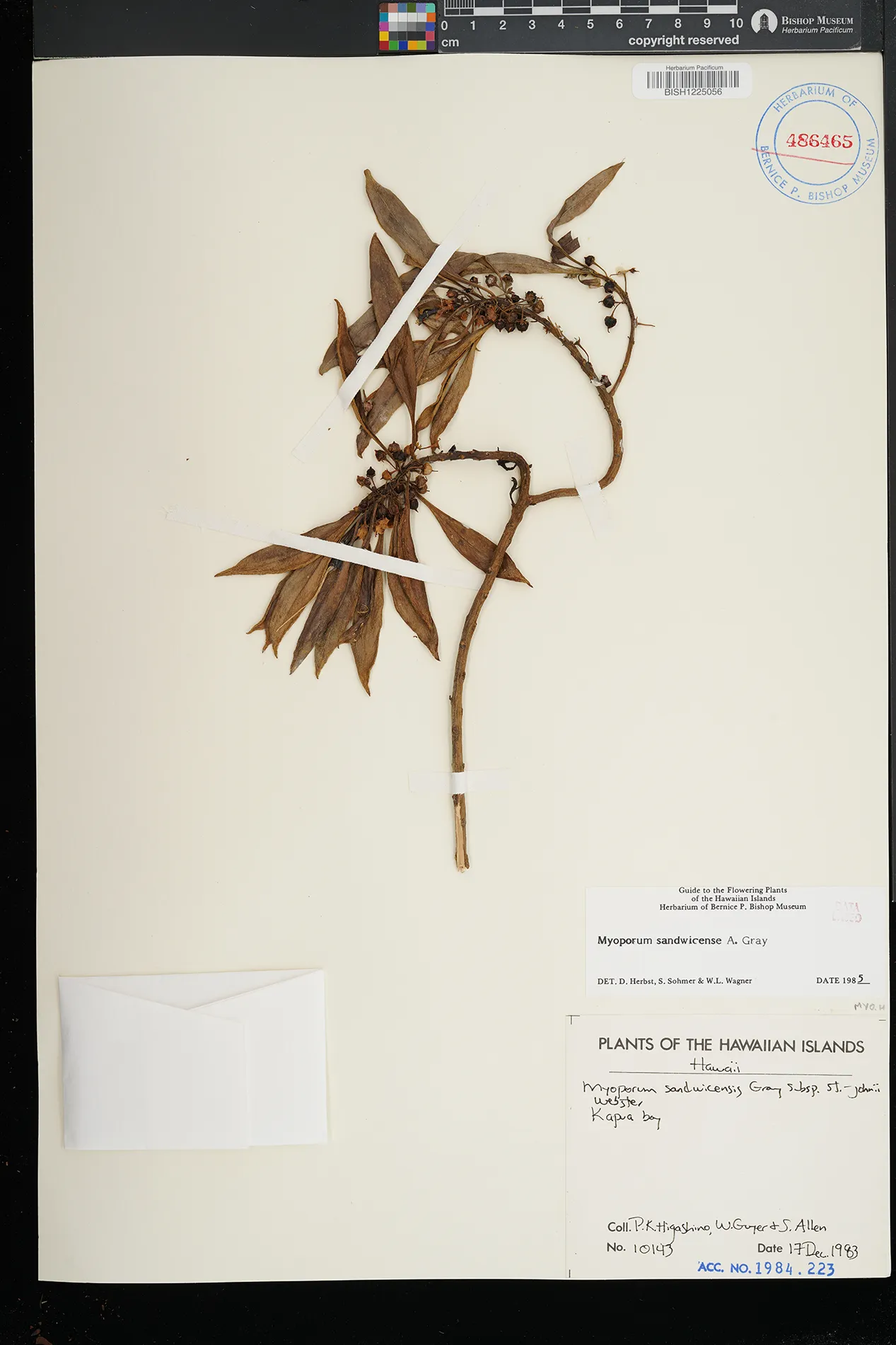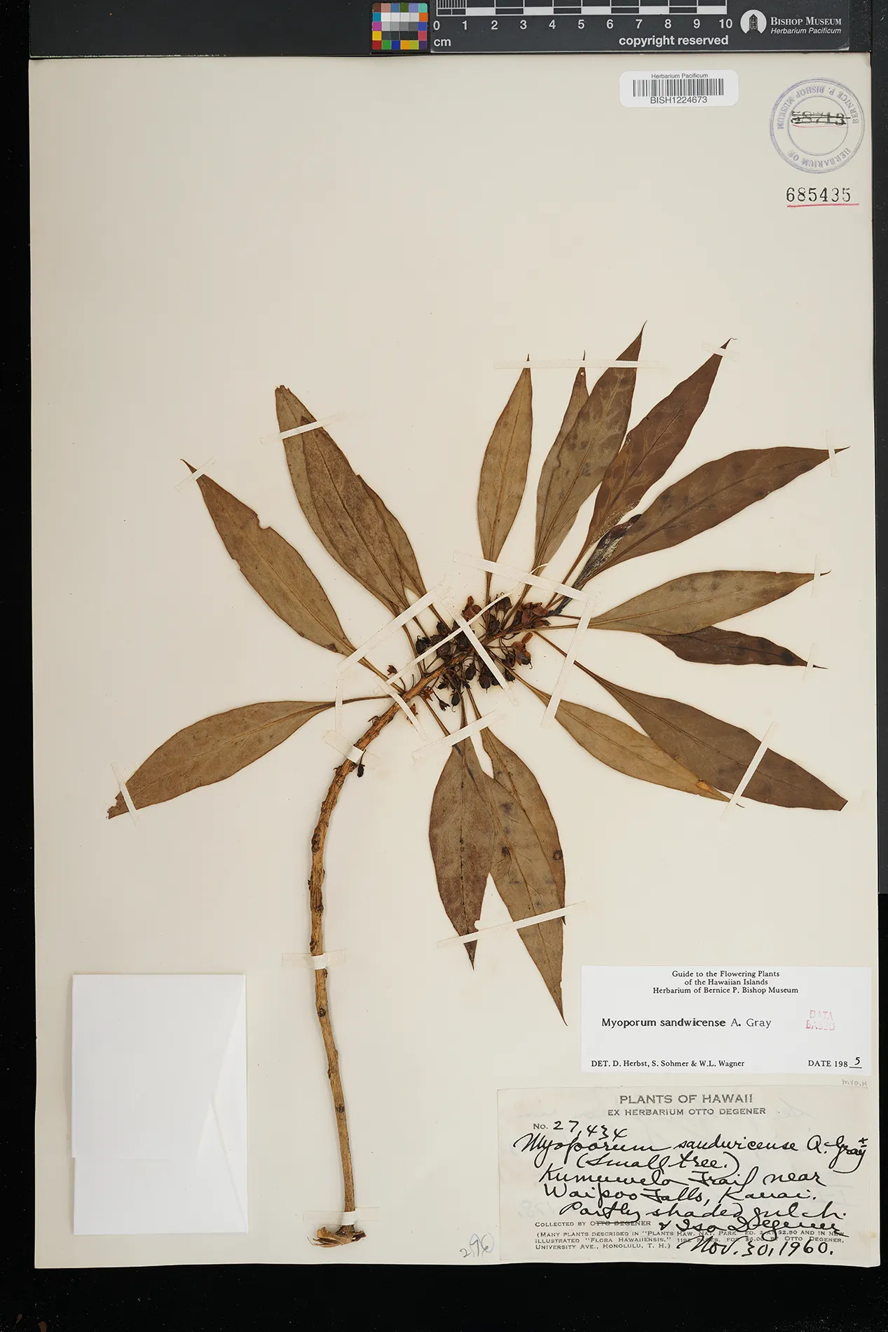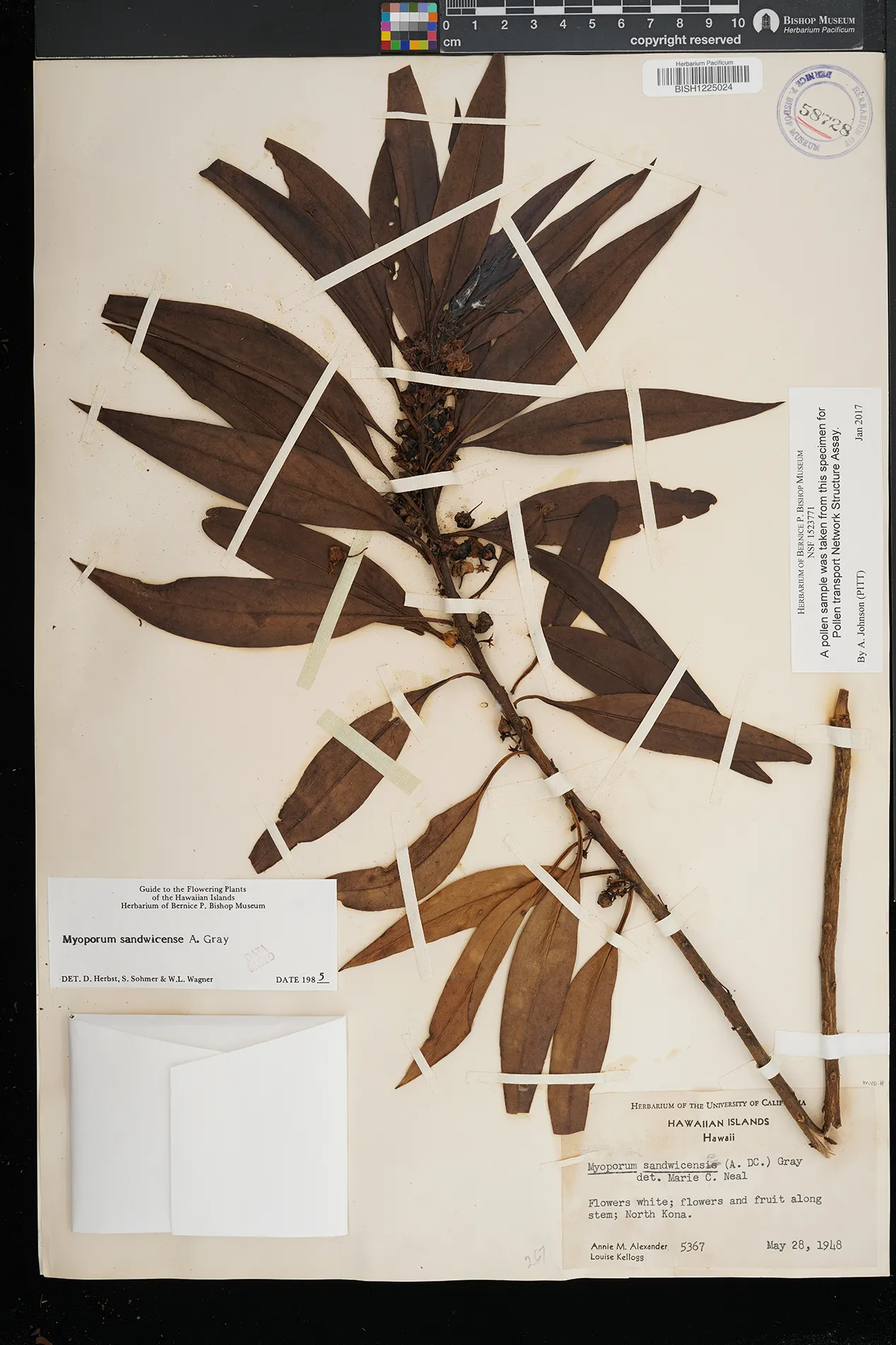 Wood has odor similar to sandalwood (Degener 1930:267). Used for house posts (Degener 1930:268; Krauss 1993:56). Burns well and long, used for torches (Lamb 1981:127). Wood used for fish net gauge (haha ka ‘upena) (Krauss 1993:35). In the Ethnology Collection at Bishop Museum there is a post-contact example of the wood made into a bowl.