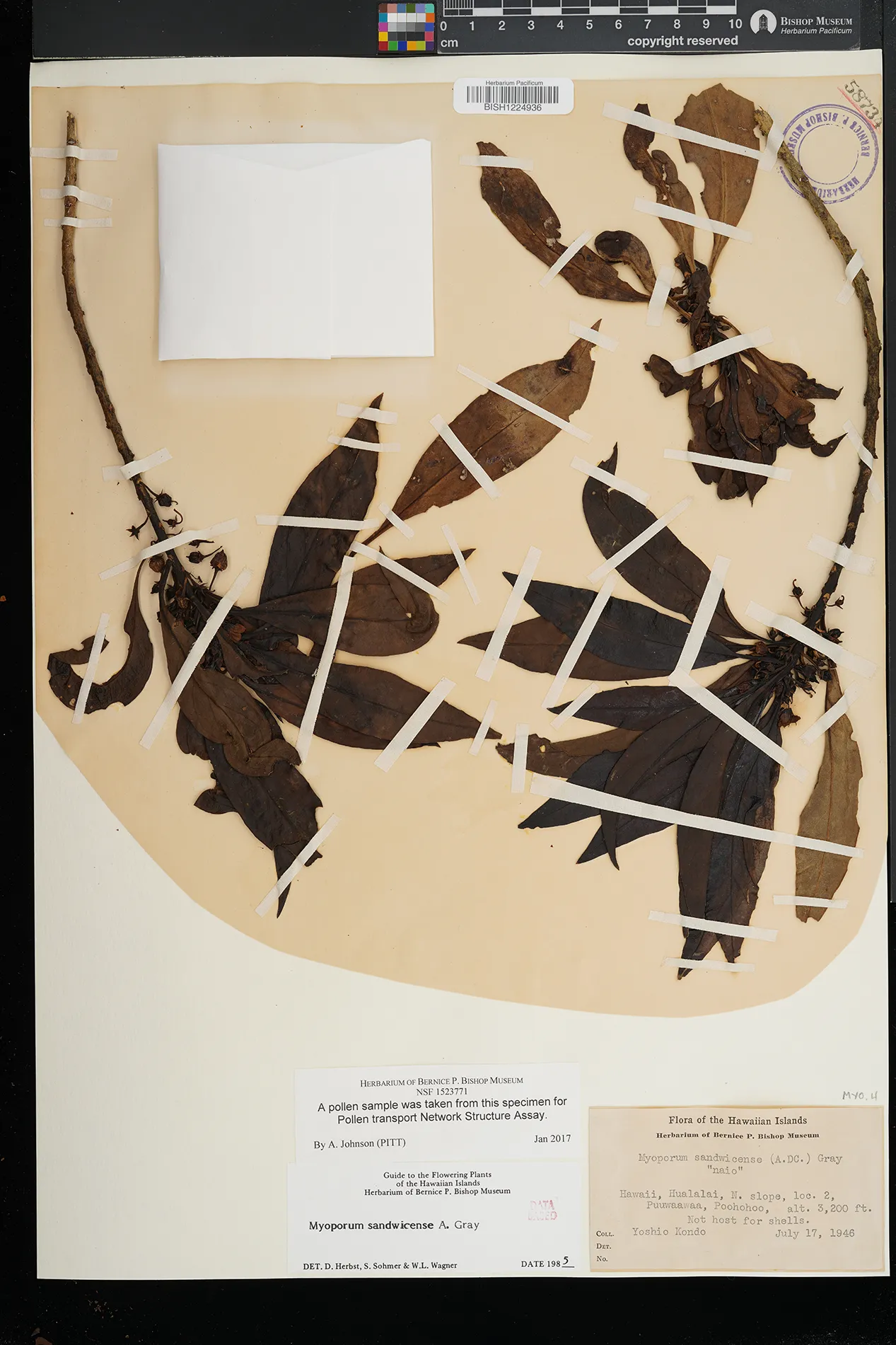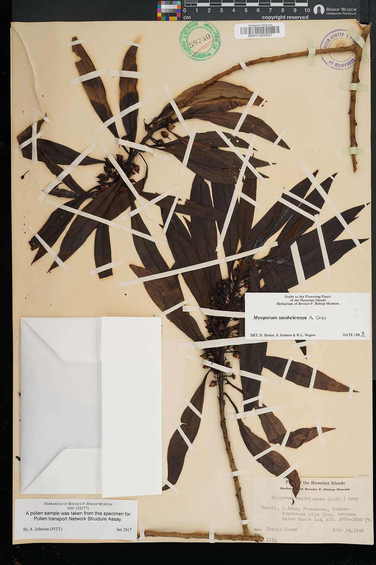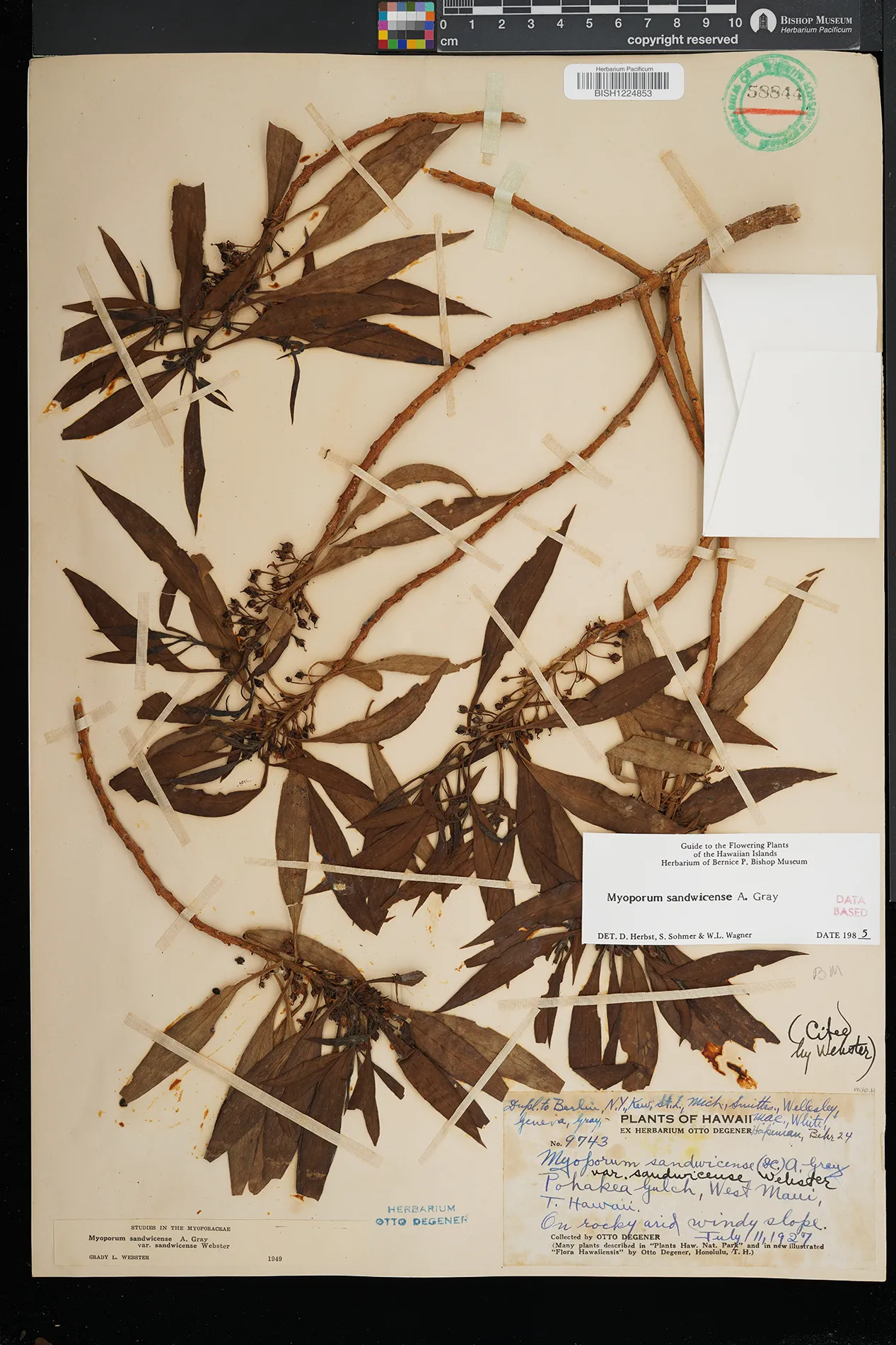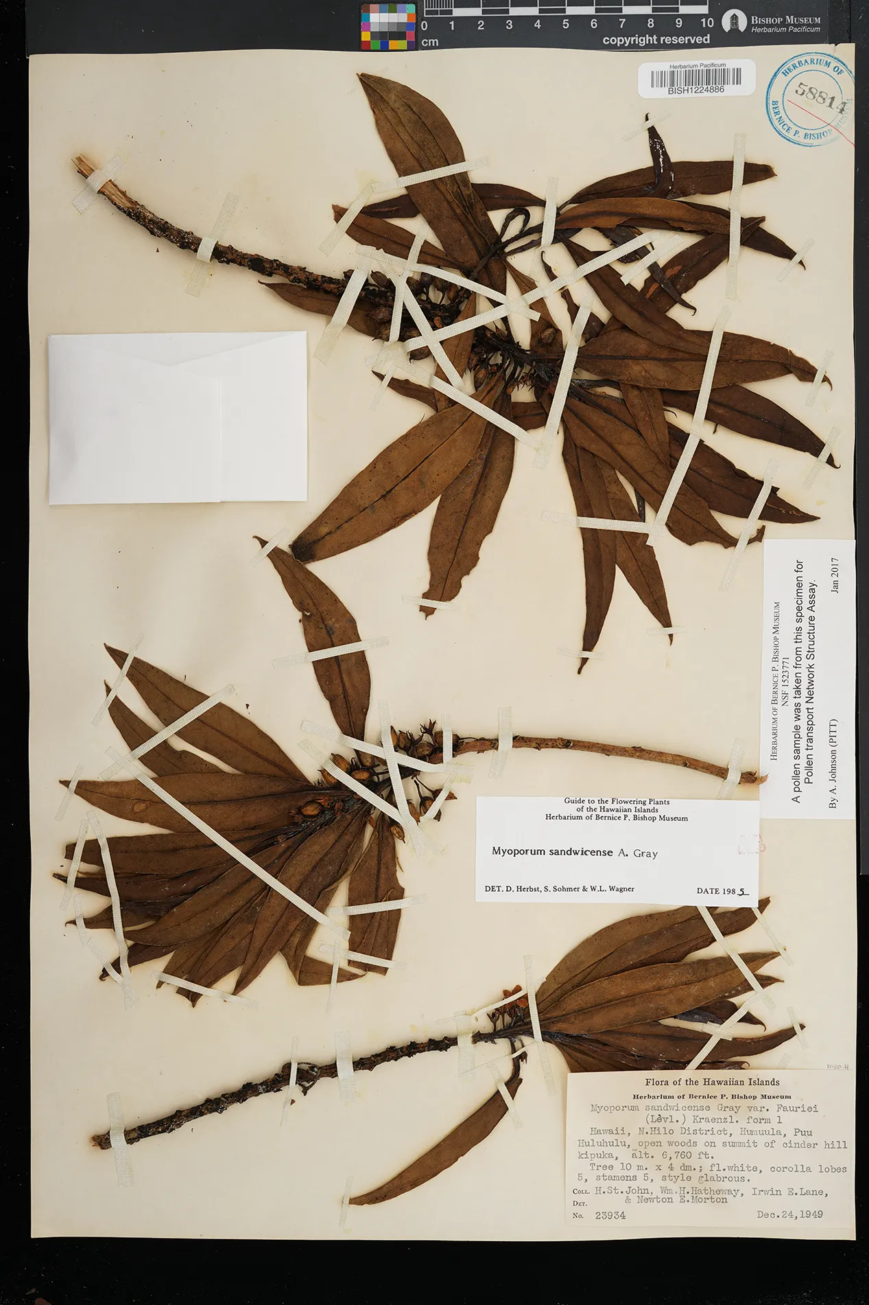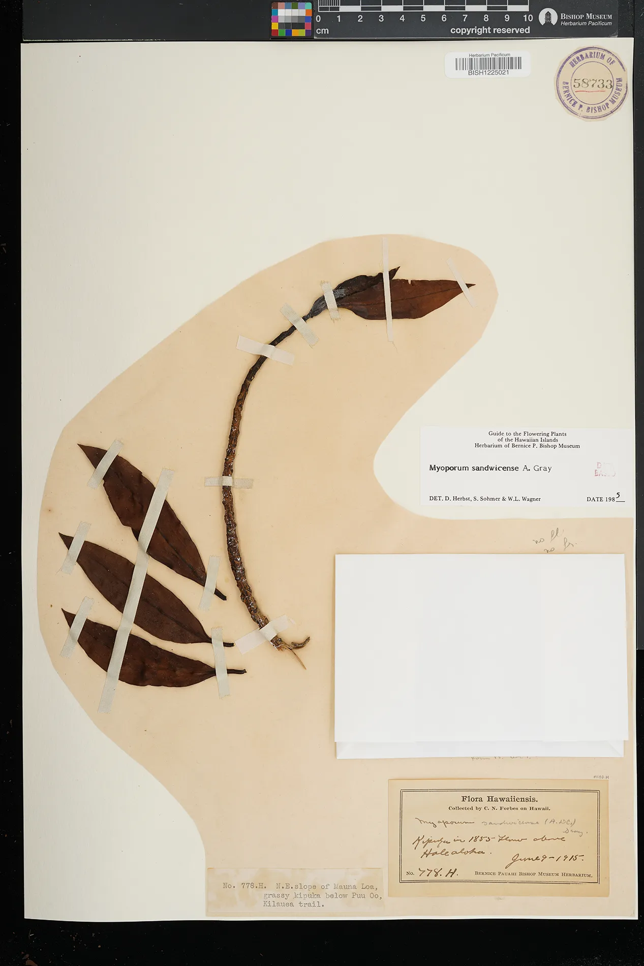 Wood has odor similar to sandalwood (Degener 1930:267). Used for house posts (Degener 1930:268; Krauss 1993:56). Burns well and long, used for torches (Lamb 1981:127). Wood used for fish net gauge (haha ka ‘upena) (Krauss 1993:35). In the Ethnology Collection at Bishop Museum there is a post-contact example of the wood made into a bowl.