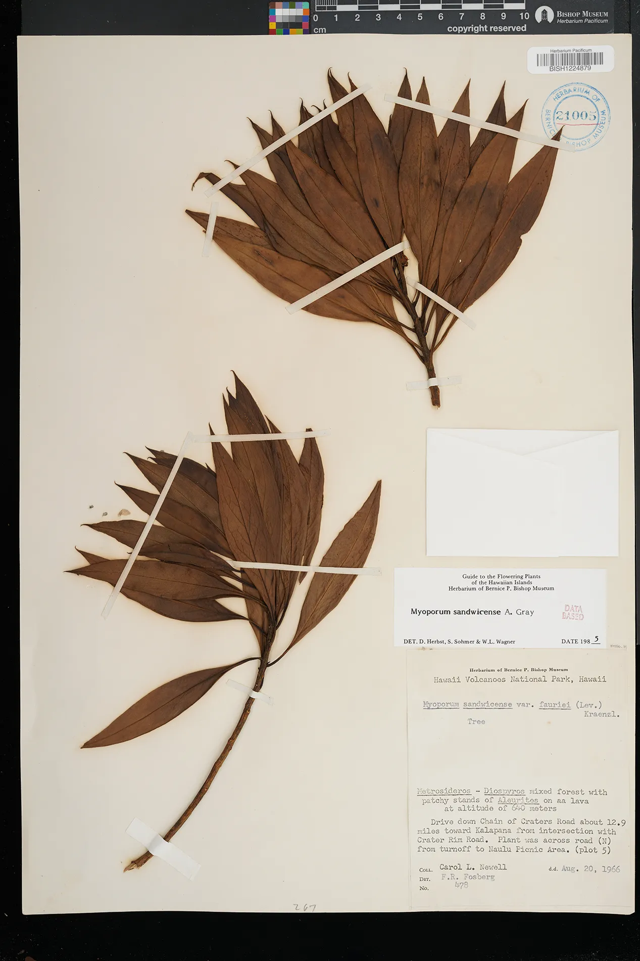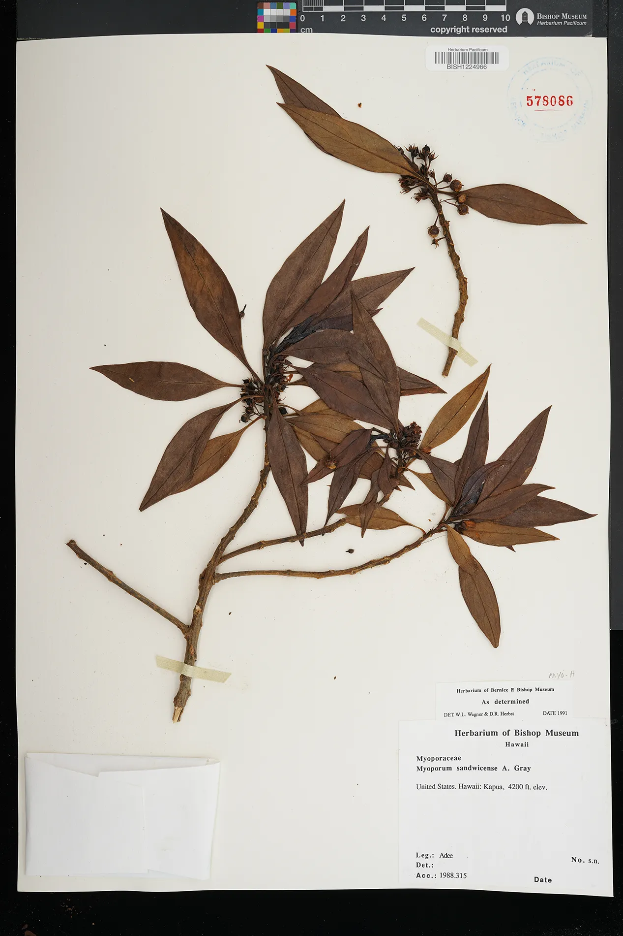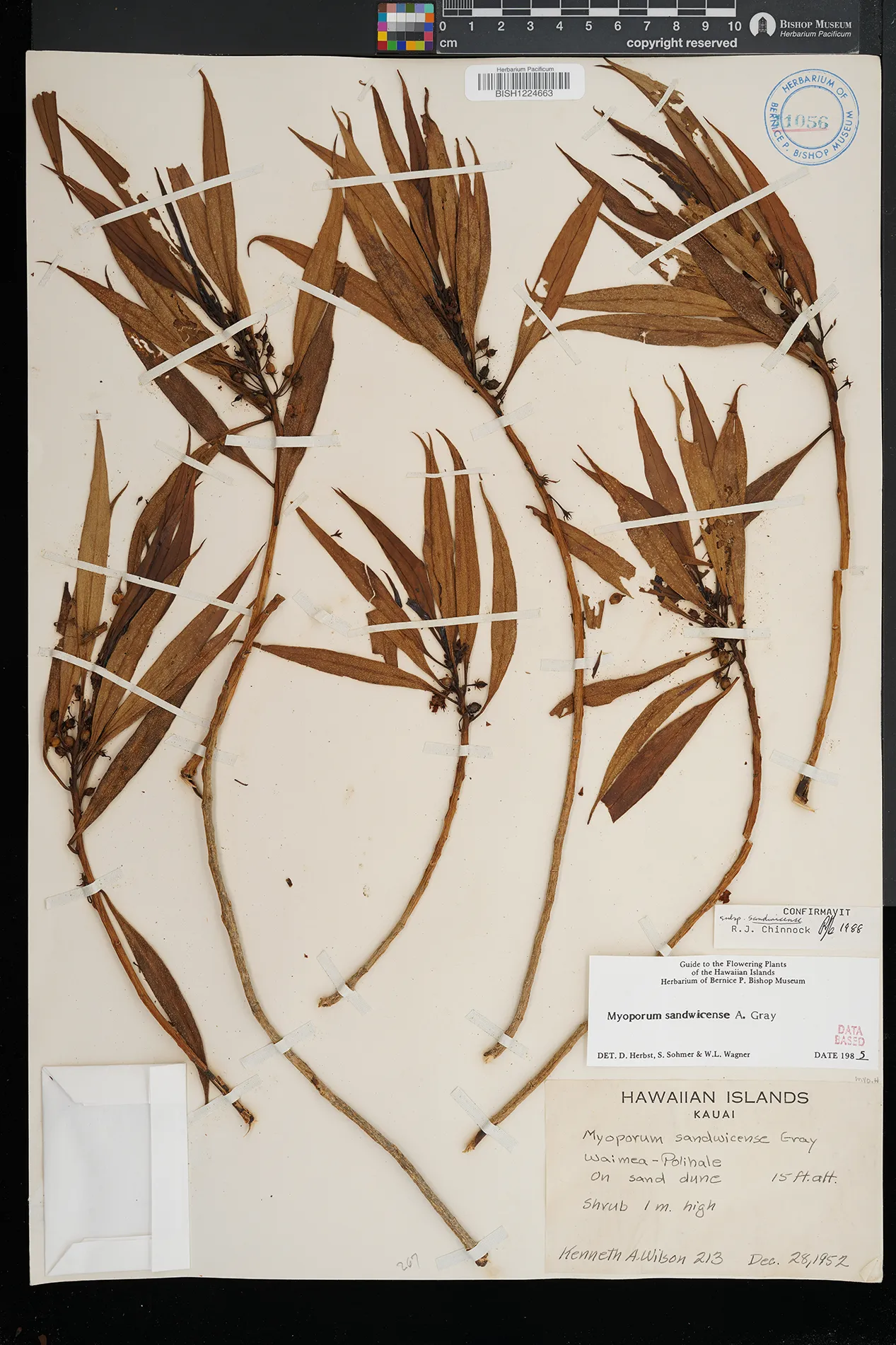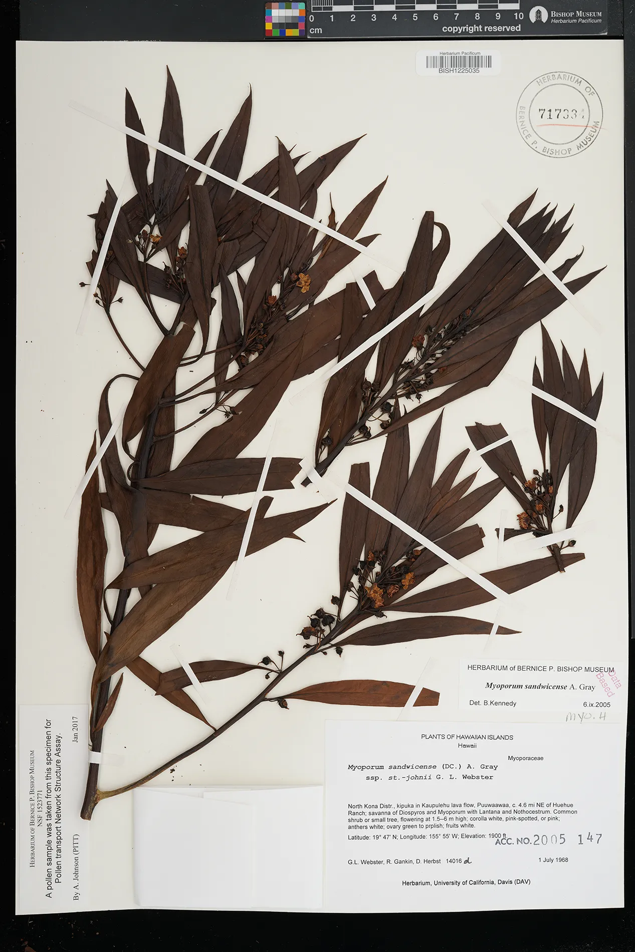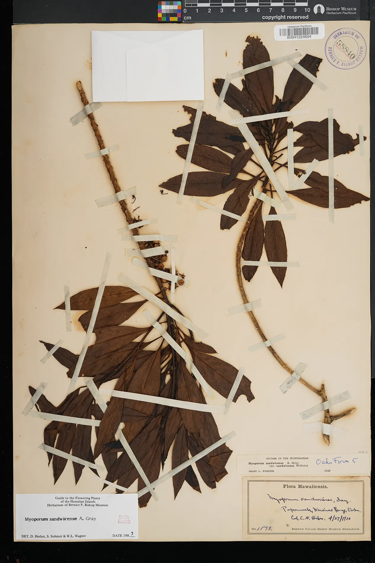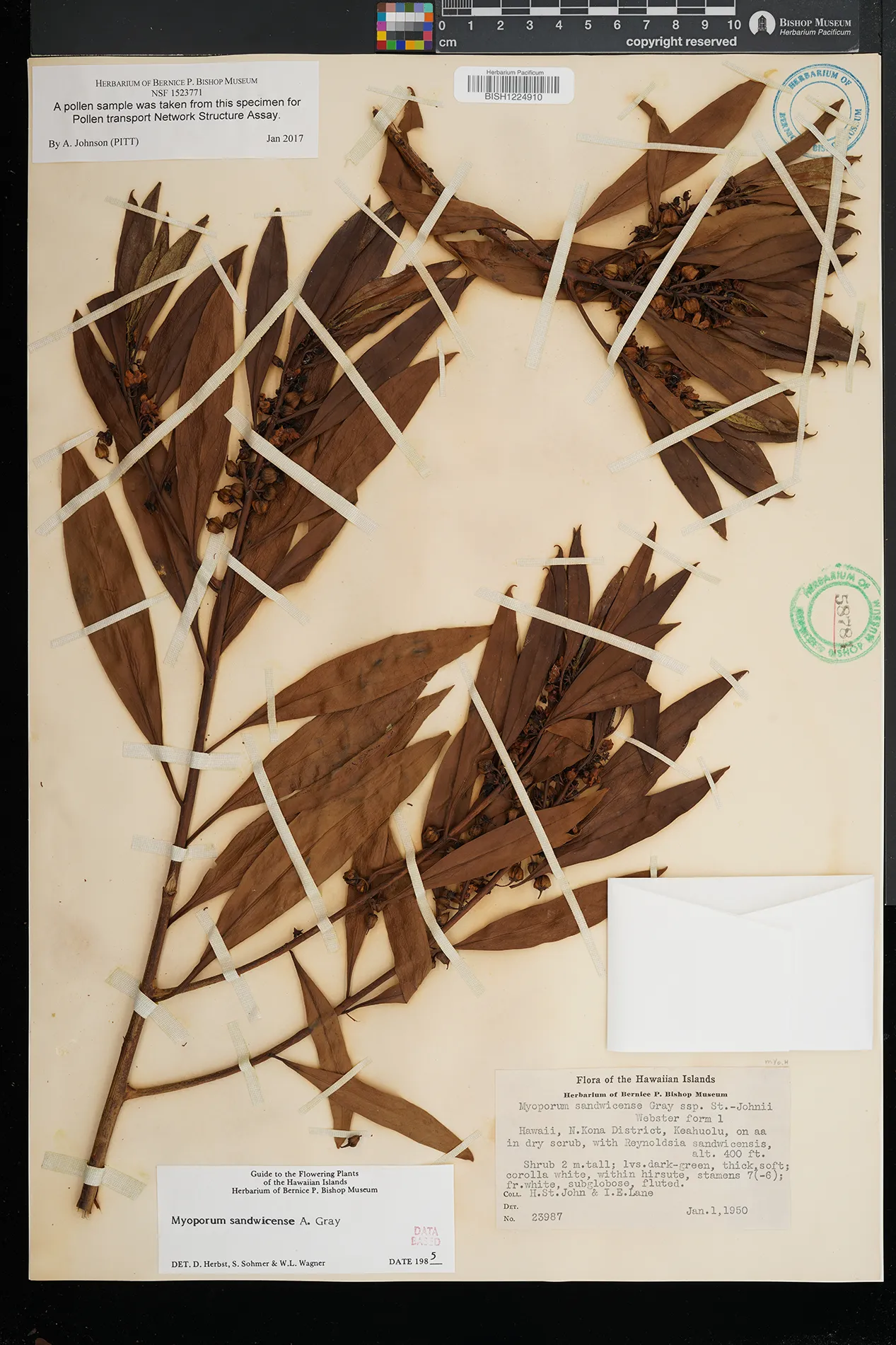 Wood has odor similar to sandalwood (Degener 1930:267). Used for house posts (Degener 1930:268; Krauss 1993:56). Burns well and long, used for torches (Lamb 1981:127). Wood used for fish net gauge (haha ka ‘upena) (Krauss 1993:35). In the Ethnology Collection at Bishop Museum there is a post-contact example of the wood made into a bowl.
