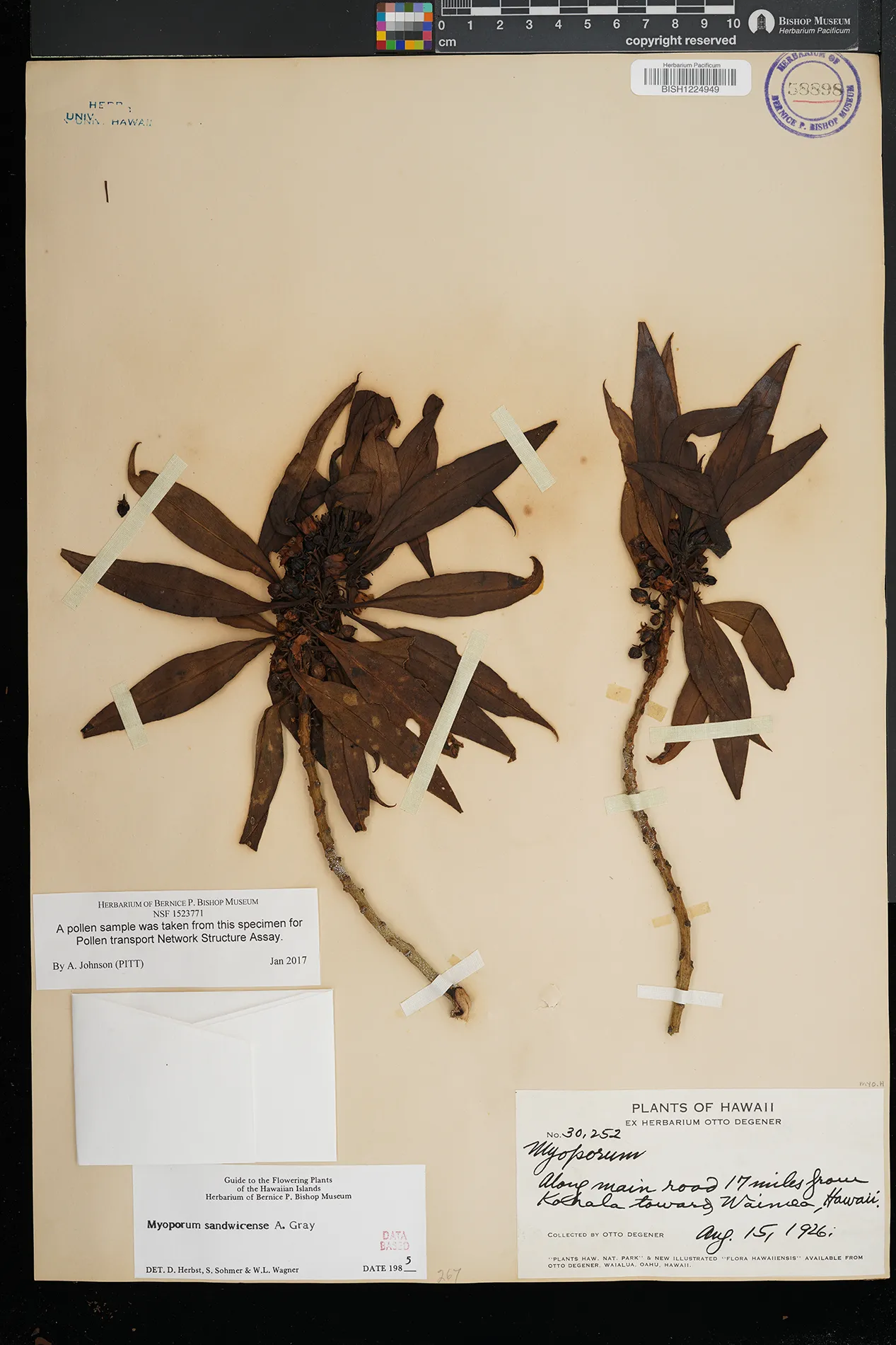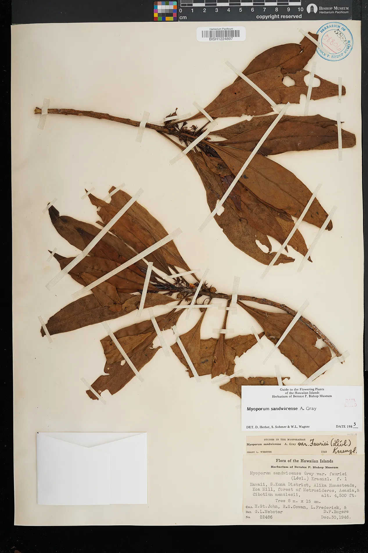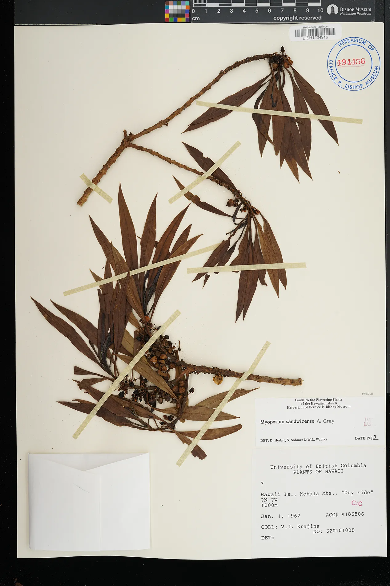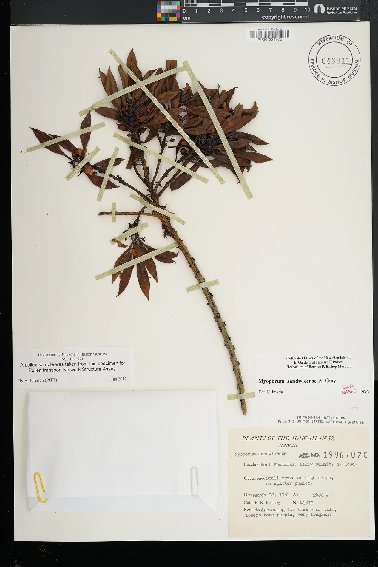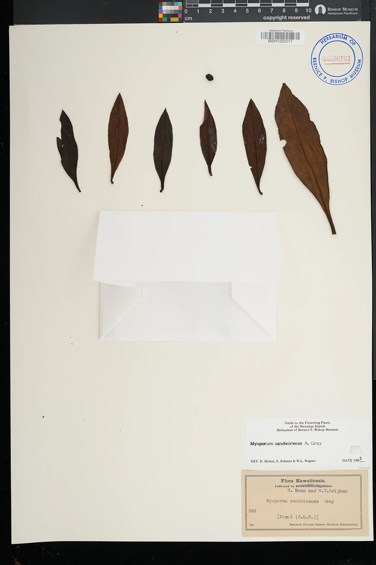 Wood has odor similar to sandalwood (Degener 1930:267). Used for house posts (Degener 1930:268; Krauss 1993:56). Burns well and long, used for torches (Lamb 1981:127). Wood used for fish net gauge (haha ka ‘upena) (Krauss 1993:35). In the Ethnology Collection at Bishop Museum there is a post-contact example of the wood made into a bowl.