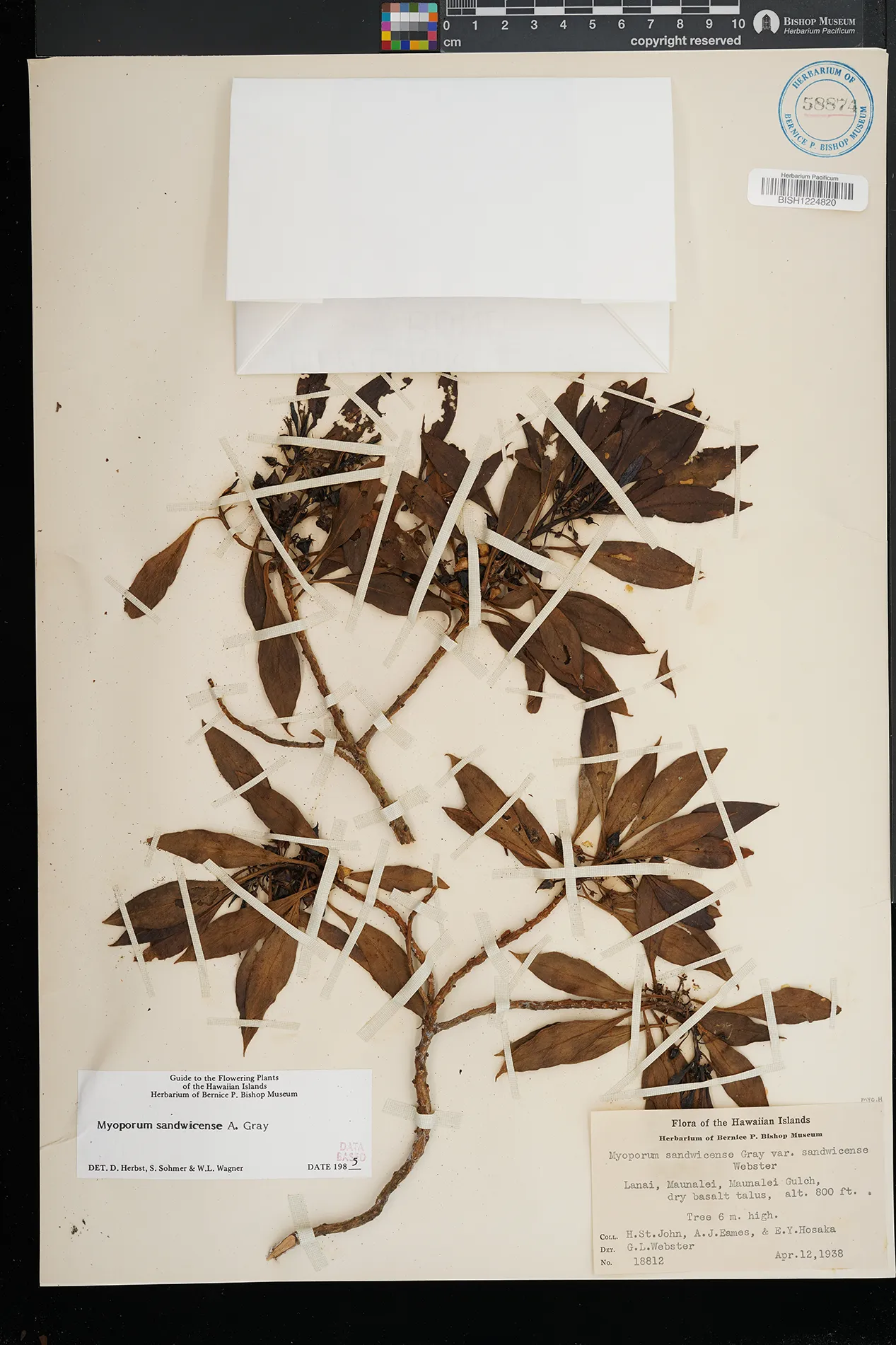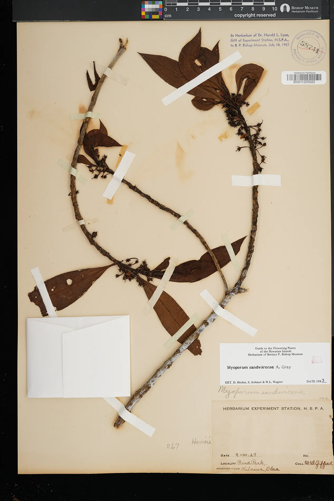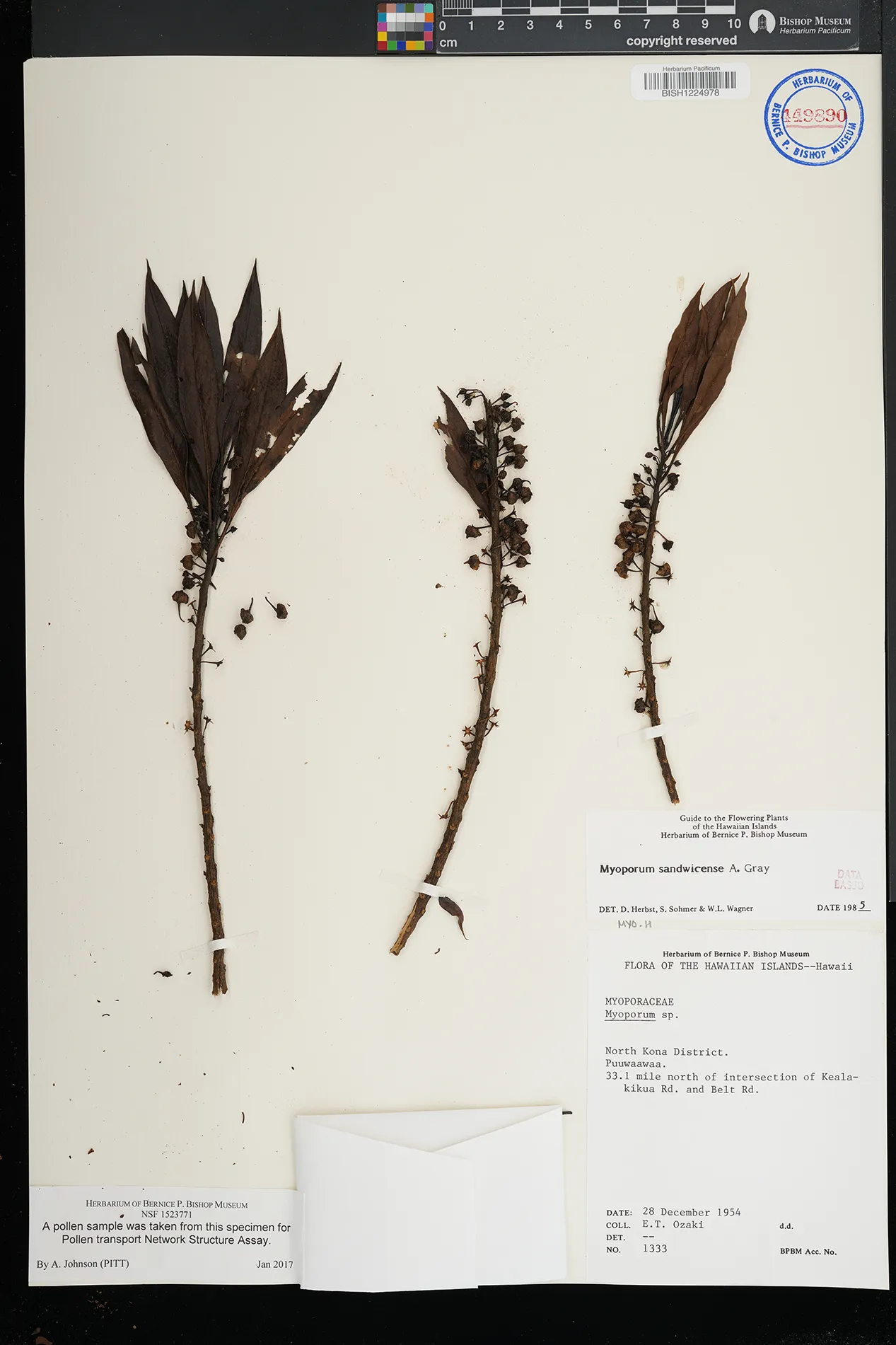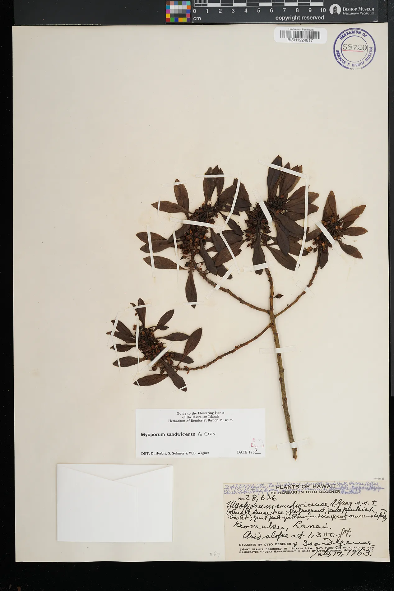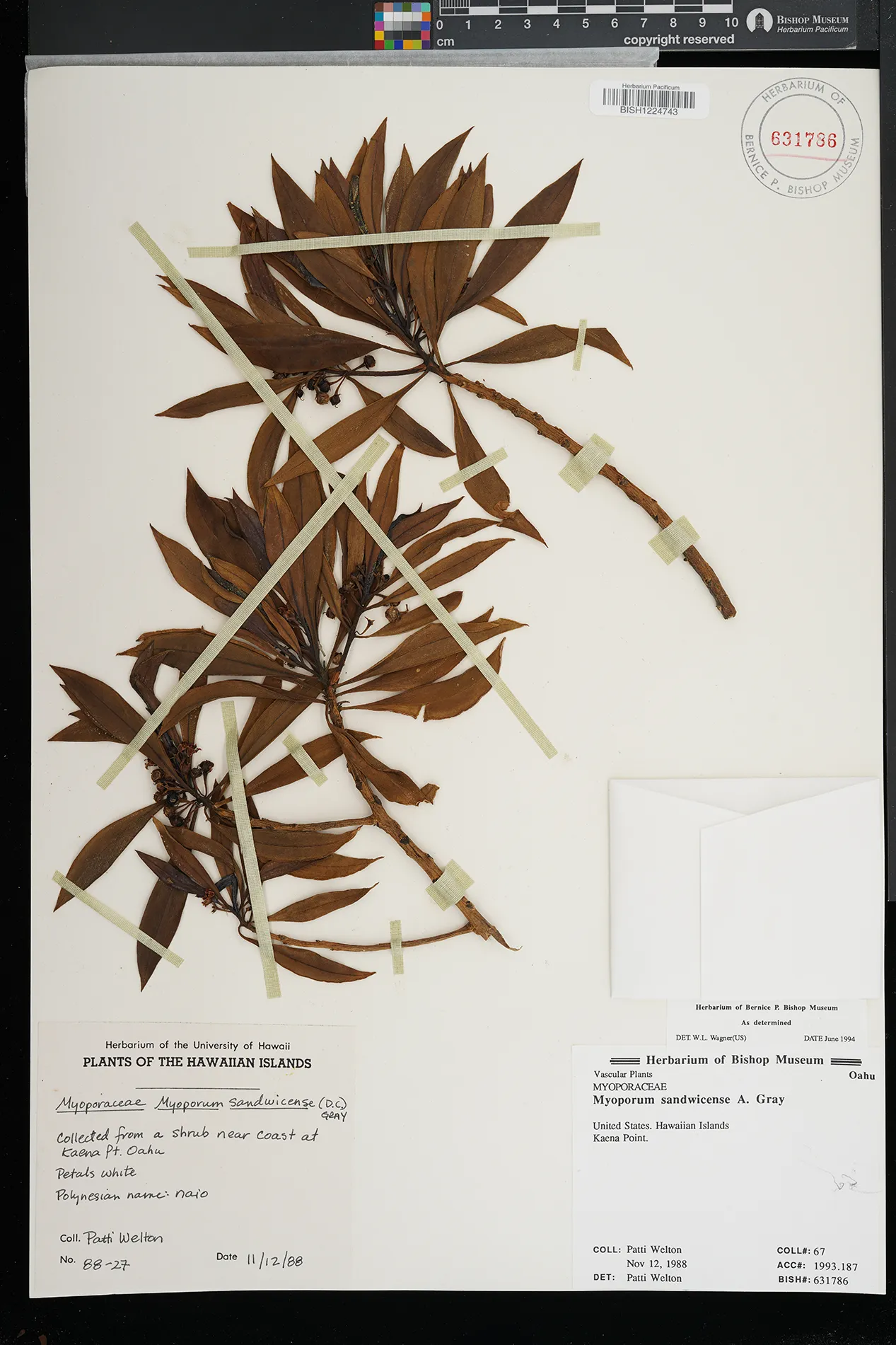 Wood has odor similar to sandalwood (Degener 1930:267). Used for house posts (Degener 1930:268; Krauss 1993:56). Burns well and long, used for torches (Lamb 1981:127). Wood used for fish net gauge (haha ka ‘upena) (Krauss 1993:35). In the Ethnology Collection at Bishop Museum there is a post-contact example of the wood made into a bowl.
