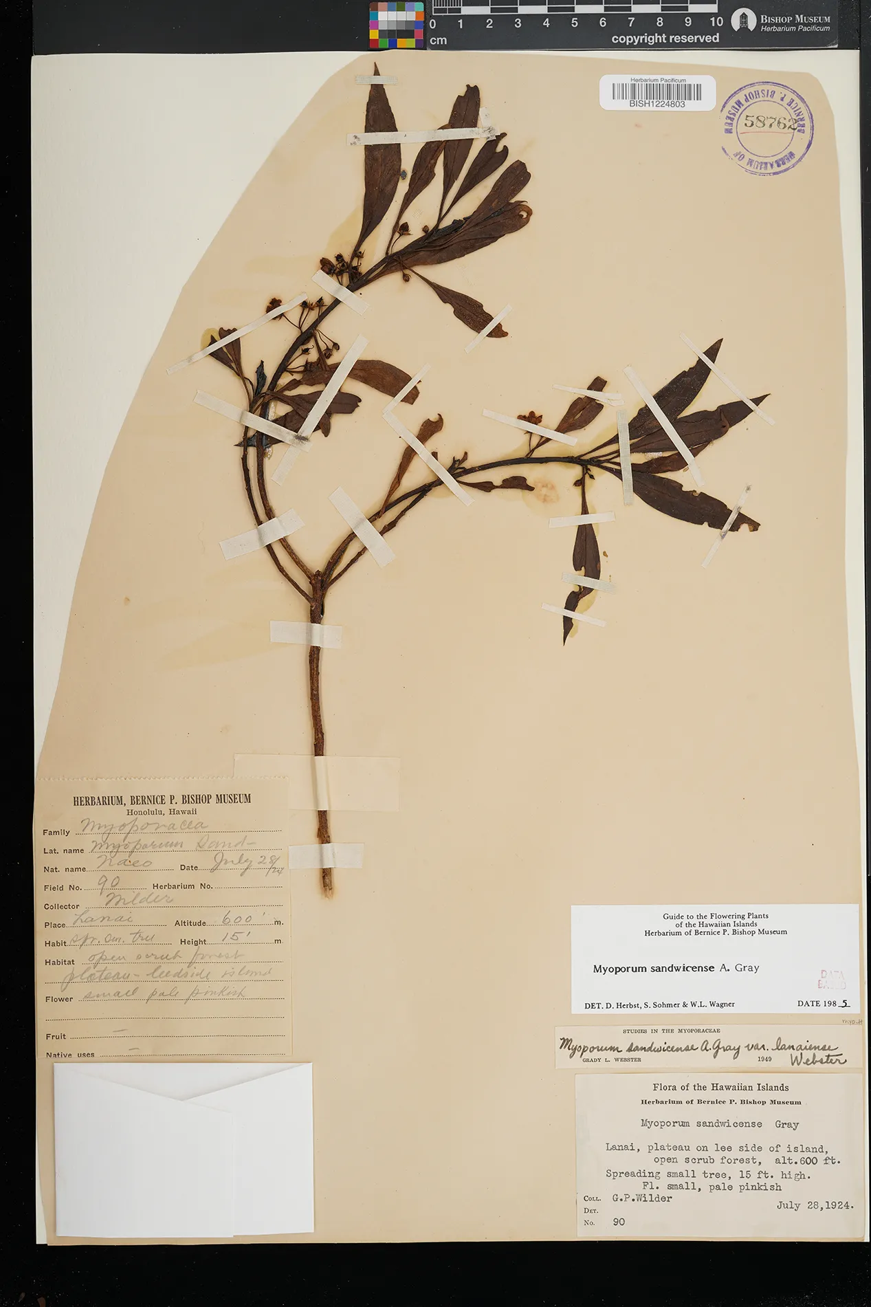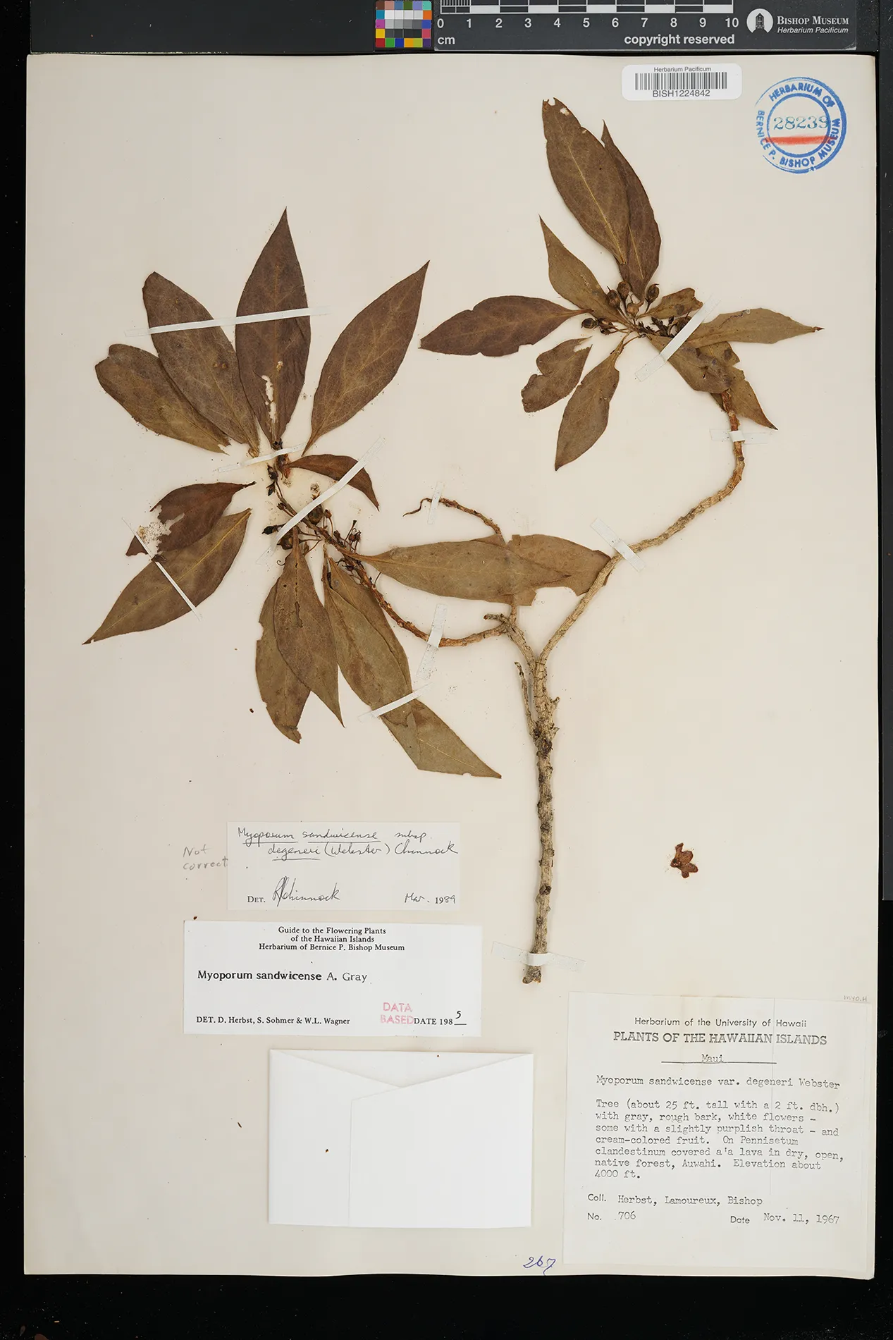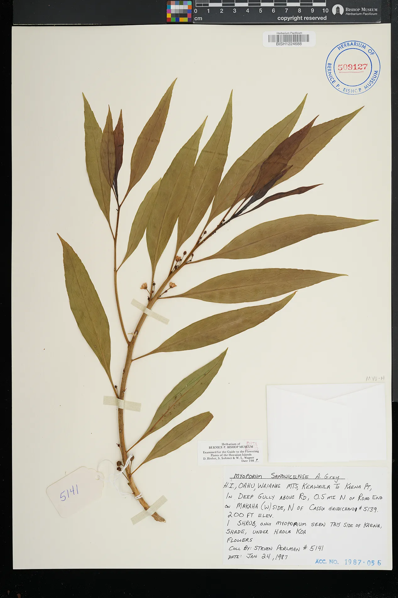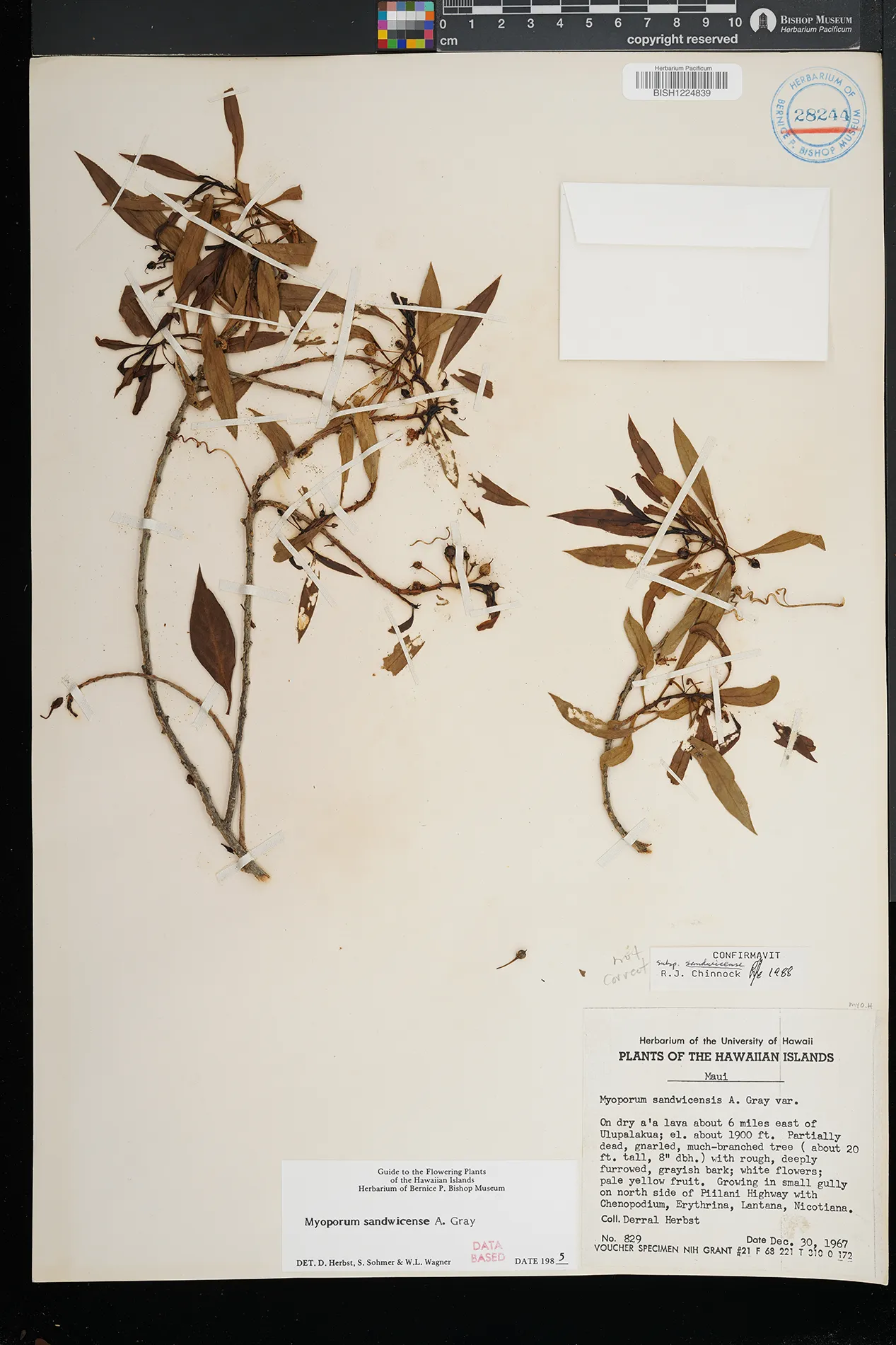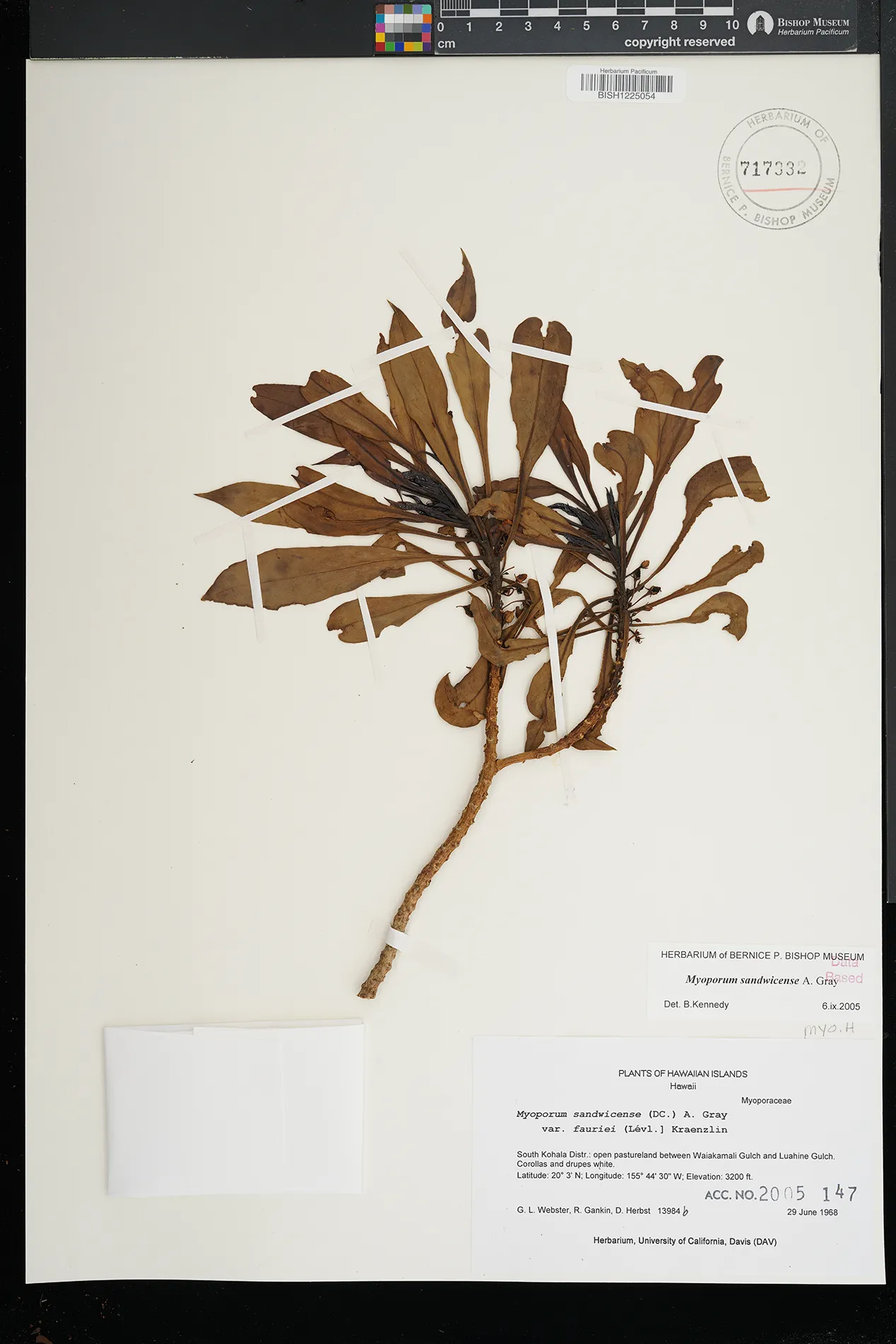 Wood has odor similar to sandalwood (Degener 1930:267). Used for house posts (Degener 1930:268; Krauss 1993:56). Burns well and long, used for torches (Lamb 1981:127). Wood used for fish net gauge (haha ka ‘upena) (Krauss 1993:35). In the Ethnology Collection at Bishop Museum there is a post-contact example of the wood made into a bowl.