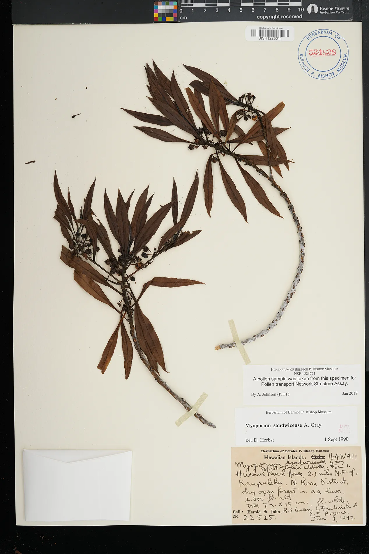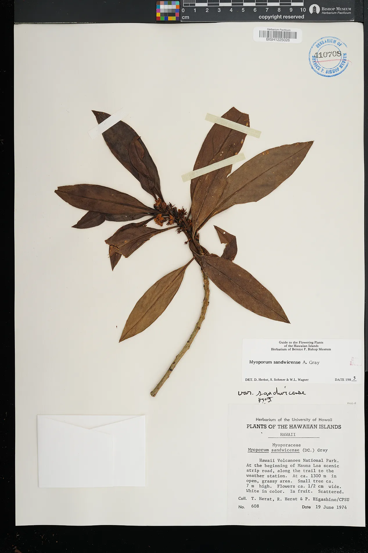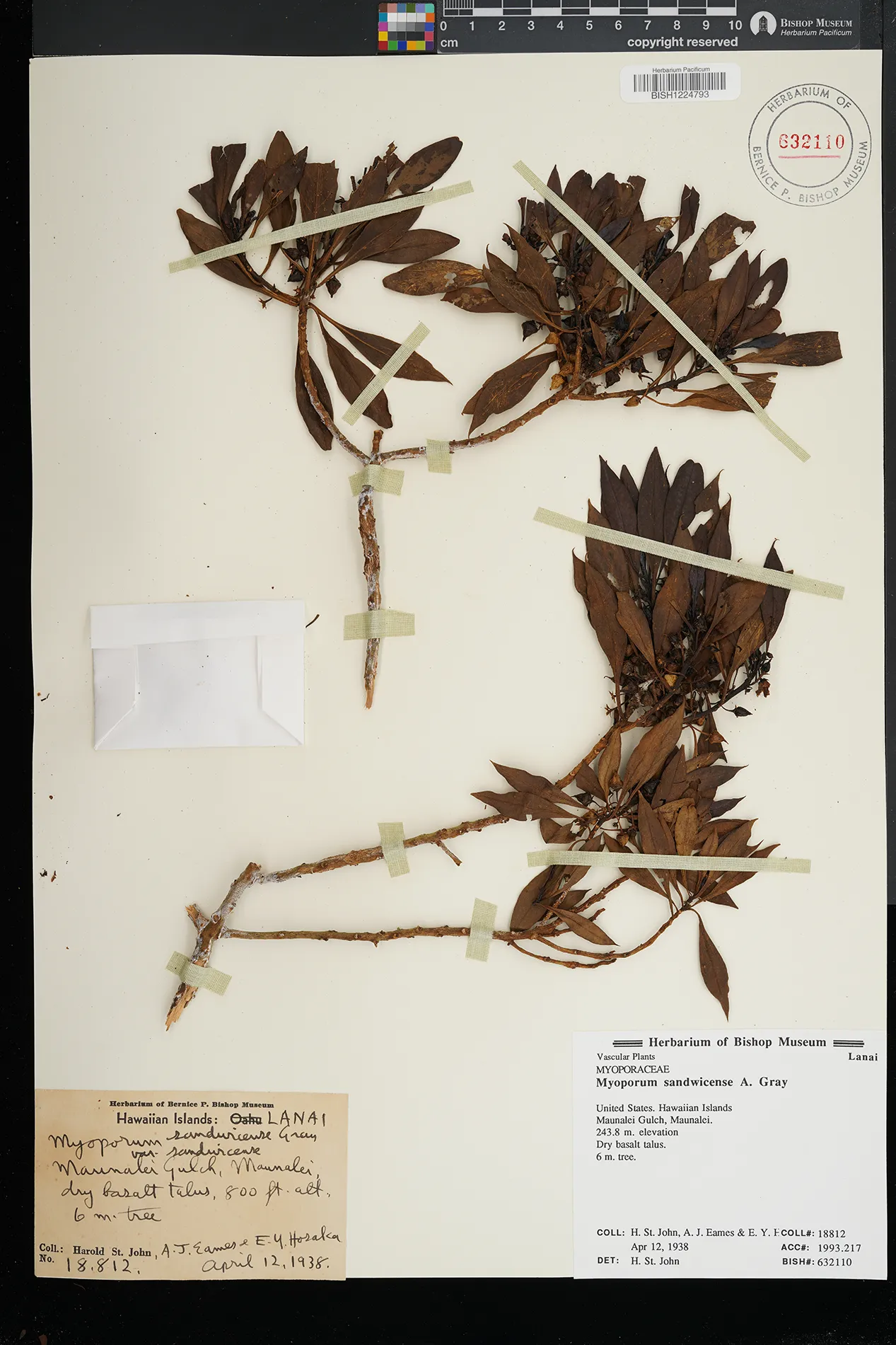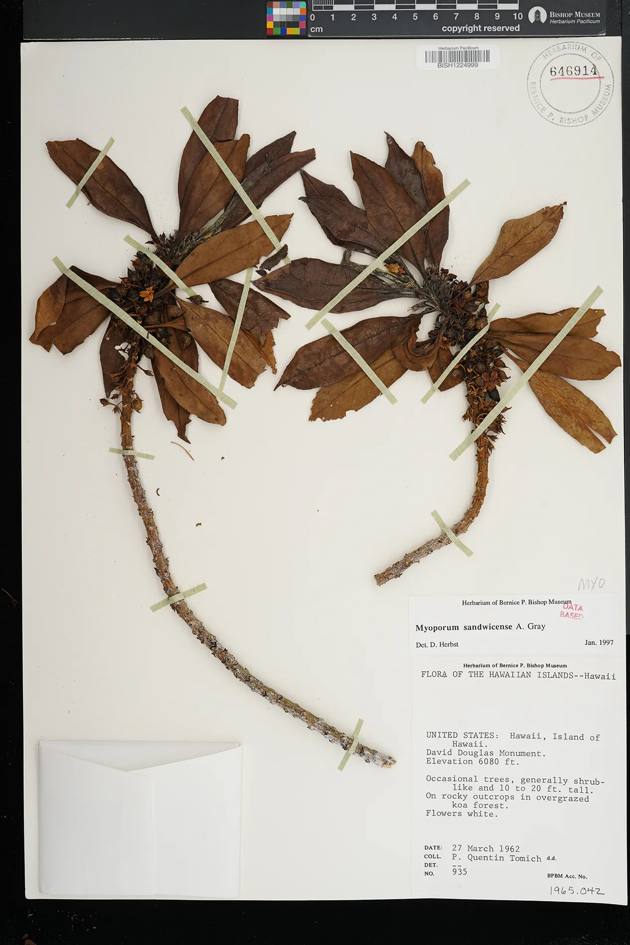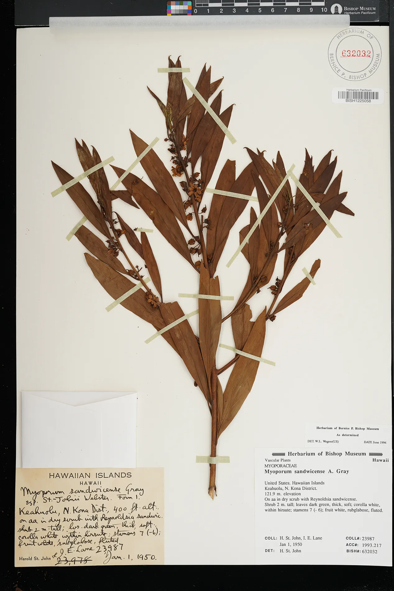 Wood has odor similar to sandalwood (Degener 1930:267). Used for house posts (Degener 1930:268; Krauss 1993:56). Burns well and long, used for torches (Lamb 1981:127). Wood used for fish net gauge (haha ka ‘upena) (Krauss 1993:35). In the Ethnology Collection at Bishop Museum there is a post-contact example of the wood made into a bowl.