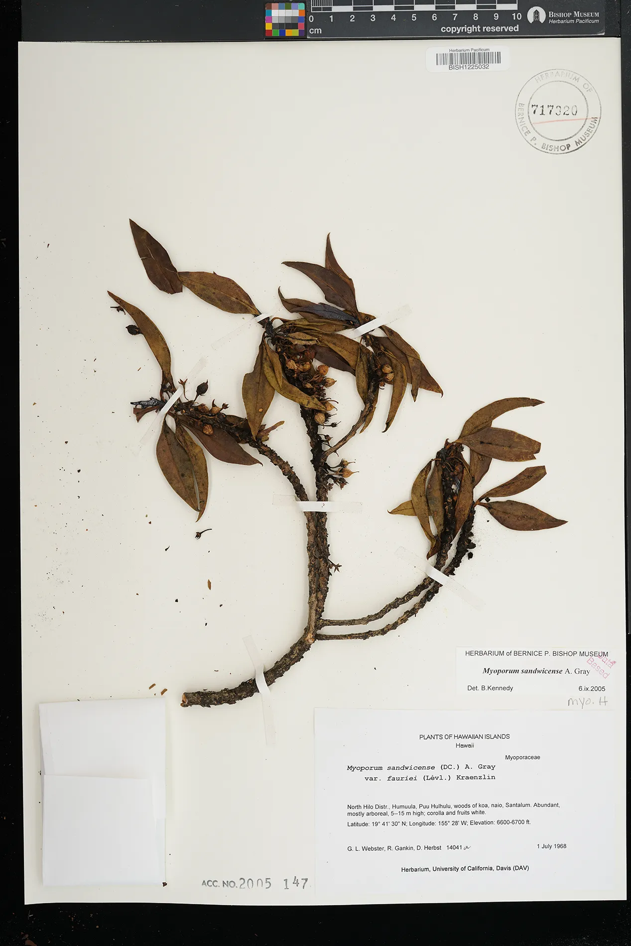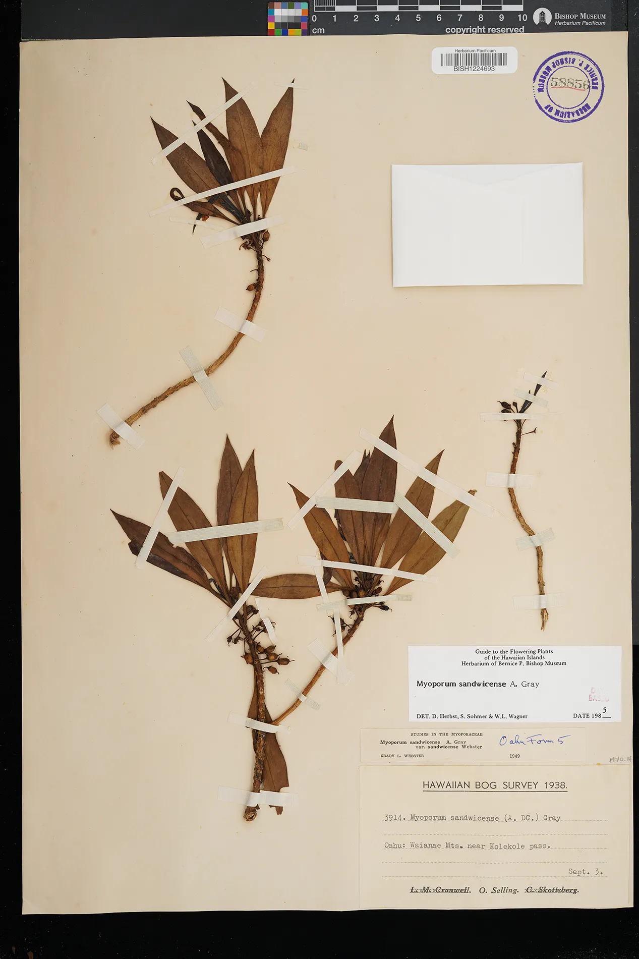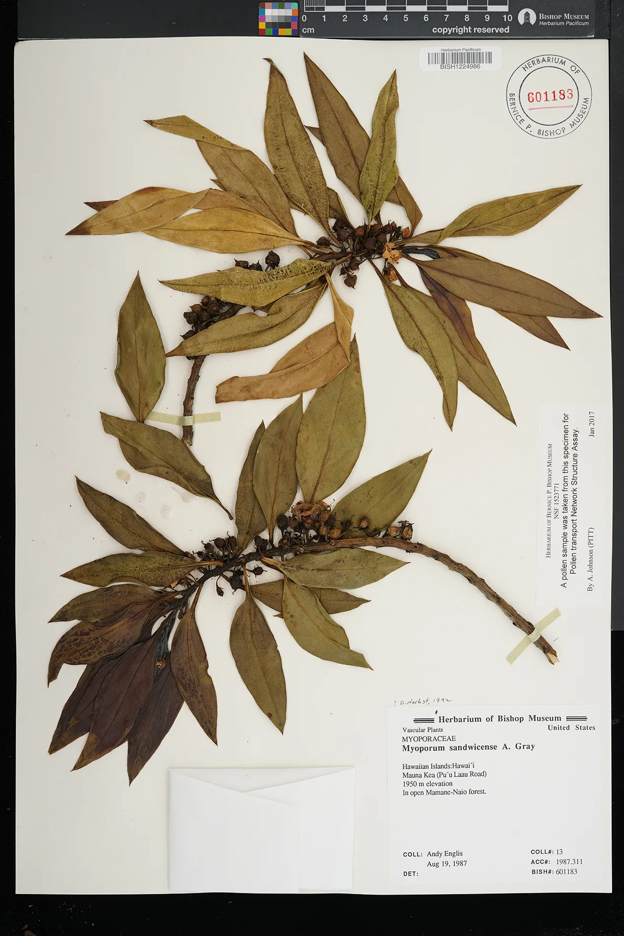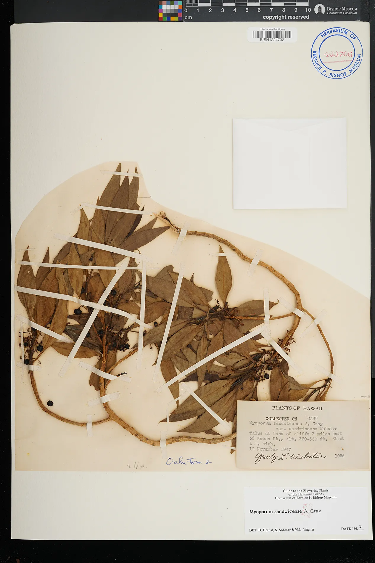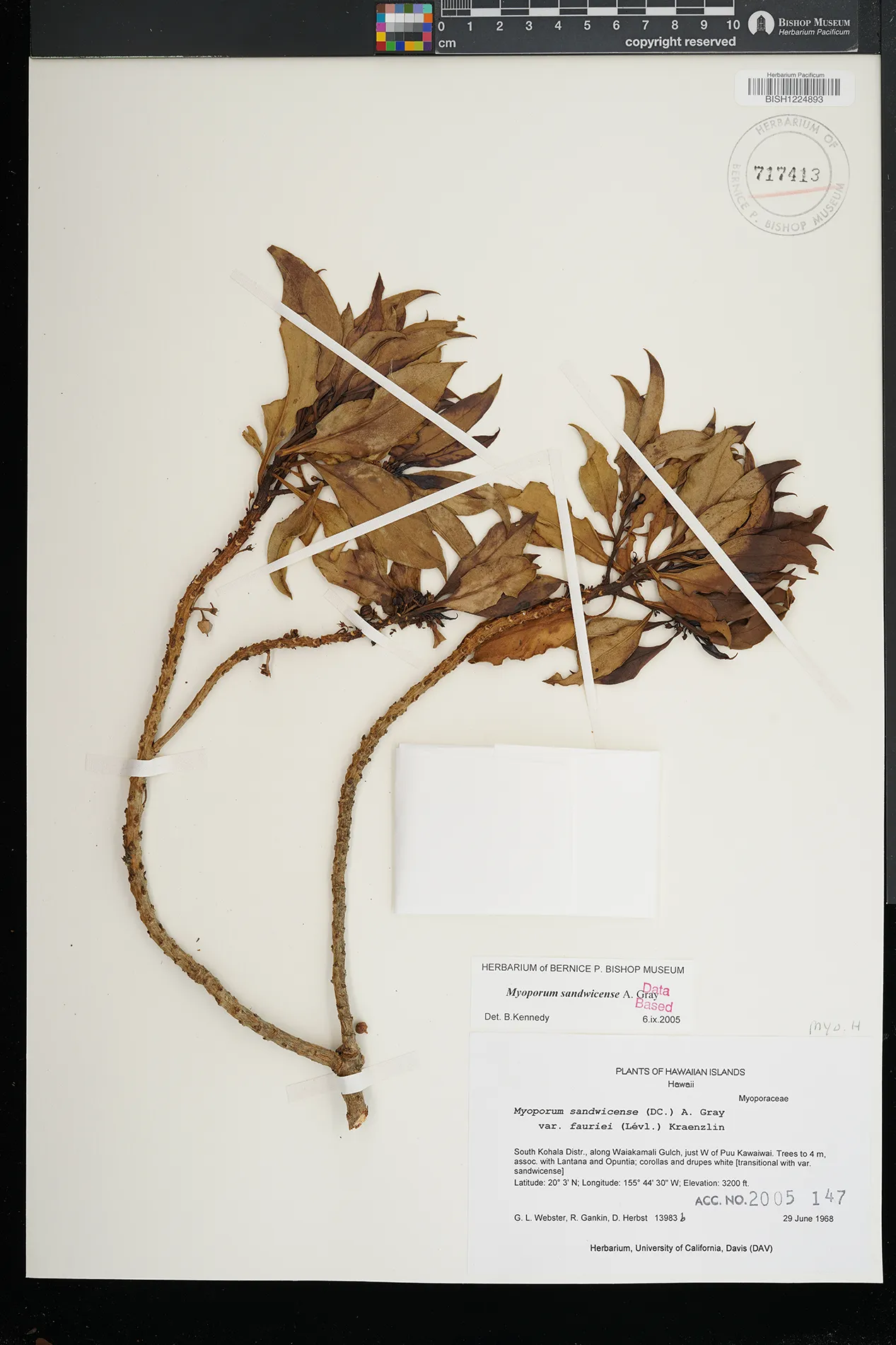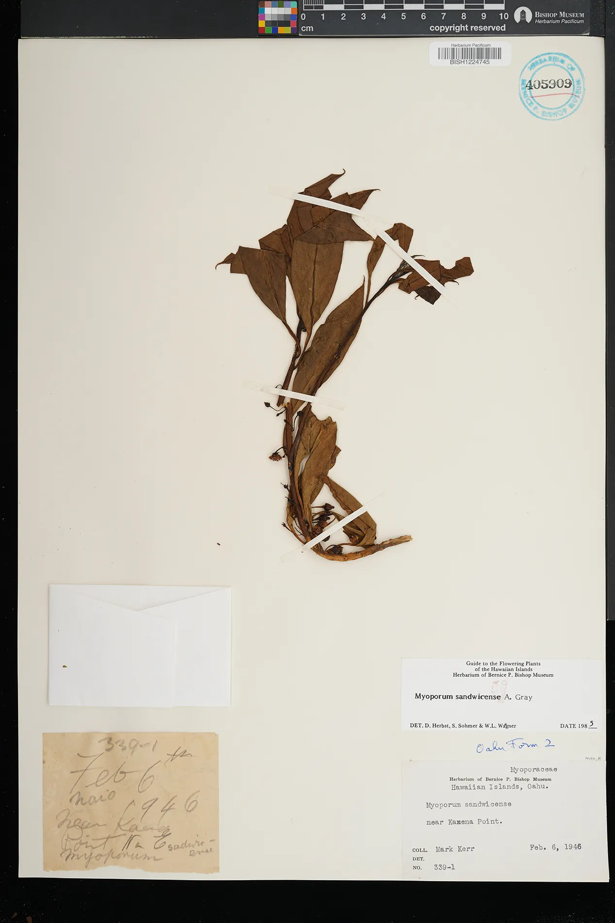 Wood has odor similar to sandalwood (Degener 1930:267). Used for house posts (Degener 1930:268; Krauss 1993:56). Burns well and long, used for torches (Lamb 1981:127). Wood used for fish net gauge (haha ka ‘upena) (Krauss 1993:35). In the Ethnology Collection at Bishop Museum there is a post-contact example of the wood made into a bowl.