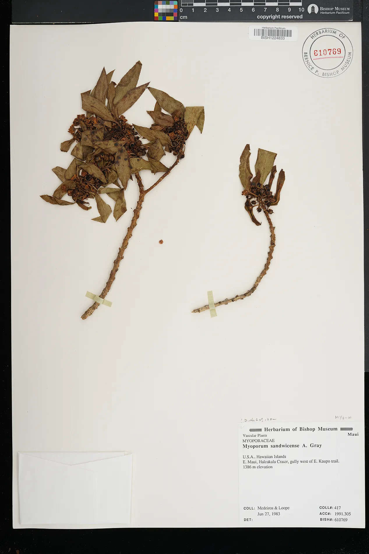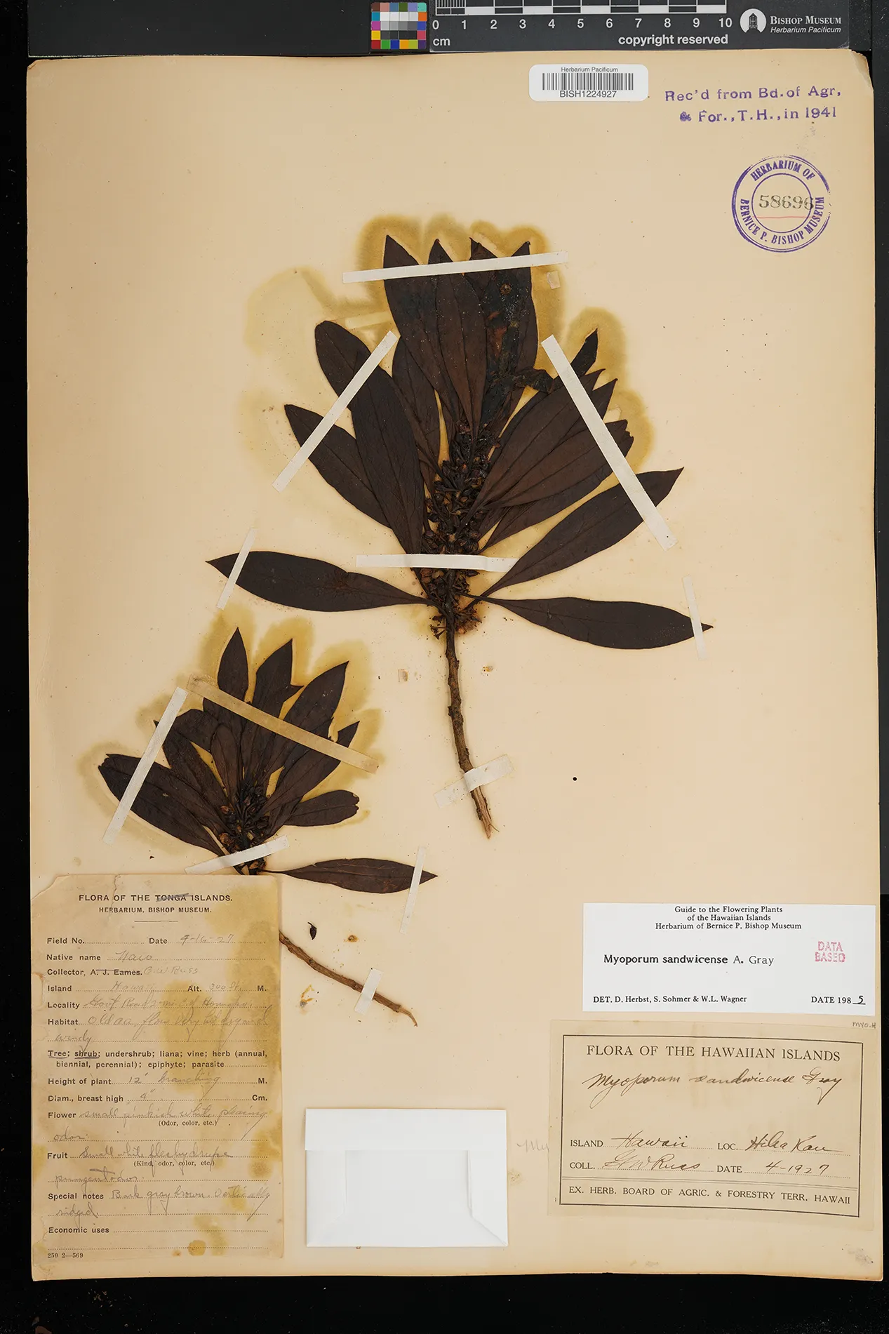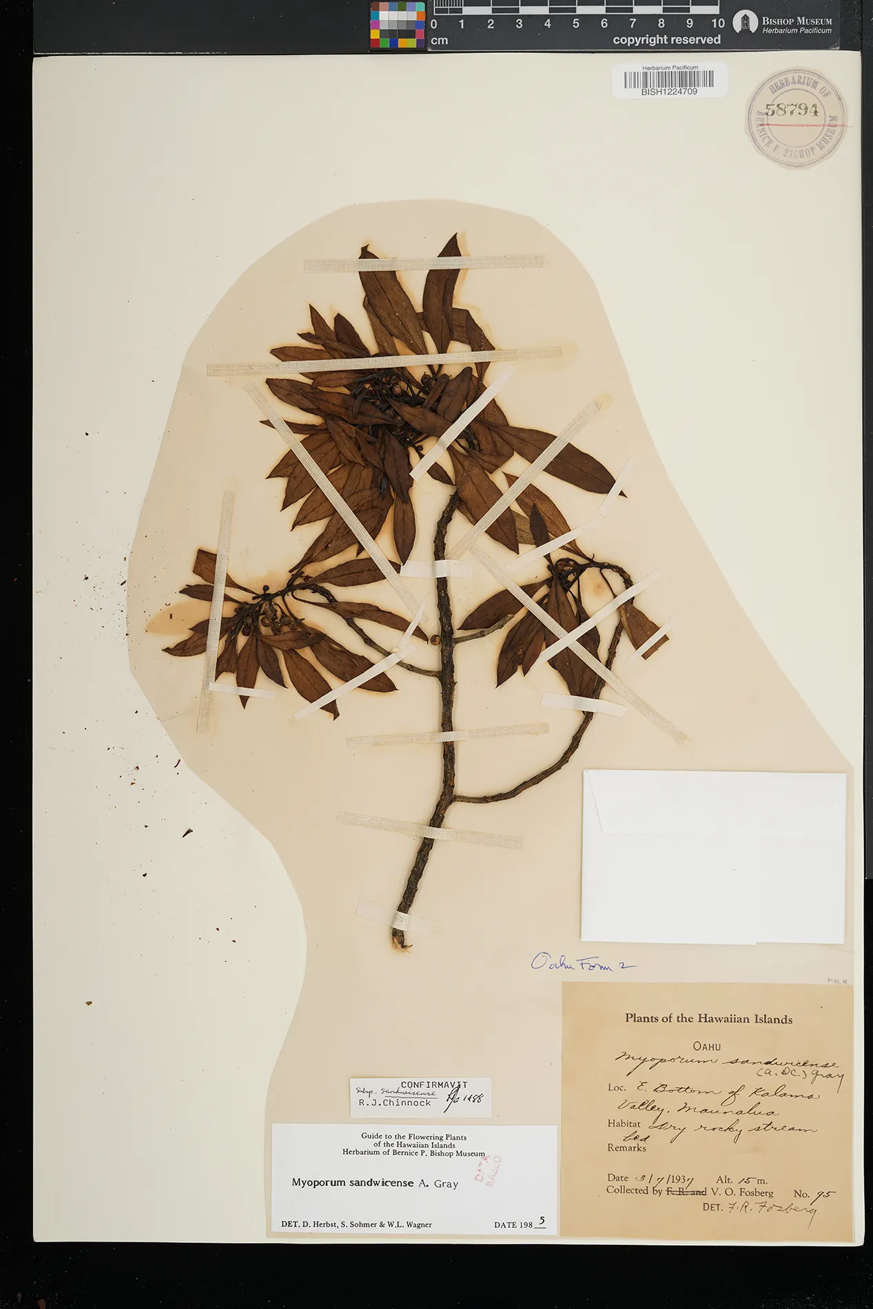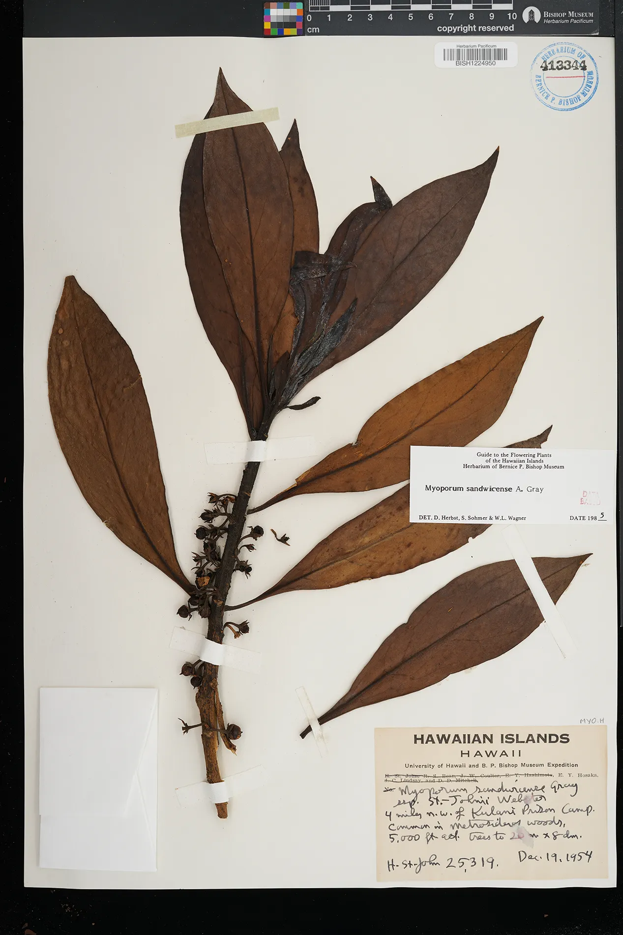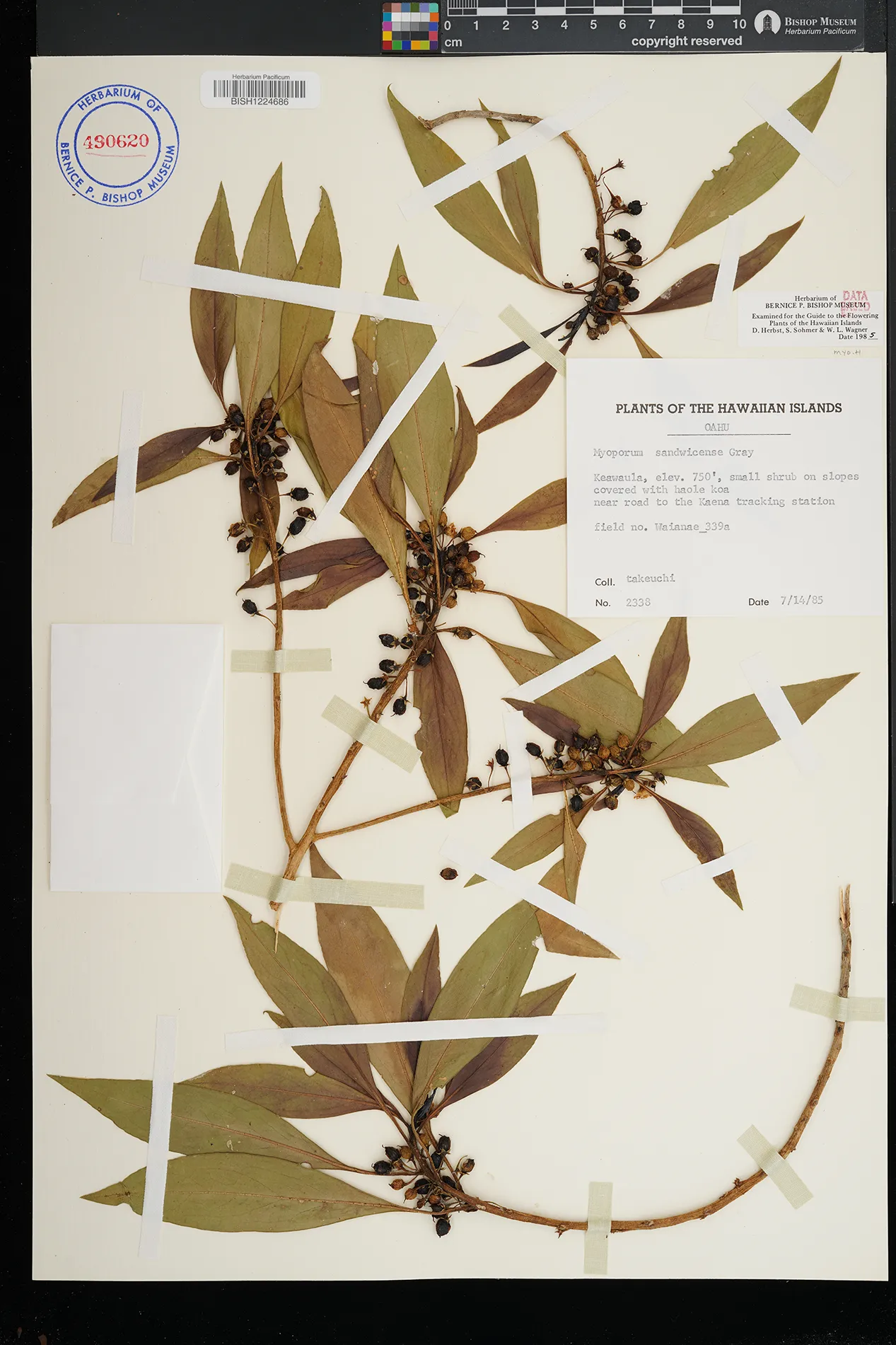Wood has odor similar to sandalwood (Degener 1930:267). Used for house posts (Degener 1930:268; Krauss 1993:56). Burns well and long, used for torches (Lamb 1981:127). Wood used for fish net gauge (haha ka ‘upena) (Krauss 1993:35). In the Ethnology Collection at Bishop Museum there is a post-contact example of the wood made into a bowl.