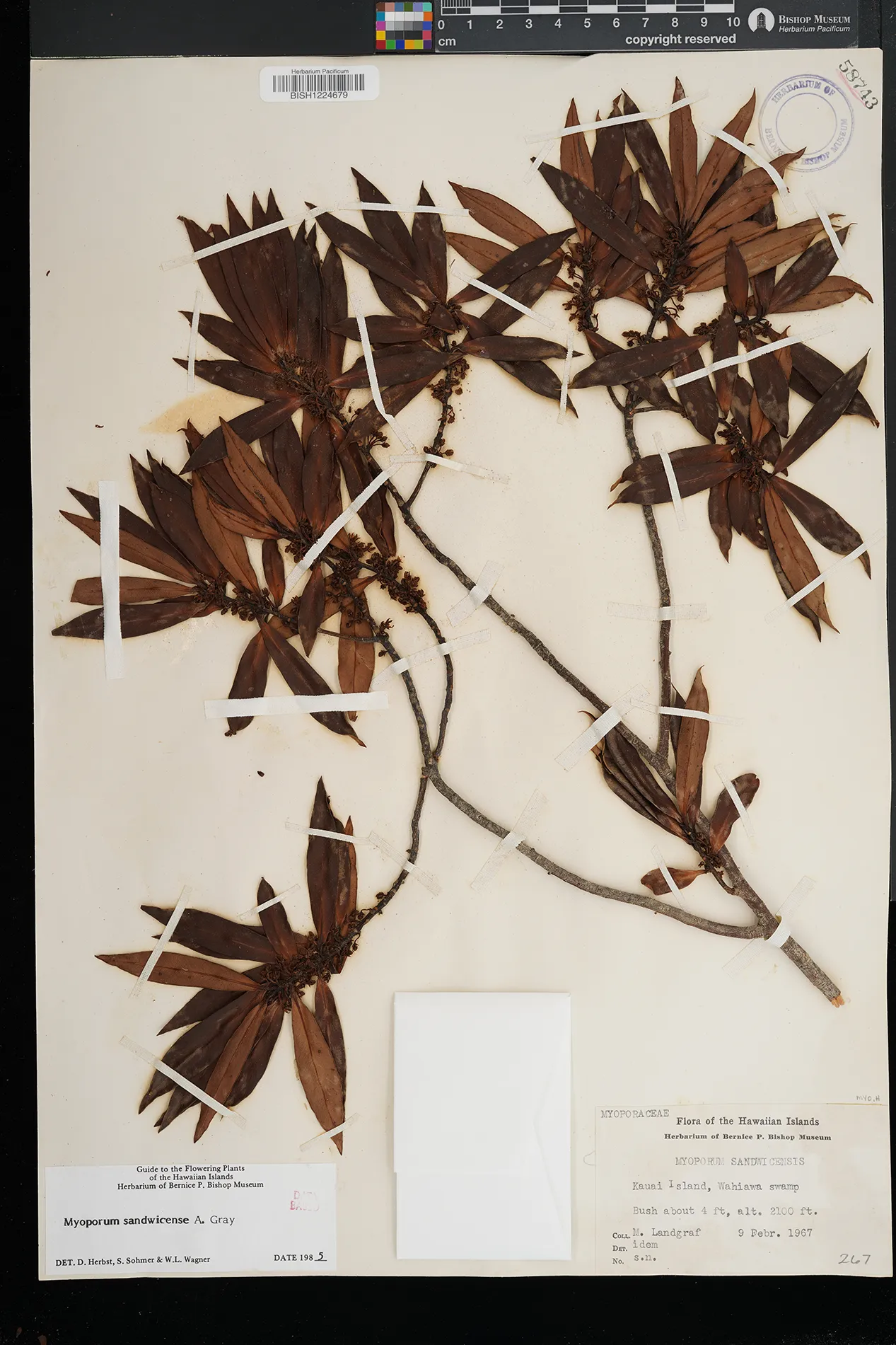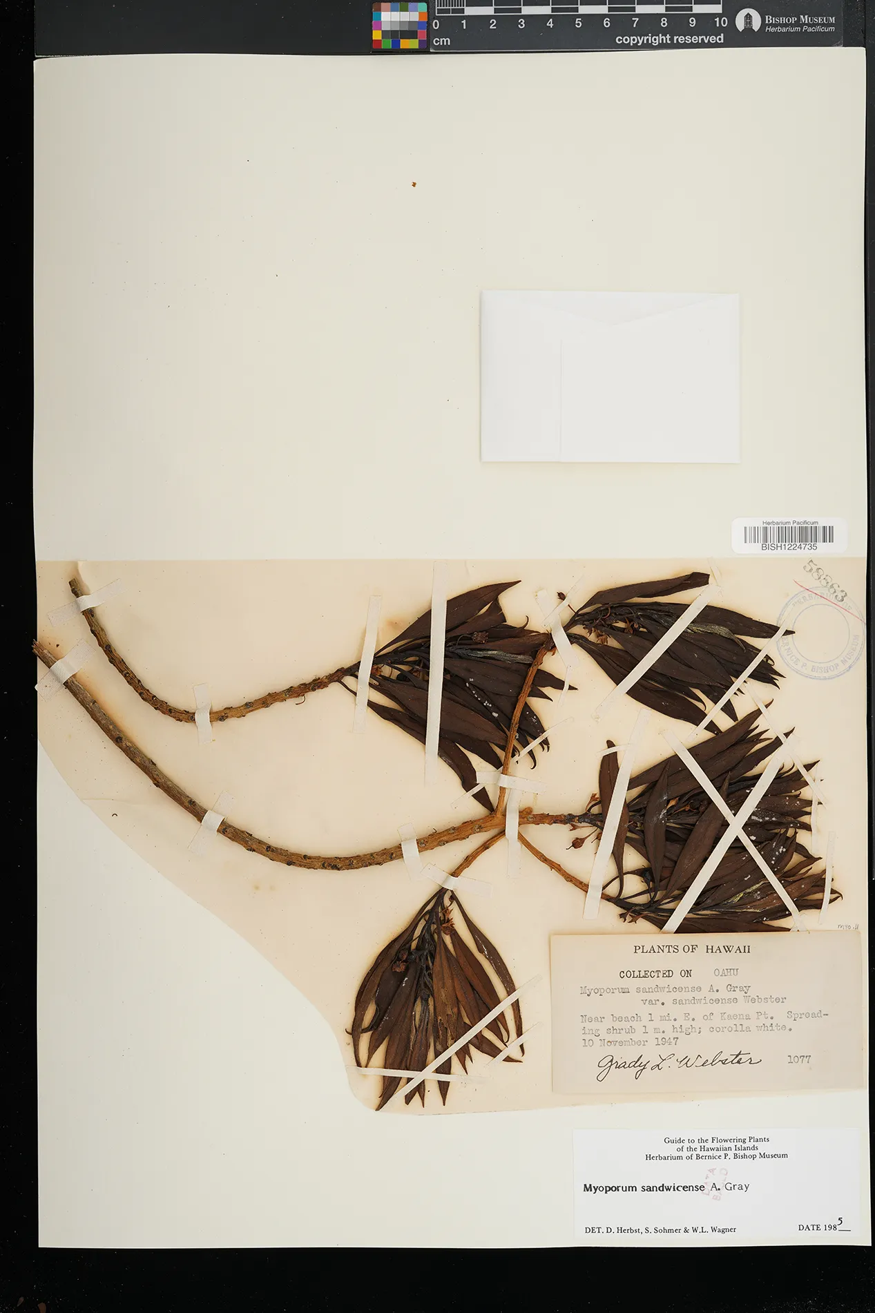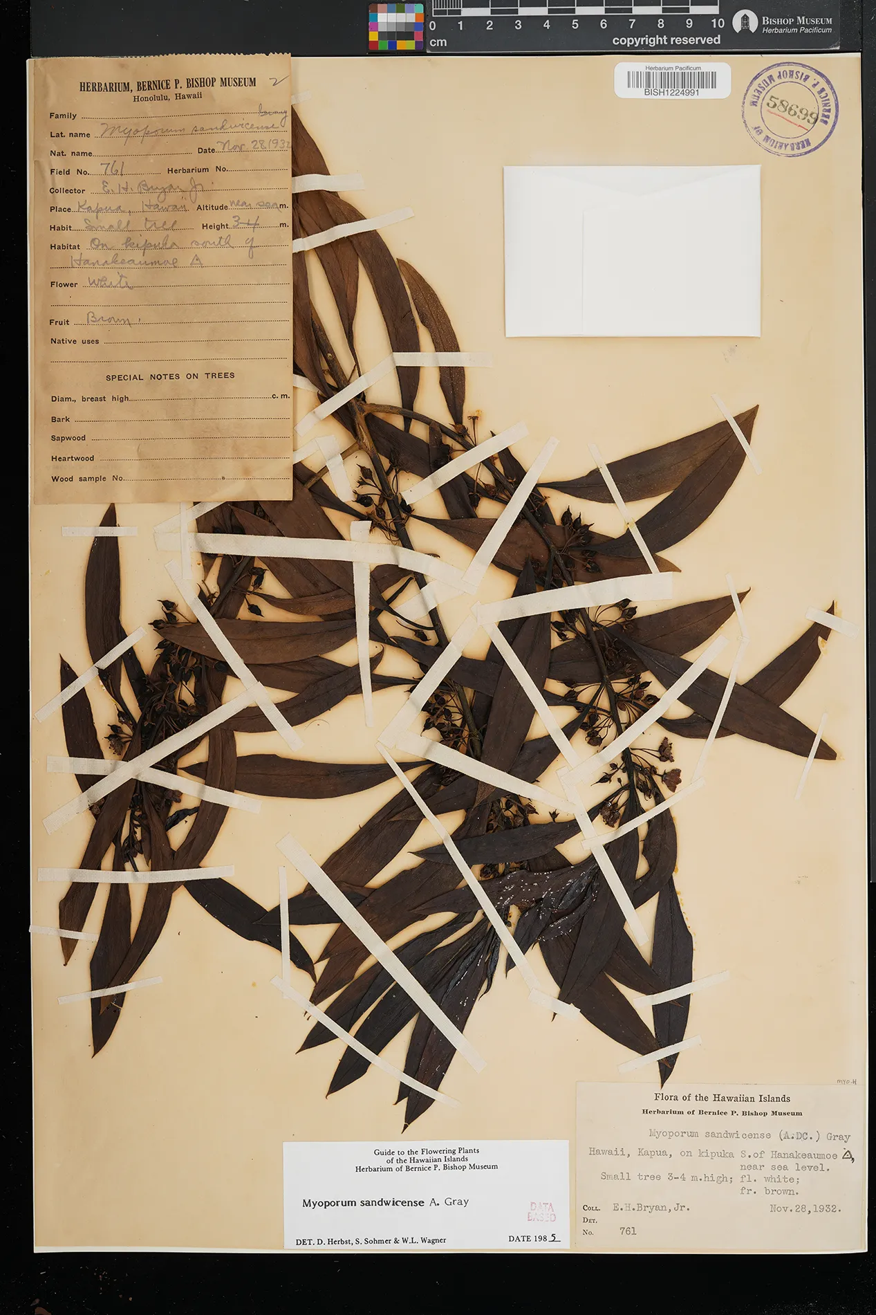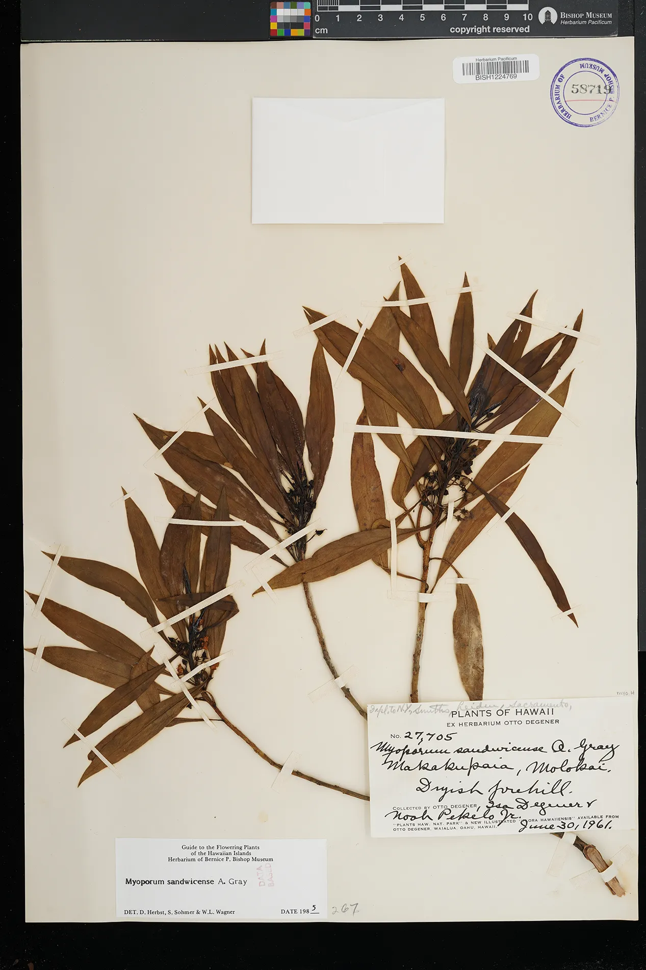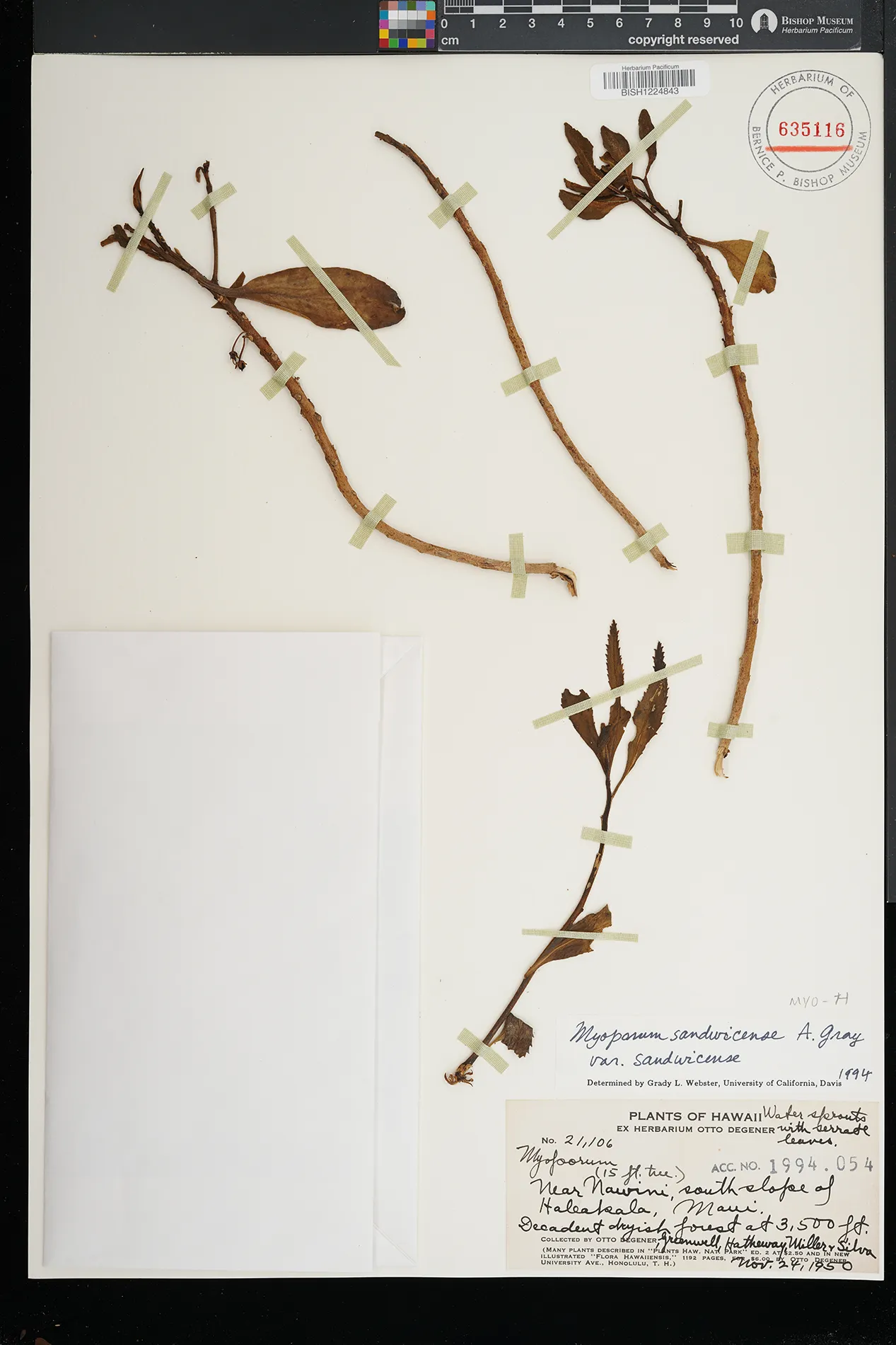 Wood has odor similar to sandalwood (Degener 1930:267). Used for house posts (Degener 1930:268; Krauss 1993:56). Burns well and long, used for torches (Lamb 1981:127). Wood used for fish net gauge (haha ka ‘upena) (Krauss 1993:35). In the Ethnology Collection at Bishop Museum there is a post-contact example of the wood made into a bowl.