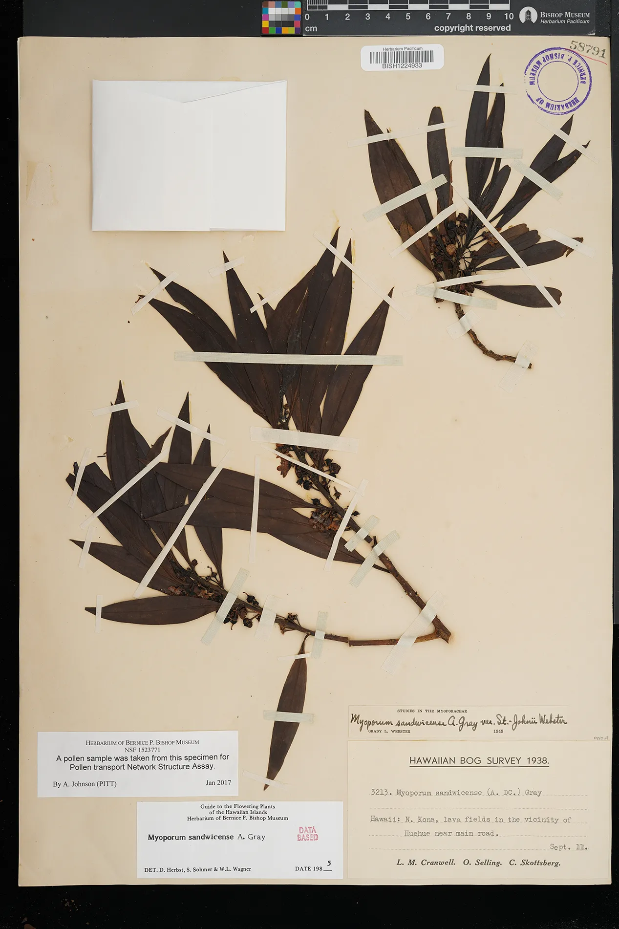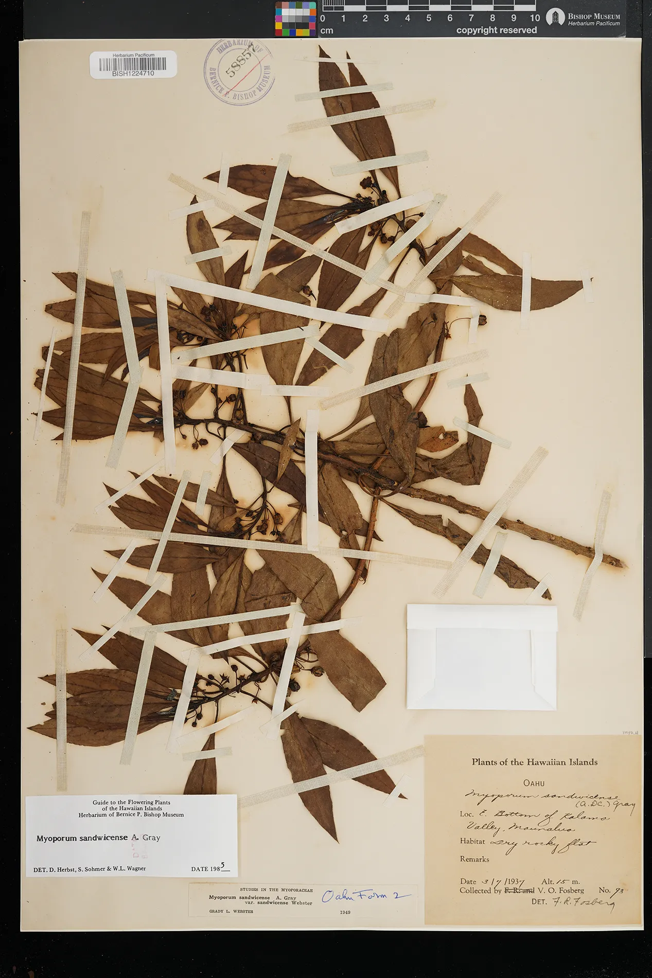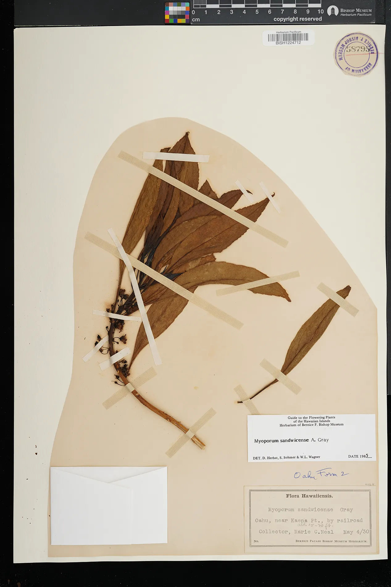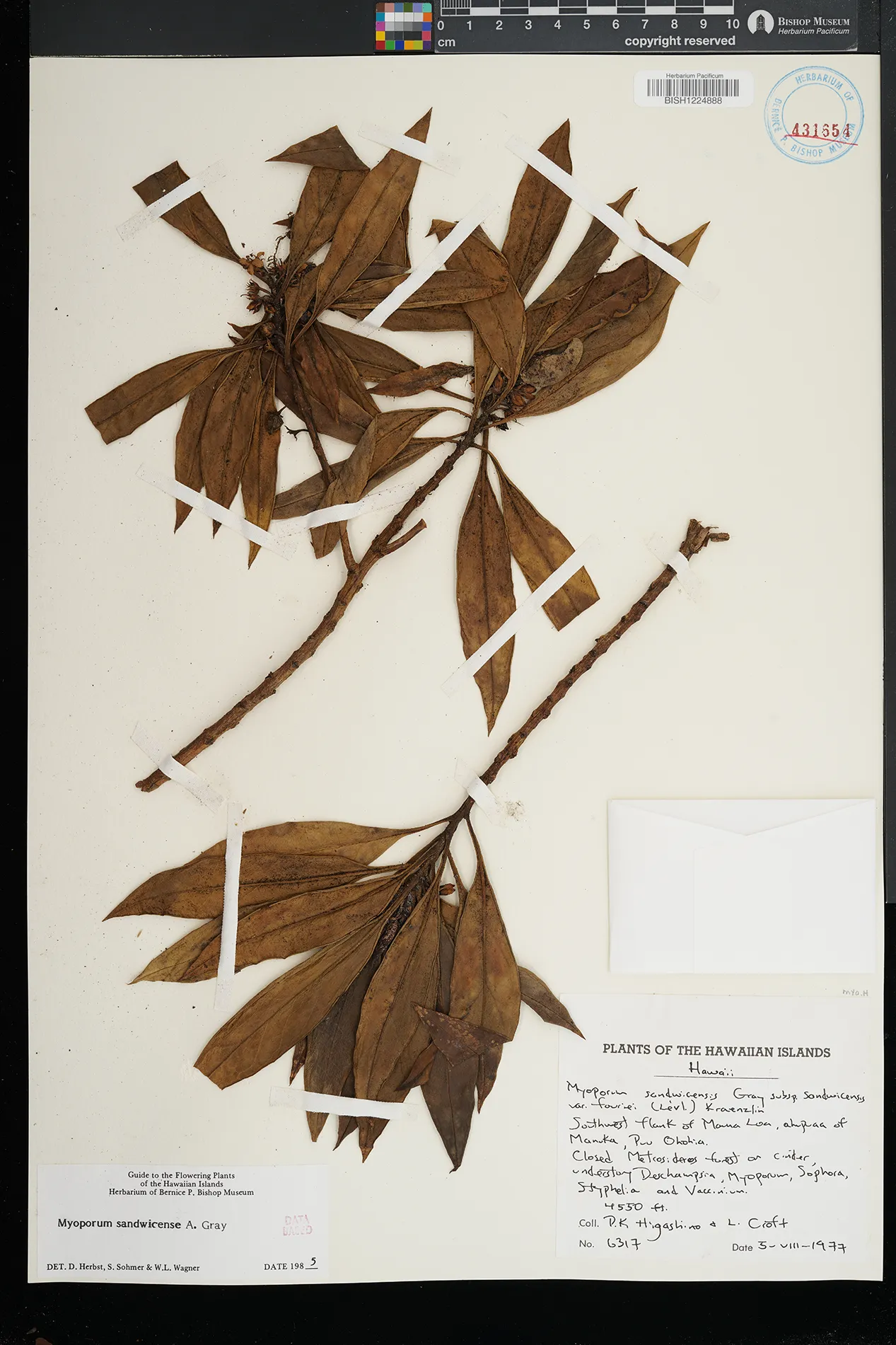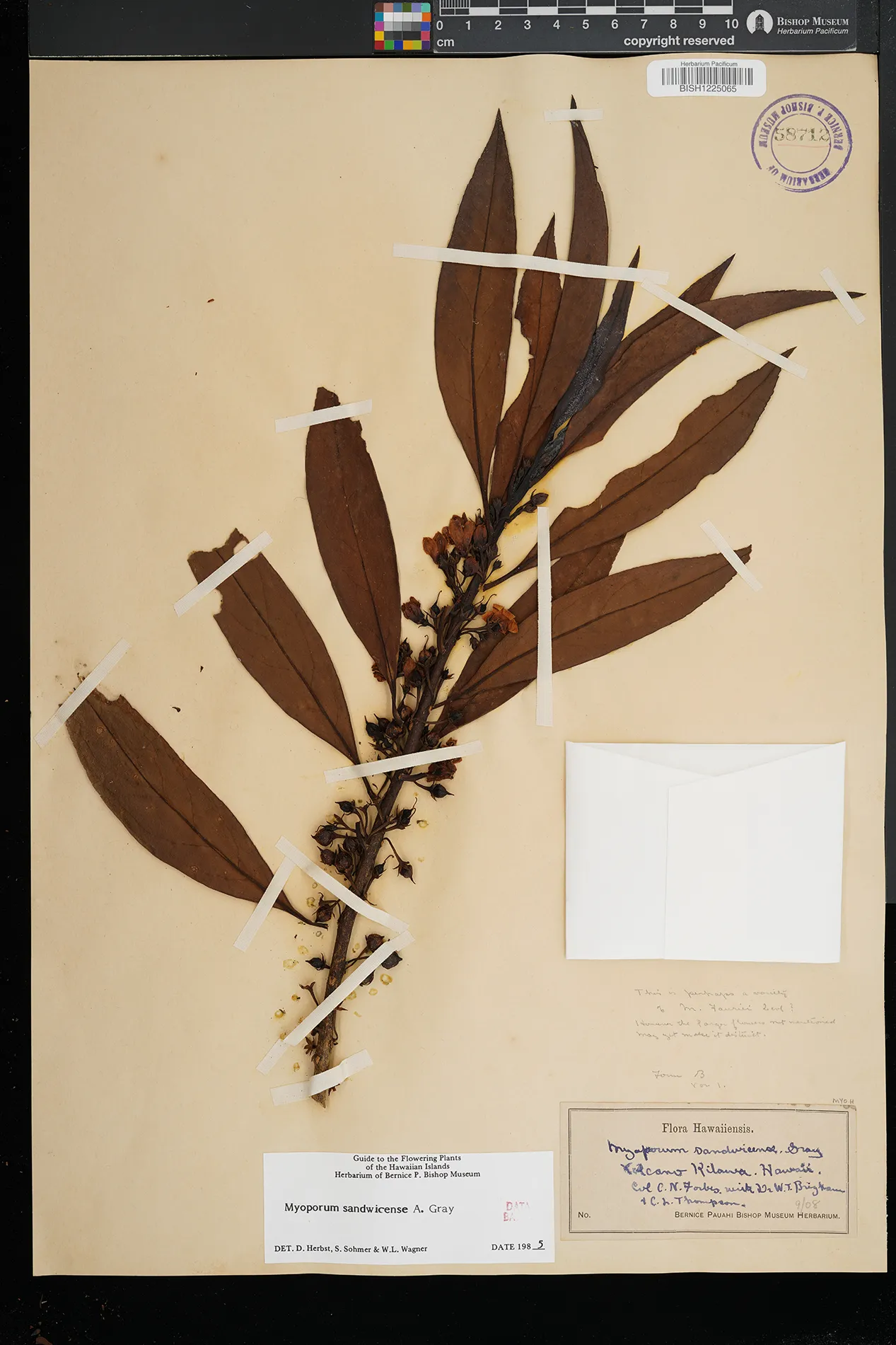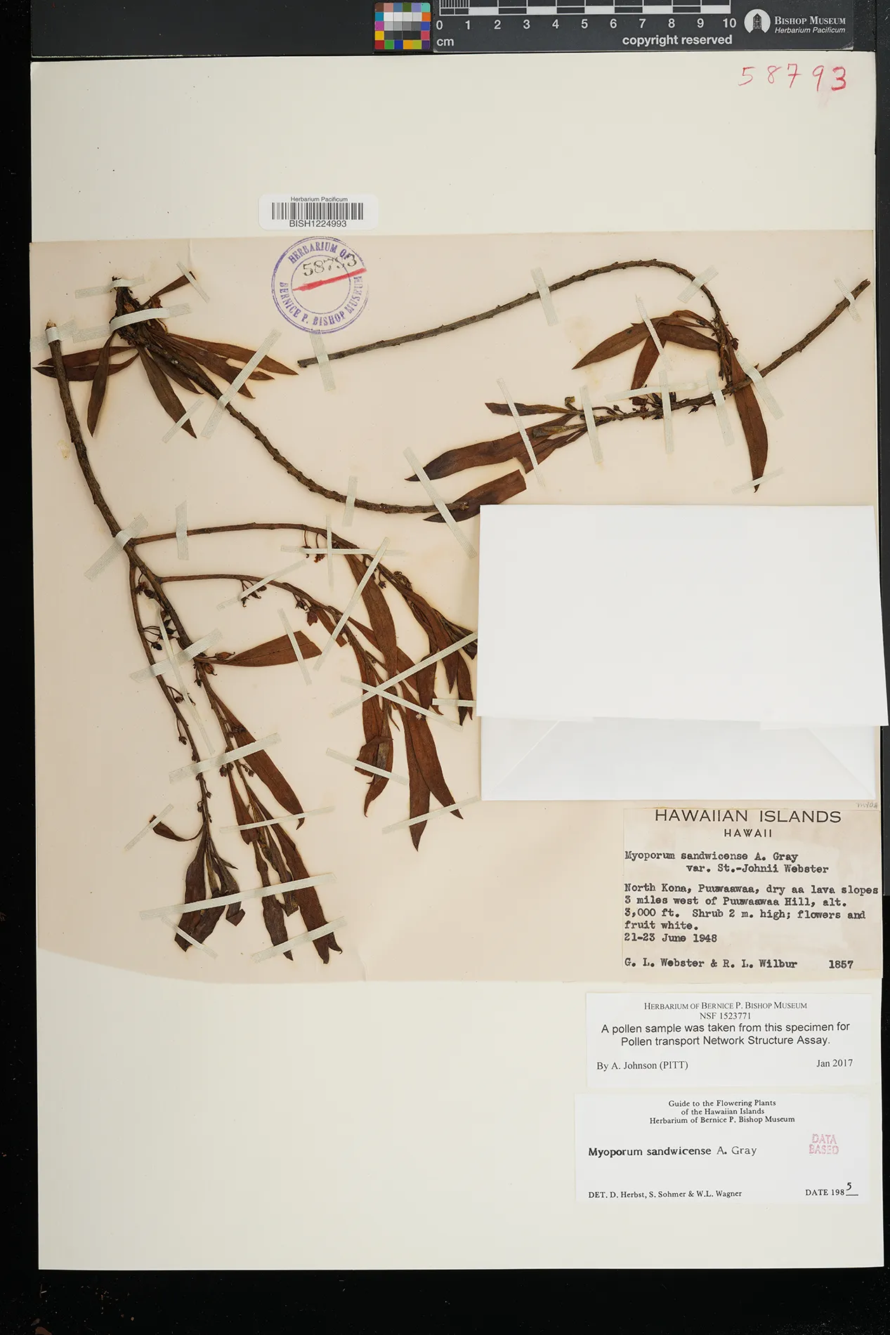 Wood has odor similar to sandalwood (Degener 1930:267). Used for house posts (Degener 1930:268; Krauss 1993:56). Burns well and long, used for torches (Lamb 1981:127). Wood used for fish net gauge (haha ka ‘upena) (Krauss 1993:35). In the Ethnology Collection at Bishop Museum there is a post-contact example of the wood made into a bowl.