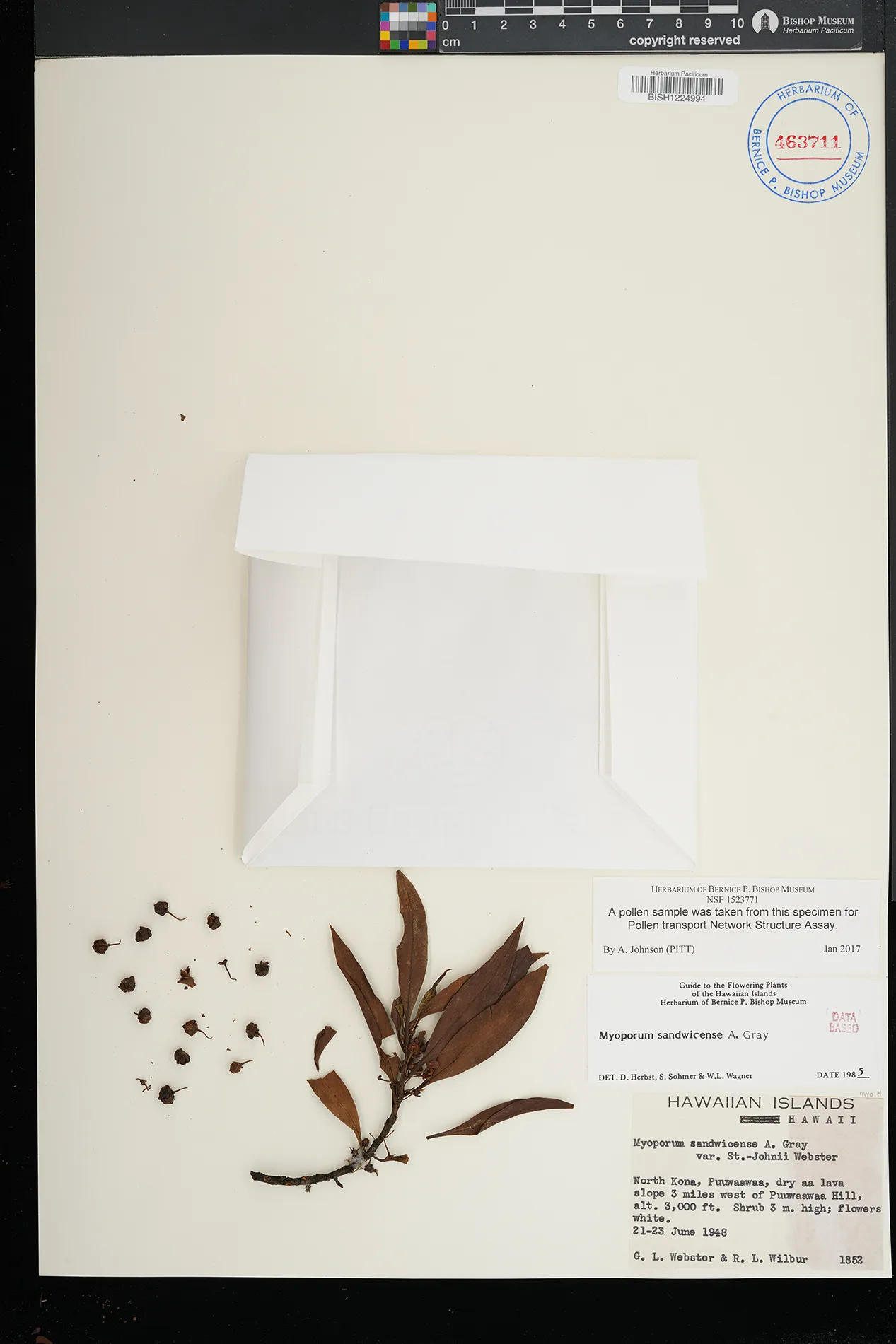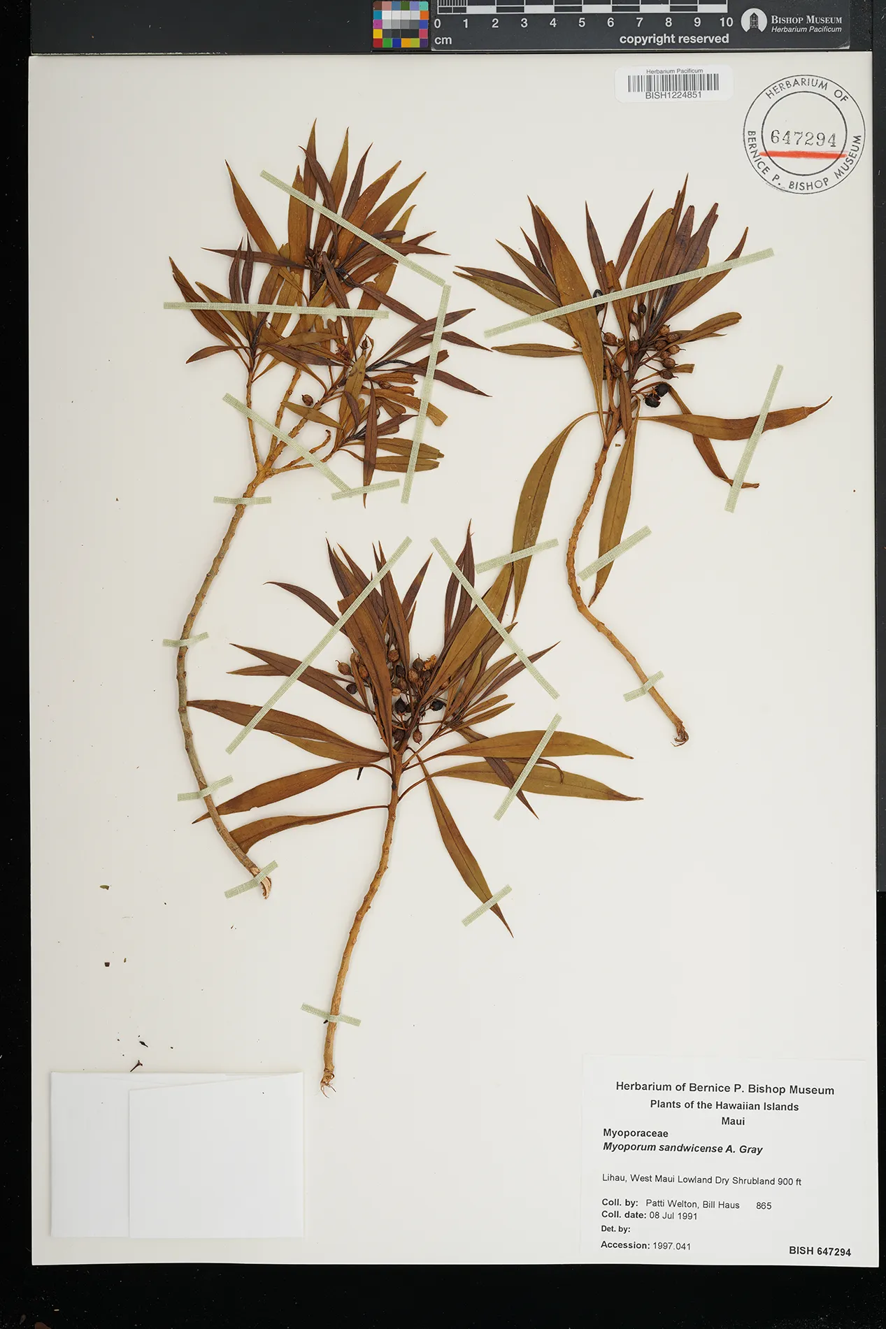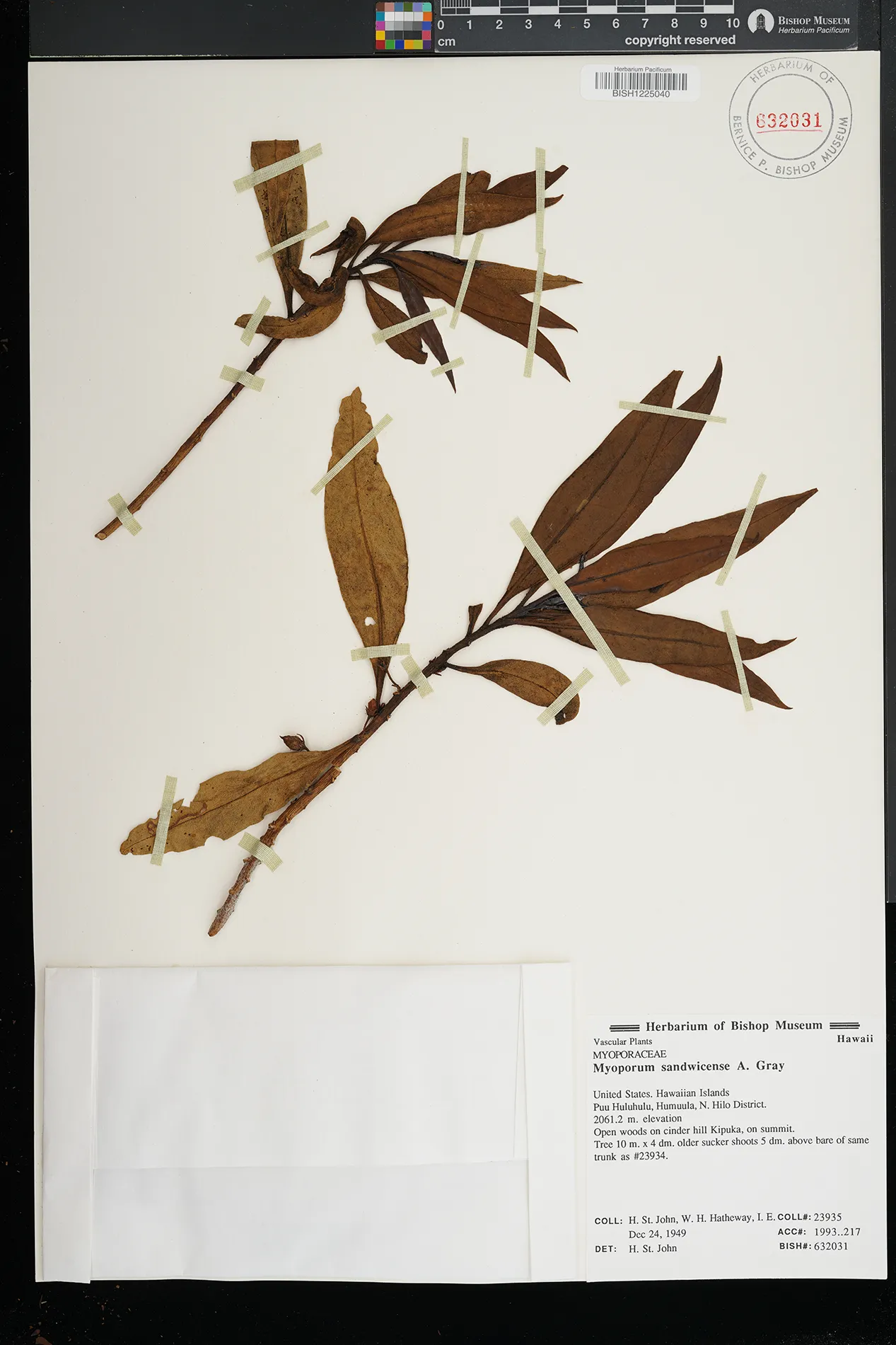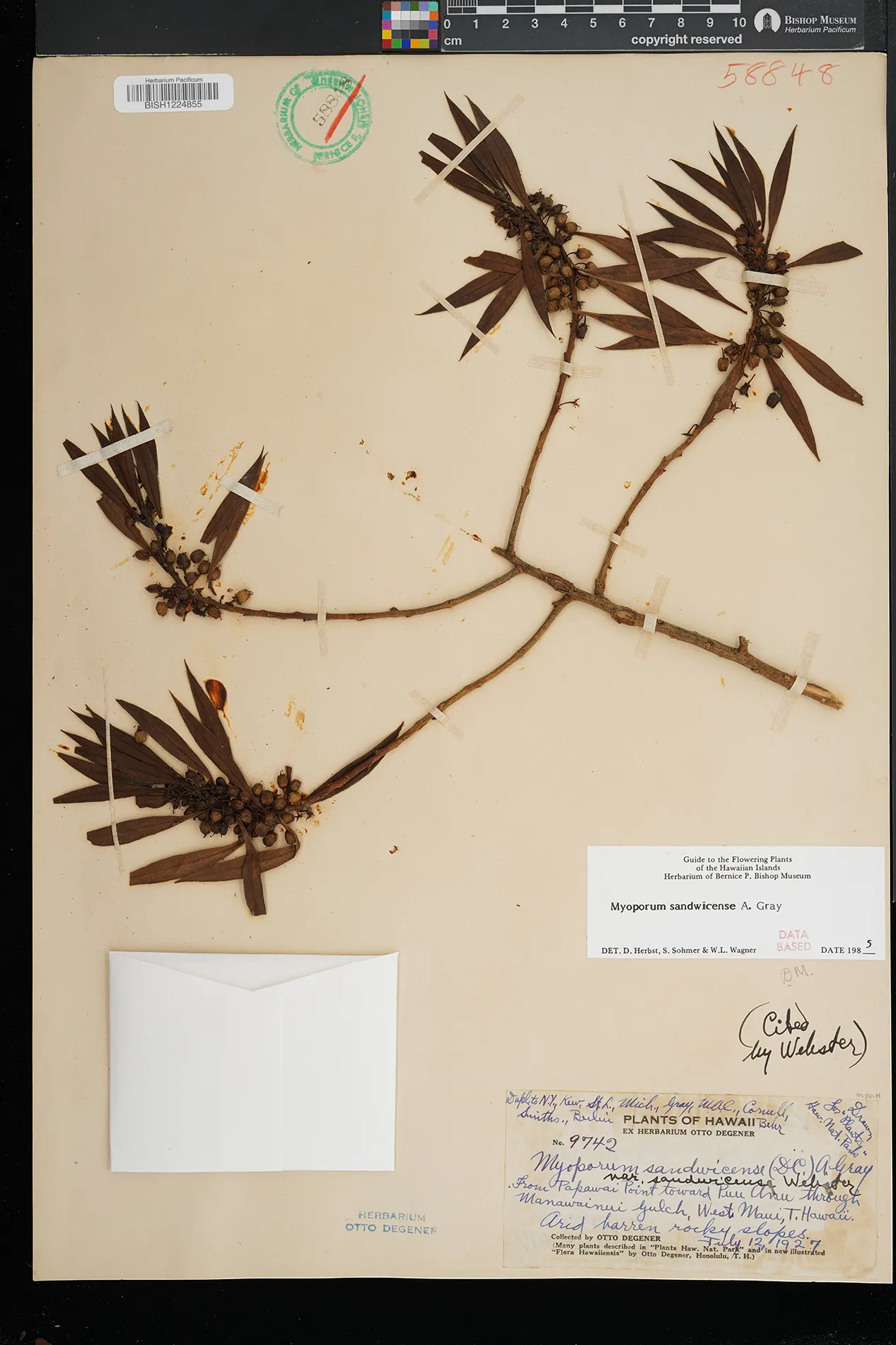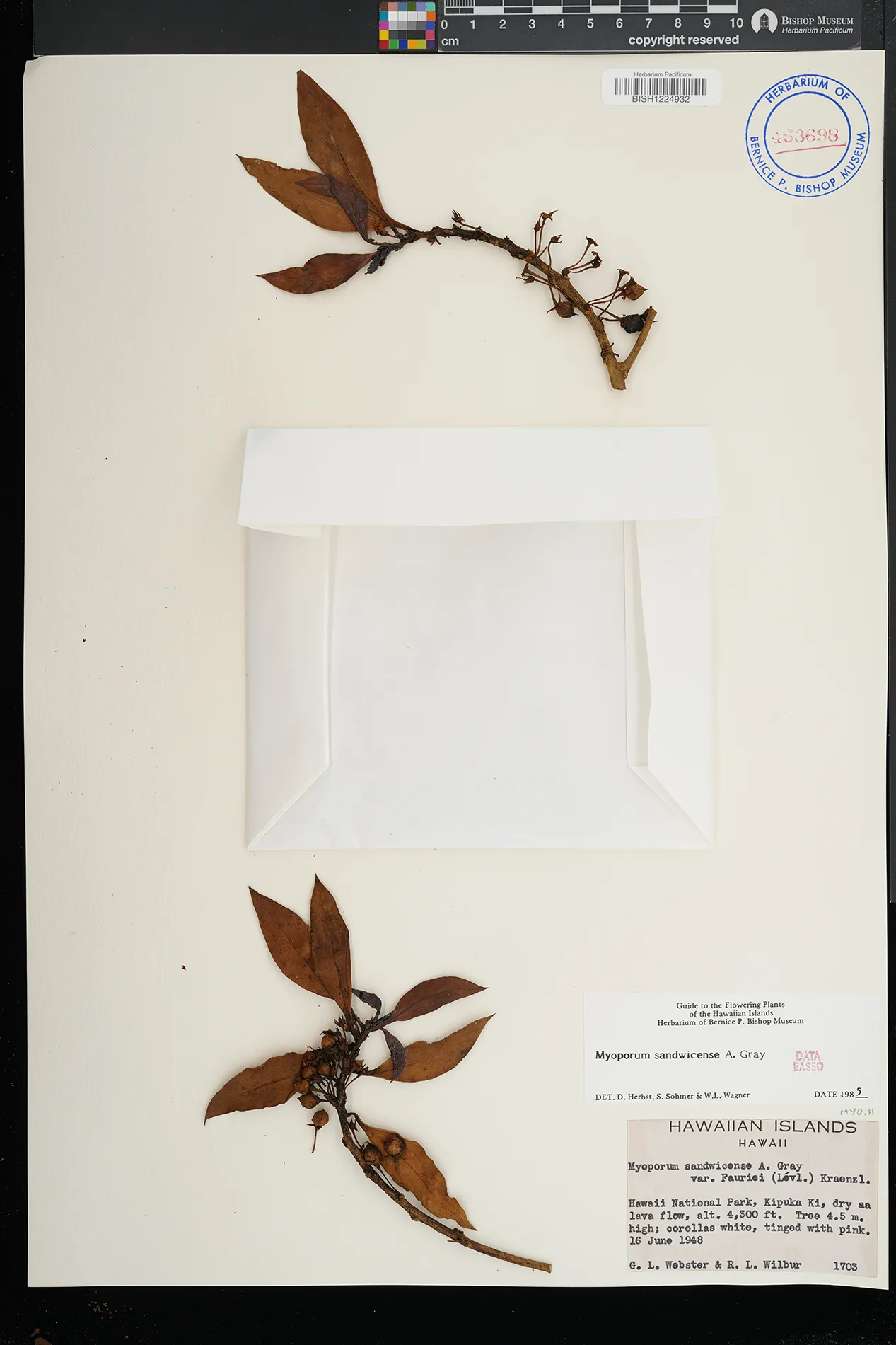 Wood has odor similar to sandalwood (Degener 1930:267). Used for house posts (Degener 1930:268; Krauss 1993:56). Burns well and long, used for torches (Lamb 1981:127). Wood used for fish net gauge (haha ka ‘upena) (Krauss 1993:35). In the Ethnology Collection at Bishop Museum there is a post-contact example of the wood made into a bowl.