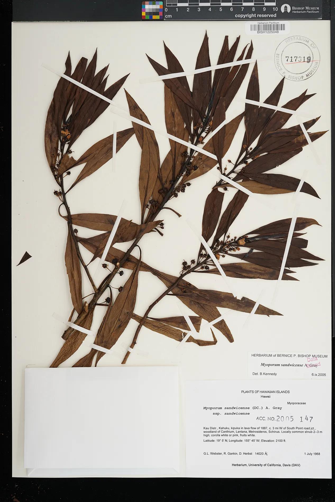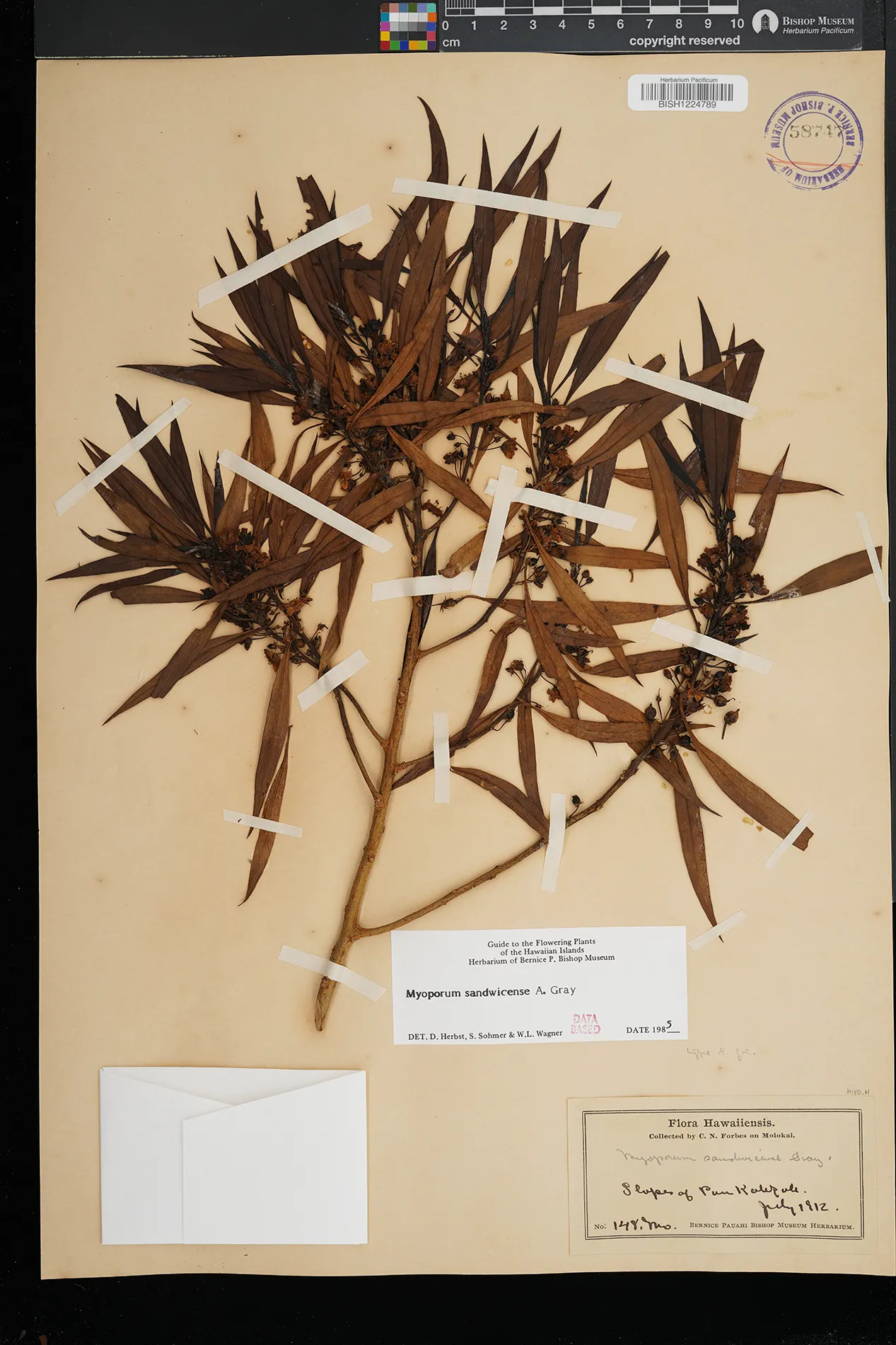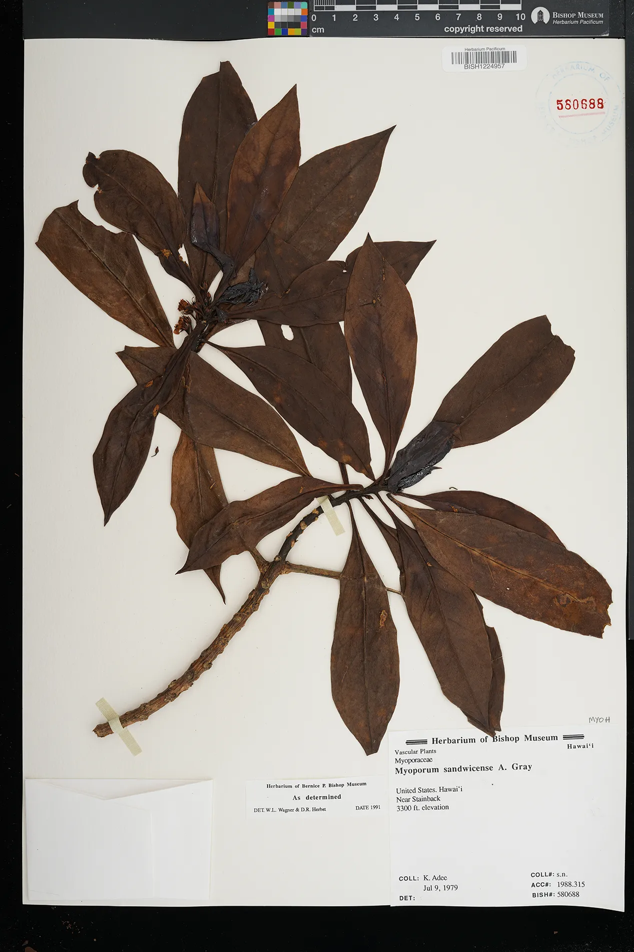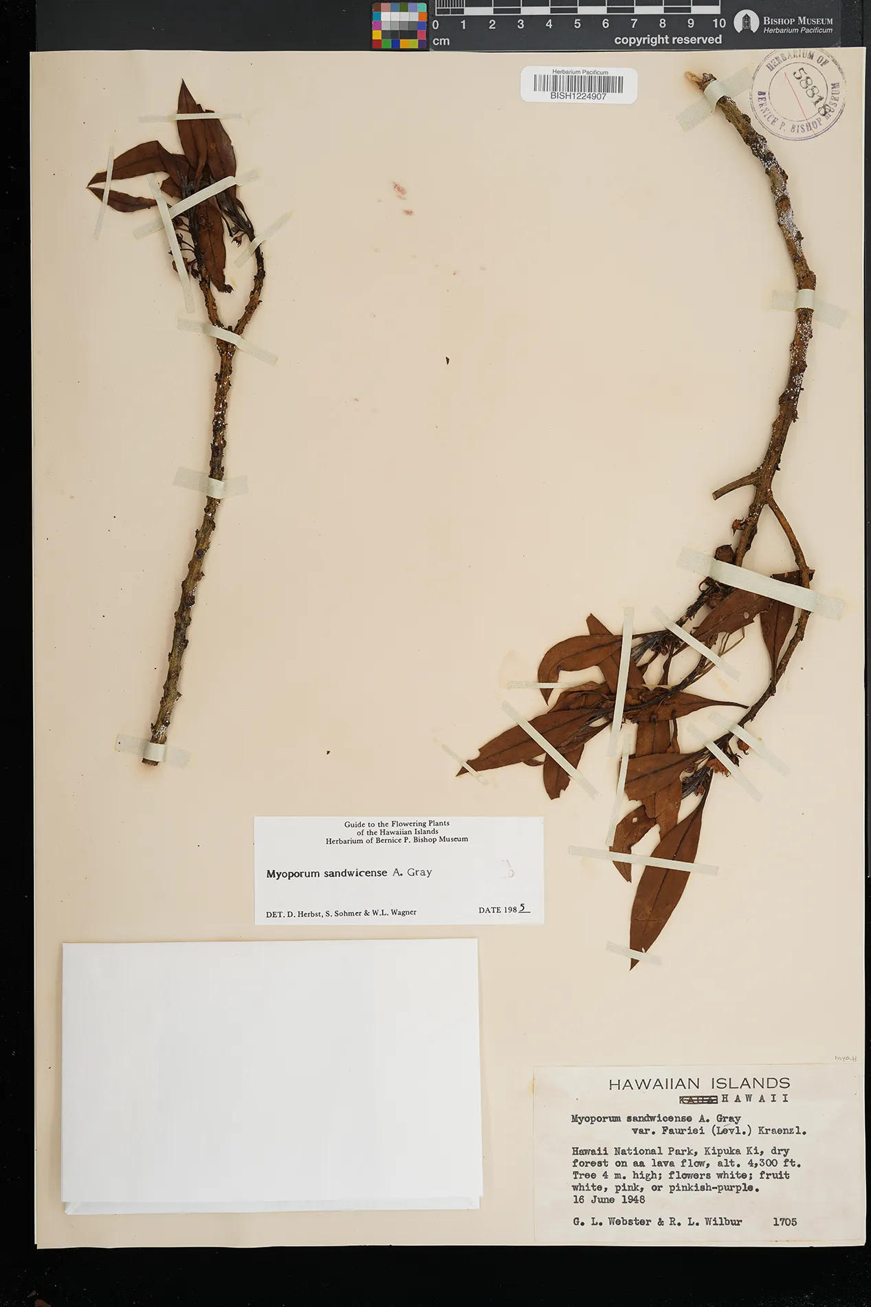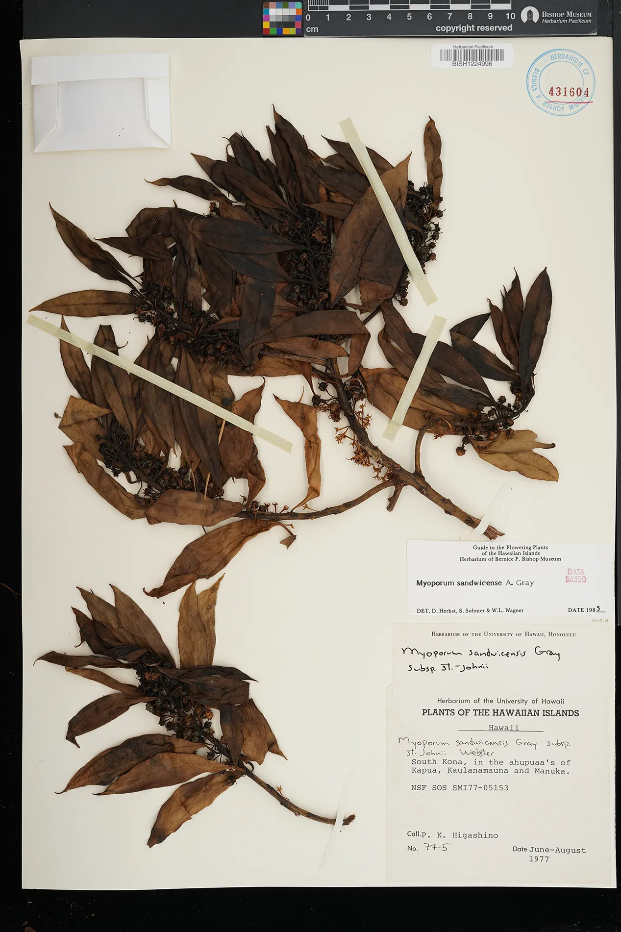 Wood has odor similar to sandalwood (Degener 1930:267). Used for house posts (Degener 1930:268; Krauss 1993:56). Burns well and long, used for torches (Lamb 1981:127). Wood used for fish net gauge (haha ka ‘upena) (Krauss 1993:35). In the Ethnology Collection at Bishop Museum there is a post-contact example of the wood made into a bowl.