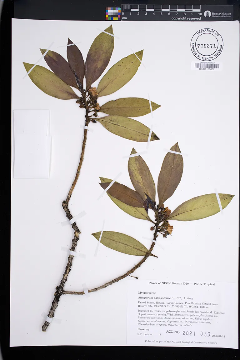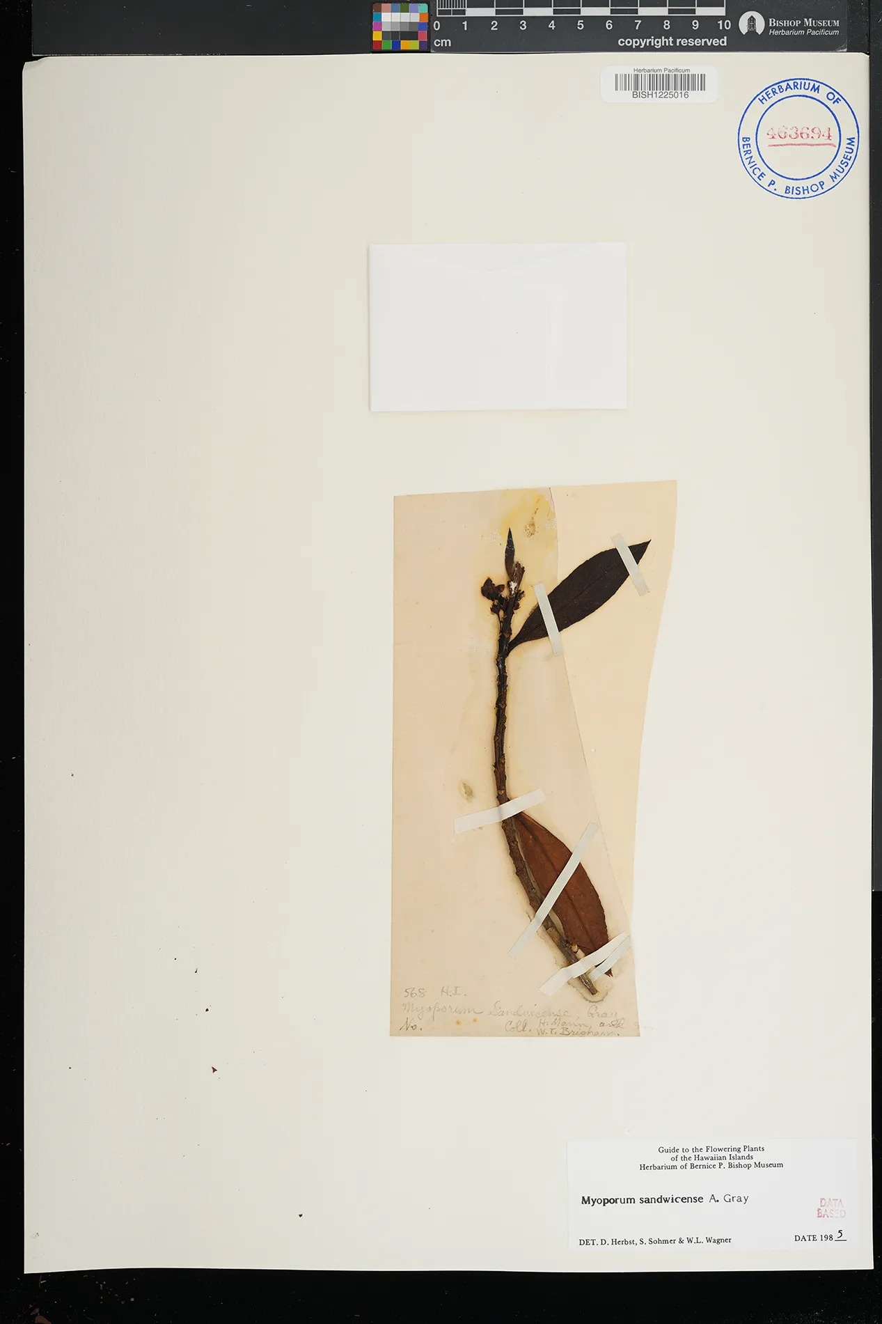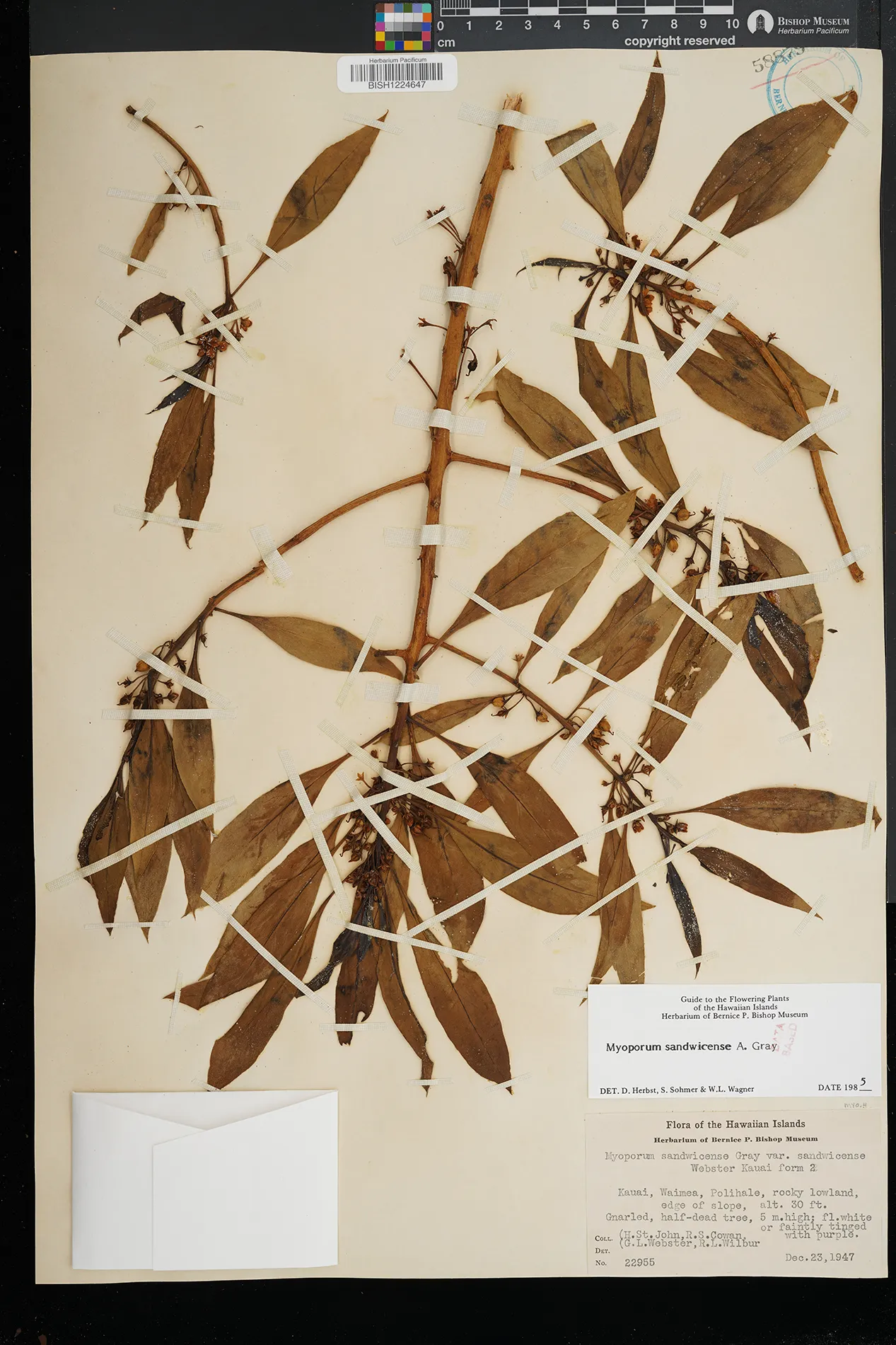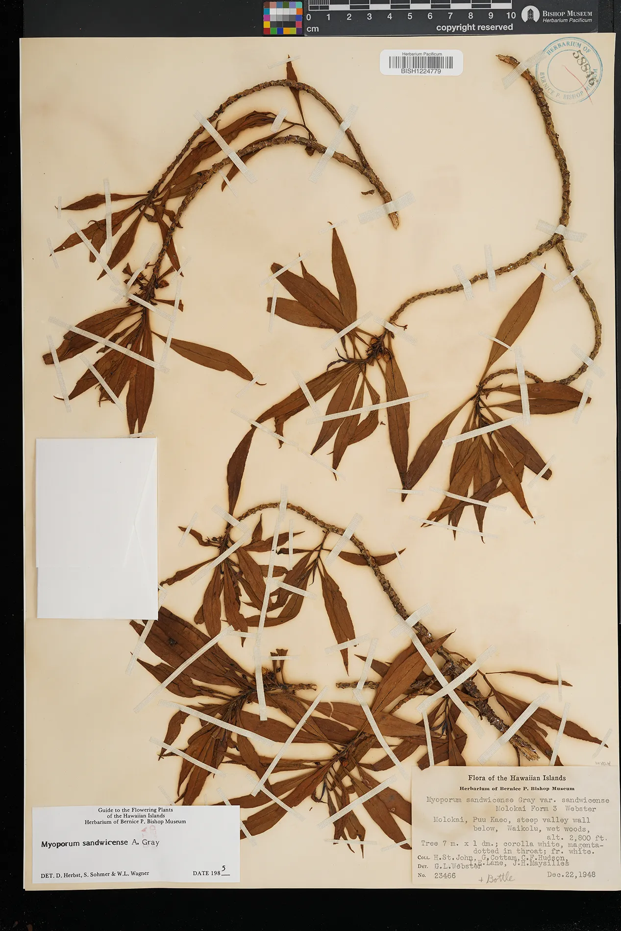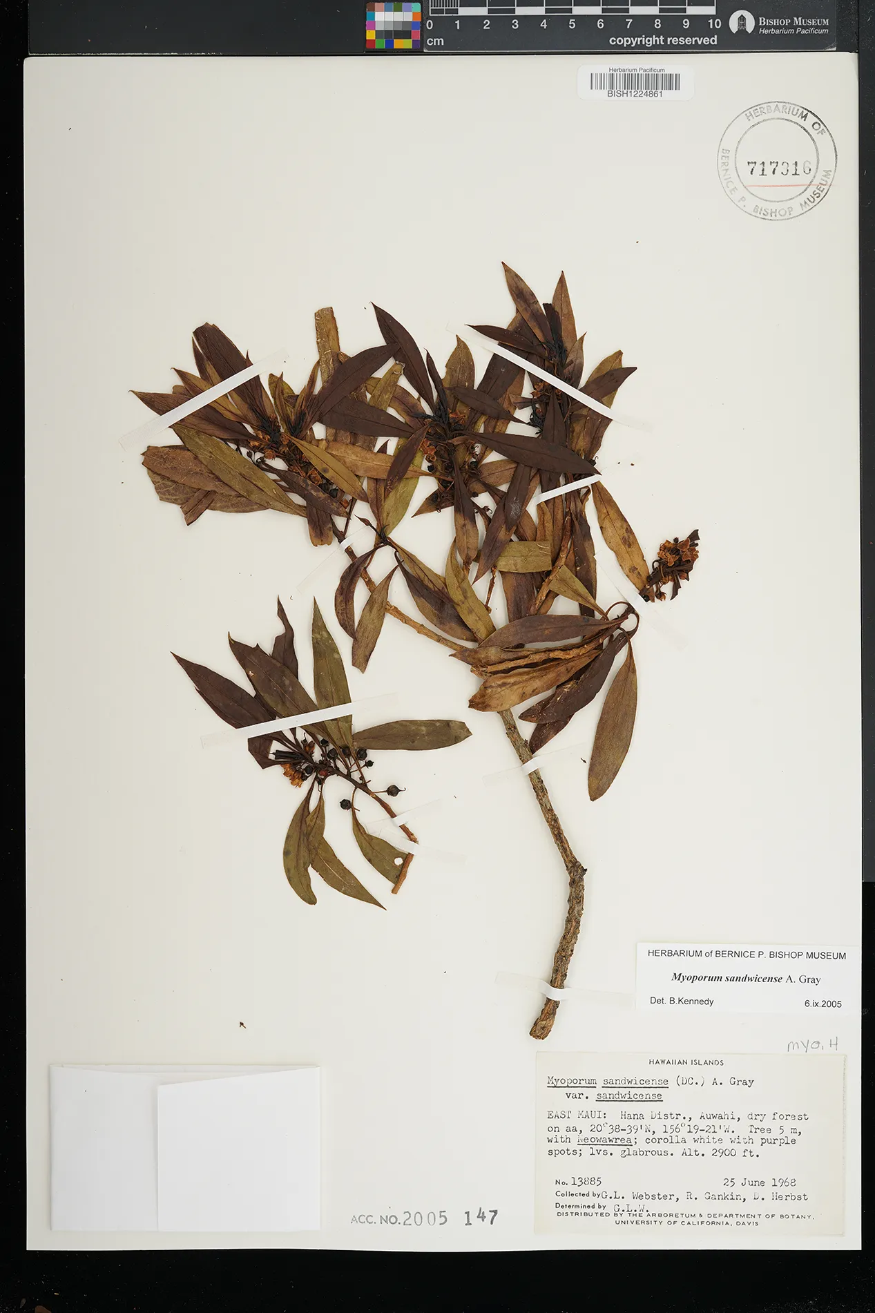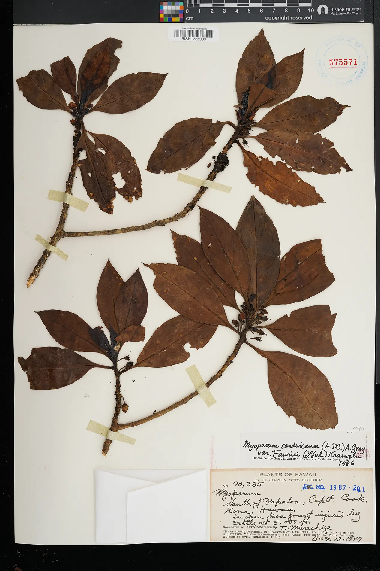 Wood has odor similar to sandalwood (Degener 1930:267). Used for house posts (Degener 1930:268; Krauss 1993:56). Burns well and long, used for torches (Lamb 1981:127). Wood used for fish net gauge (haha ka ‘upena) (Krauss 1993:35). In the Ethnology Collection at Bishop Museum there is a post-contact example of the wood made into a bowl.