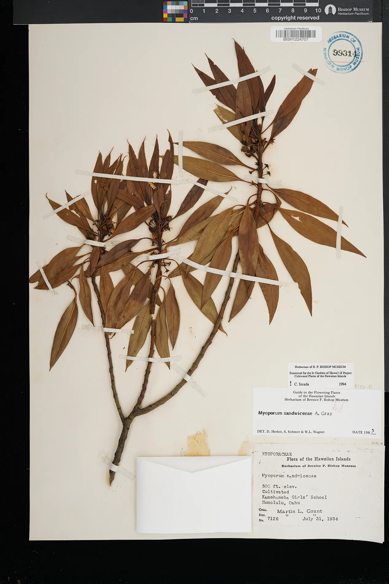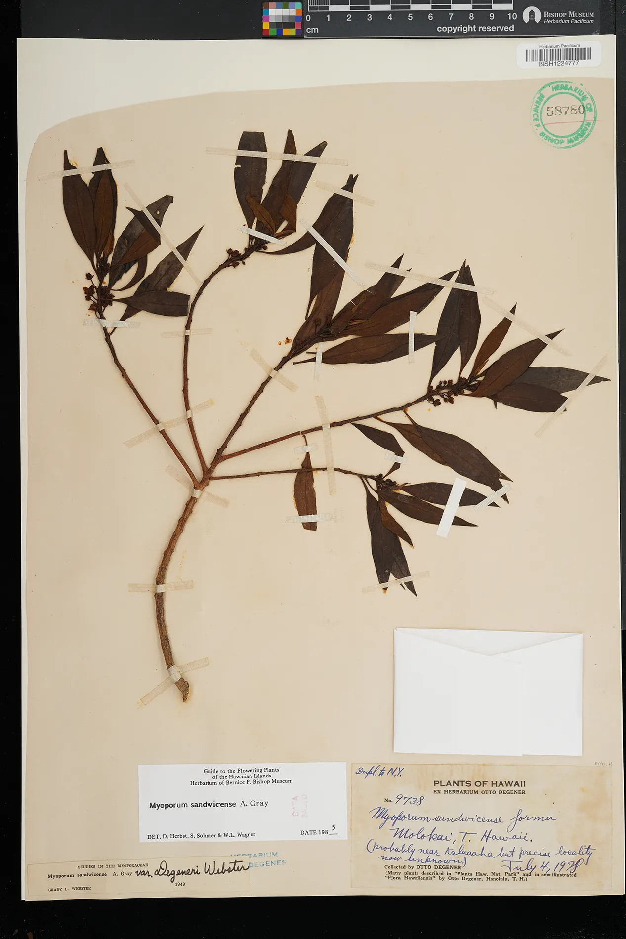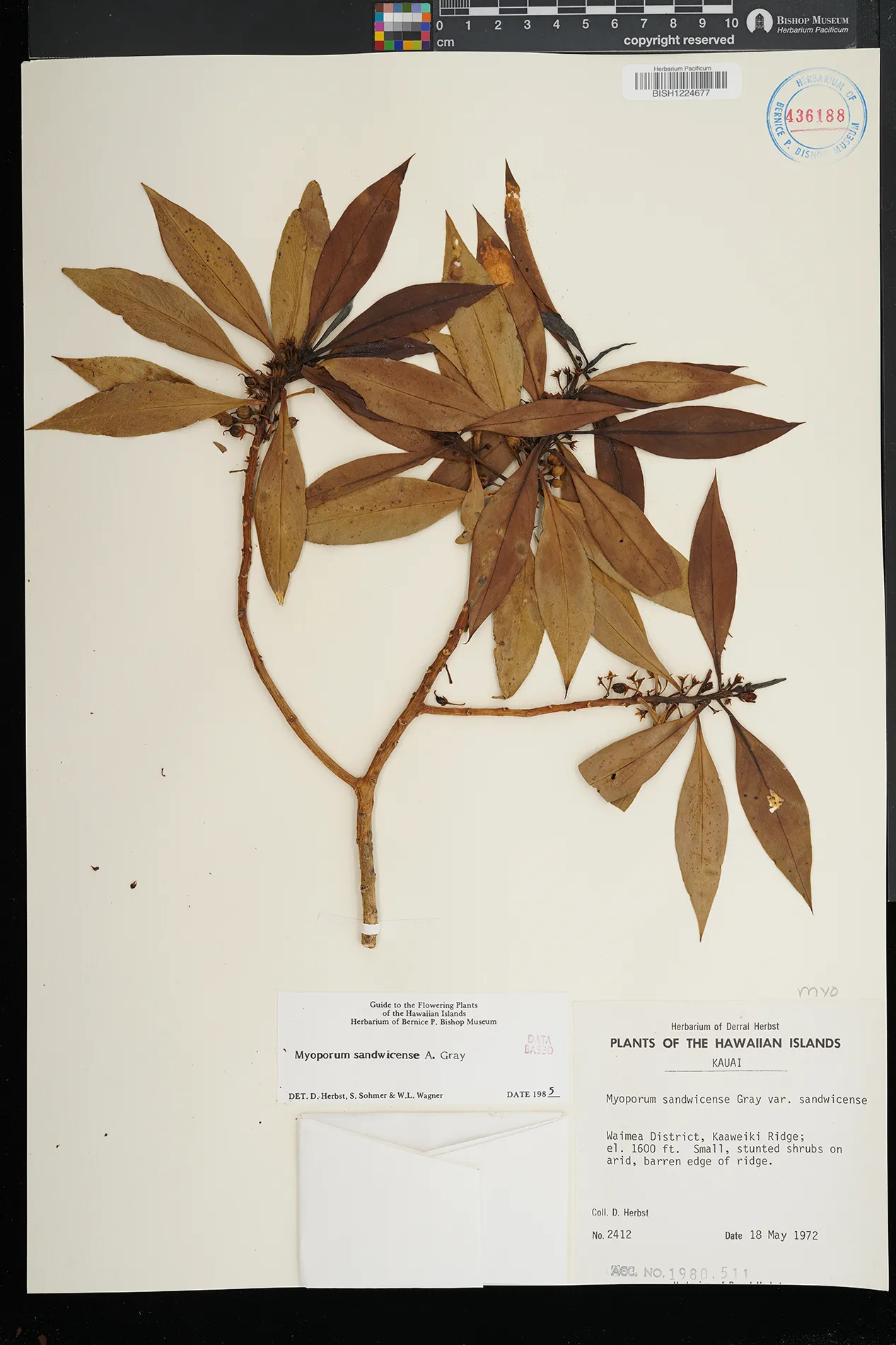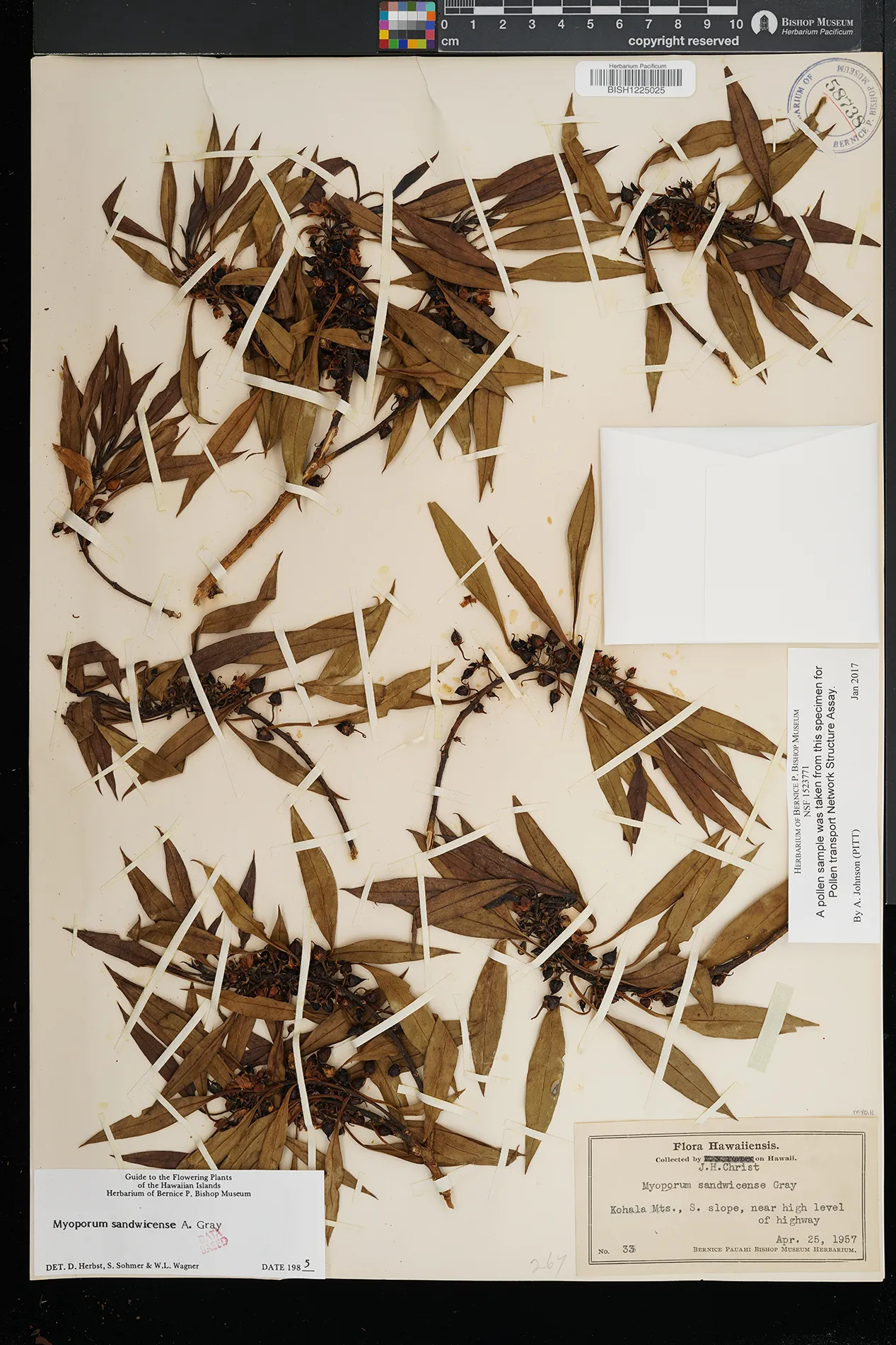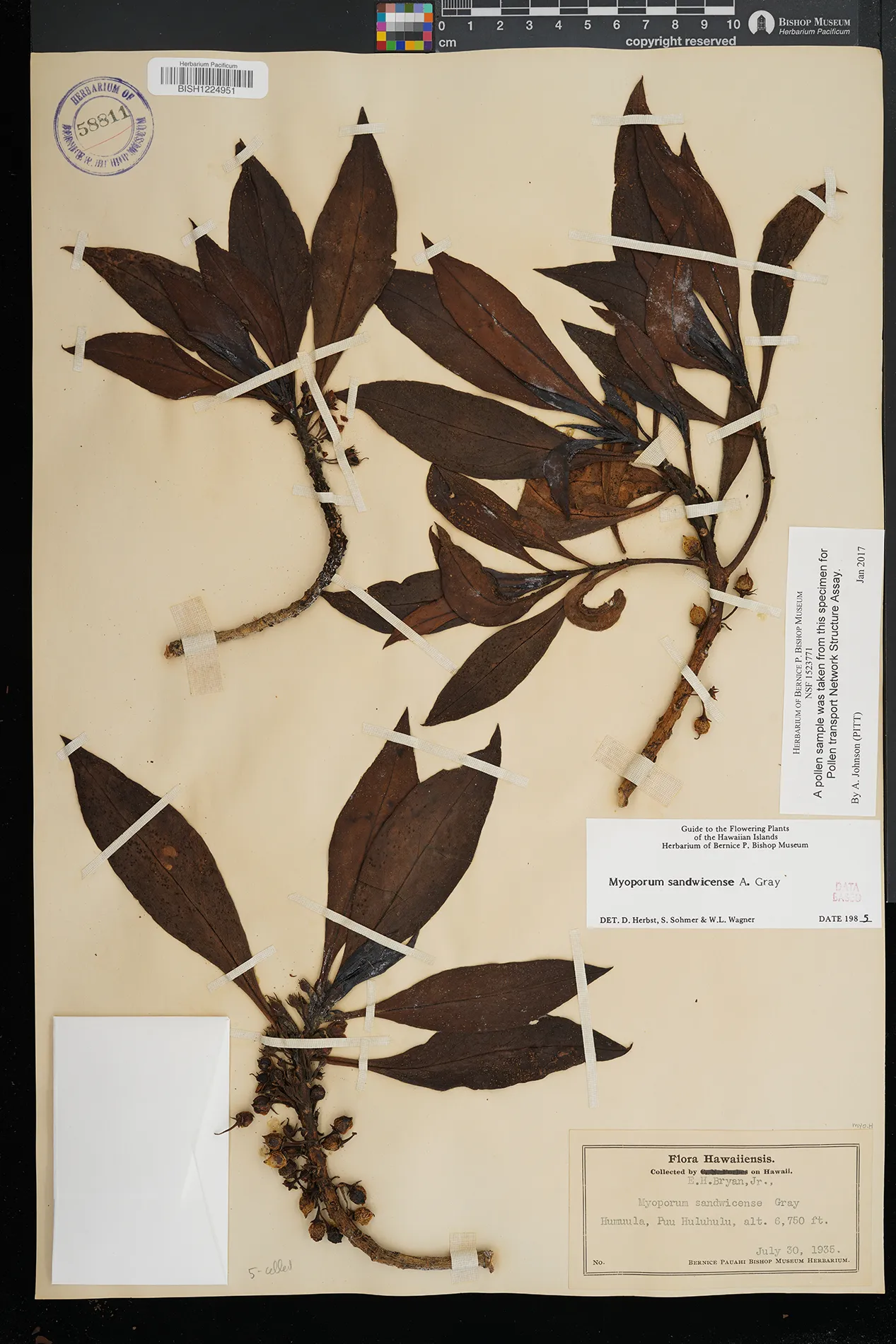 Wood has odor similar to sandalwood (Degener 1930:267). Used for house posts (Degener 1930:268; Krauss 1993:56). Burns well and long, used for torches (Lamb 1981:127). Wood used for fish net gauge (haha ka ‘upena) (Krauss 1993:35). In the Ethnology Collection at Bishop Museum there is a post-contact example of the wood made into a bowl.