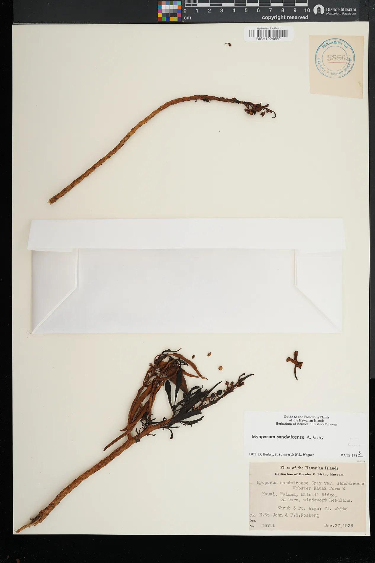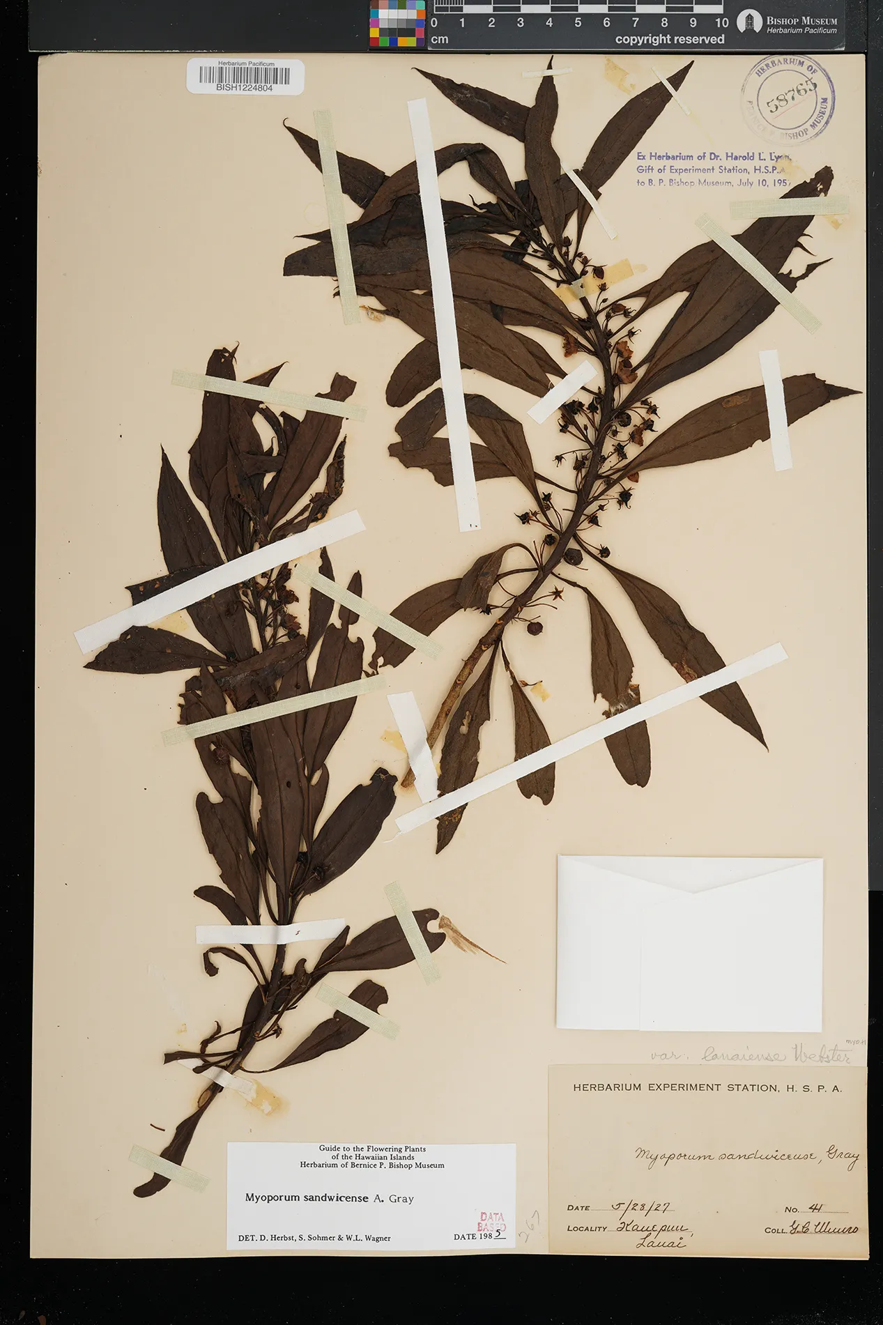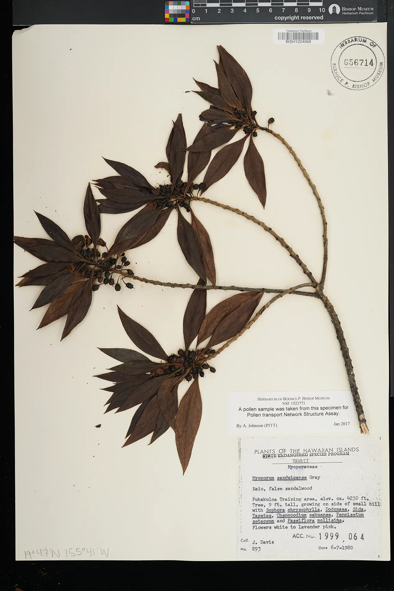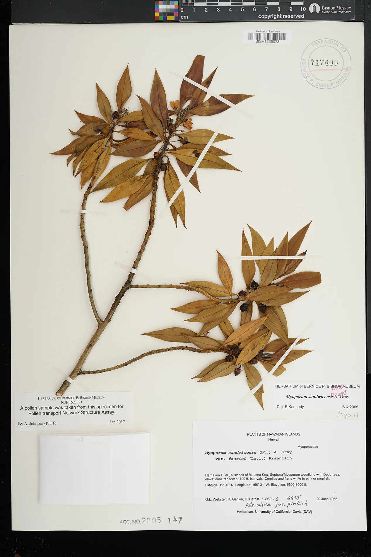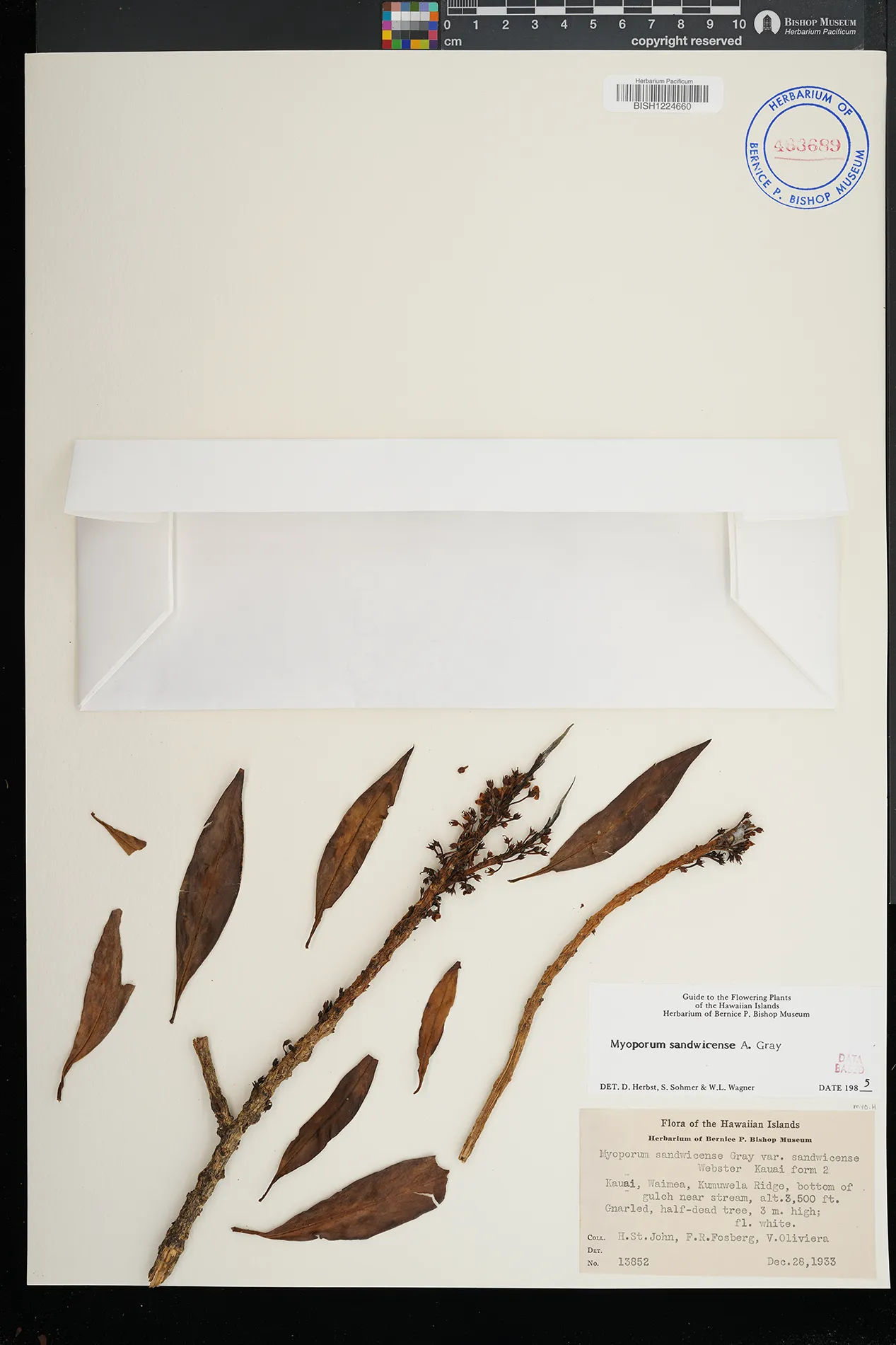 Wood has odor similar to sandalwood (Degener 1930:267). Used for house posts (Degener 1930:268; Krauss 1993:56). Burns well and long, used for torches (Lamb 1981:127). Wood used for fish net gauge (haha ka ‘upena) (Krauss 1993:35). In the Ethnology Collection at Bishop Museum there is a post-contact example of the wood made into a bowl.
