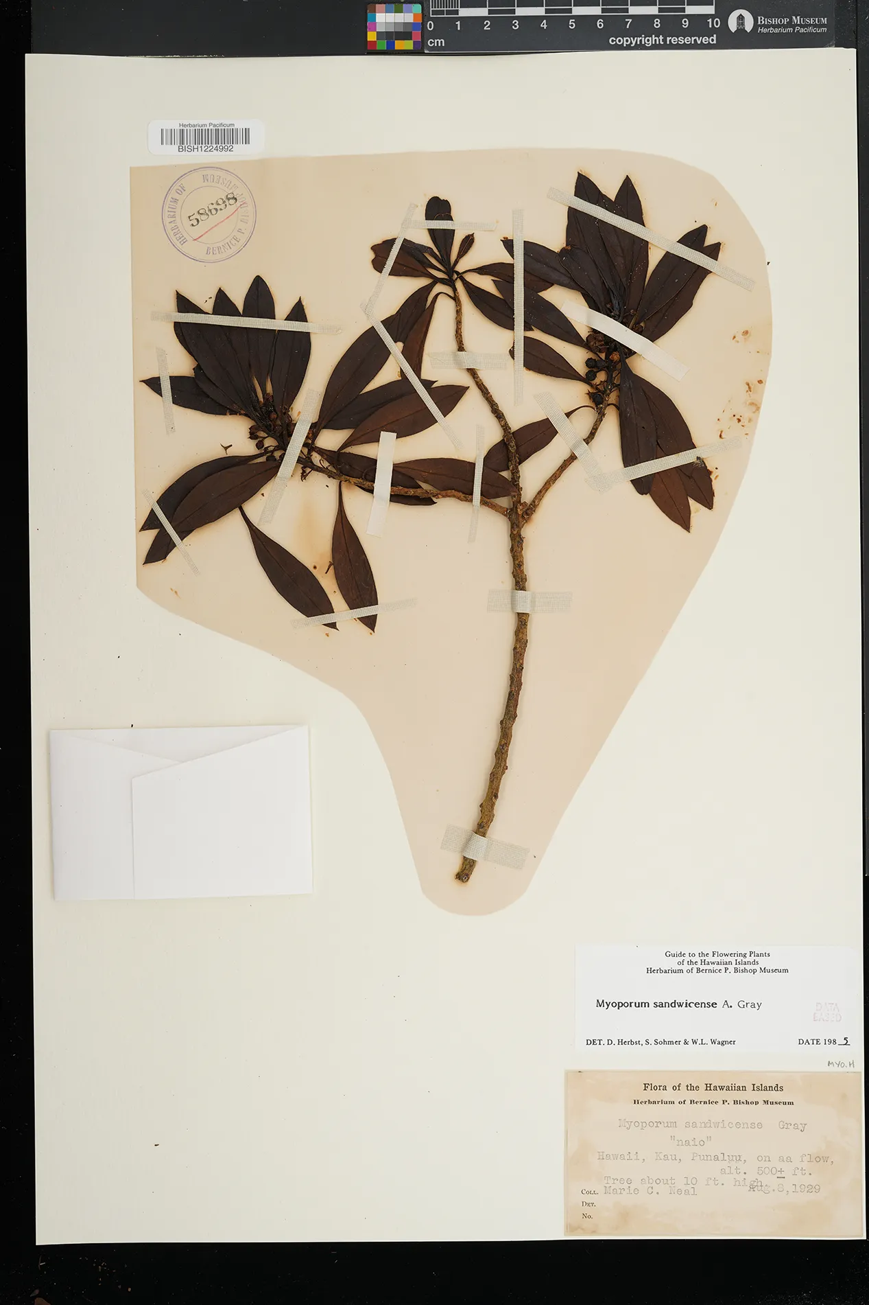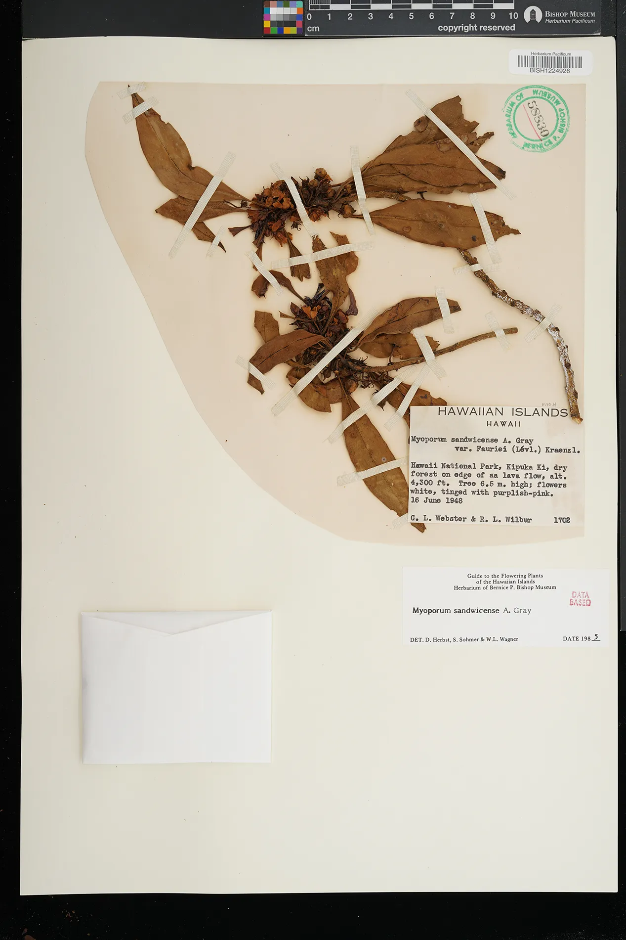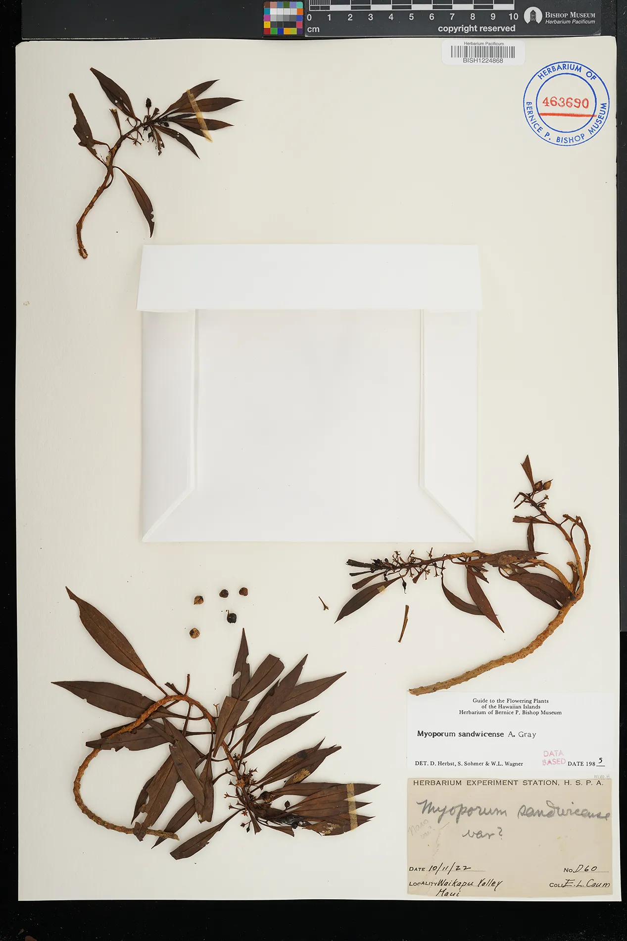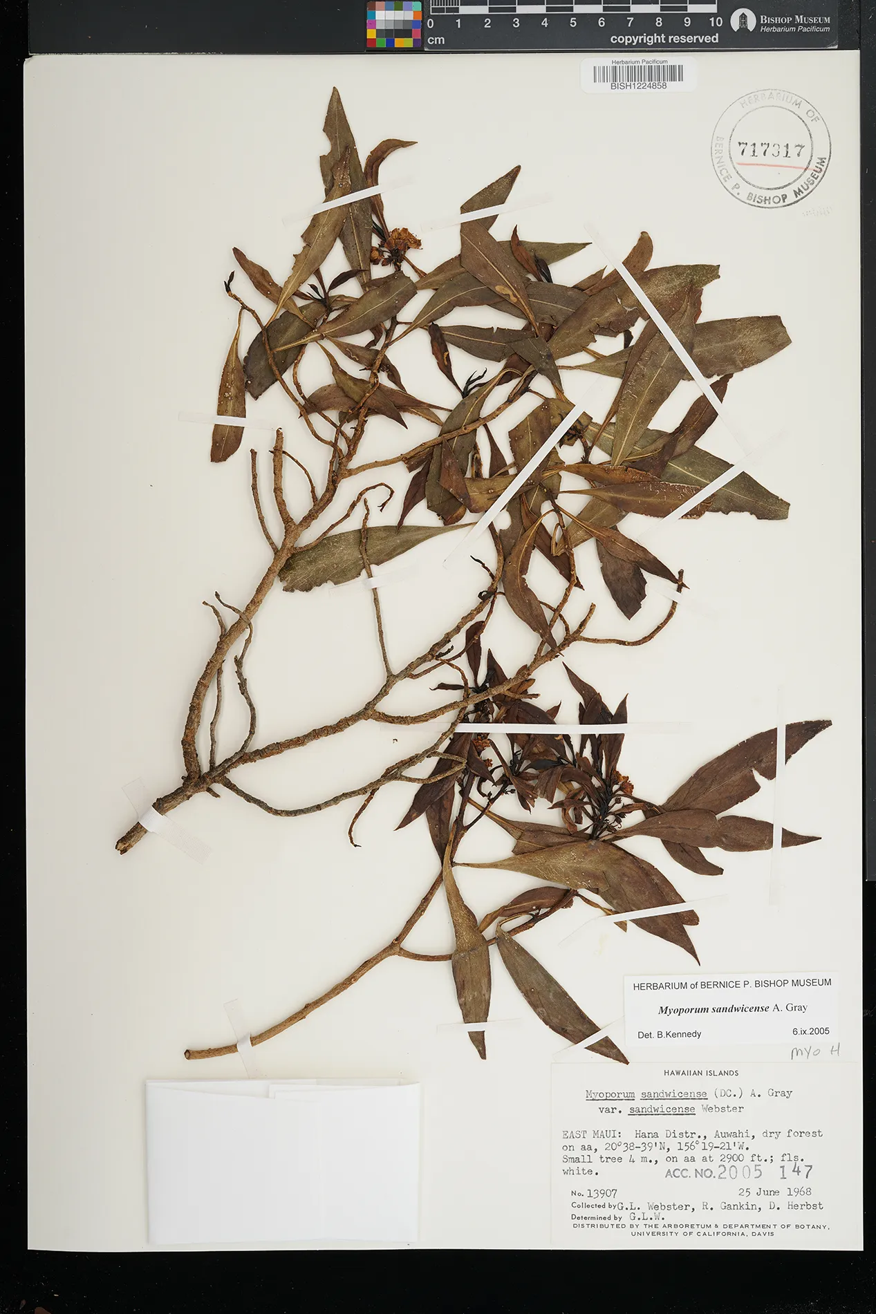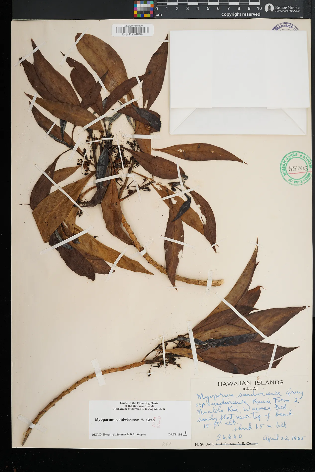 Wood has odor similar to sandalwood (Degener 1930:267). Used for house posts (Degener 1930:268; Krauss 1993:56). Burns well and long, used for torches (Lamb 1981:127). Wood used for fish net gauge (haha ka ‘upena) (Krauss 1993:35). In the Ethnology Collection at Bishop Museum there is a post-contact example of the wood made into a bowl.