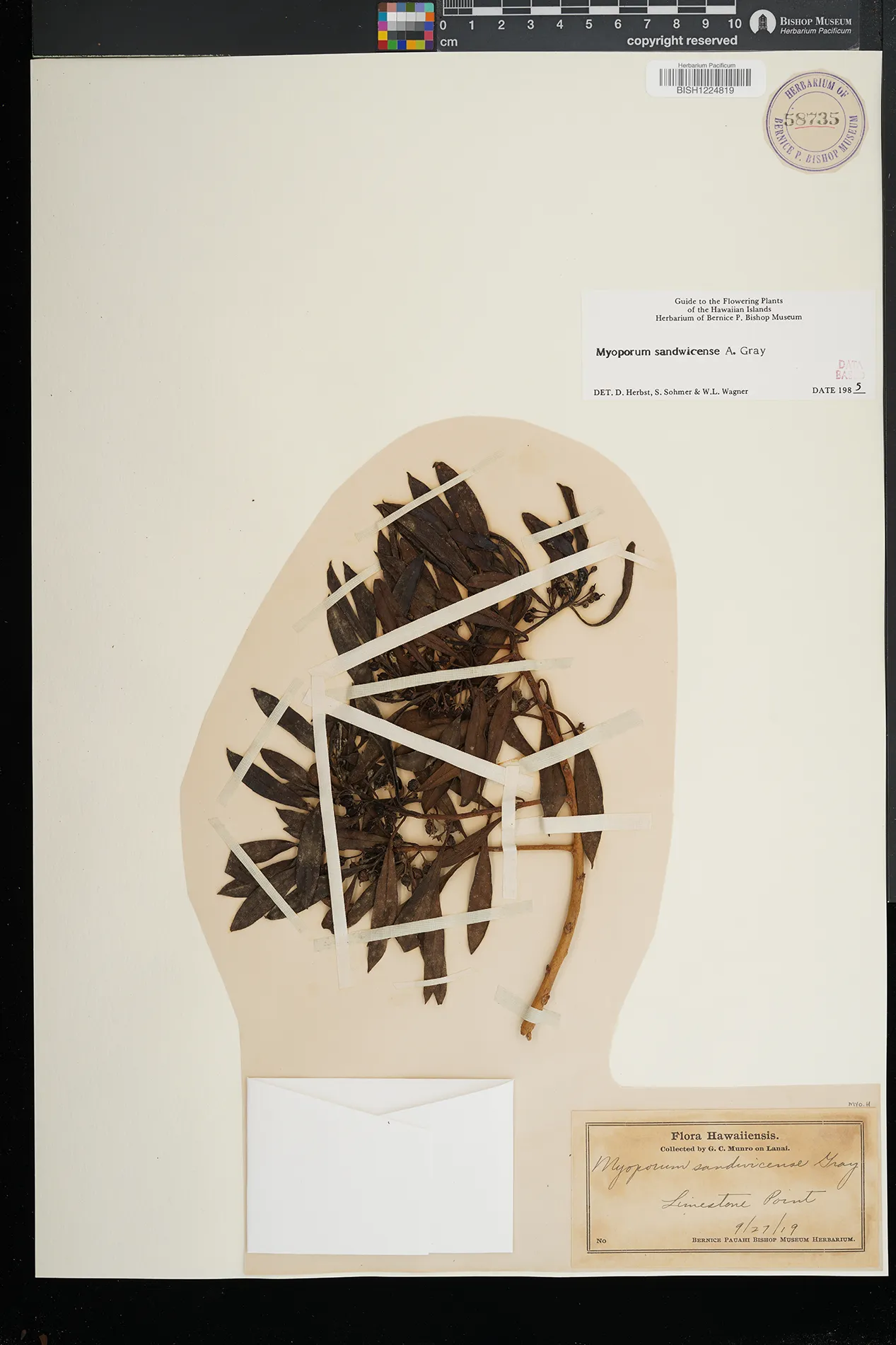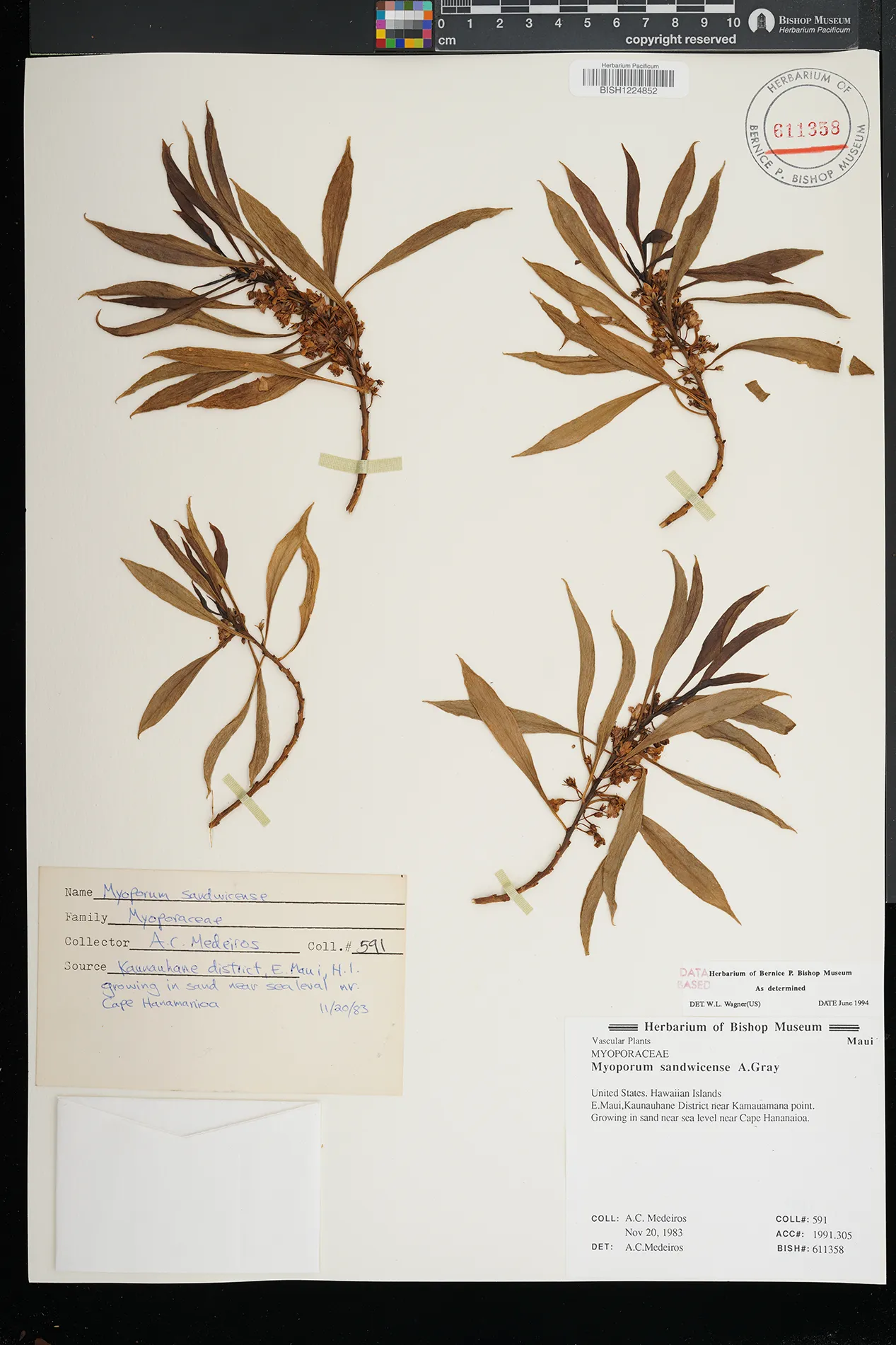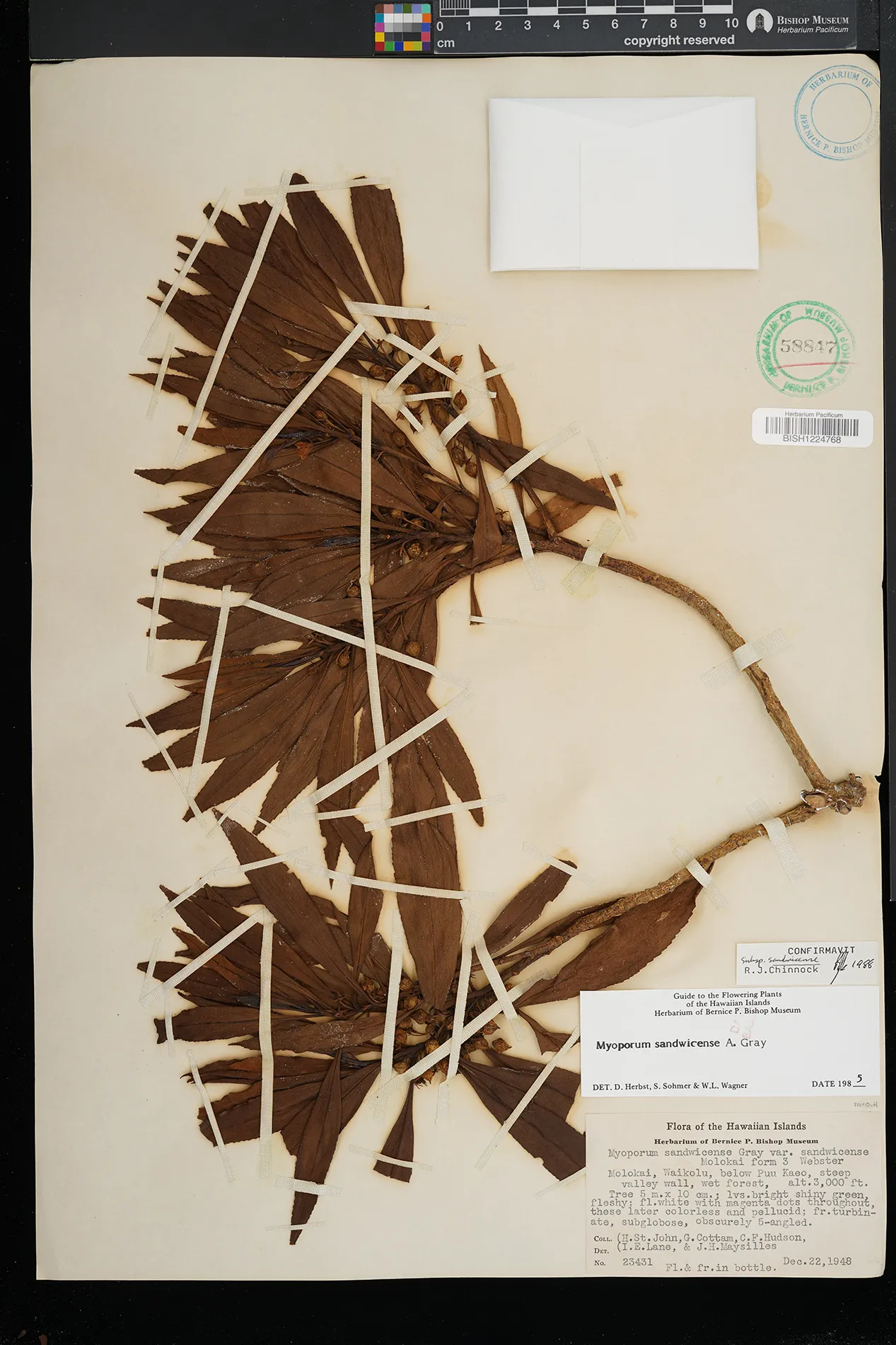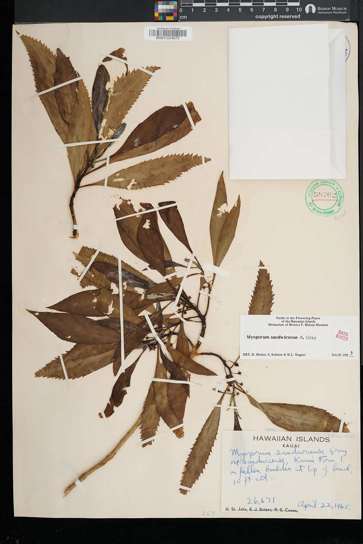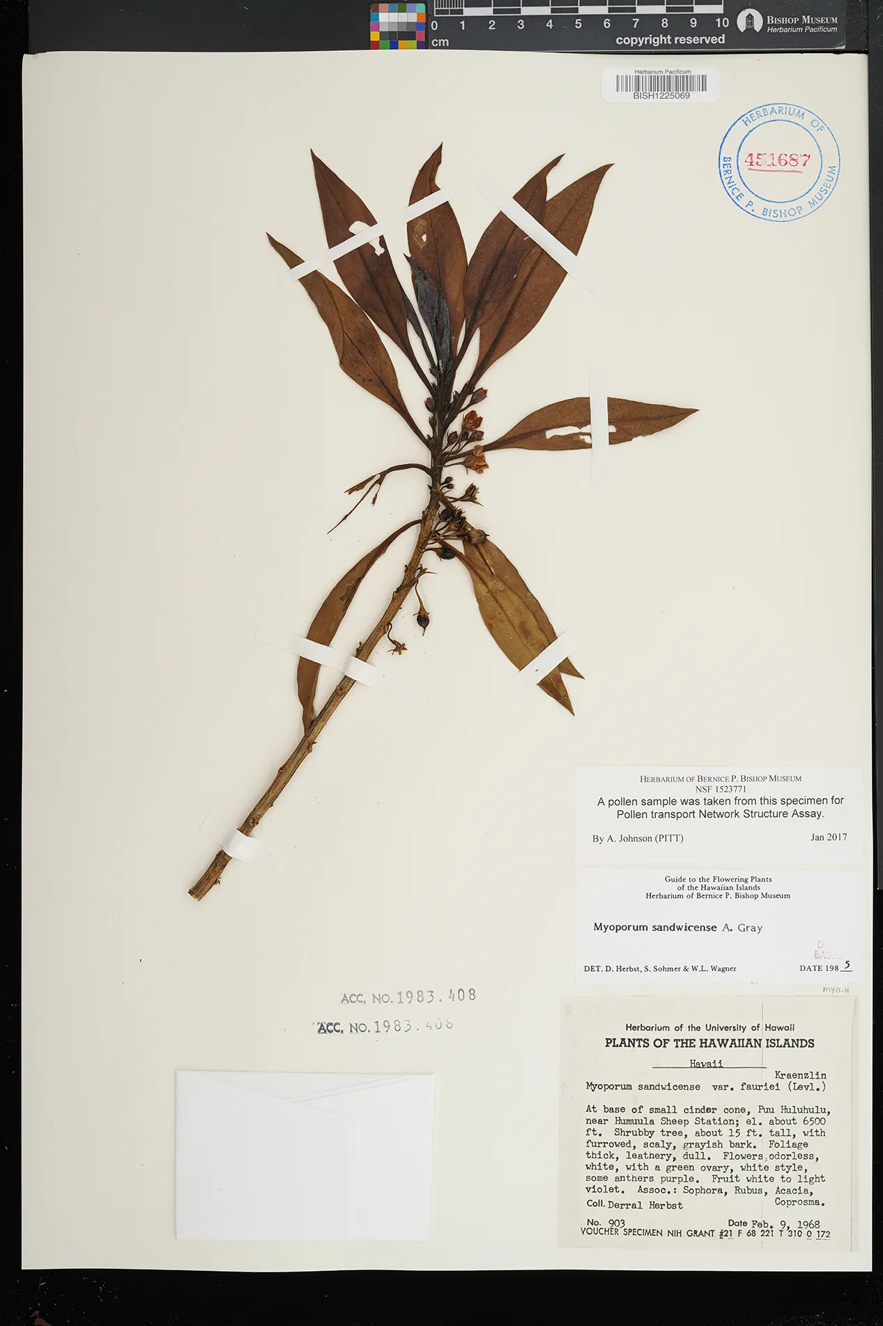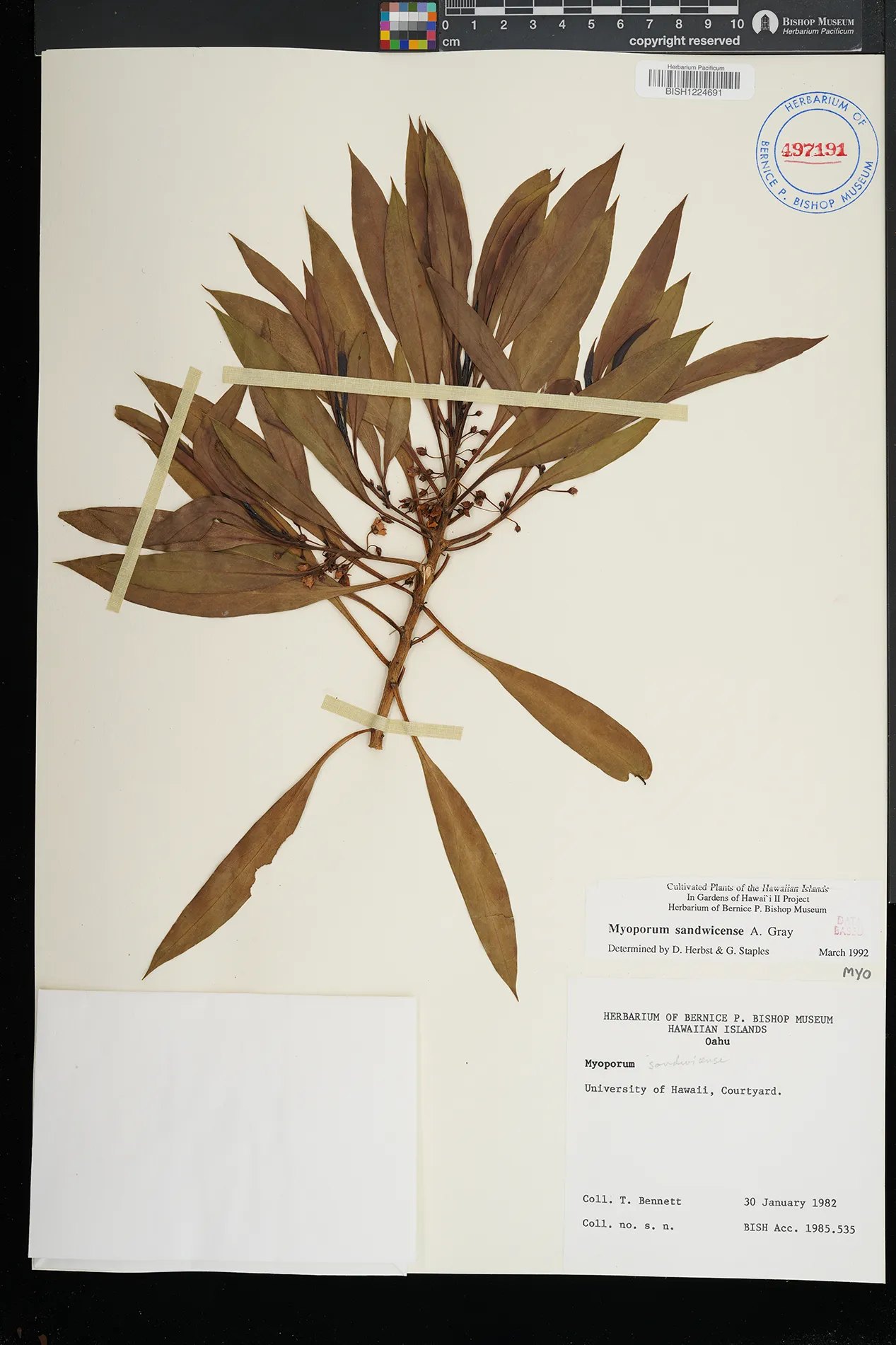 Wood has odor similar to sandalwood (Degener 1930:267). Used for house posts (Degener 1930:268; Krauss 1993:56). Burns well and long, used for torches (Lamb 1981:127). Wood used for fish net gauge (haha ka ‘upena) (Krauss 1993:35). In the Ethnology Collection at Bishop Museum there is a post-contact example of the wood made into a bowl.