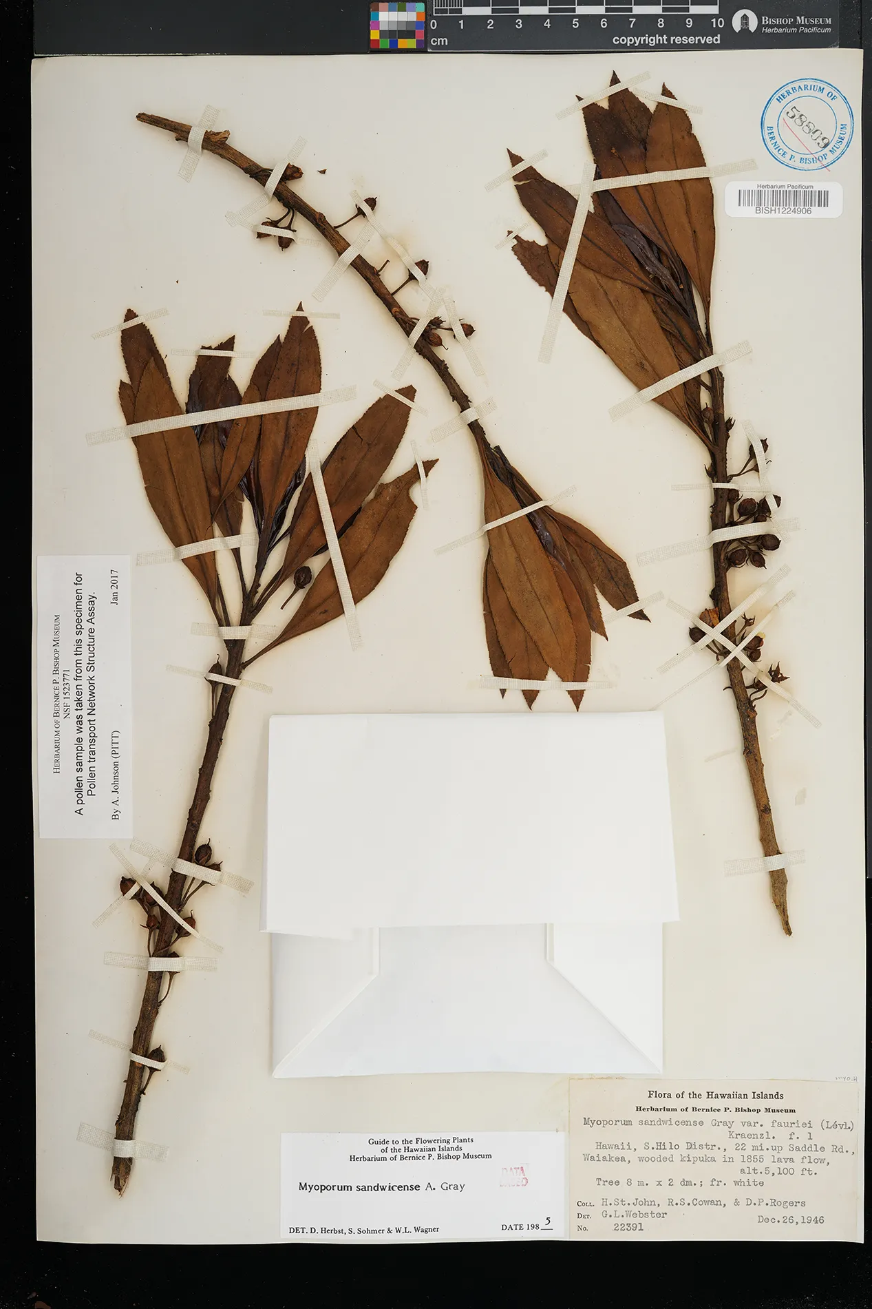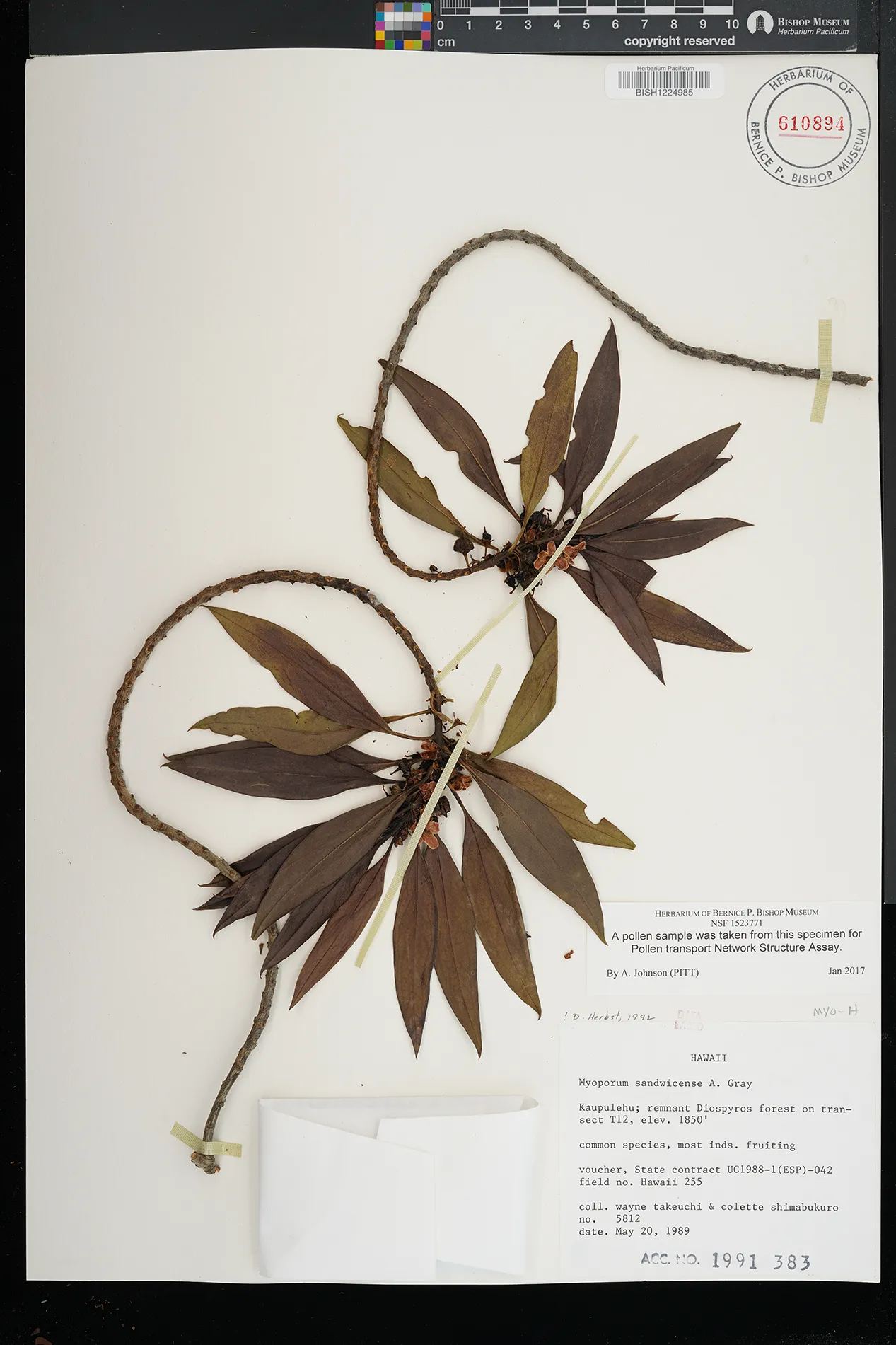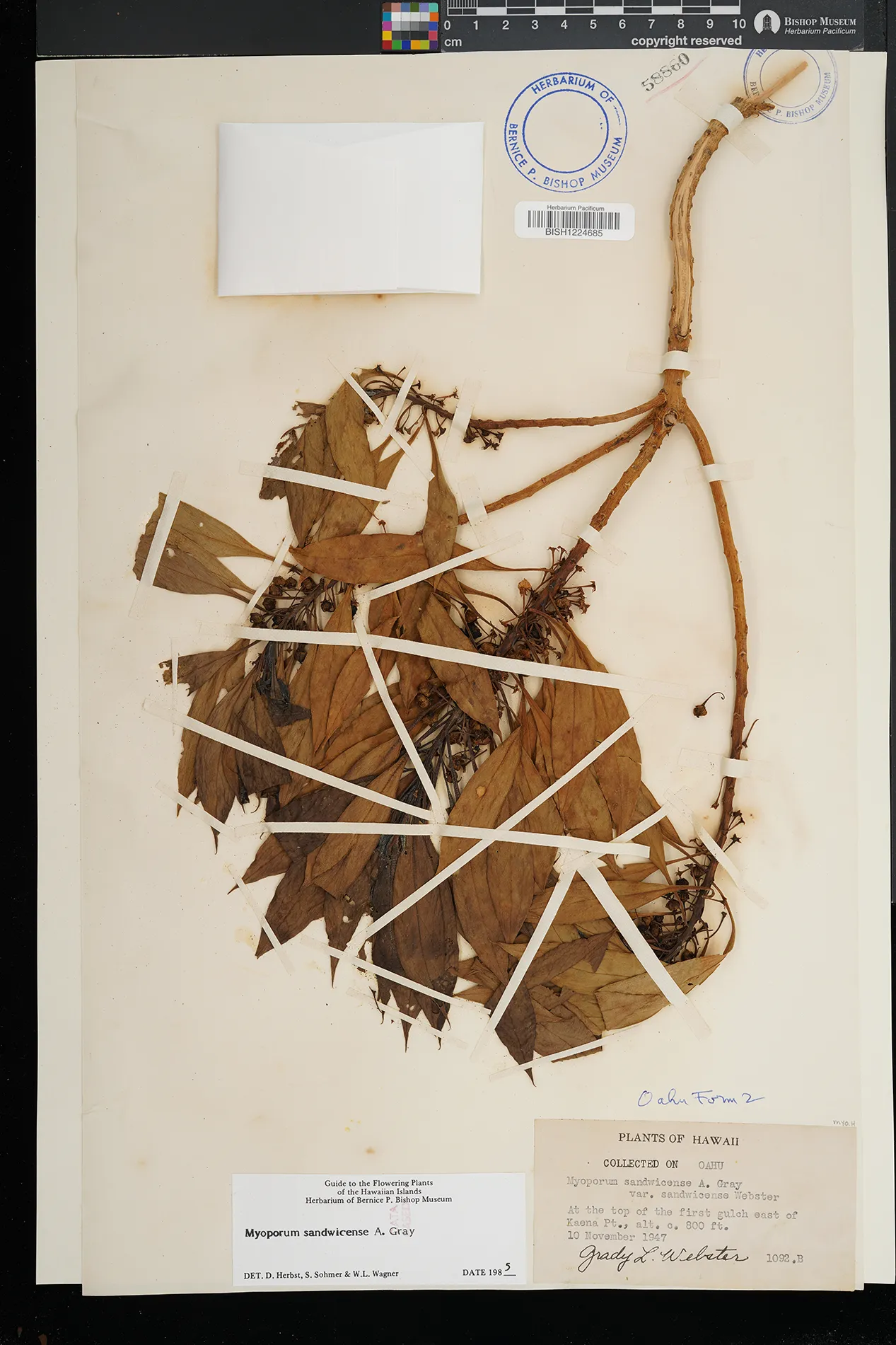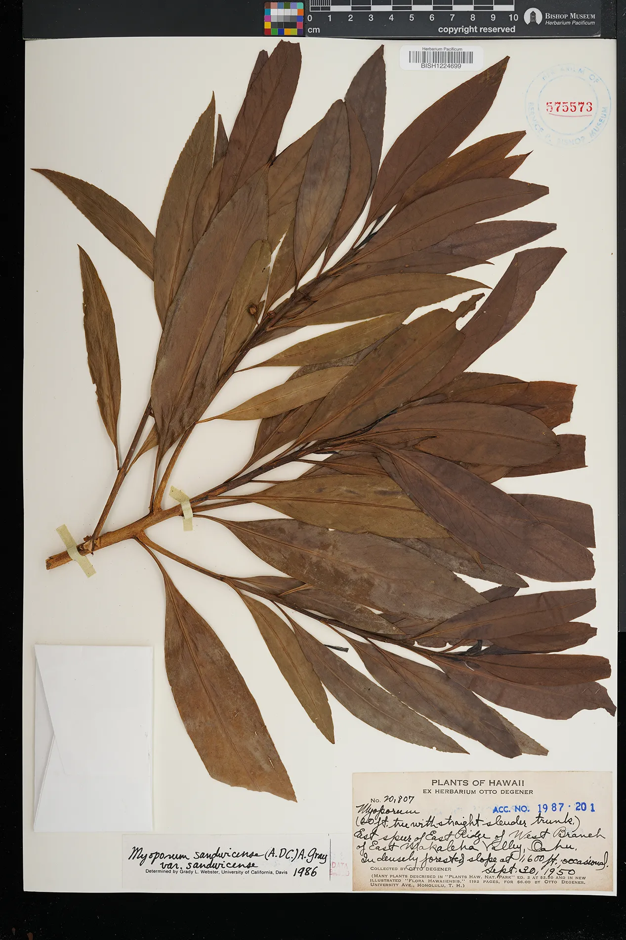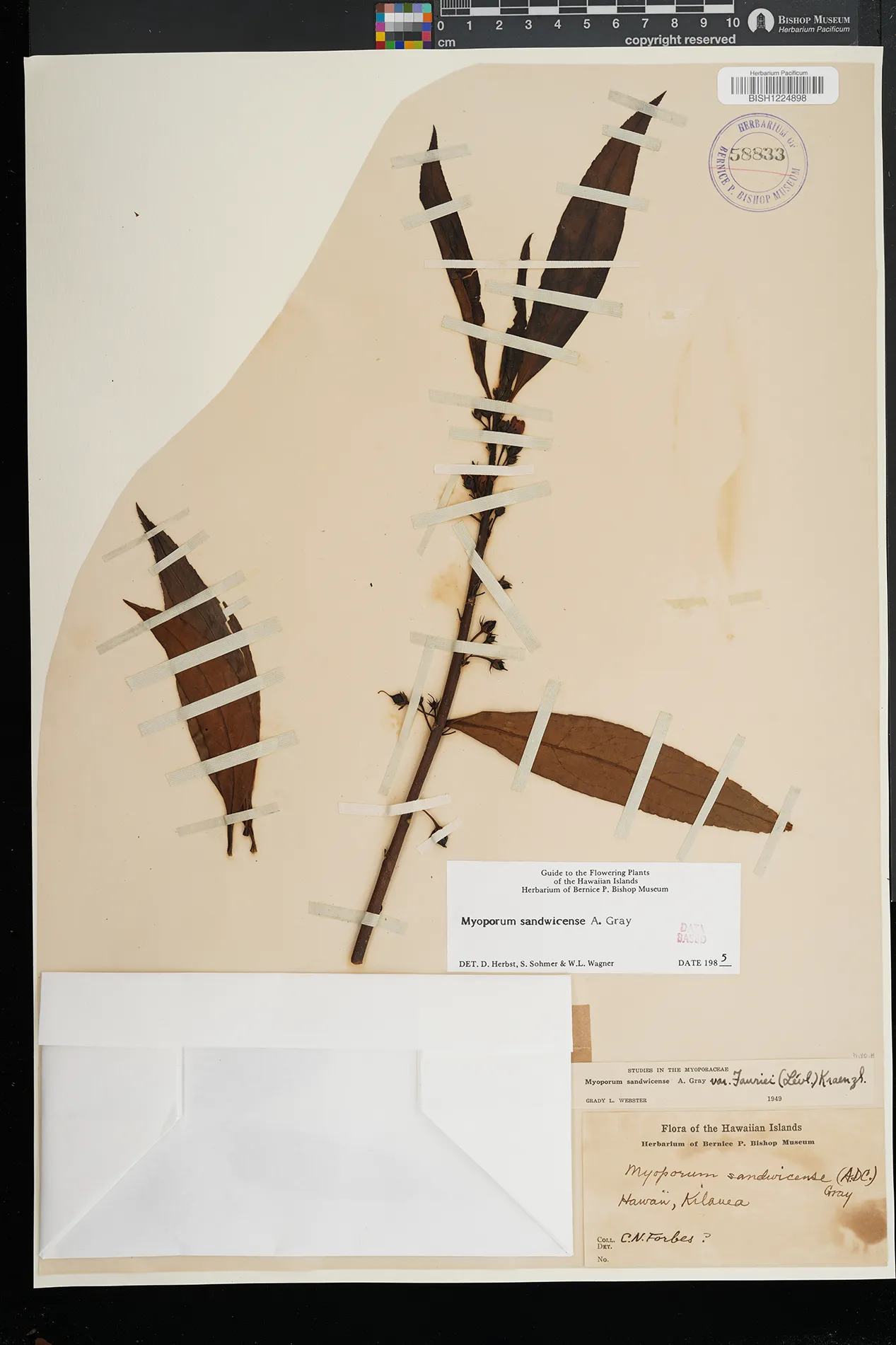 Wood has odor similar to sandalwood (Degener 1930:267). Used for house posts (Degener 1930:268; Krauss 1993:56). Burns well and long, used for torches (Lamb 1981:127). Wood used for fish net gauge (haha ka ‘upena) (Krauss 1993:35). In the Ethnology Collection at Bishop Museum there is a post-contact example of the wood made into a bowl.