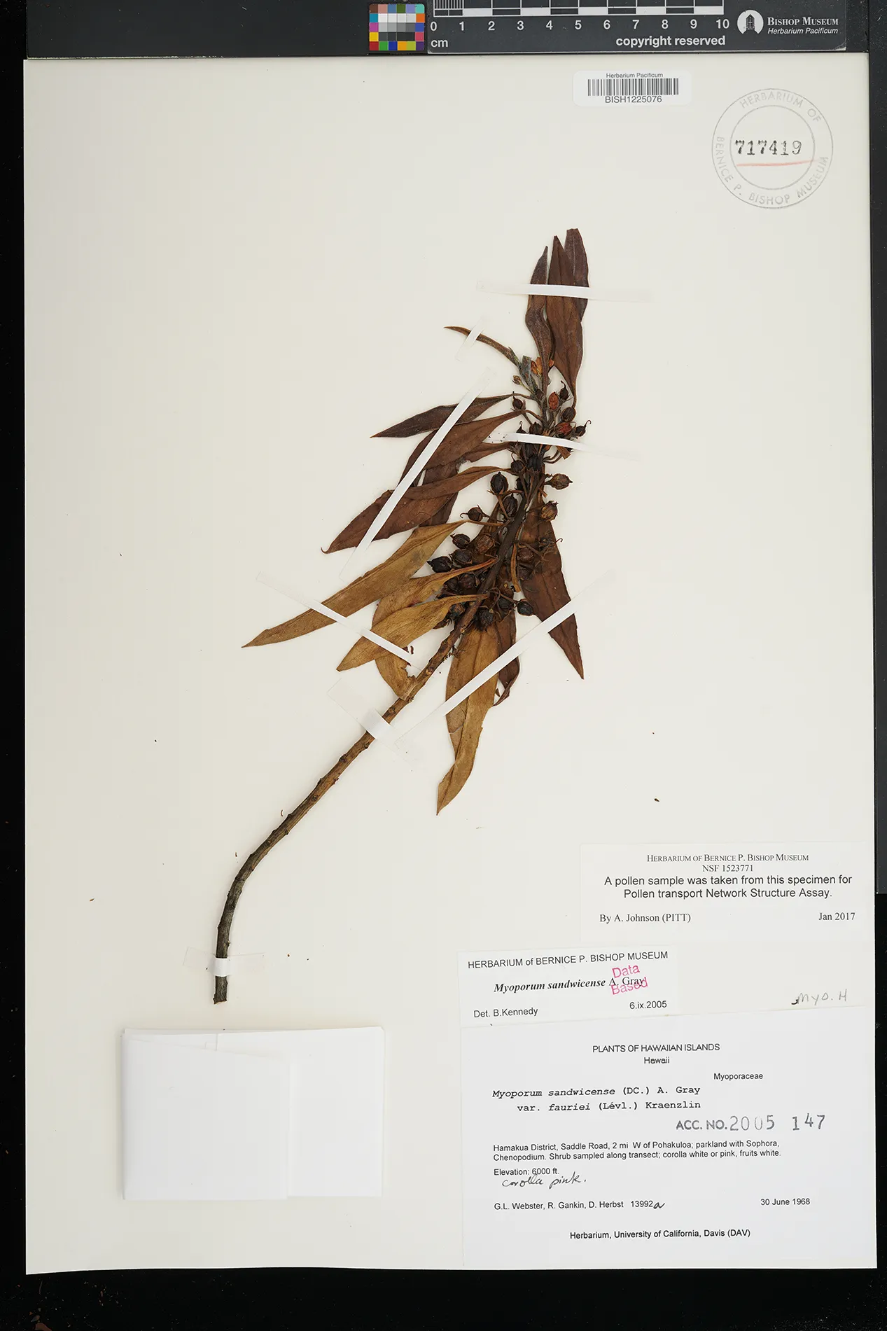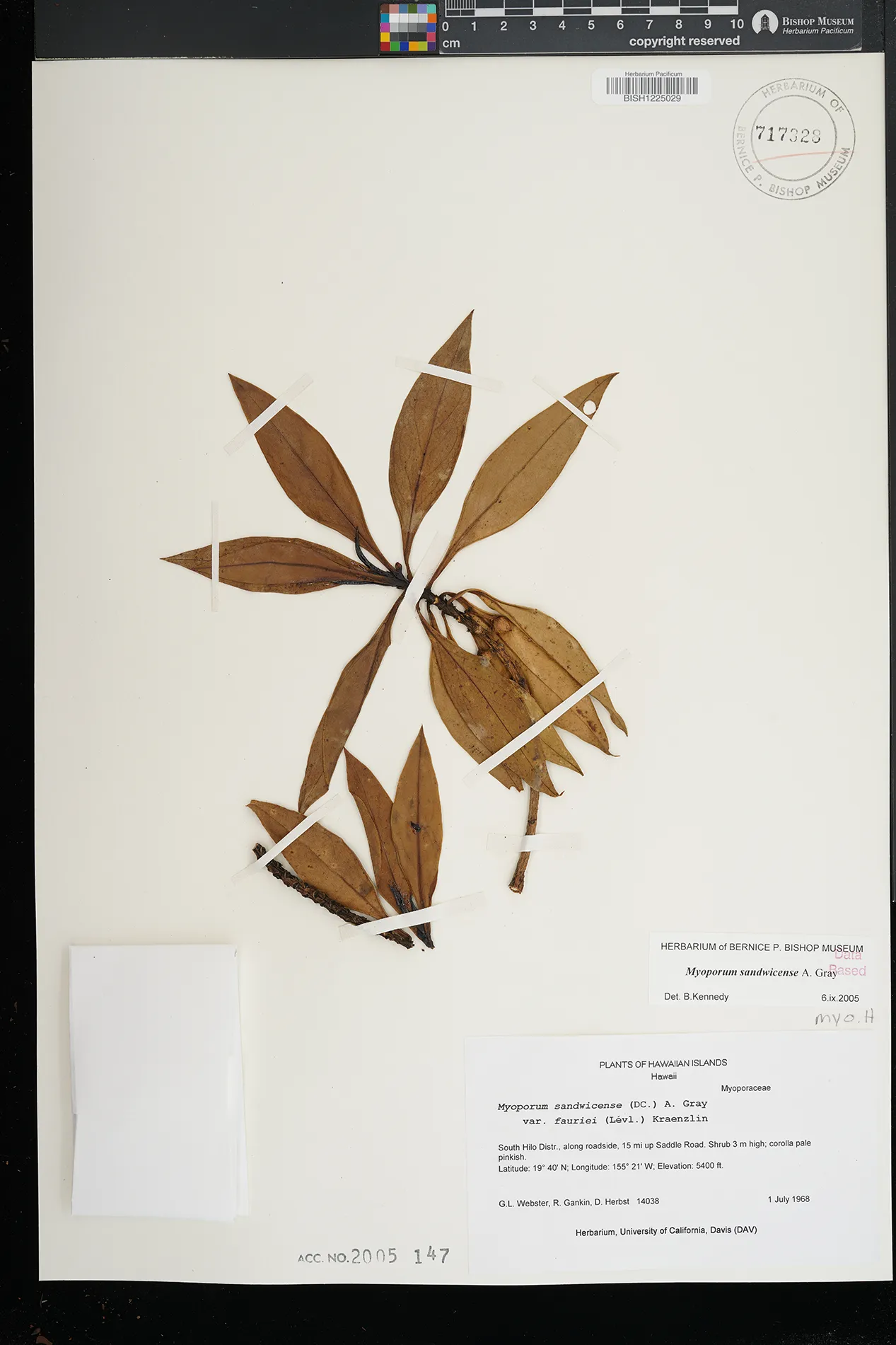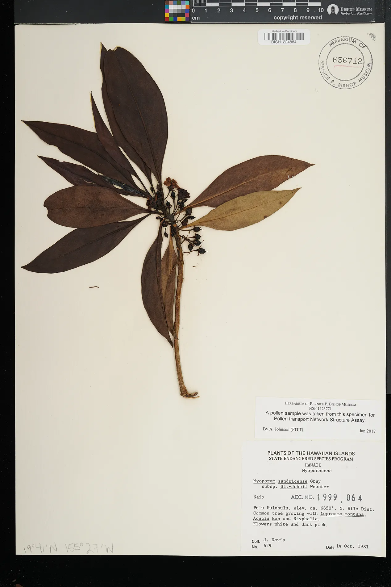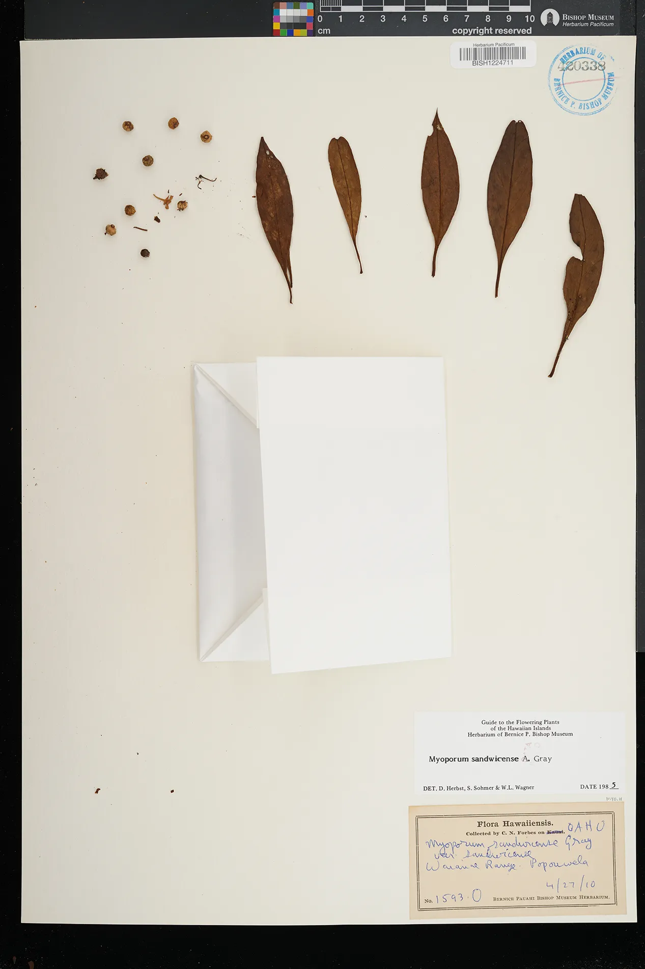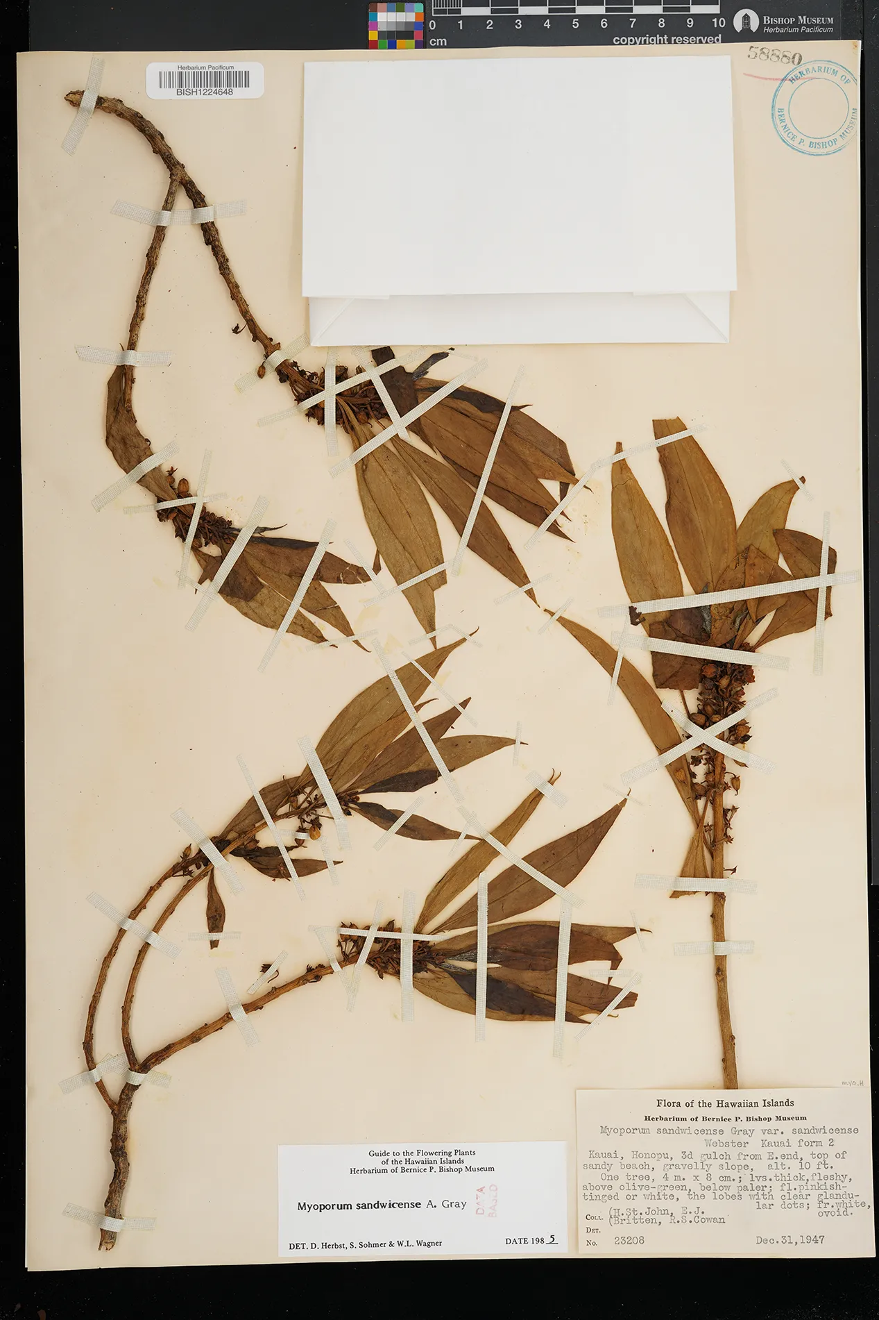 Wood has odor similar to sandalwood (Degener 1930:267). Used for house posts (Degener 1930:268; Krauss 1993:56). Burns well and long, used for torches (Lamb 1981:127). Wood used for fish net gauge (haha ka ‘upena) (Krauss 1993:35). In the Ethnology Collection at Bishop Museum there is a post-contact example of the wood made into a bowl.