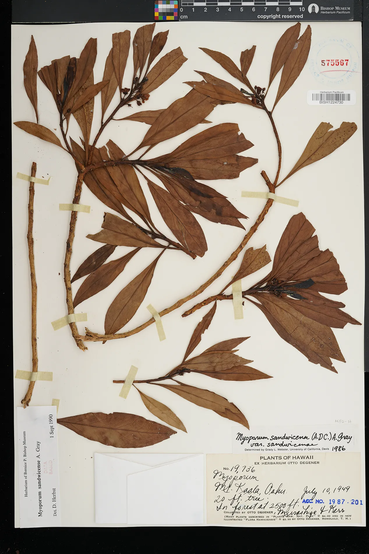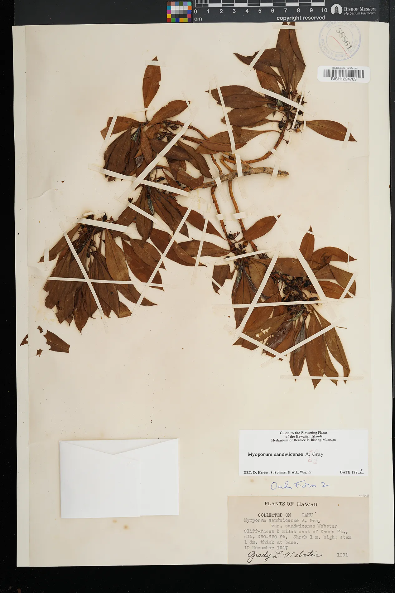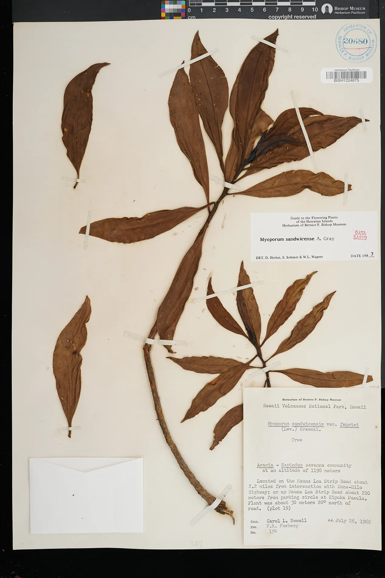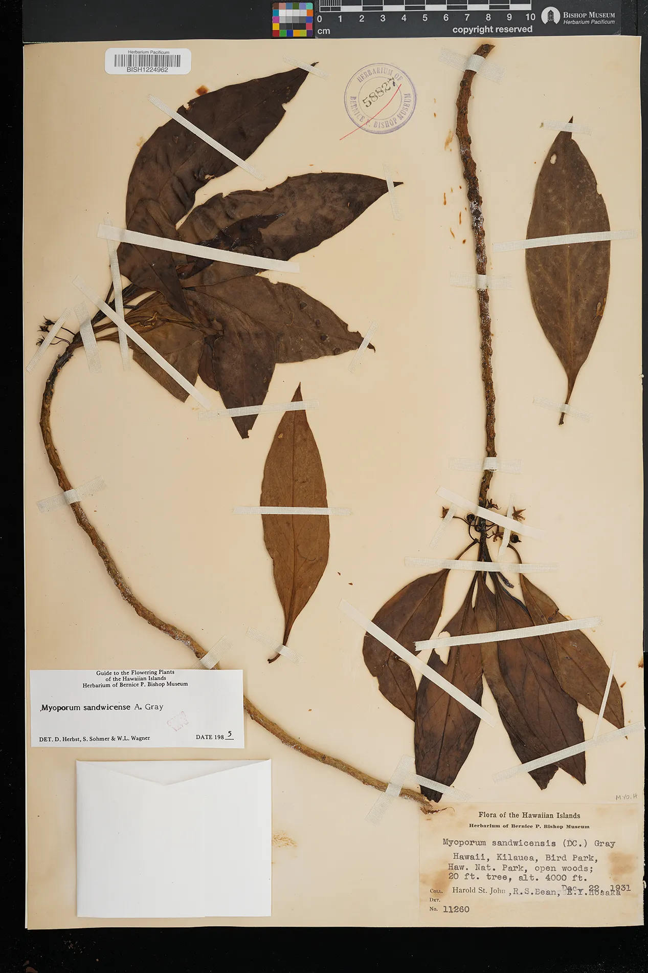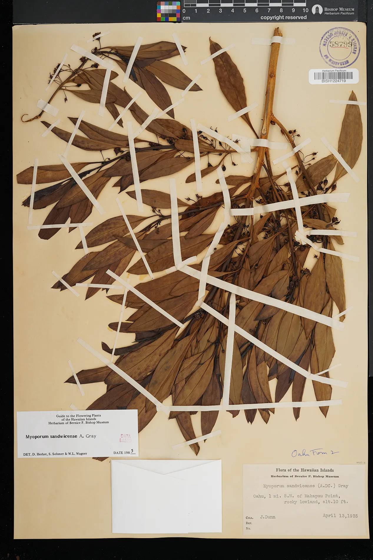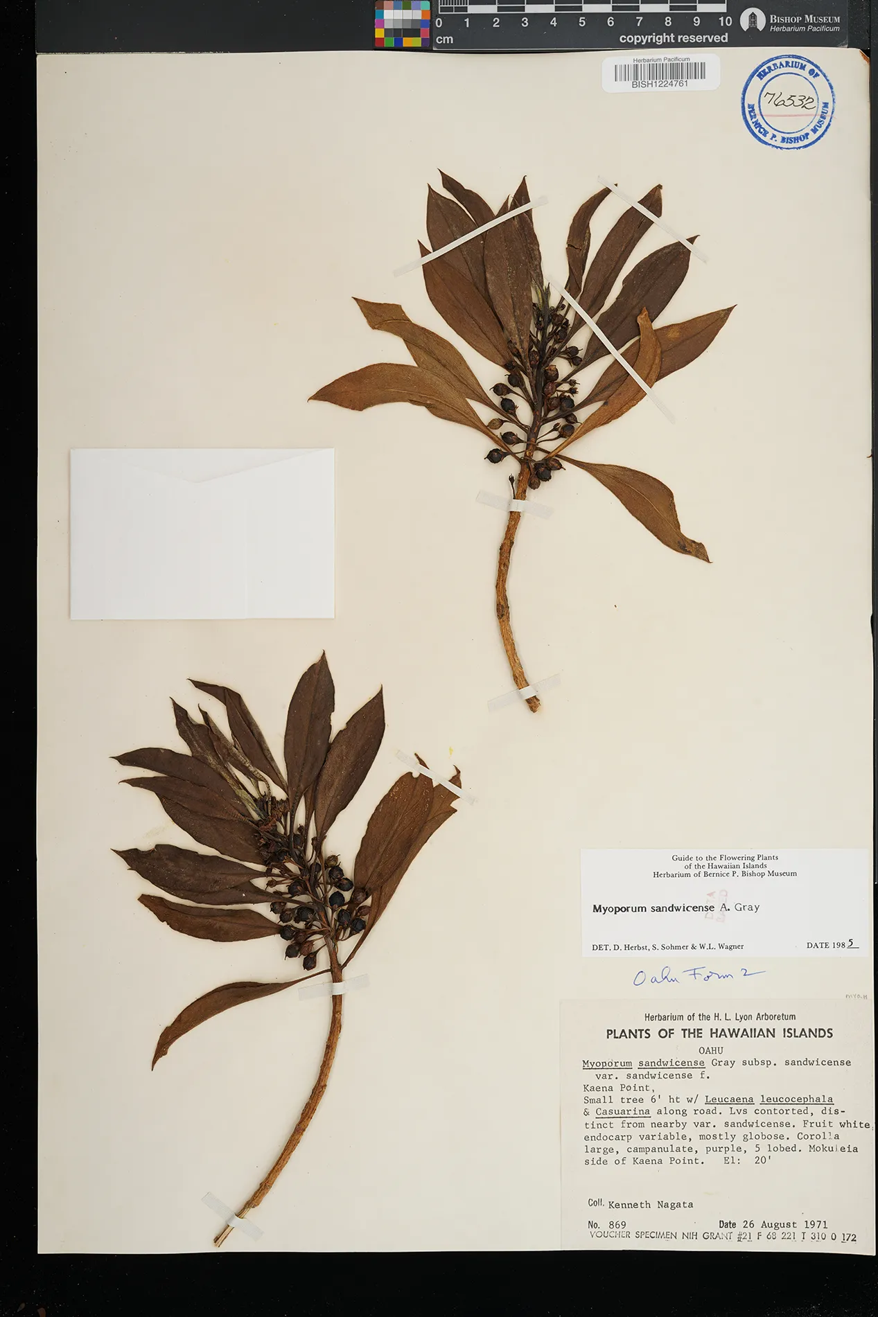 Wood has odor similar to sandalwood (Degener 1930:267). Used for house posts (Degener 1930:268; Krauss 1993:56). Burns well and long, used for torches (Lamb 1981:127). Wood used for fish net gauge (haha ka ‘upena) (Krauss 1993:35). In the Ethnology Collection at Bishop Museum there is a post-contact example of the wood made into a bowl.