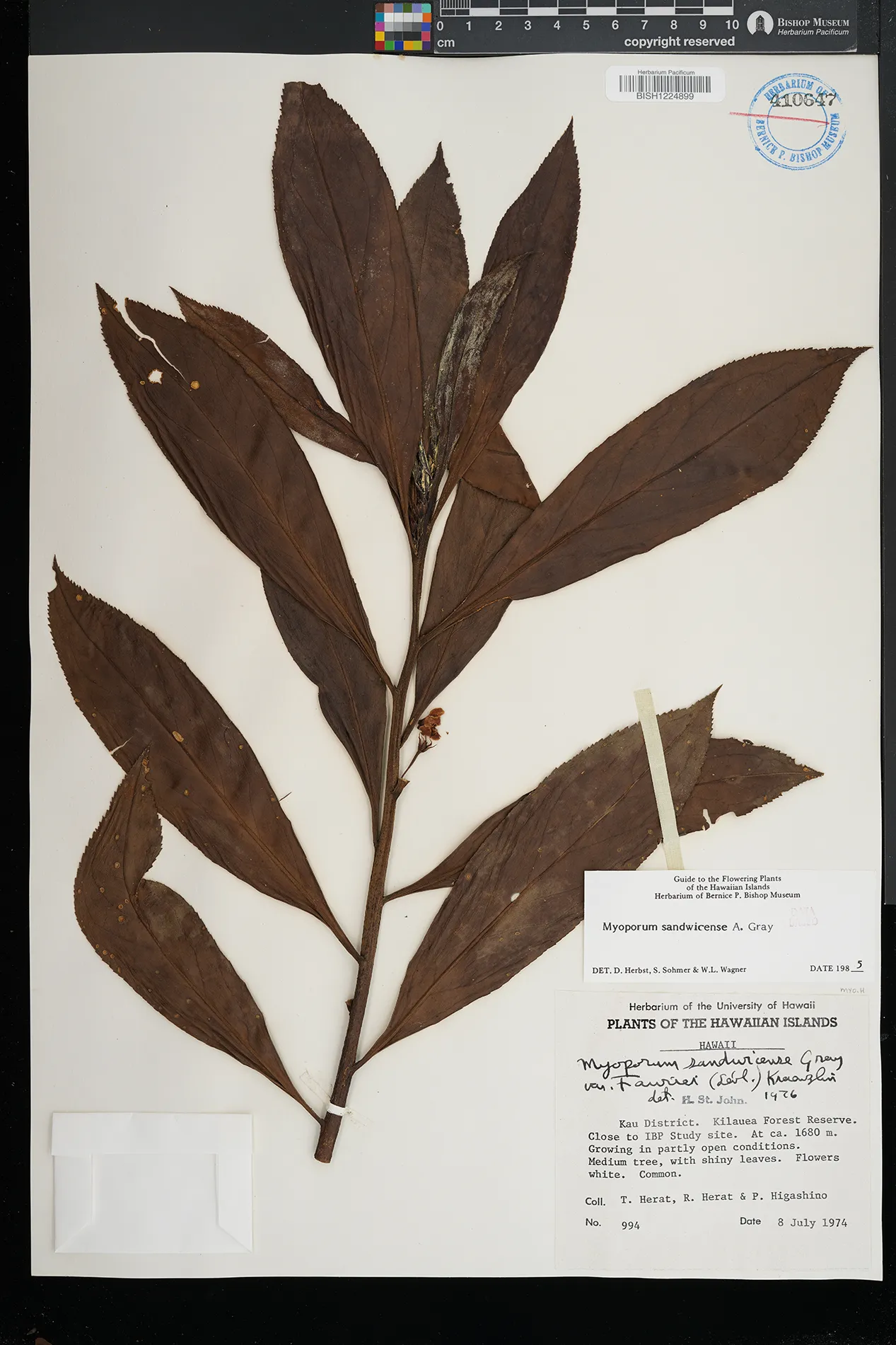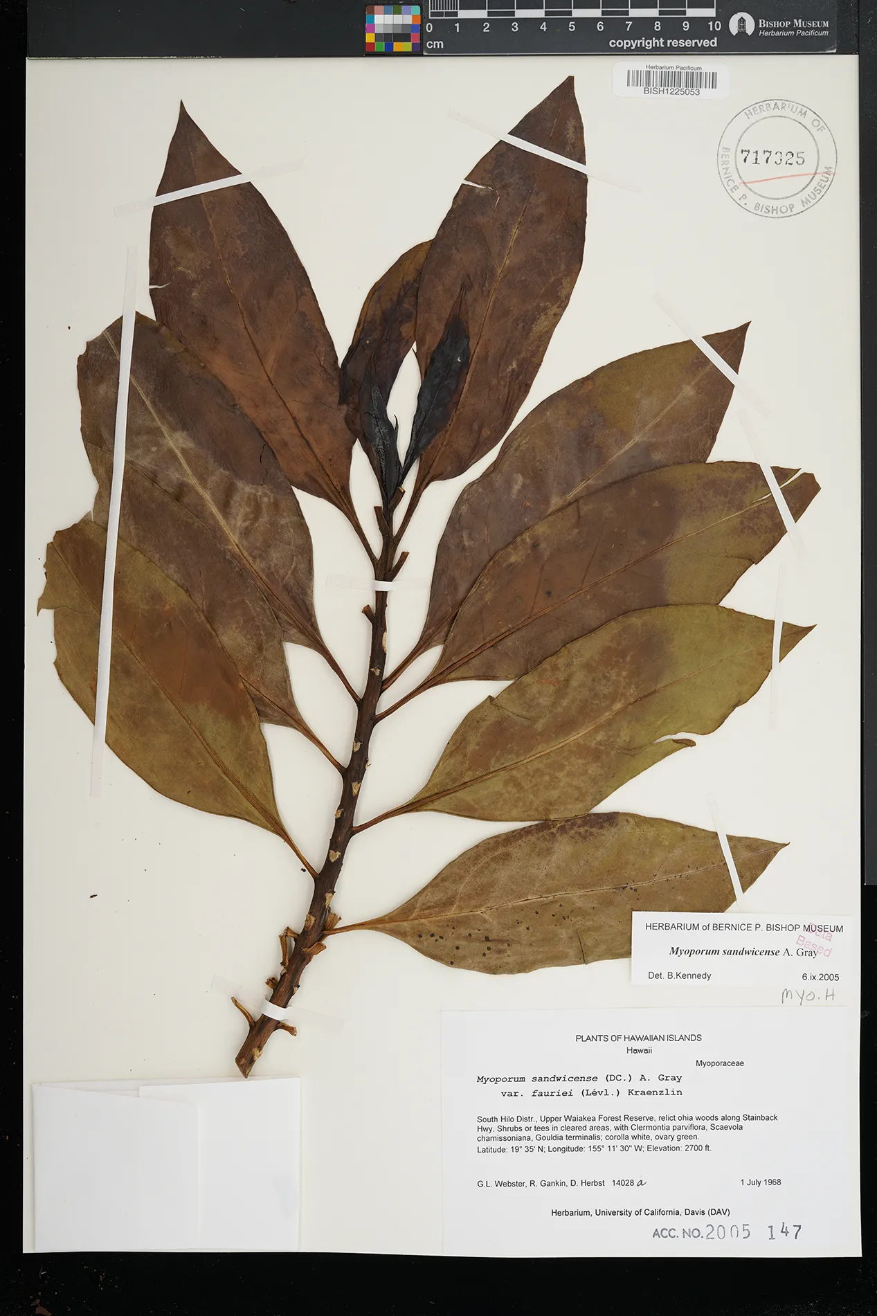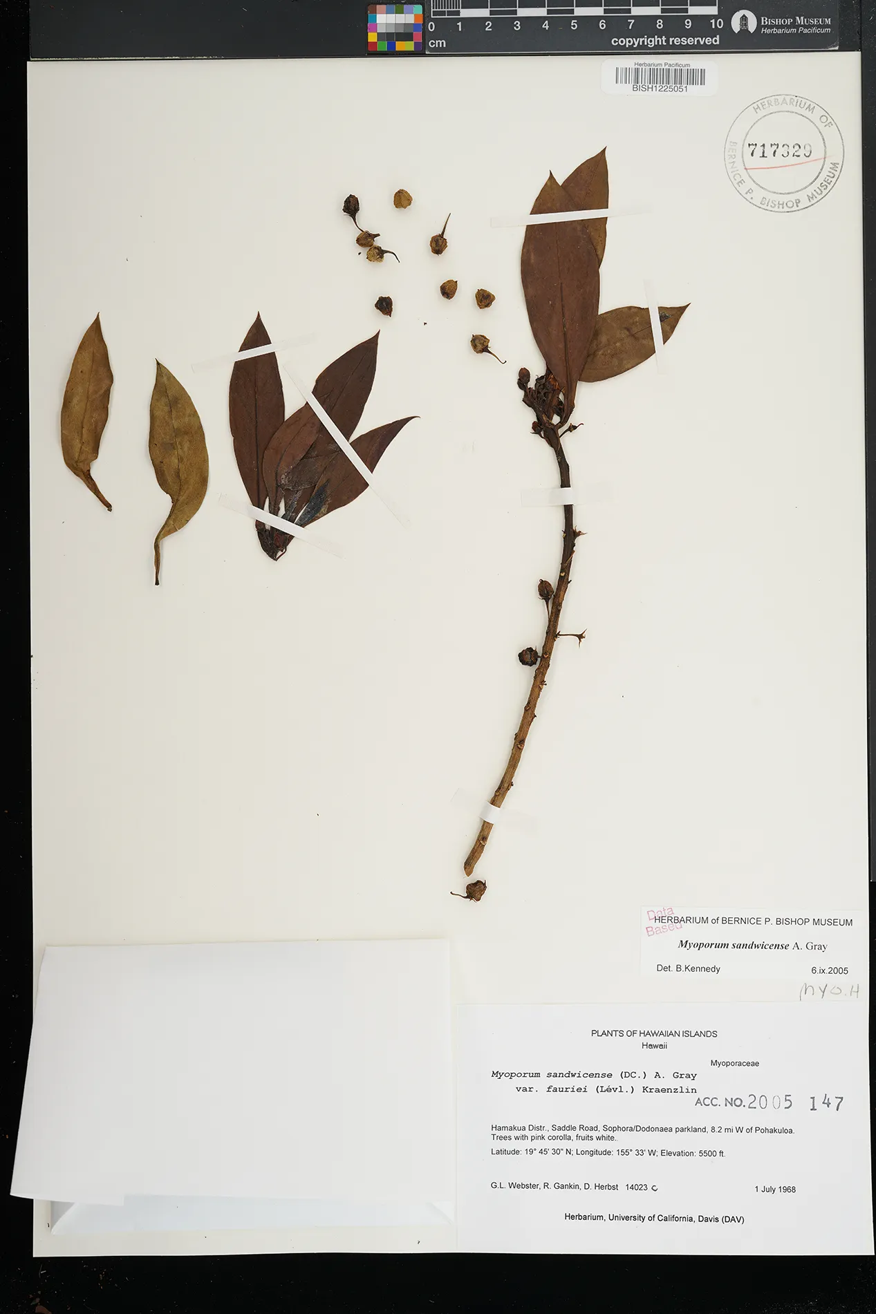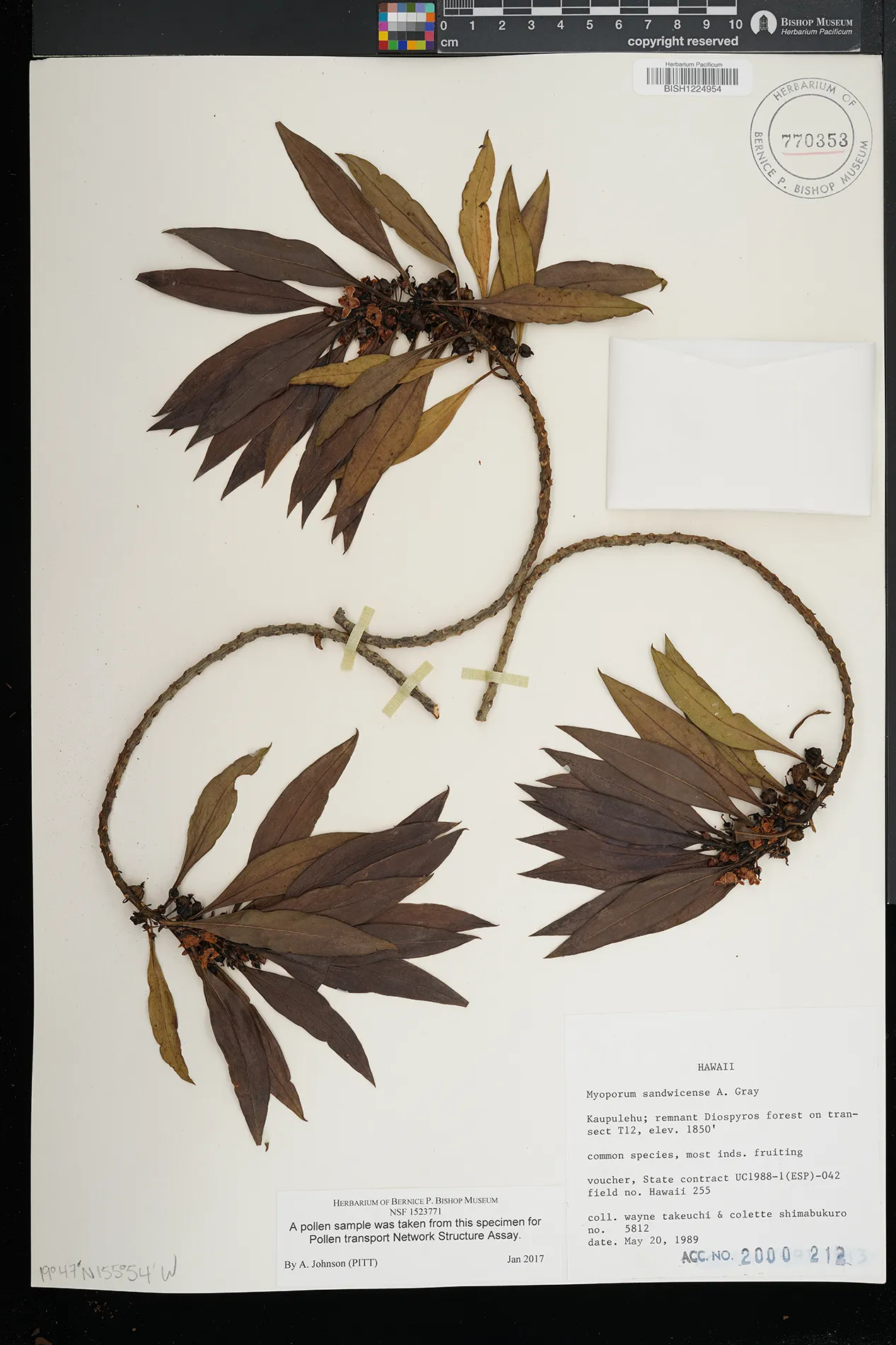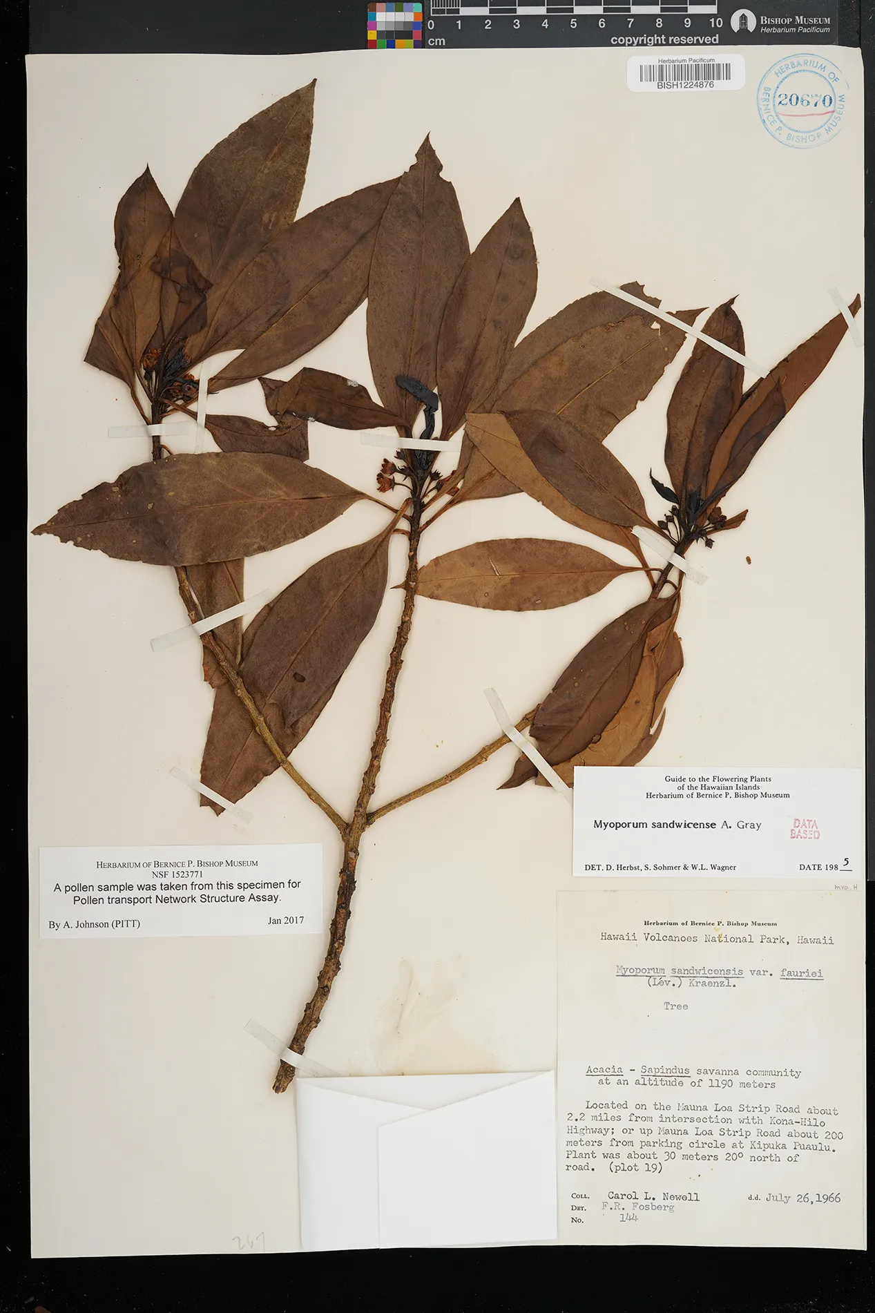 Wood has odor similar to sandalwood (Degener 1930:267). Used for house posts (Degener 1930:268; Krauss 1993:56). Burns well and long, used for torches (Lamb 1981:127). Wood used for fish net gauge (haha ka ‘upena) (Krauss 1993:35). In the Ethnology Collection at Bishop Museum there is a post-contact example of the wood made into a bowl.