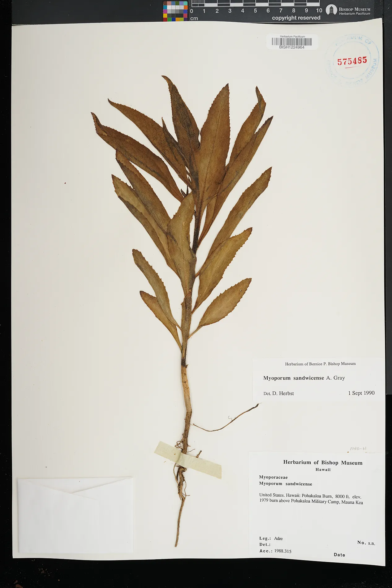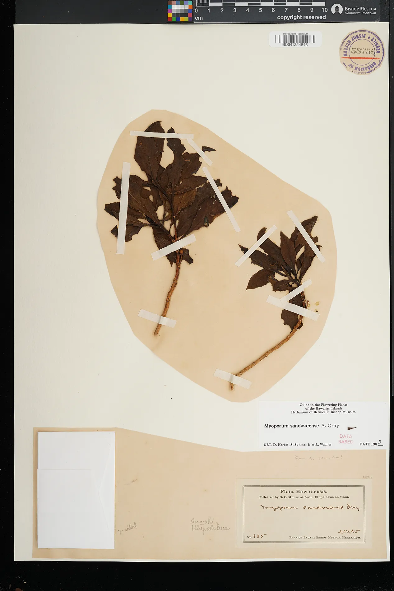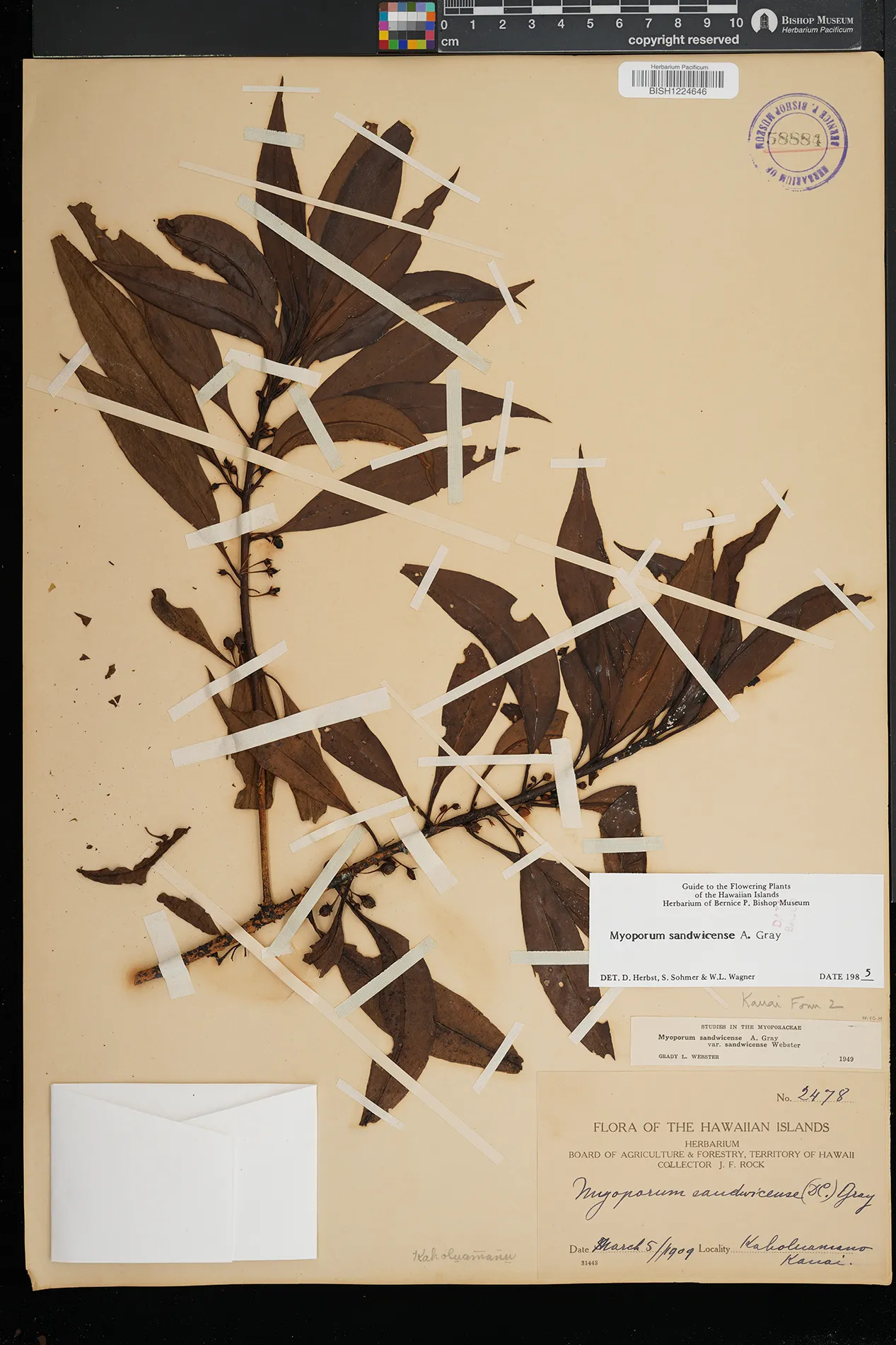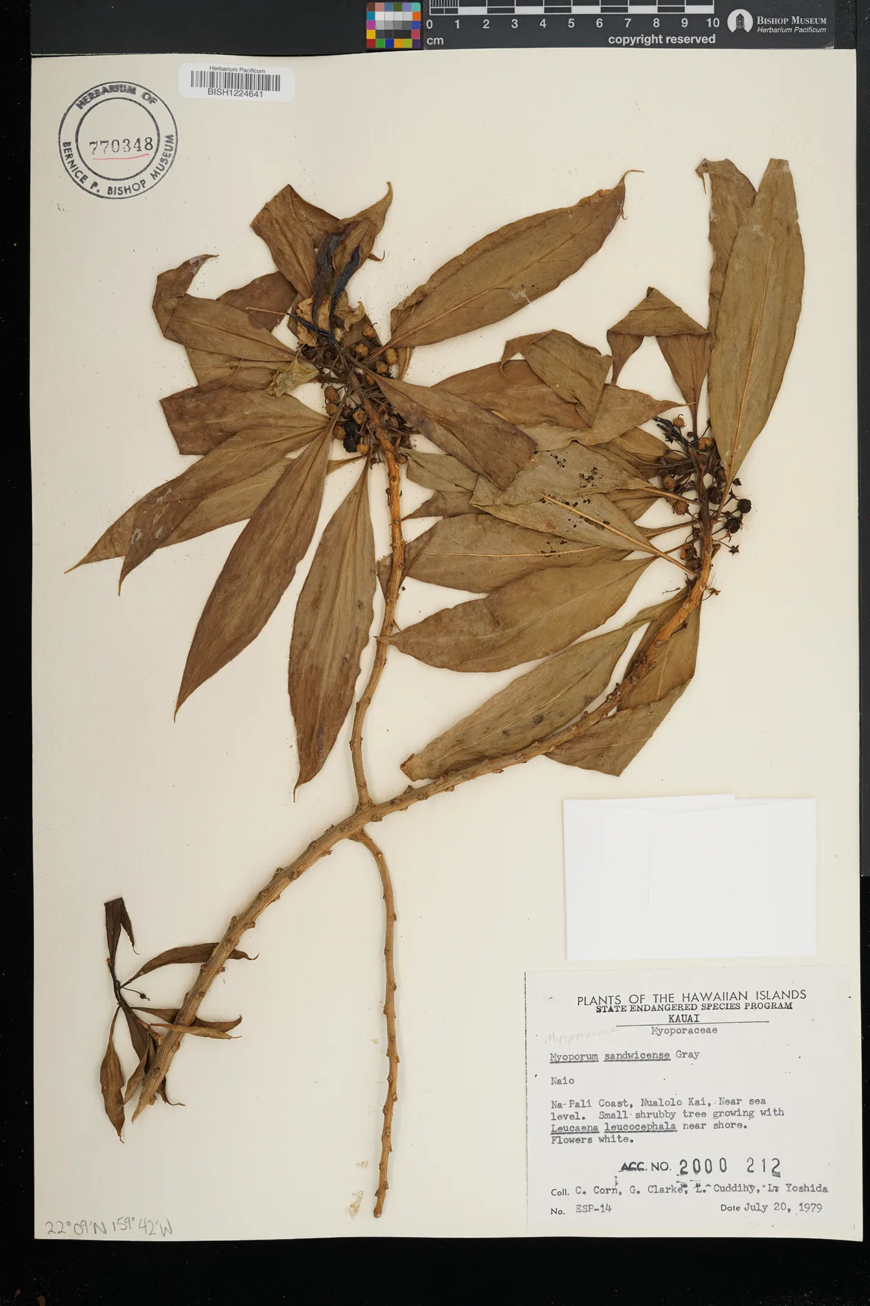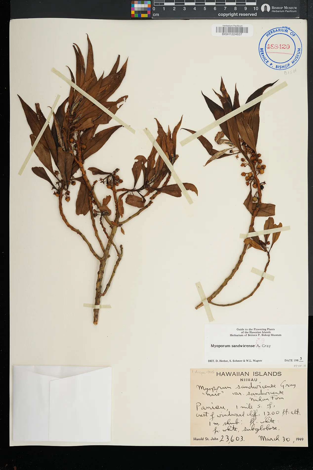 Wood has odor similar to sandalwood (Degener 1930:267). Used for house posts (Degener 1930:268; Krauss 1993:56). Burns well and long, used for torches (Lamb 1981:127). Wood used for fish net gauge (haha ka ‘upena) (Krauss 1993:35). In the Ethnology Collection at Bishop Museum there is a post-contact example of the wood made into a bowl.