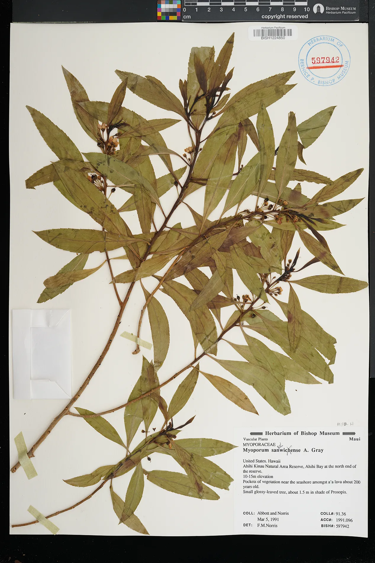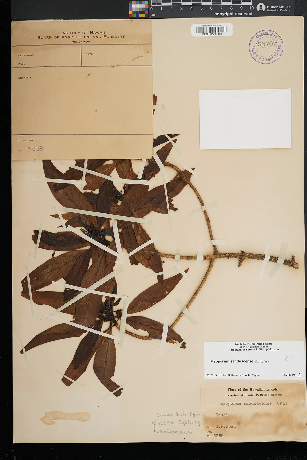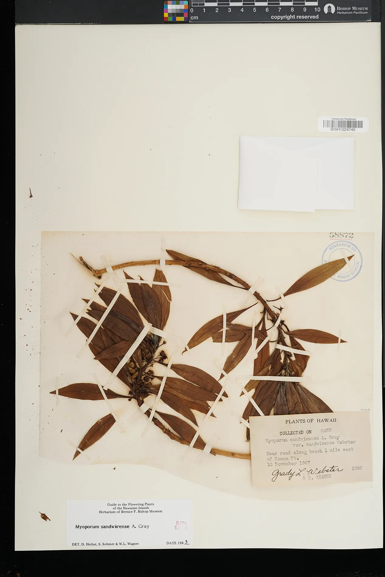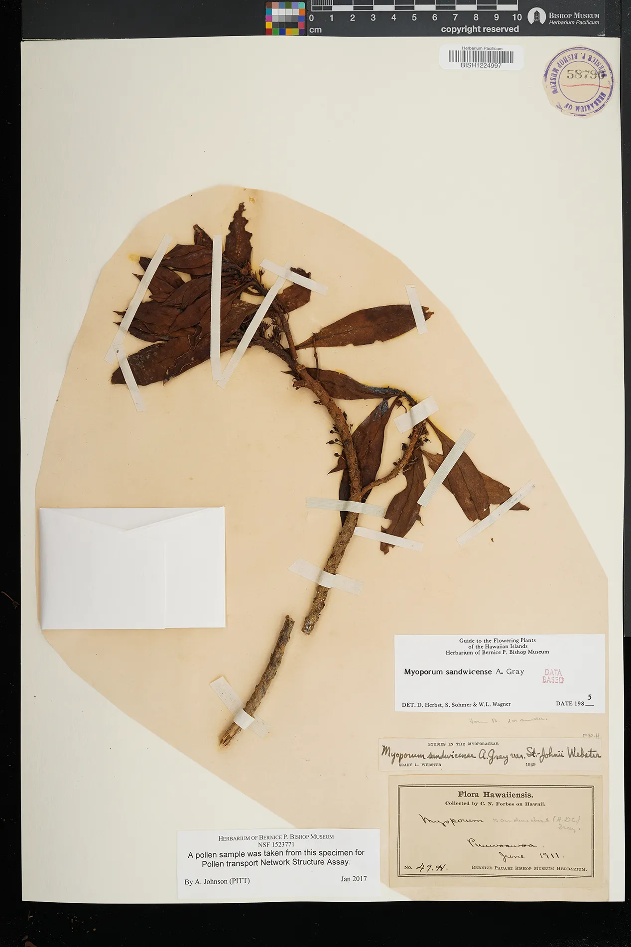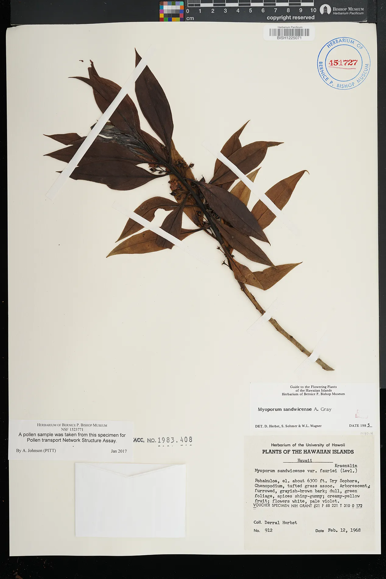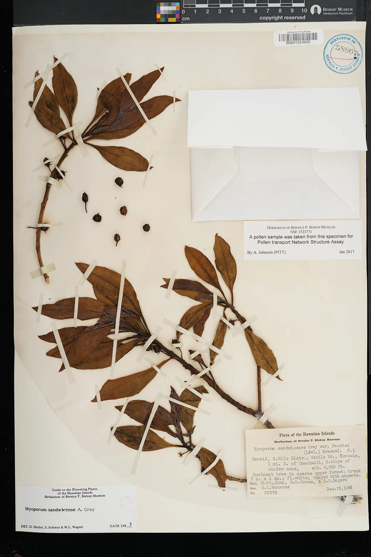 Wood has odor similar to sandalwood (Degener 1930:267). Used for house posts (Degener 1930:268; Krauss 1993:56). Burns well and long, used for torches (Lamb 1981:127). Wood used for fish net gauge (haha ka ‘upena) (Krauss 1993:35). In the Ethnology Collection at Bishop Museum there is a post-contact example of the wood made into a bowl.