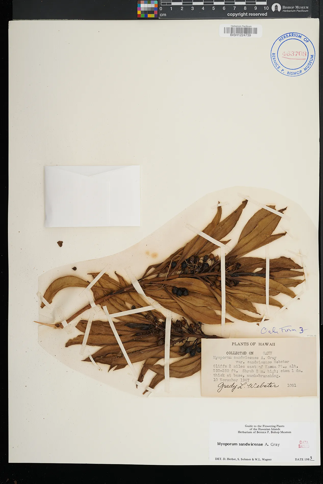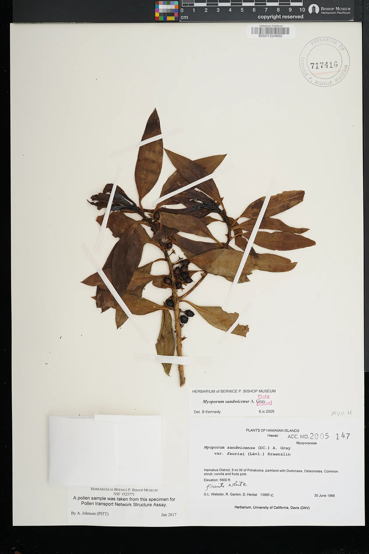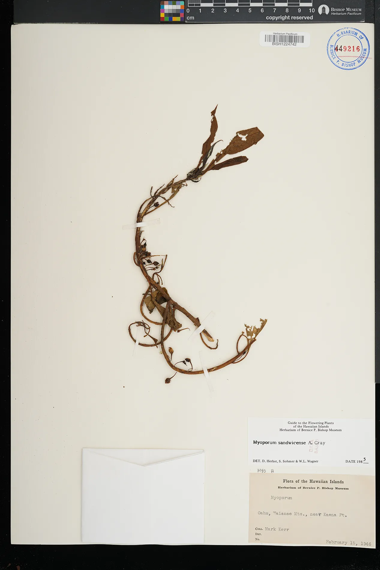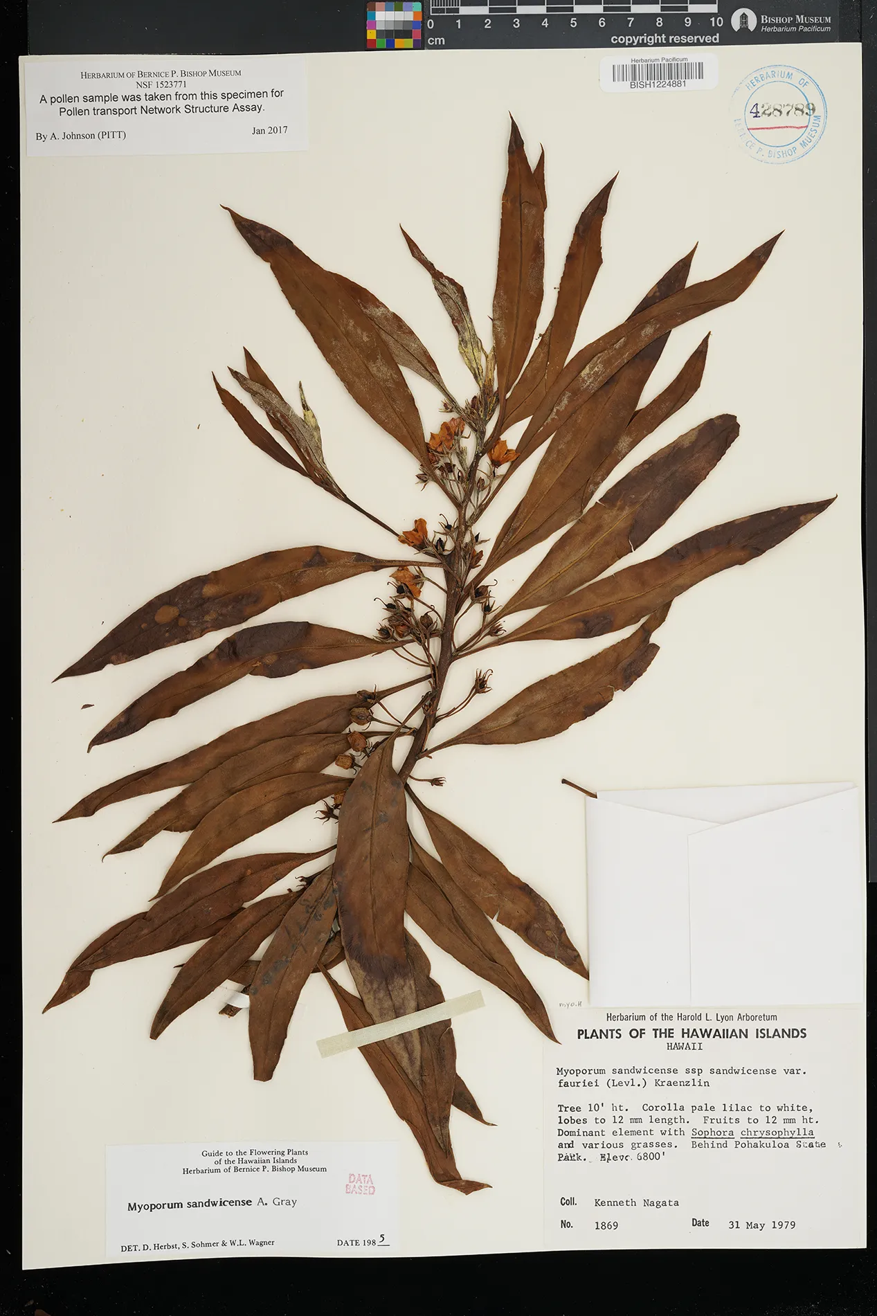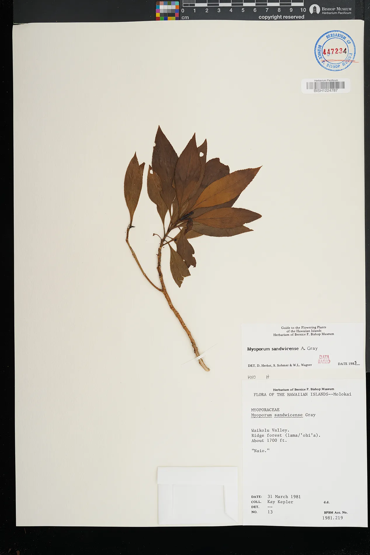 Wood has odor similar to sandalwood (Degener 1930:267). Used for house posts (Degener 1930:268; Krauss 1993:56). Burns well and long, used for torches (Lamb 1981:127). Wood used for fish net gauge (haha ka ‘upena) (Krauss 1993:35). In the Ethnology Collection at Bishop Museum there is a post-contact example of the wood made into a bowl.