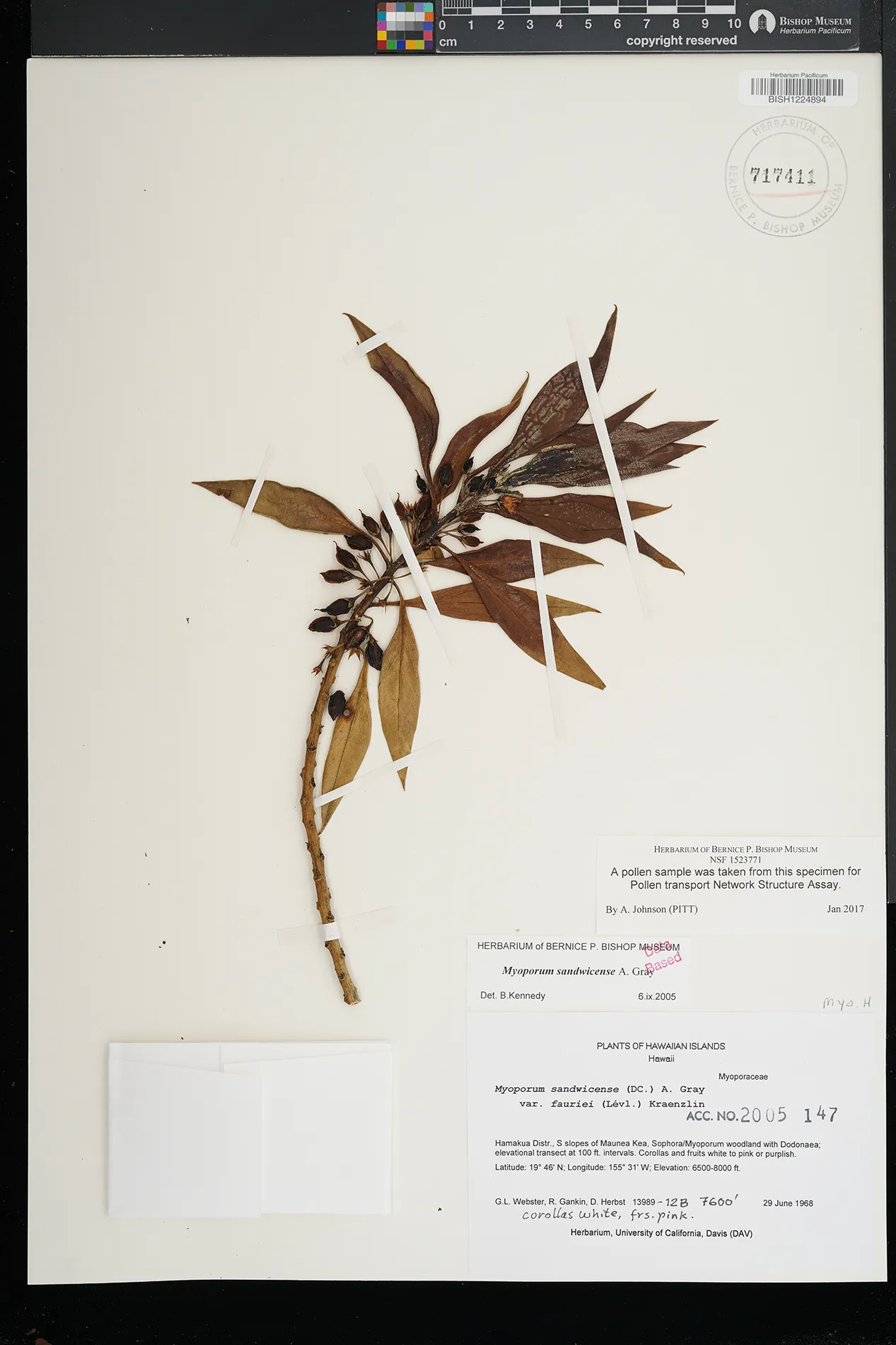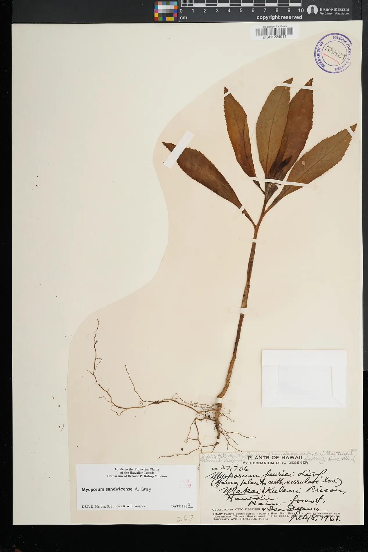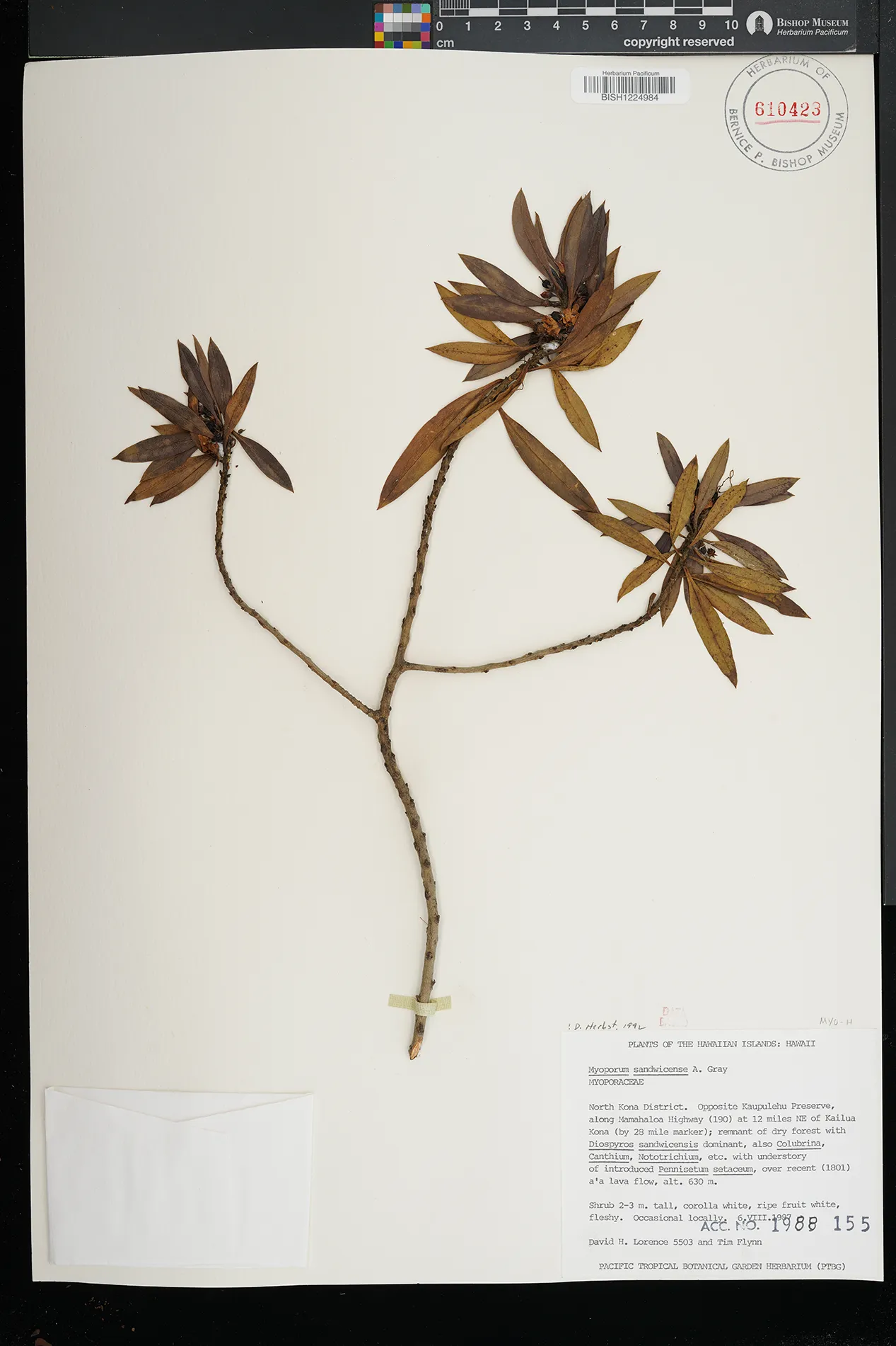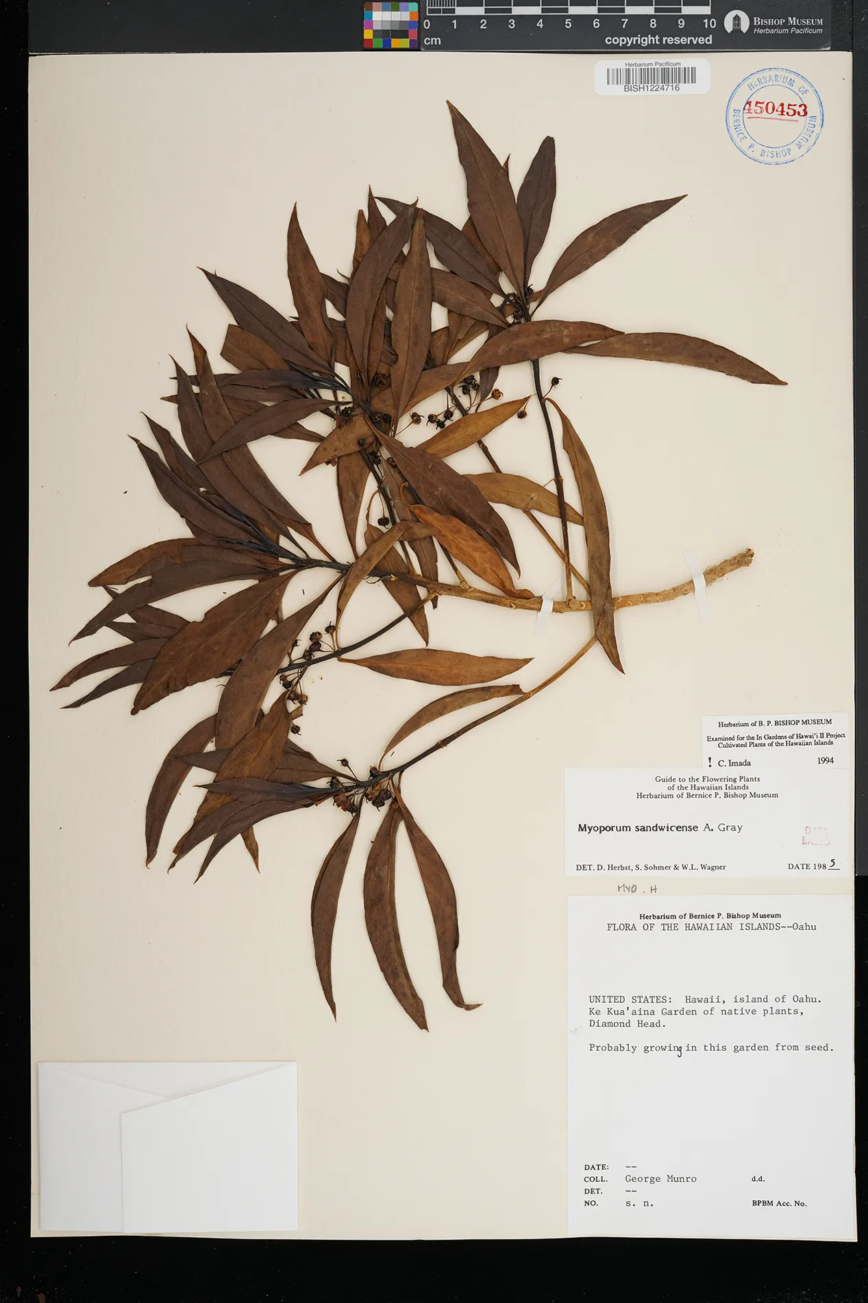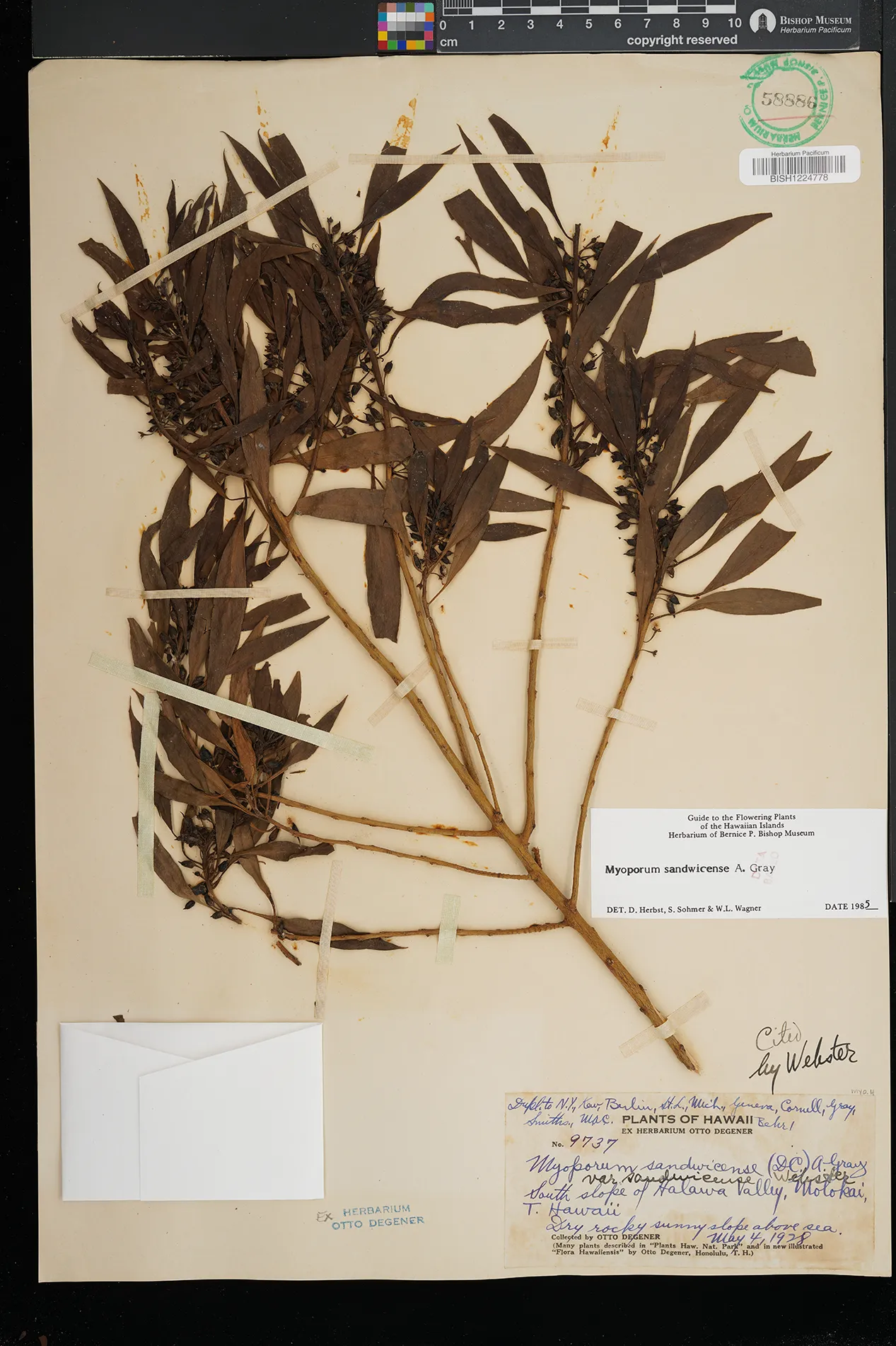 Wood has odor similar to sandalwood (Degener 1930:267). Used for house posts (Degener 1930:268; Krauss 1993:56). Burns well and long, used for torches (Lamb 1981:127). Wood used for fish net gauge (haha ka ‘upena) (Krauss 1993:35). In the Ethnology Collection at Bishop Museum there is a post-contact example of the wood made into a bowl.