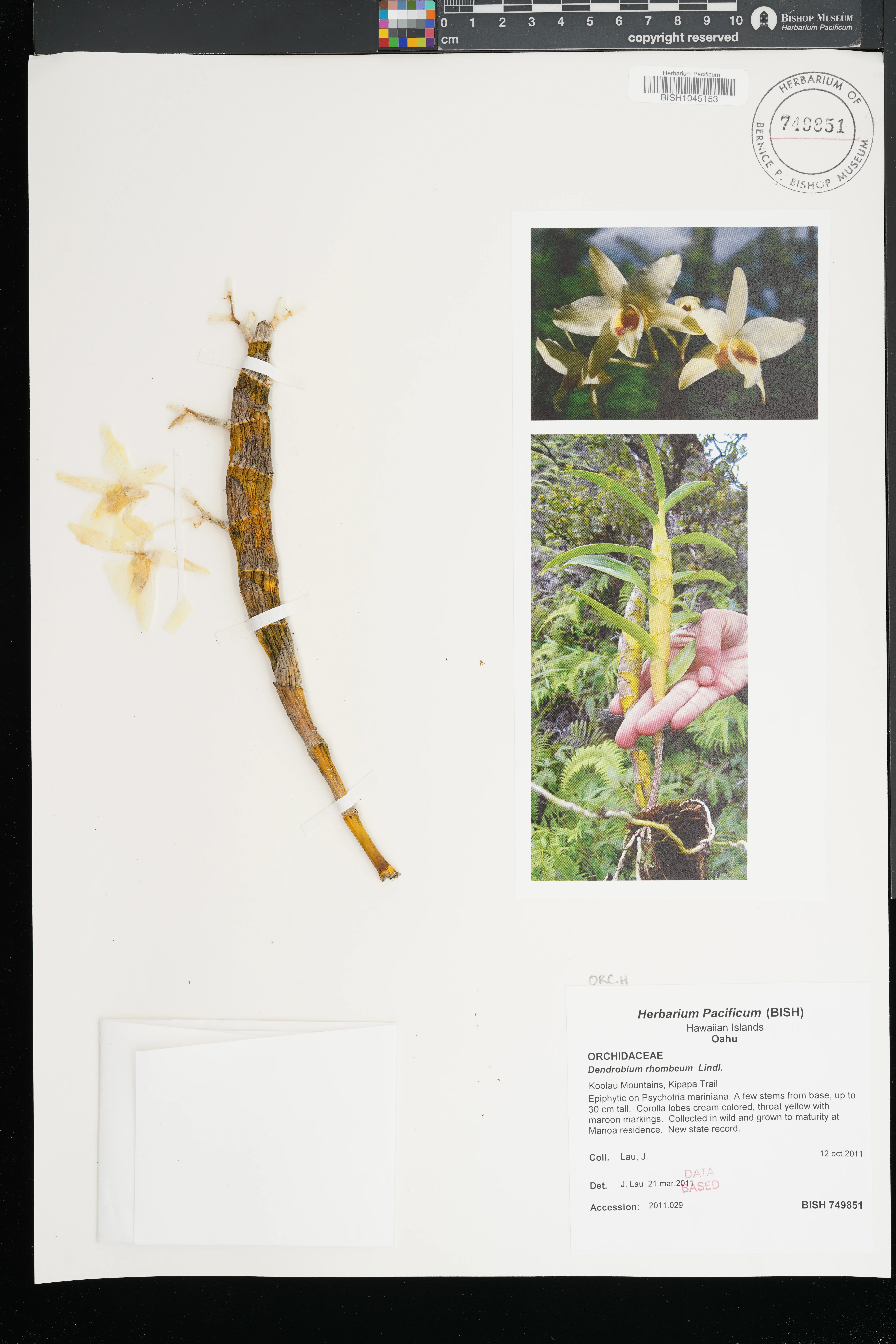 2 Dendrobium rhombeum Lindl. koolau mountains, kipapa trail Epiphytic on Psychotria mariniana. PRESERVED_SPECIMEN lau, j. Oahu BISH 10/12/2010