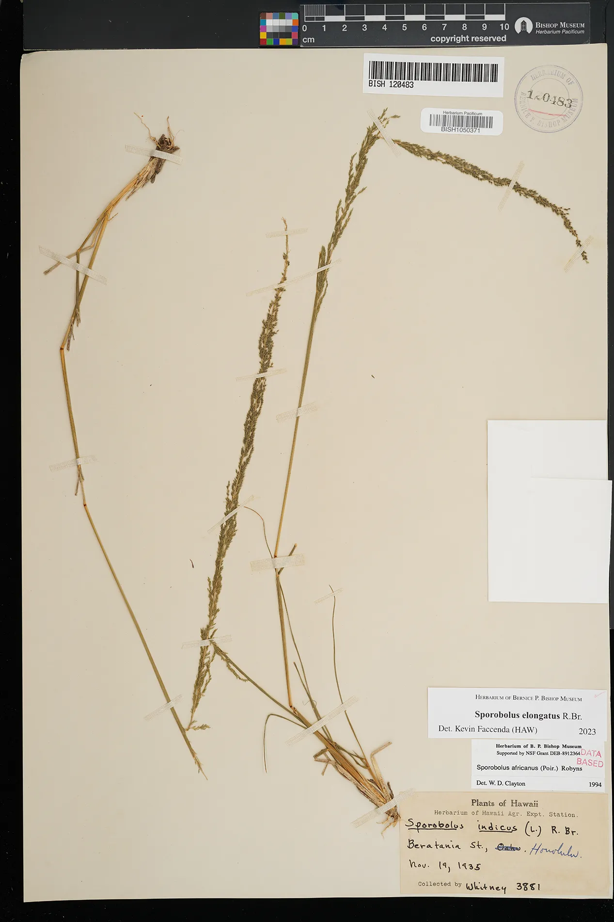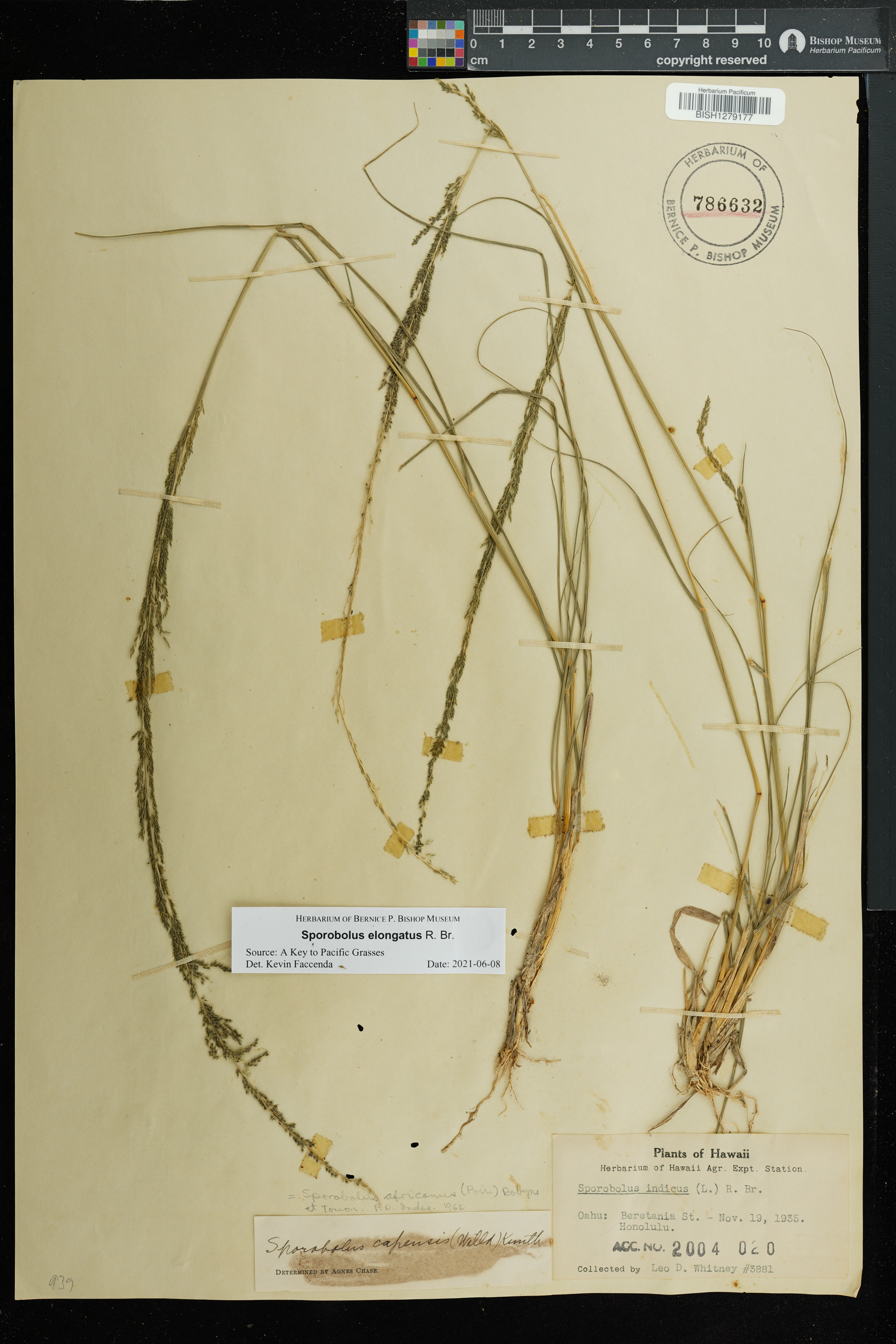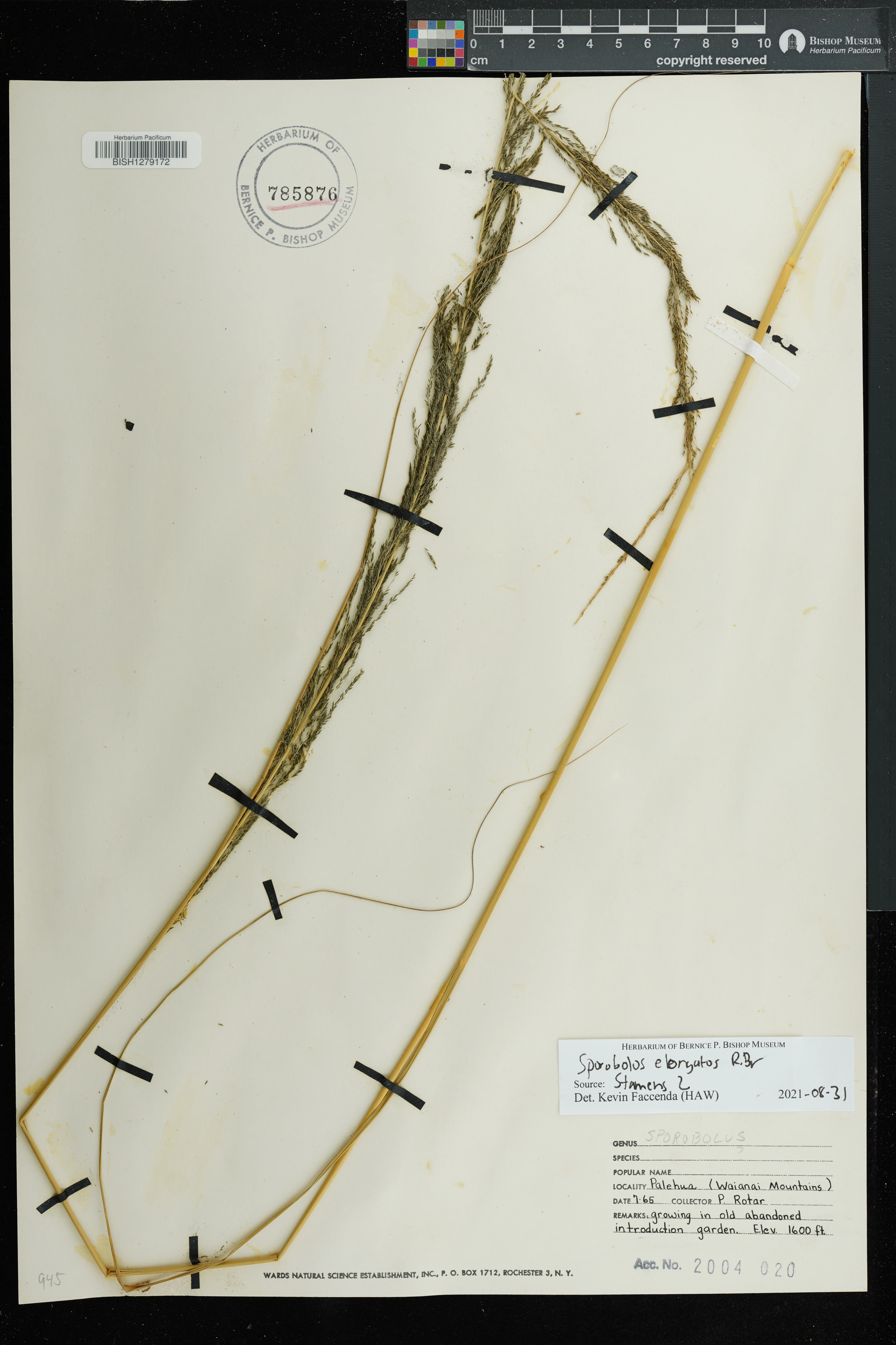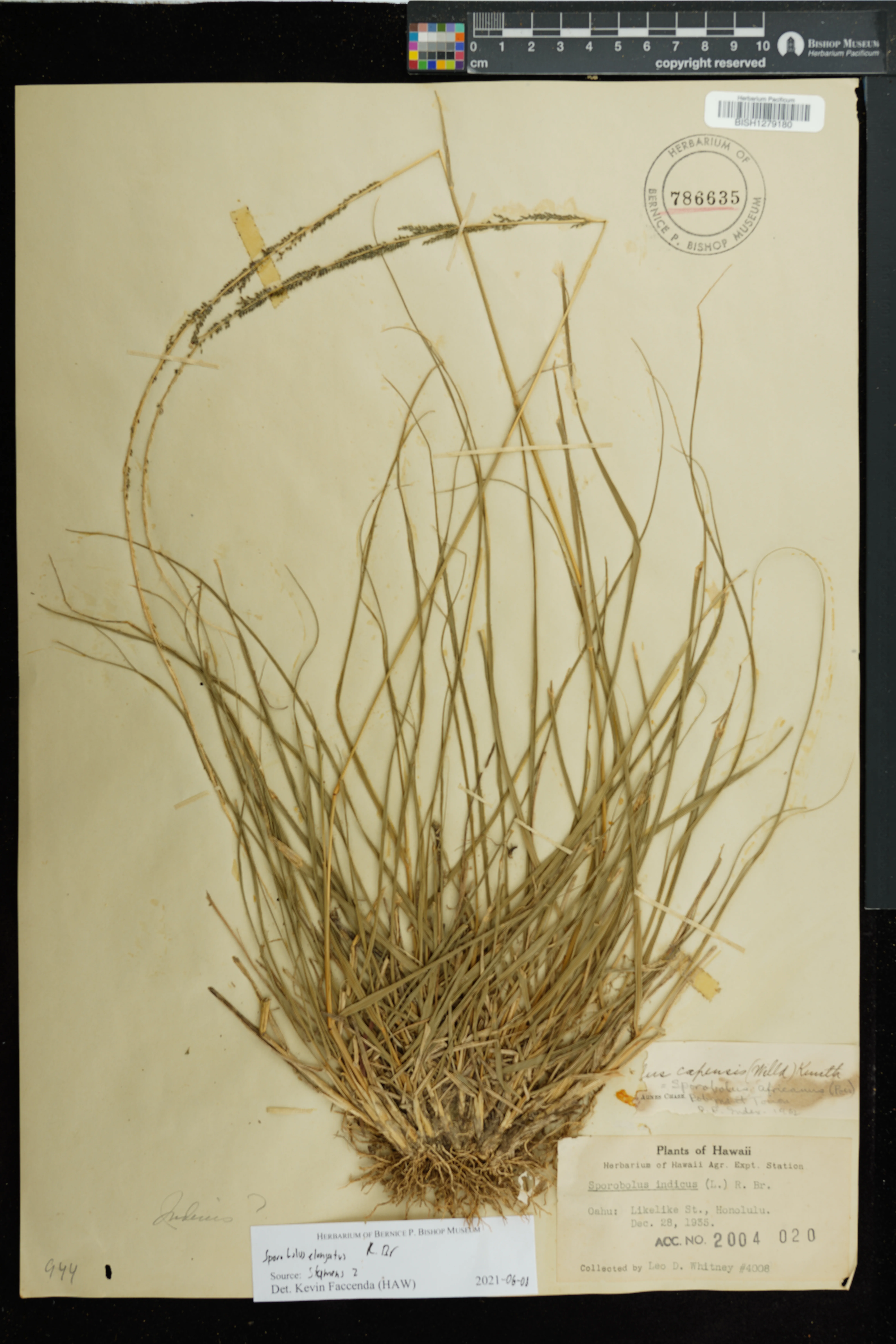 | 11 | Sporobolus elongatus | R.Br. | Schofield Barracks. | PRESERVED_SPECIMEN | A.S. Hitchcock | Hitchcock 13940 | Missouri Botanical Garden | 7/5/1916 |